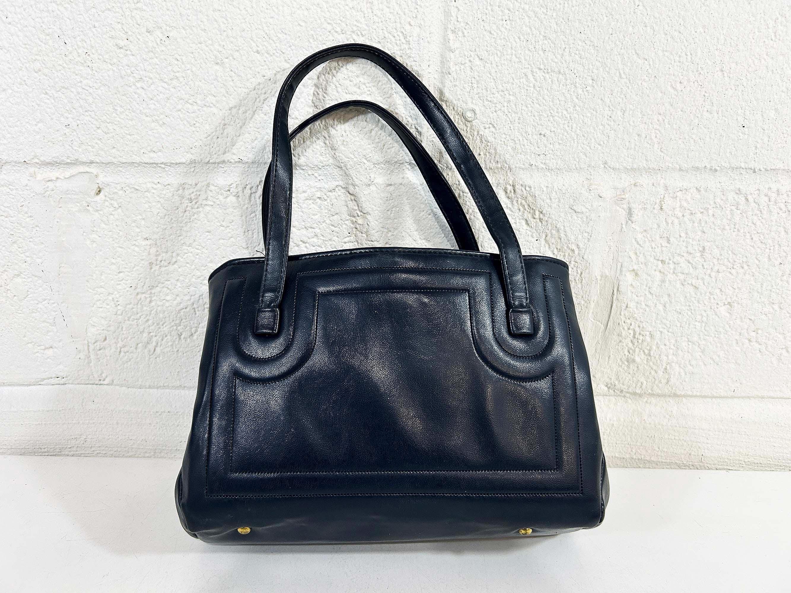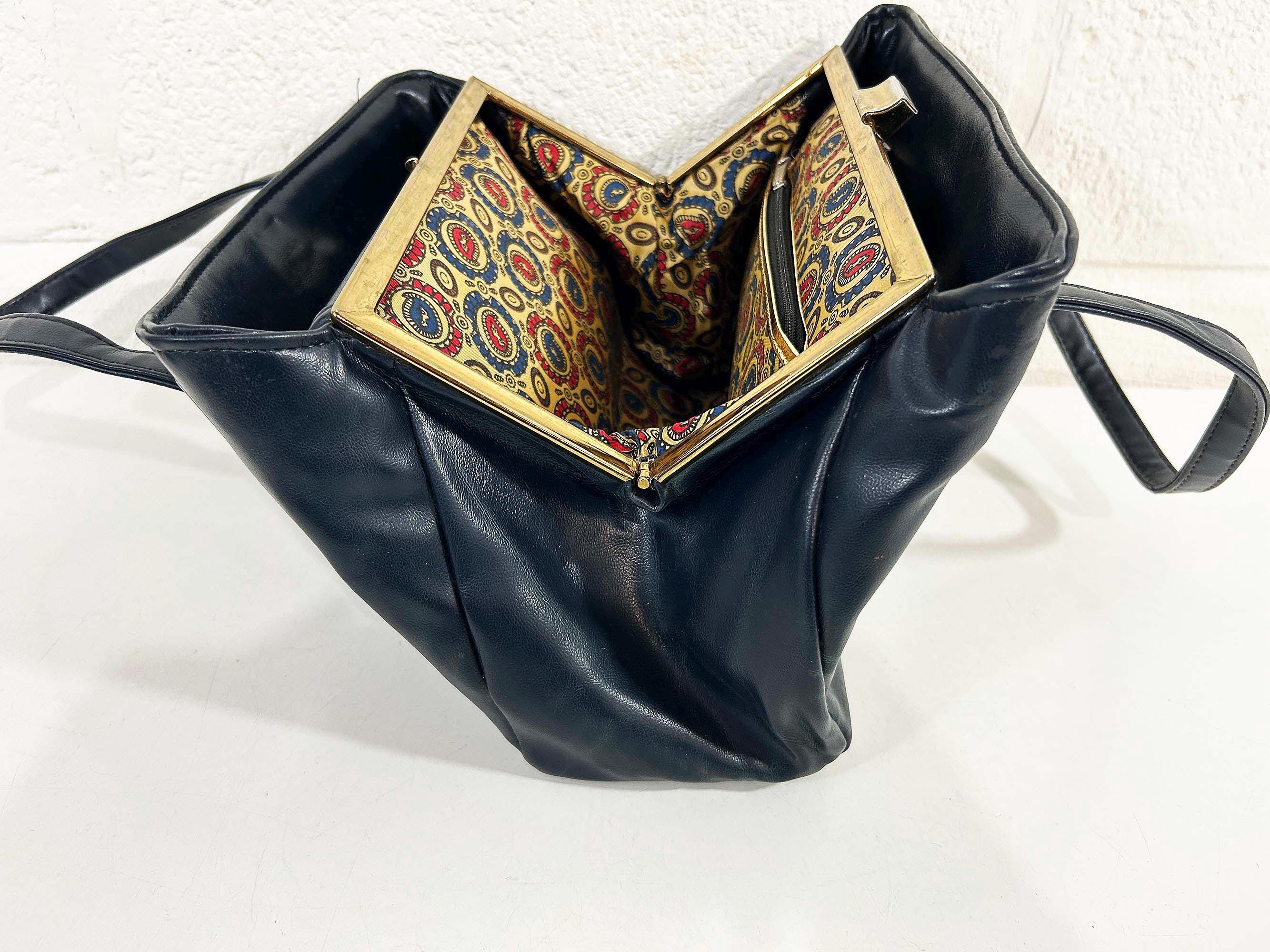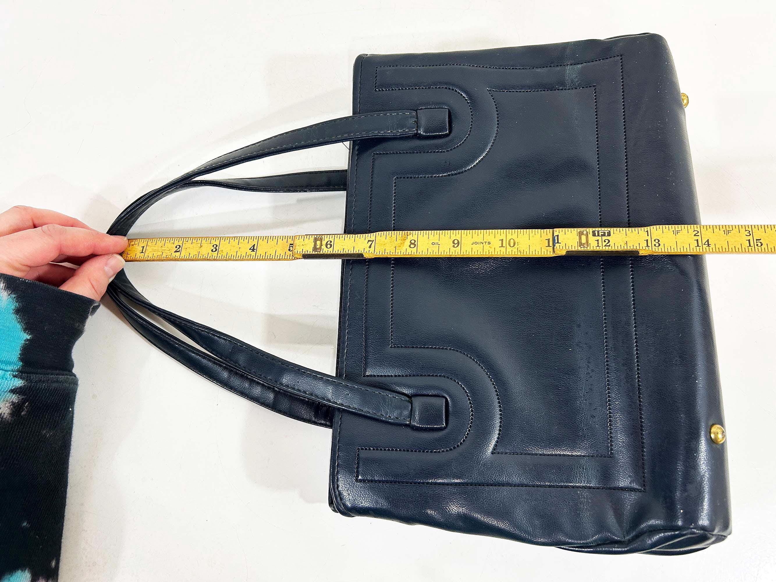 SUPER cute vinyl navy blue structured evening purse. It is in great condition but it has been loved over the years - there are some light scuffs and scratches here and there. It is lined with a pretty paisley fabric. Lots of pockets and dividers to keep things organized inside. When the purse is closed its approximately 11 inches wide, 8 inches tall, and 4 inches deep. The handle drop is approximately 6 inches.