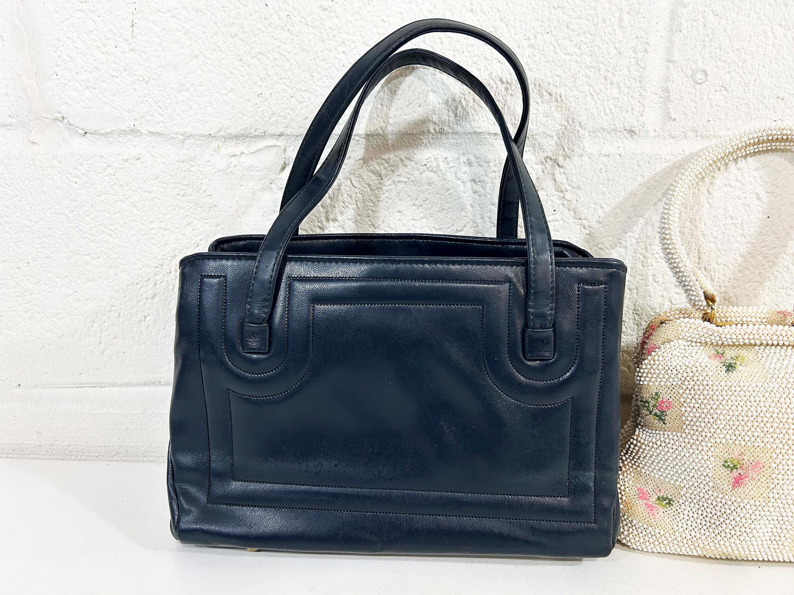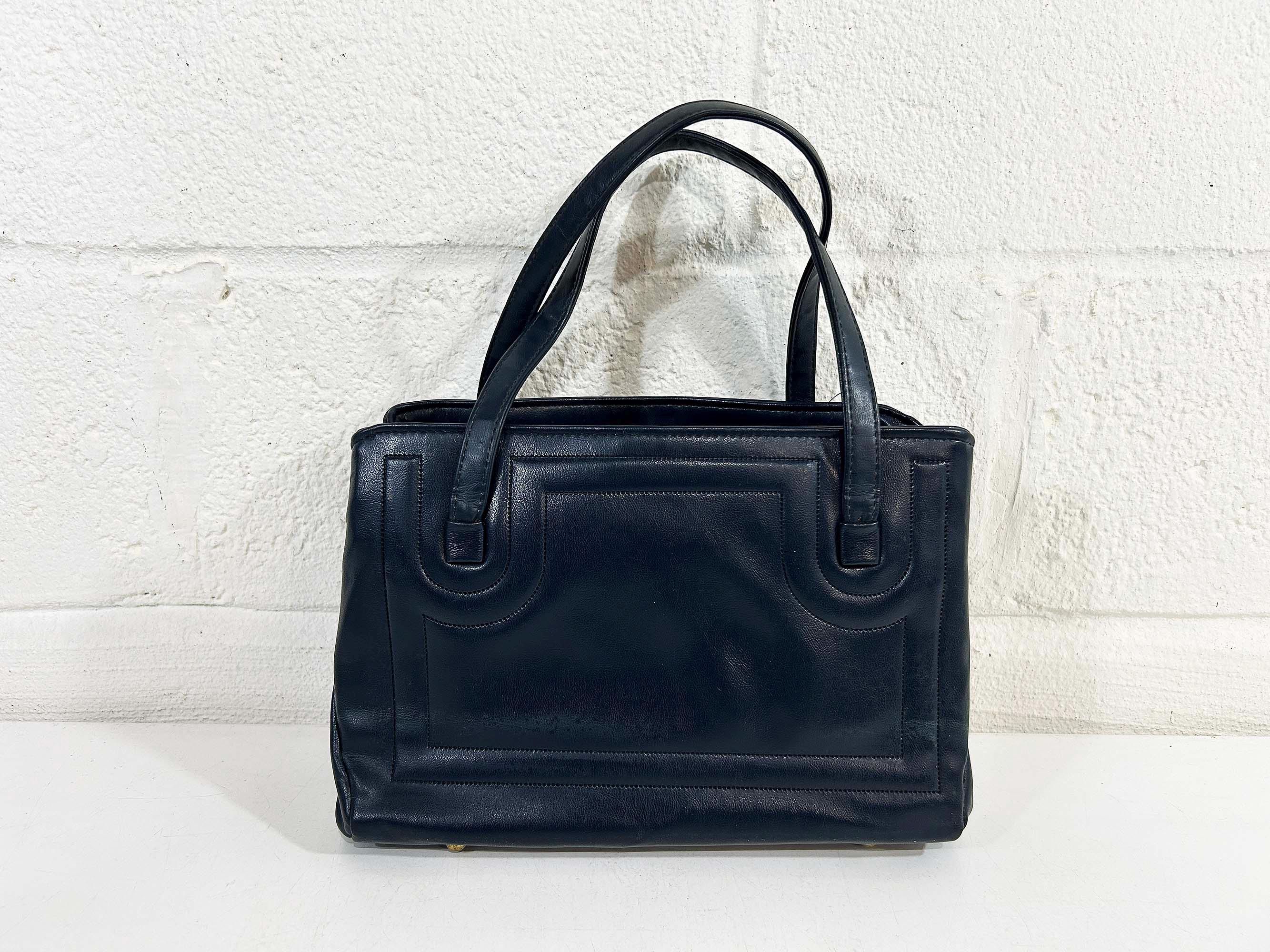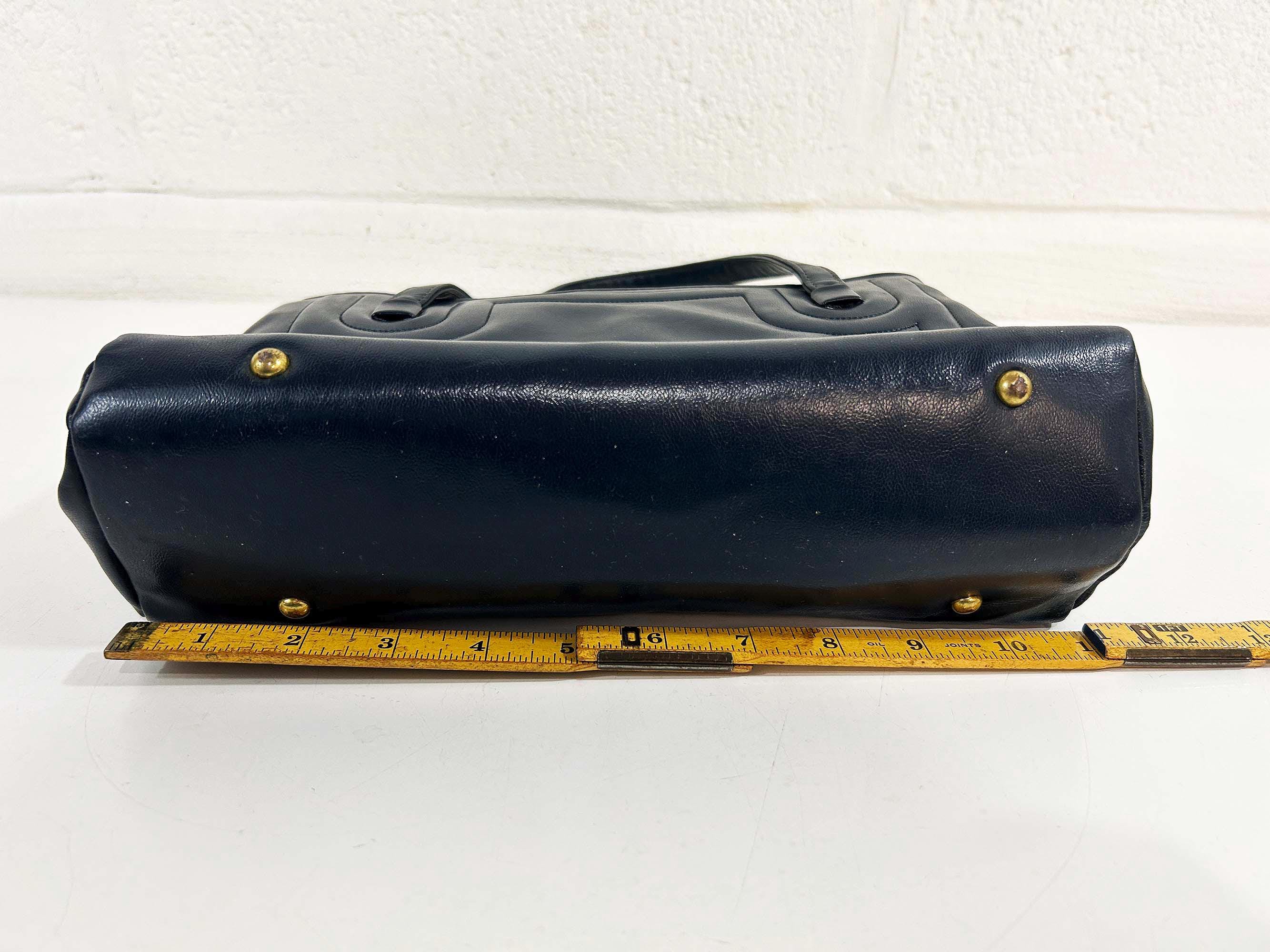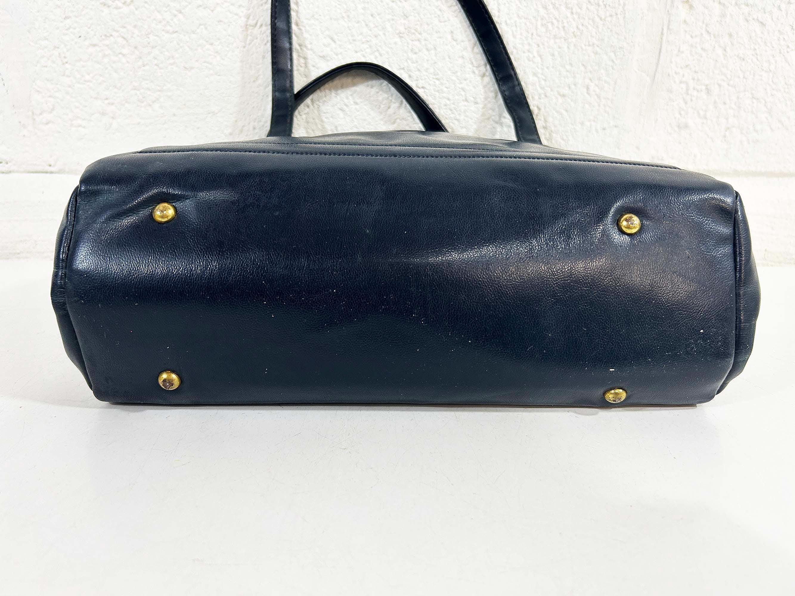 SUPER cute vinyl navy blue structured evening purse. It is in great condition but it has been loved over the years - there are some light scuffs and scratches here and there. It is lined with a pretty paisley fabric. Lots of pockets and dividers to keep things organized inside. When the purse is closed its approximately 11 inches wide, 8 inches tall, and 4 inches deep. The handle drop is approximately 6 inches.