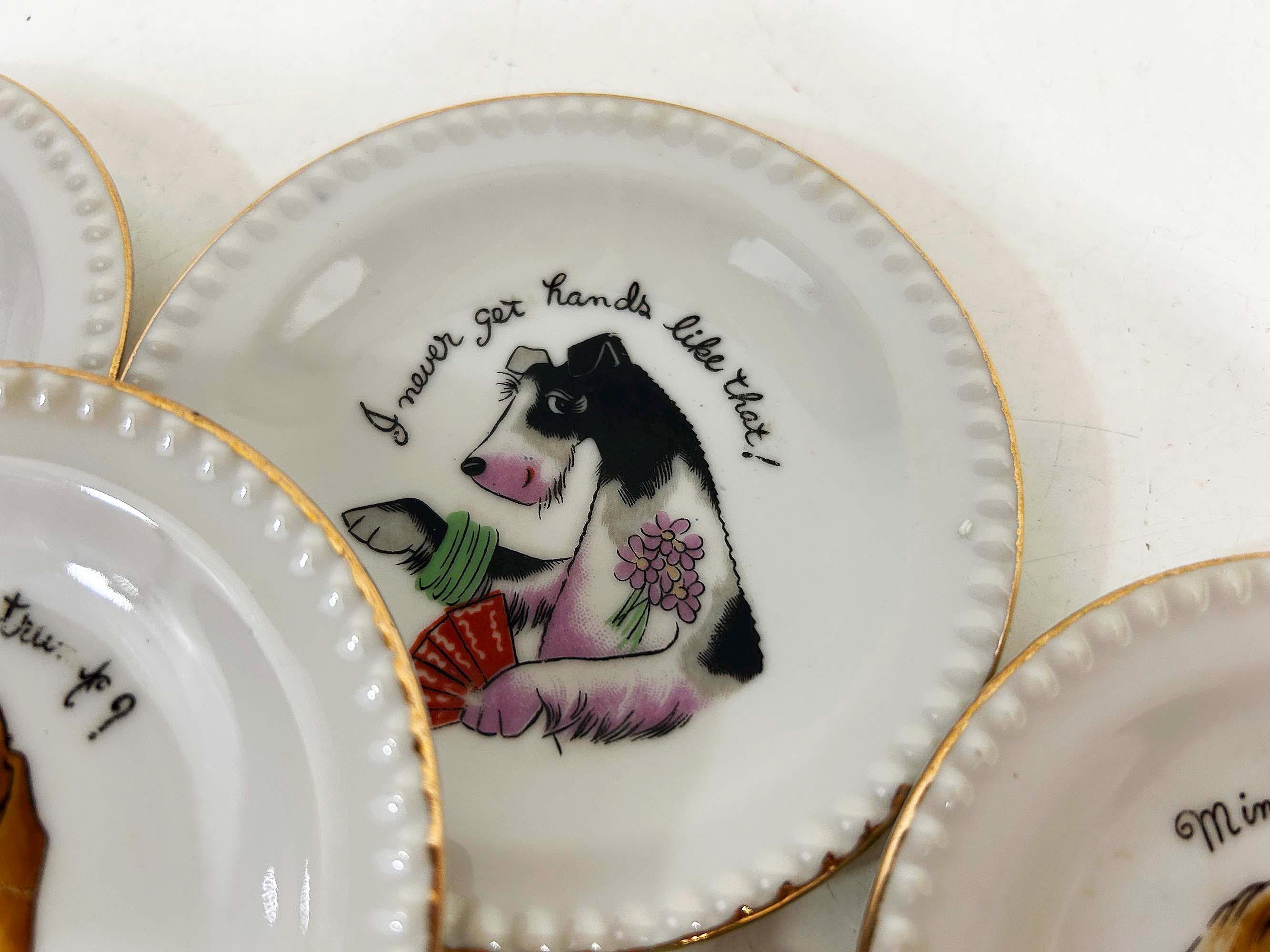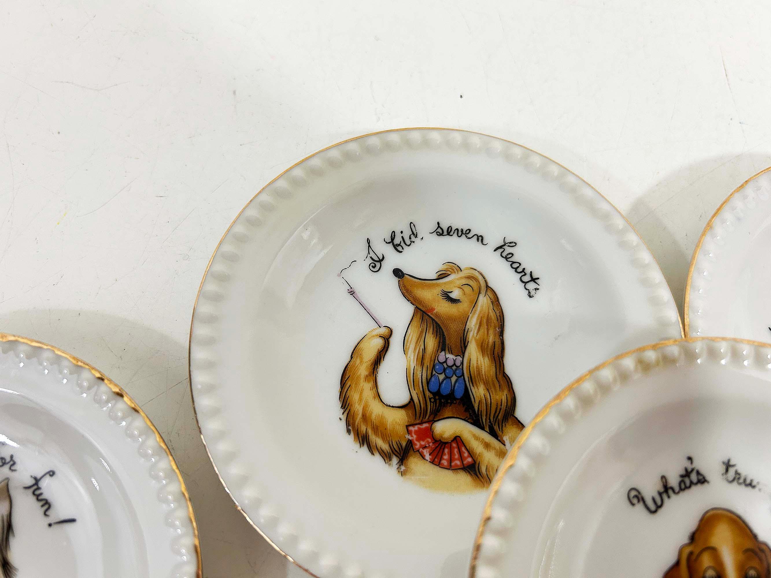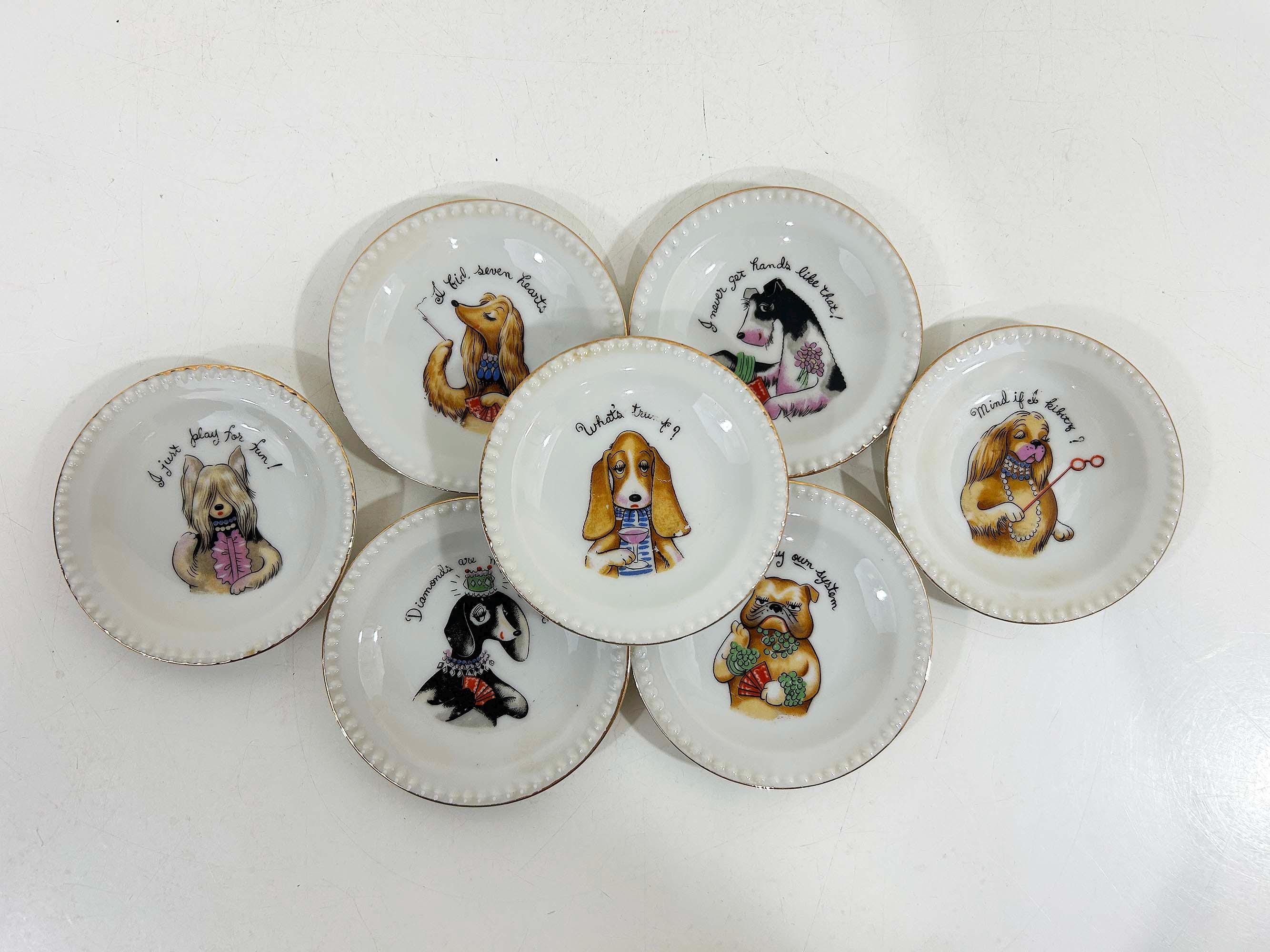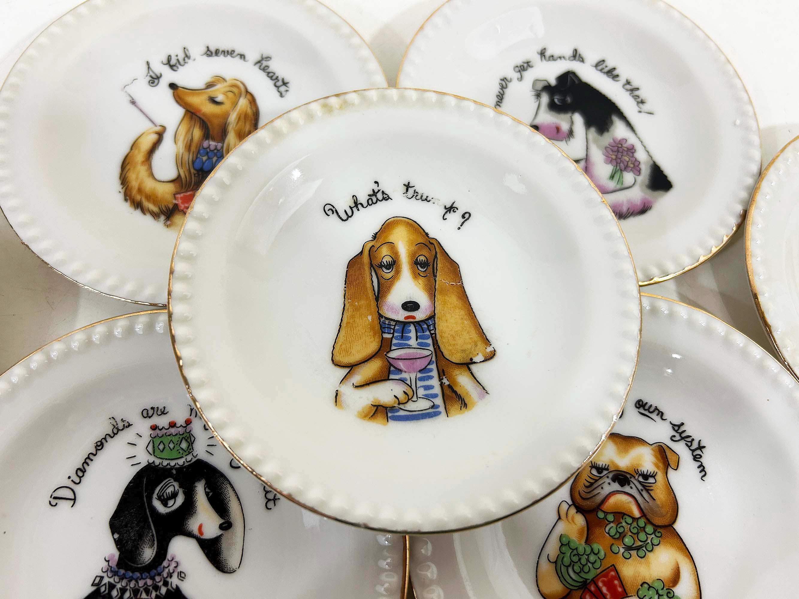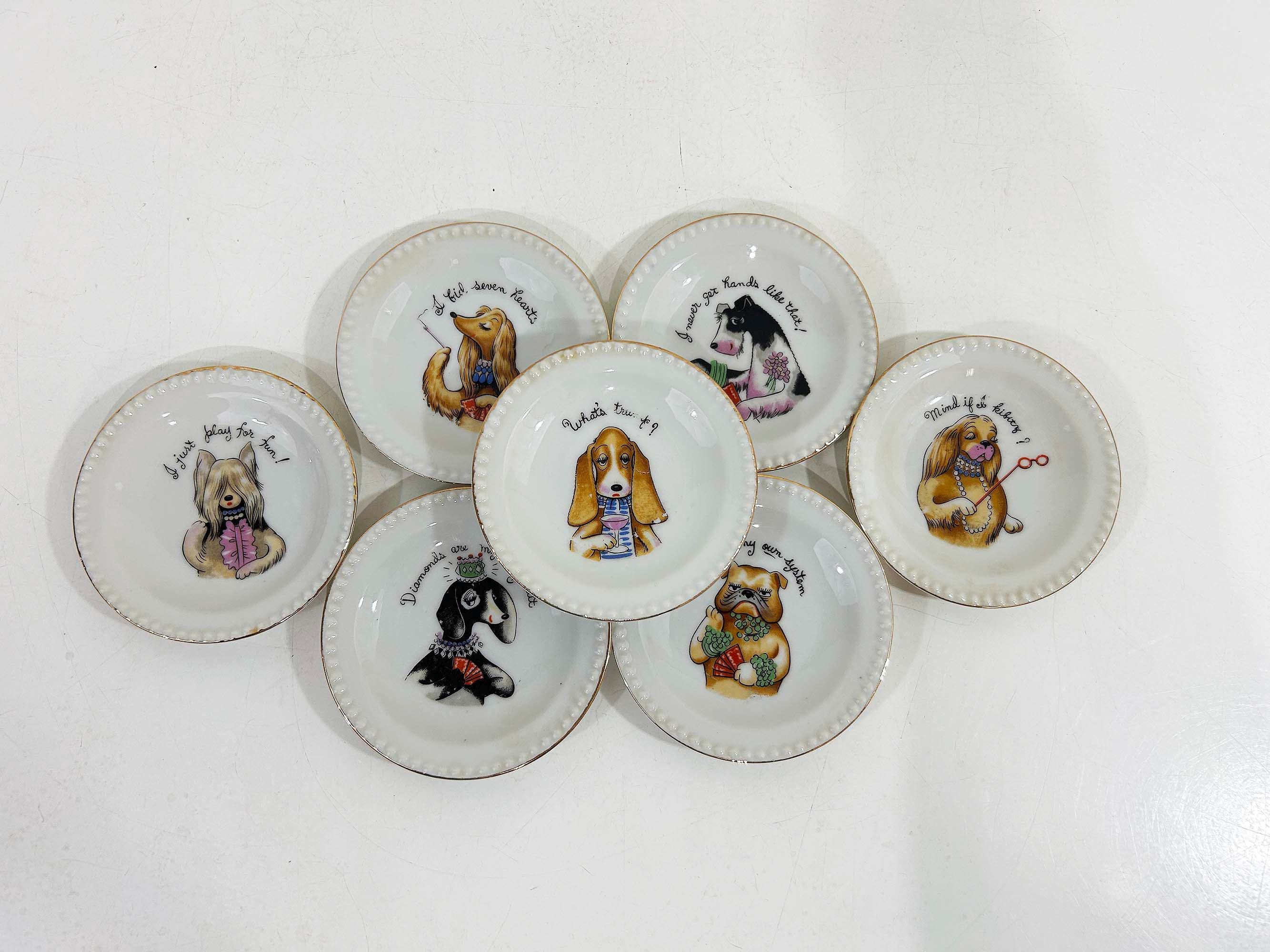 Cutest set of 7 mini dishes with different dog illustrations. The dishes are in good condition with some paint loss - please be sure to inspect all photos closely. These were likely used at bridge parties as either ashtrays, snack dishes, or coasters. Each dish is approximately 4 inches in diameter.