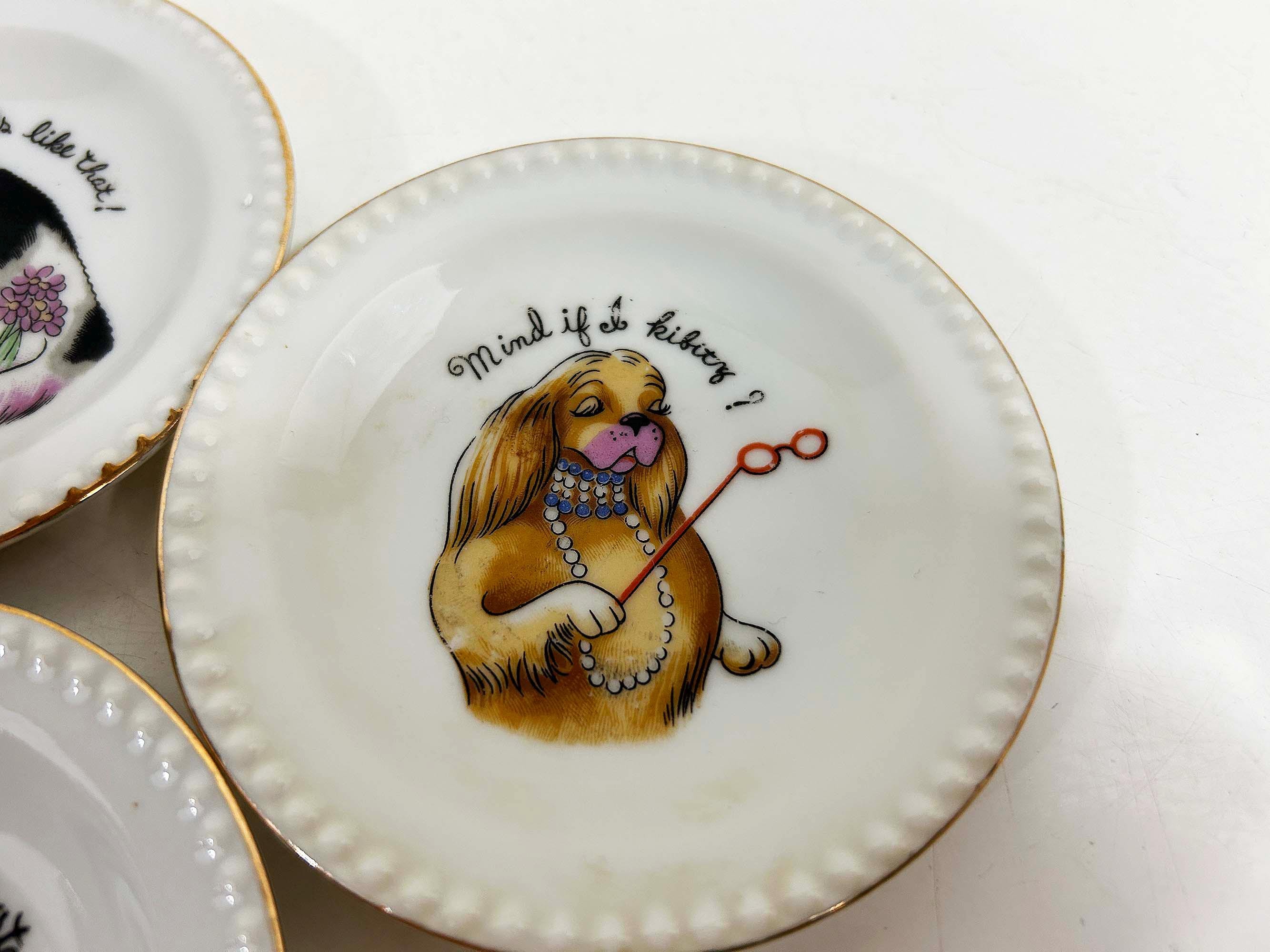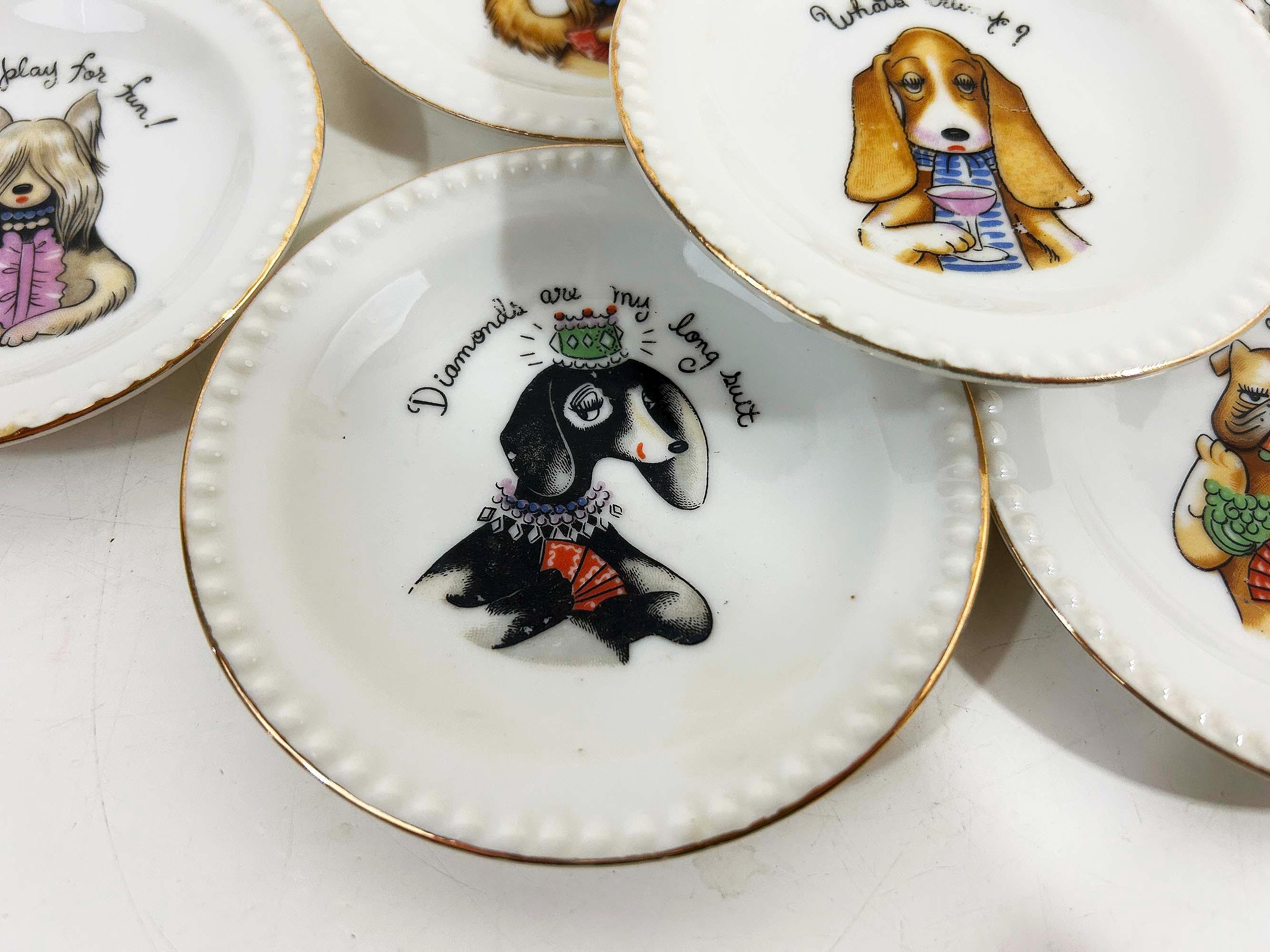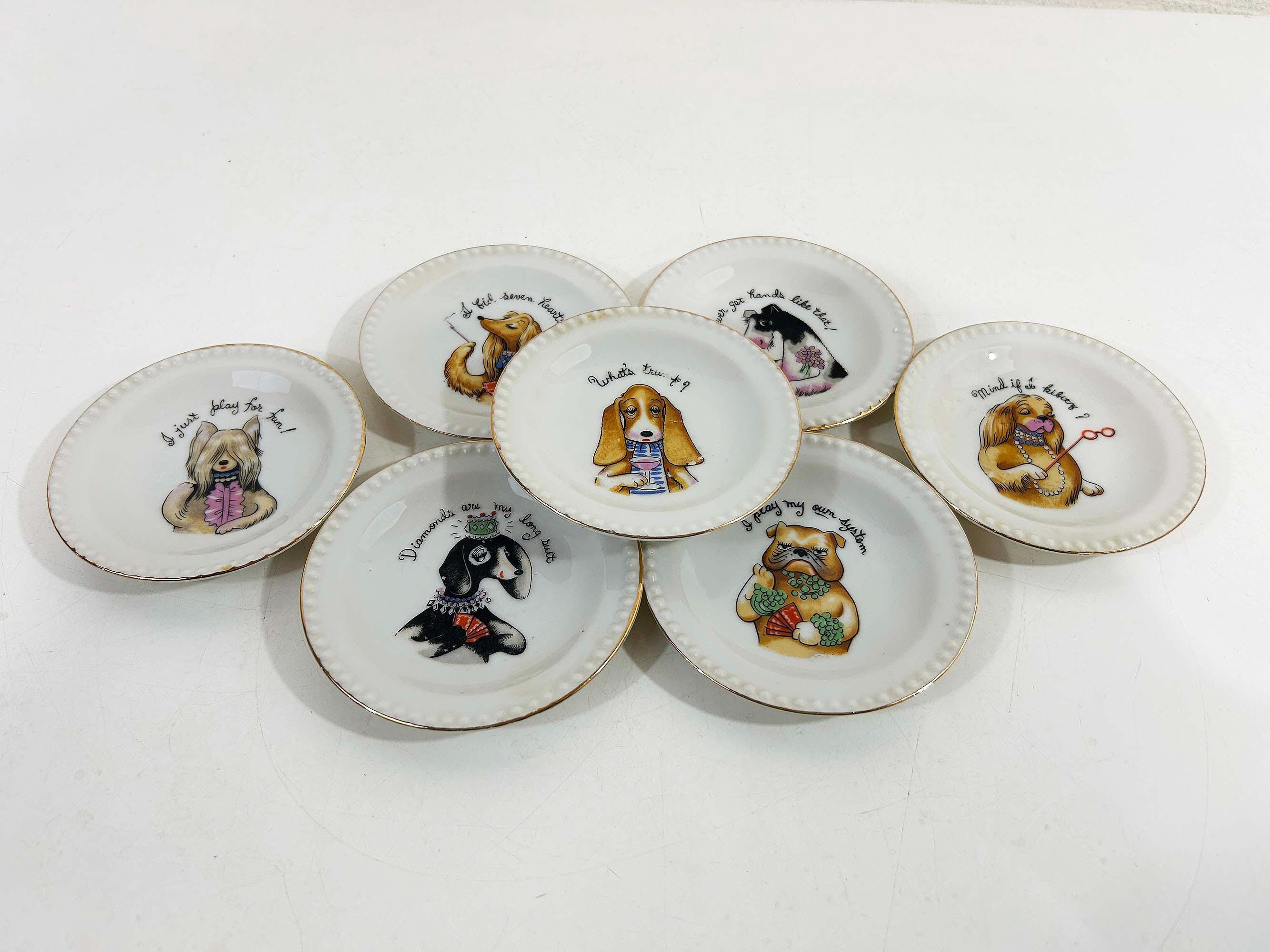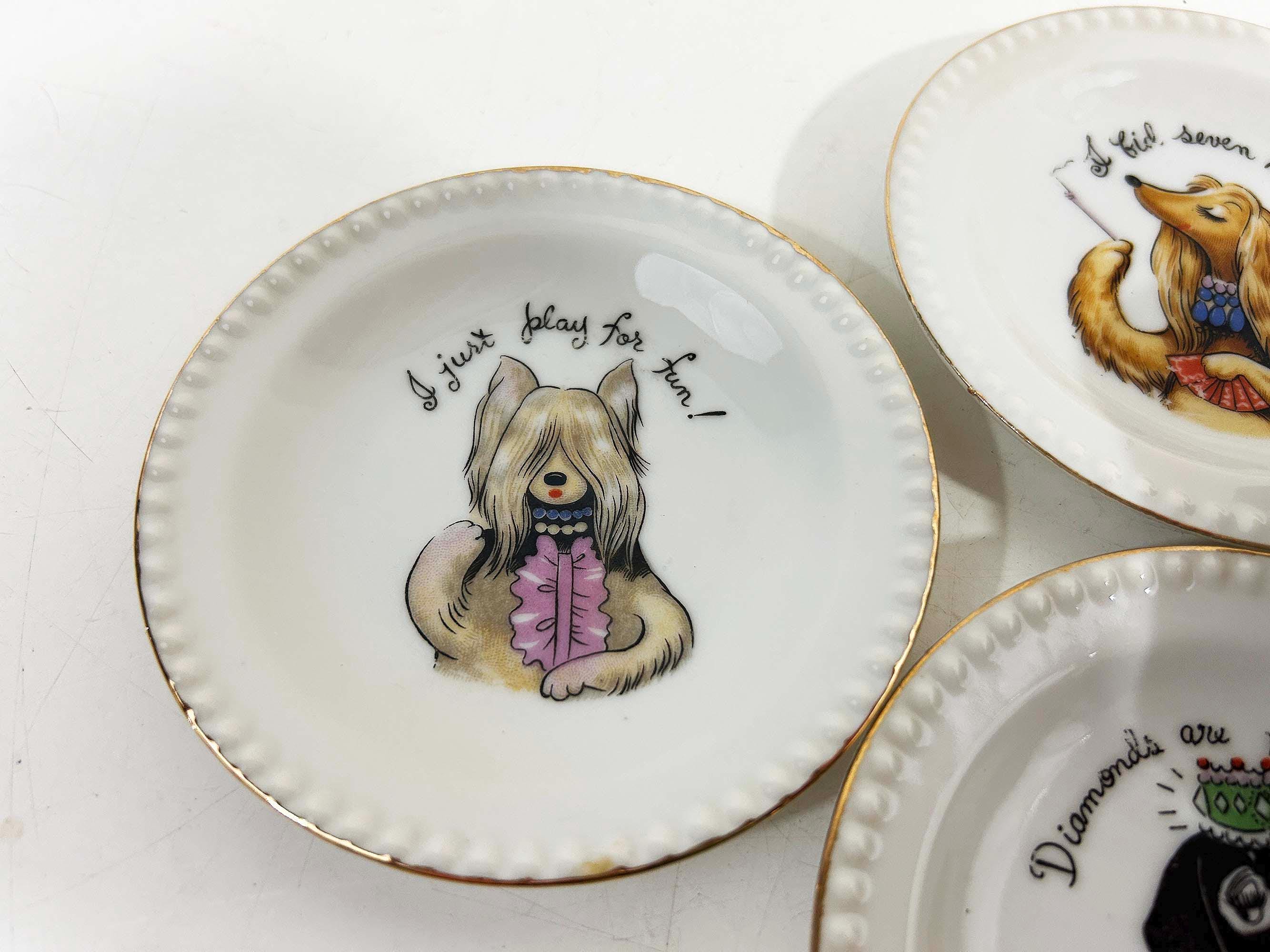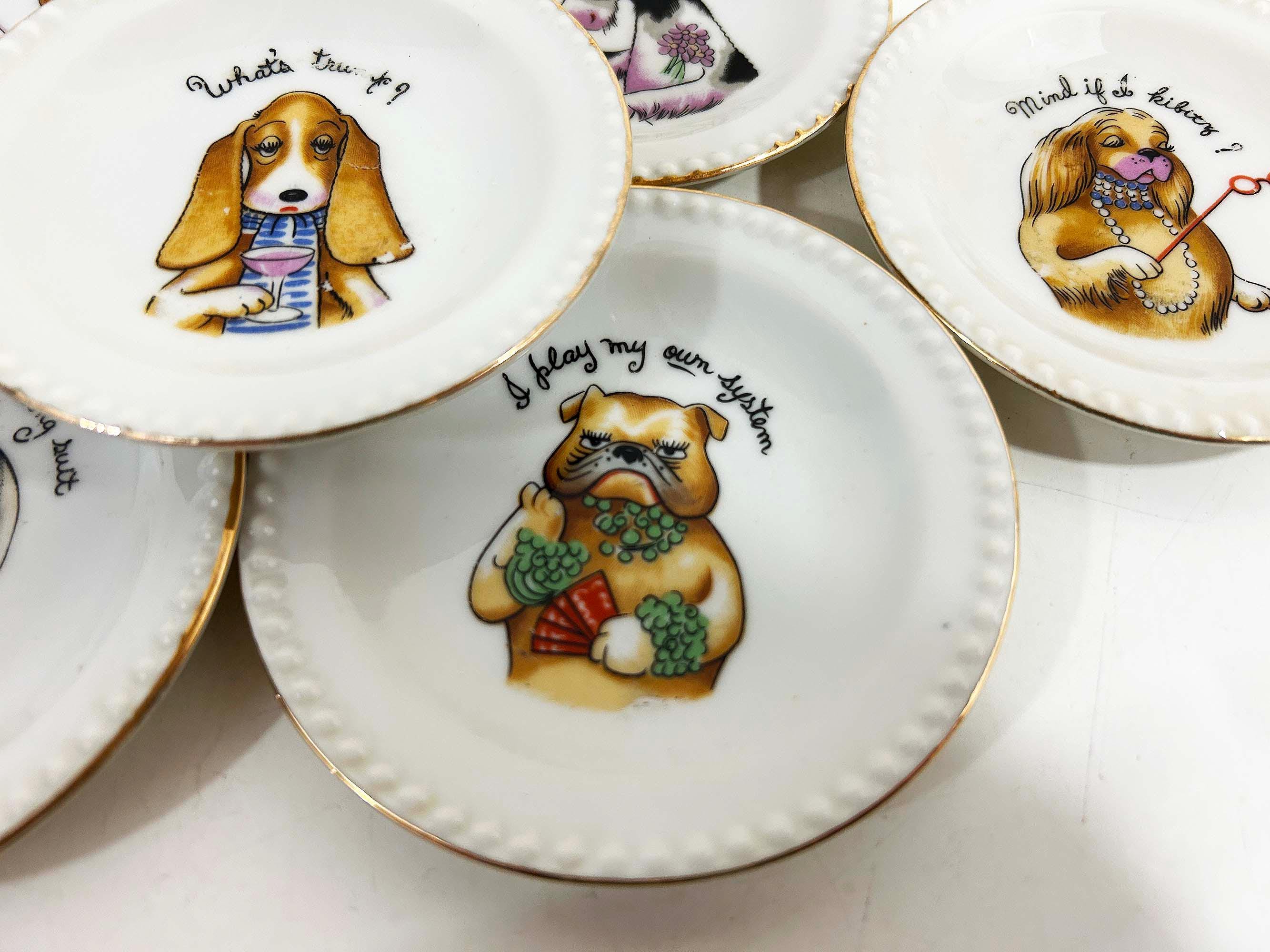 Cutest set of 7 mini dishes with different dog illustrations. The dishes are in good condition with some paint loss - please be sure to inspect all photos closely. These were likely used at bridge parties as either ashtrays, snack dishes, or coasters. Each dish is approximately 4 inches in diameter.
