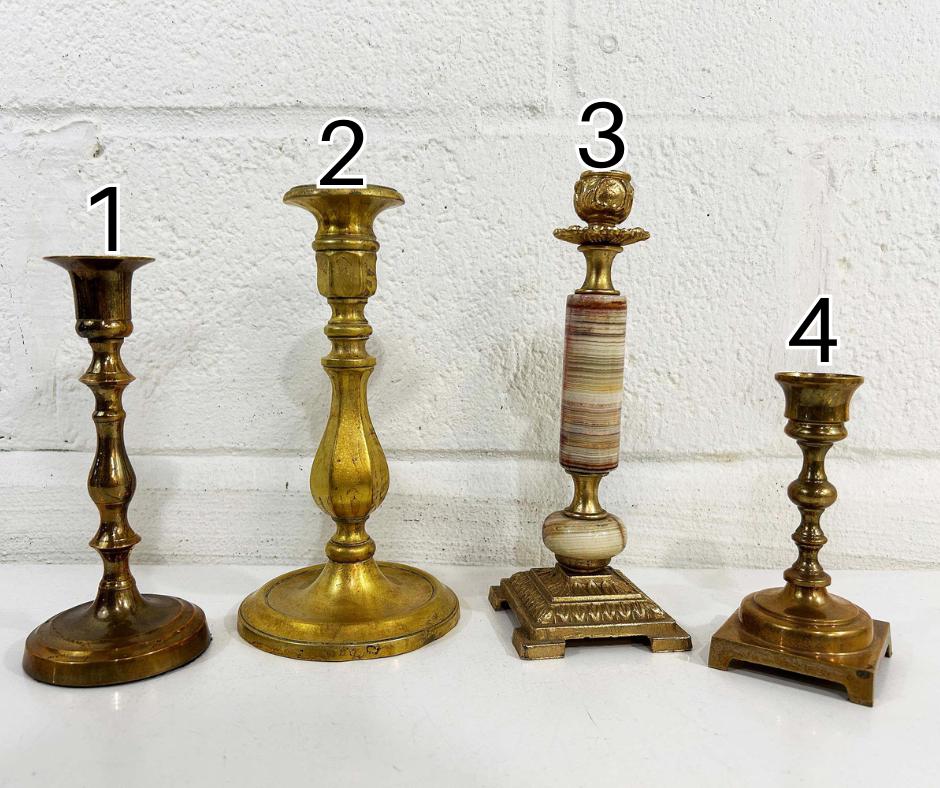 Lovely candle holders! All are in good vintage condition with some all over patina. The candle holders range from approximately 5 to 8 1/2 inches tall. All are brass except for one which is stone and brass. They are each sold individually - choose the one you'd like from the drop down menu.