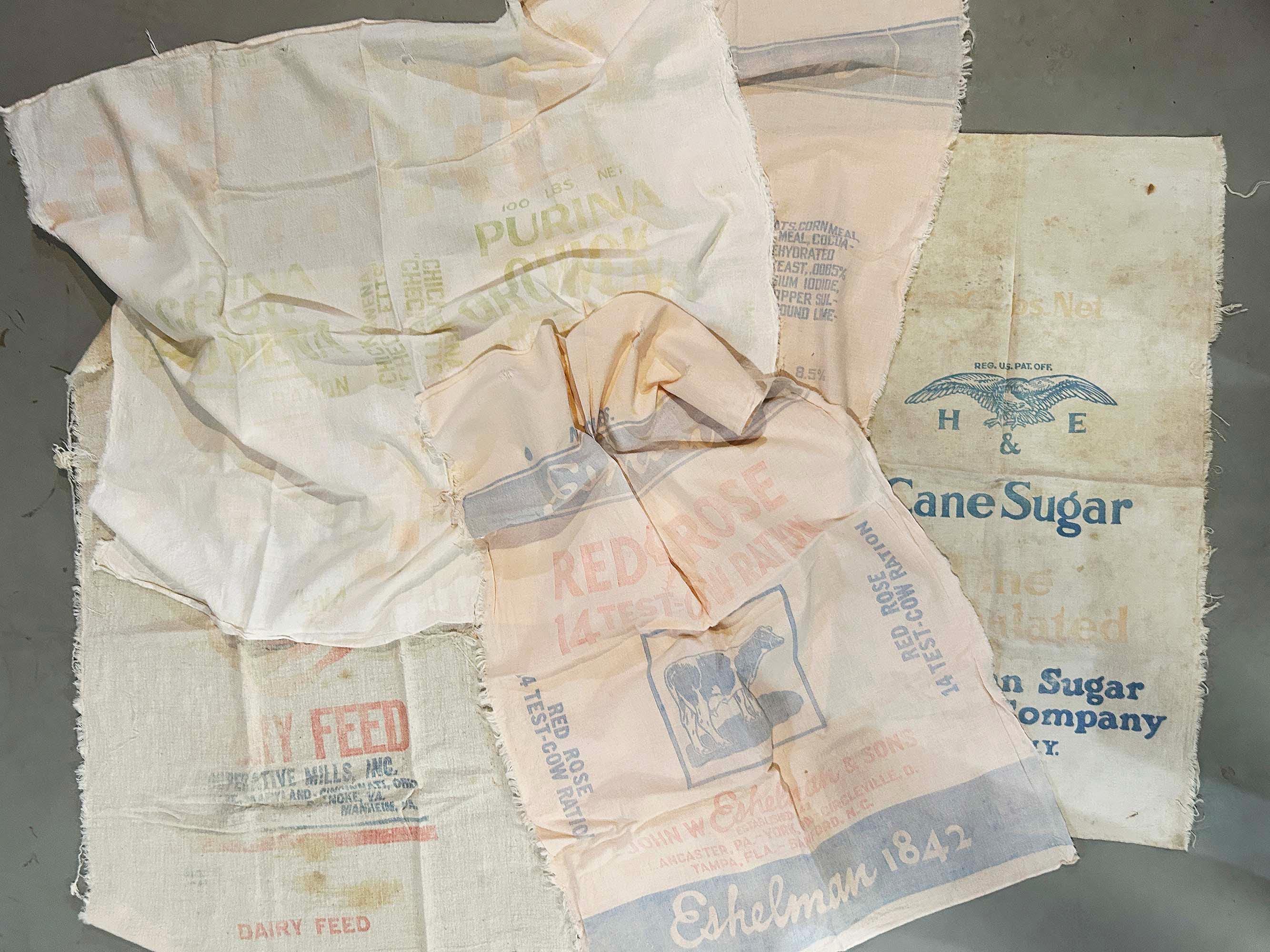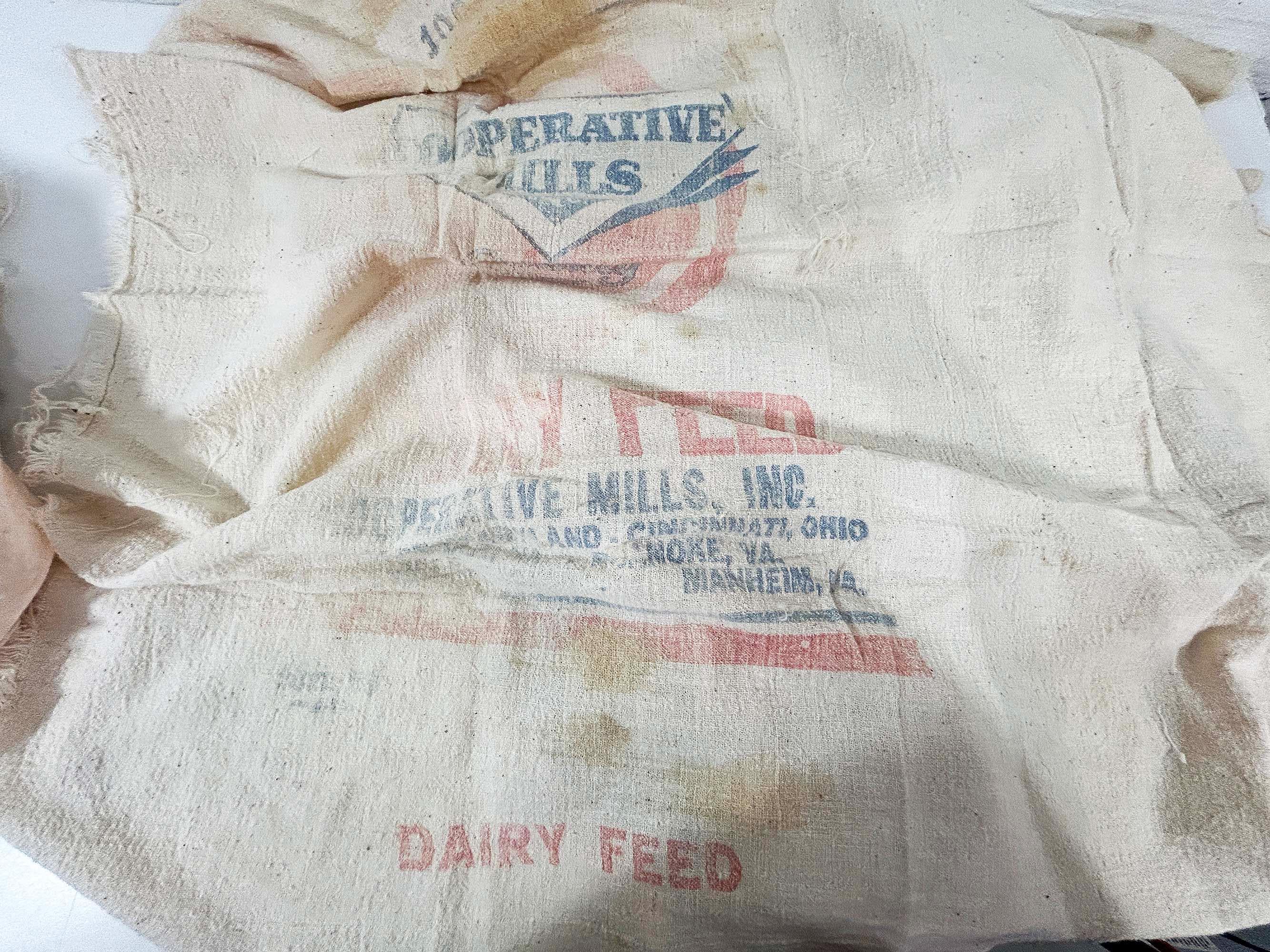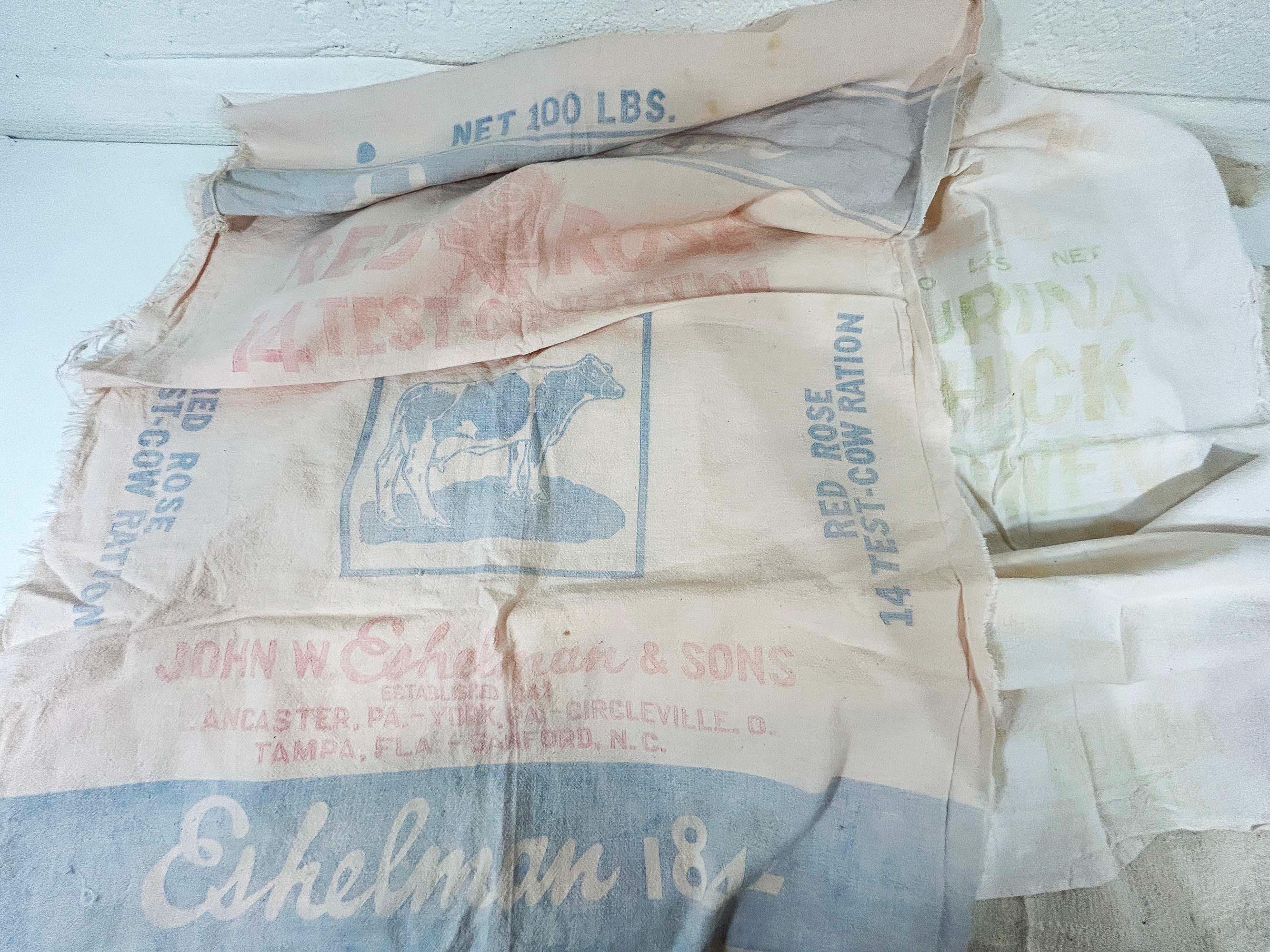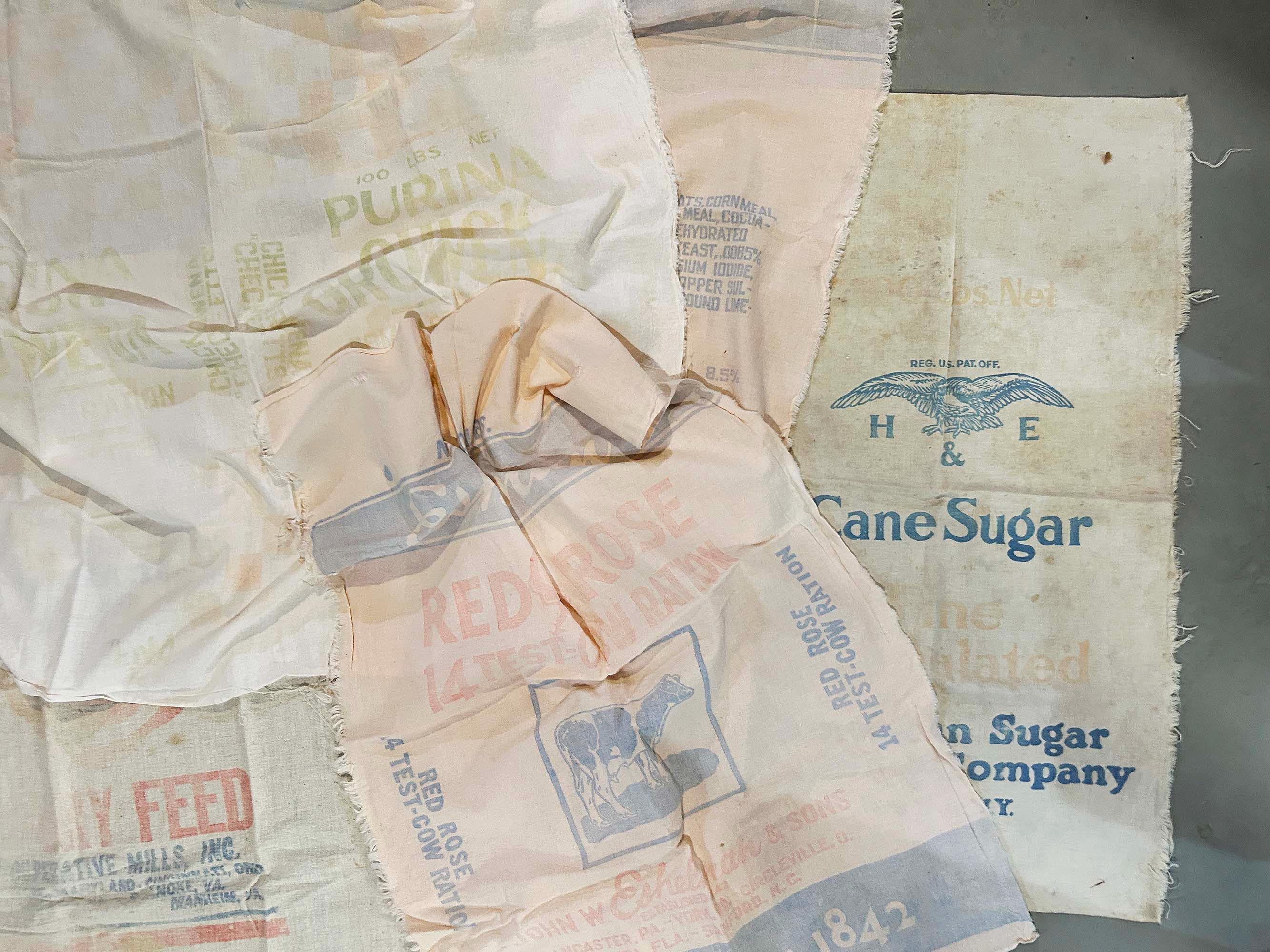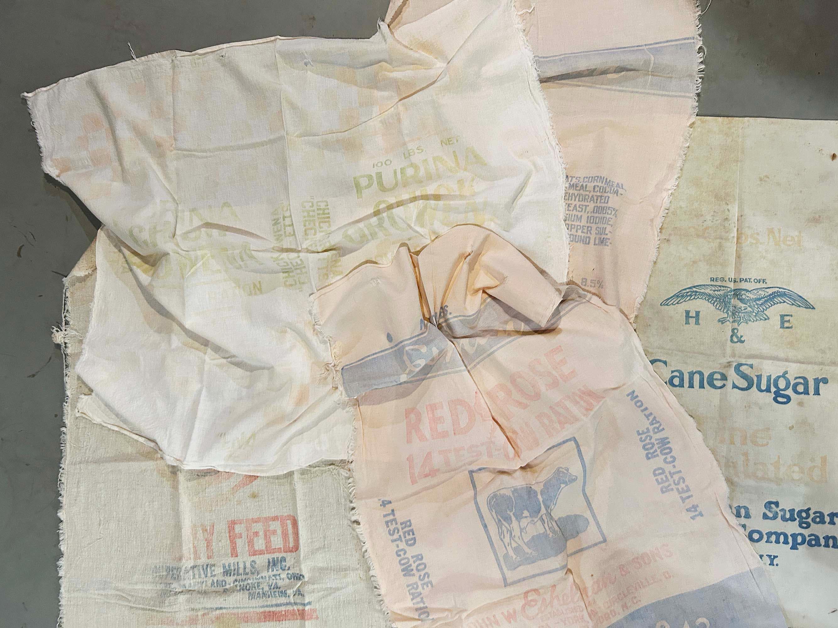 Very cool vintage feed, flour, and sugar fabric sacks. Two are complete and still bags and the other 5 have been cut up. All the fabric graphics are faded. Super cool for projects.