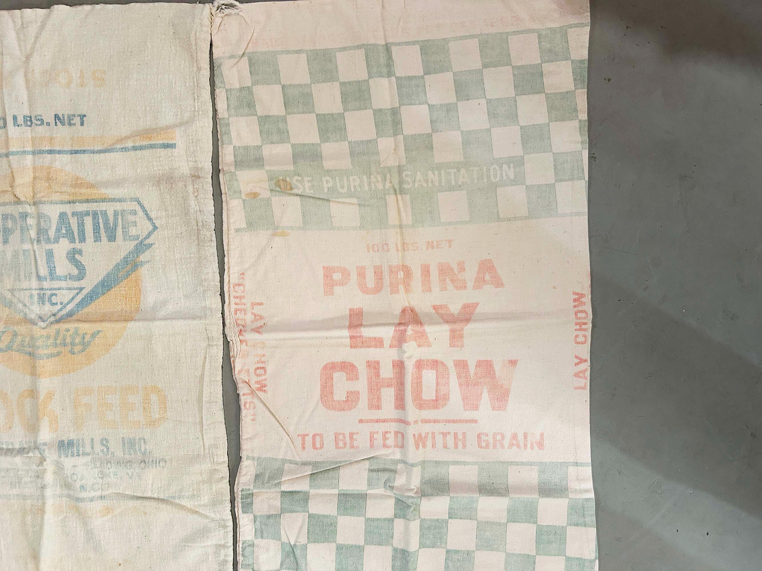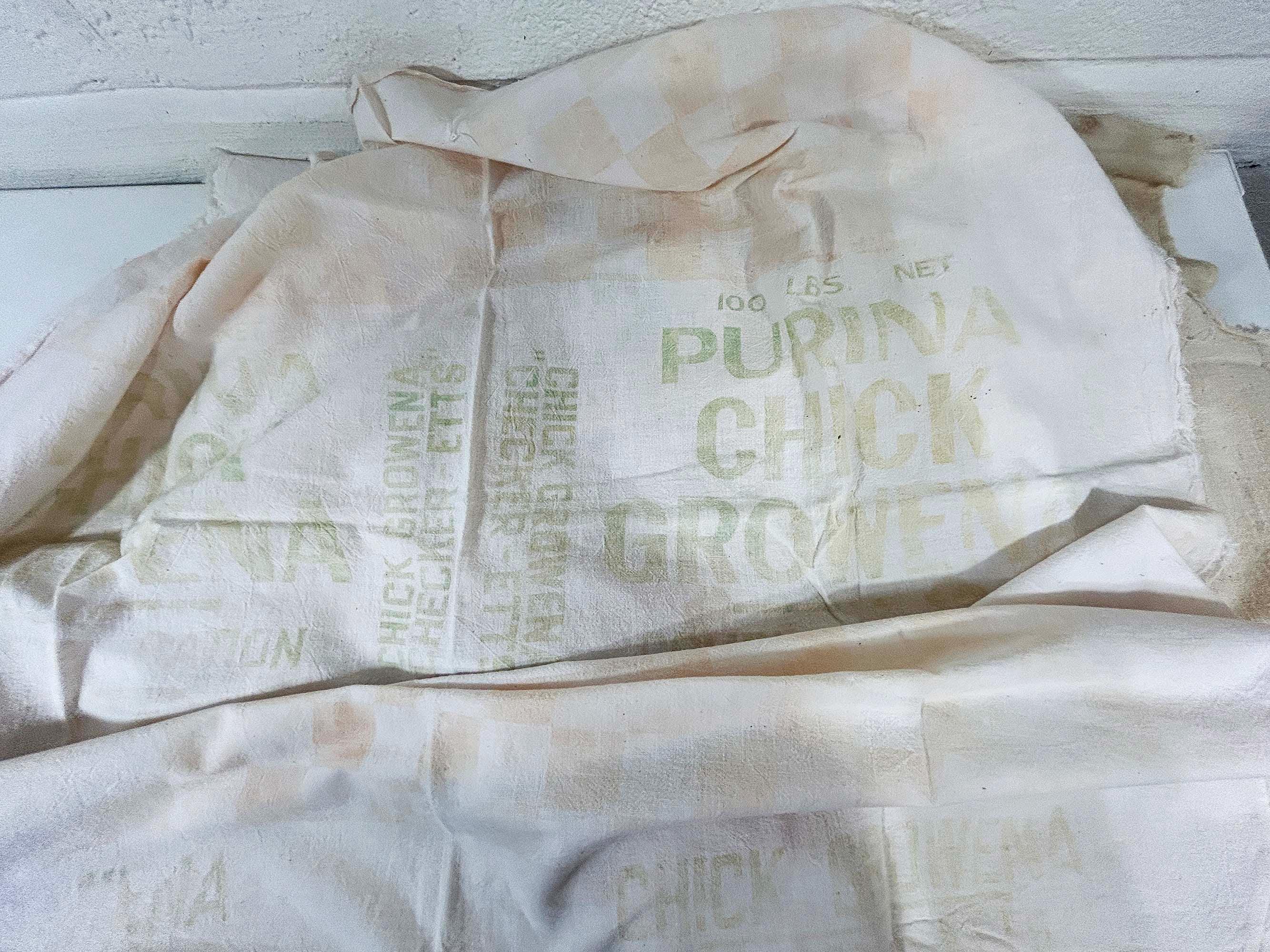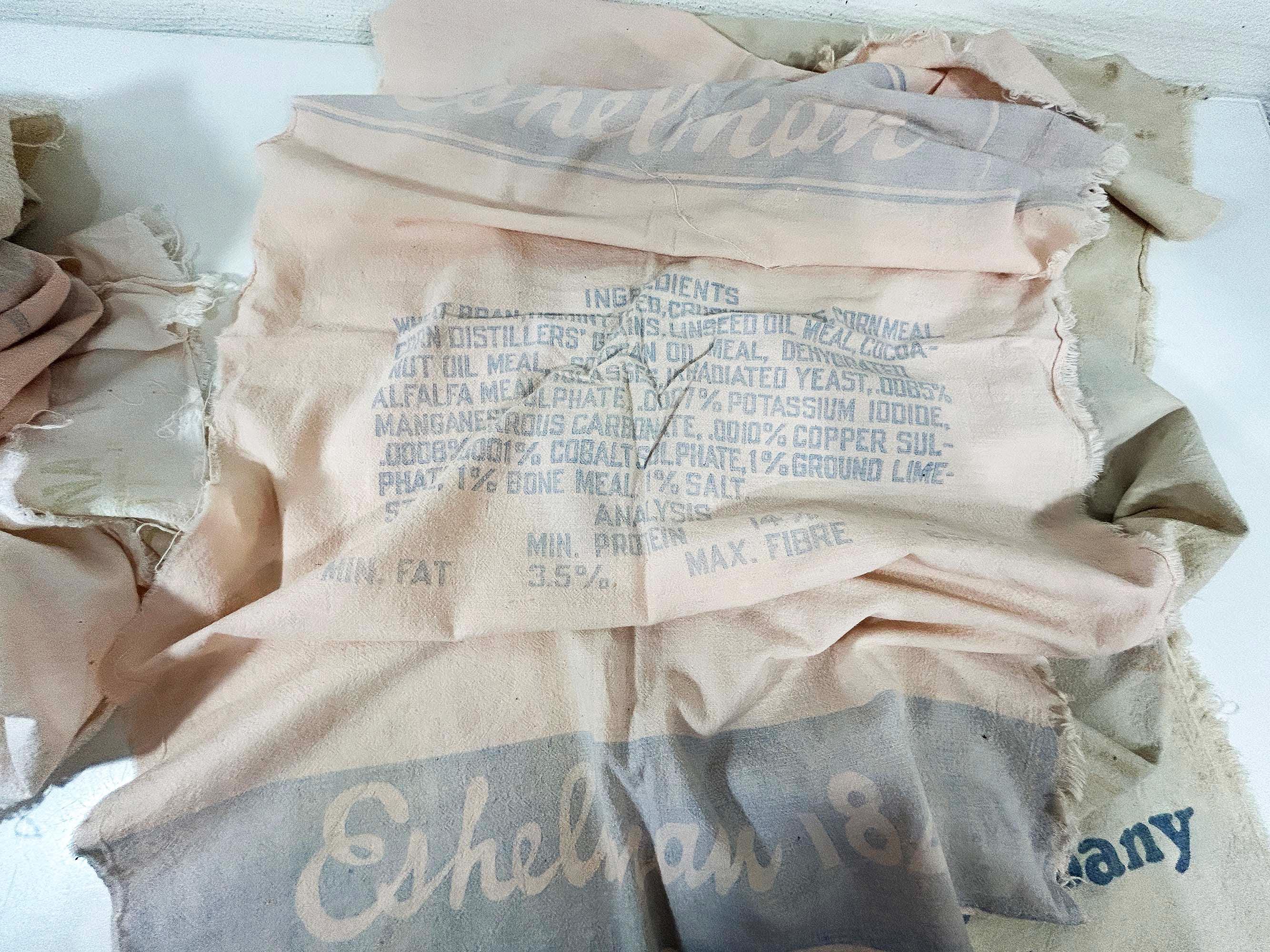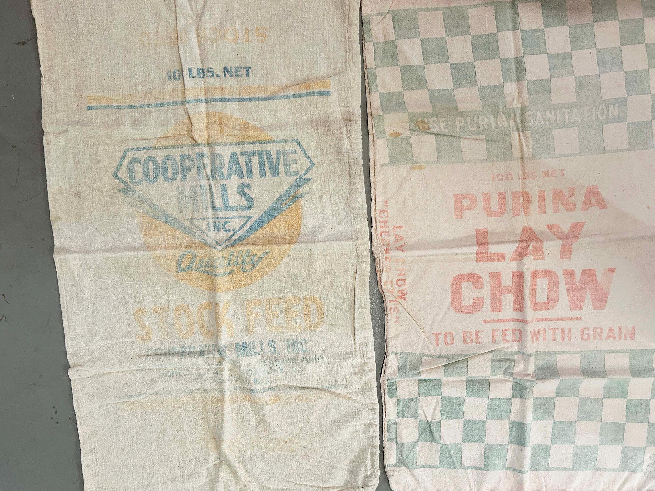 Very cool vintage feed, flour, and sugar fabric sacks. Two are complete and still bags and the other 5 have been cut up. All the fabric graphics are faded. Super cool for projects.