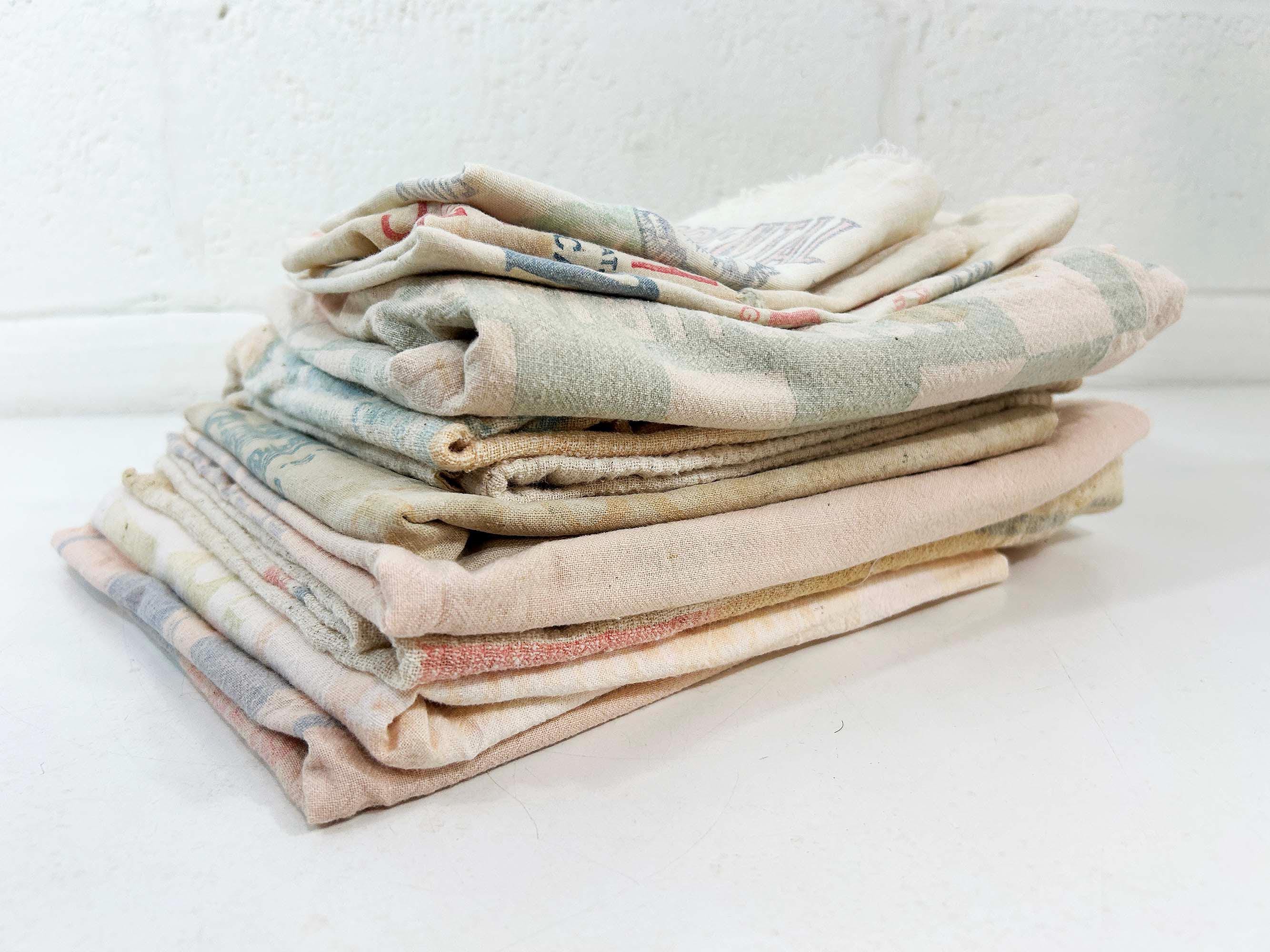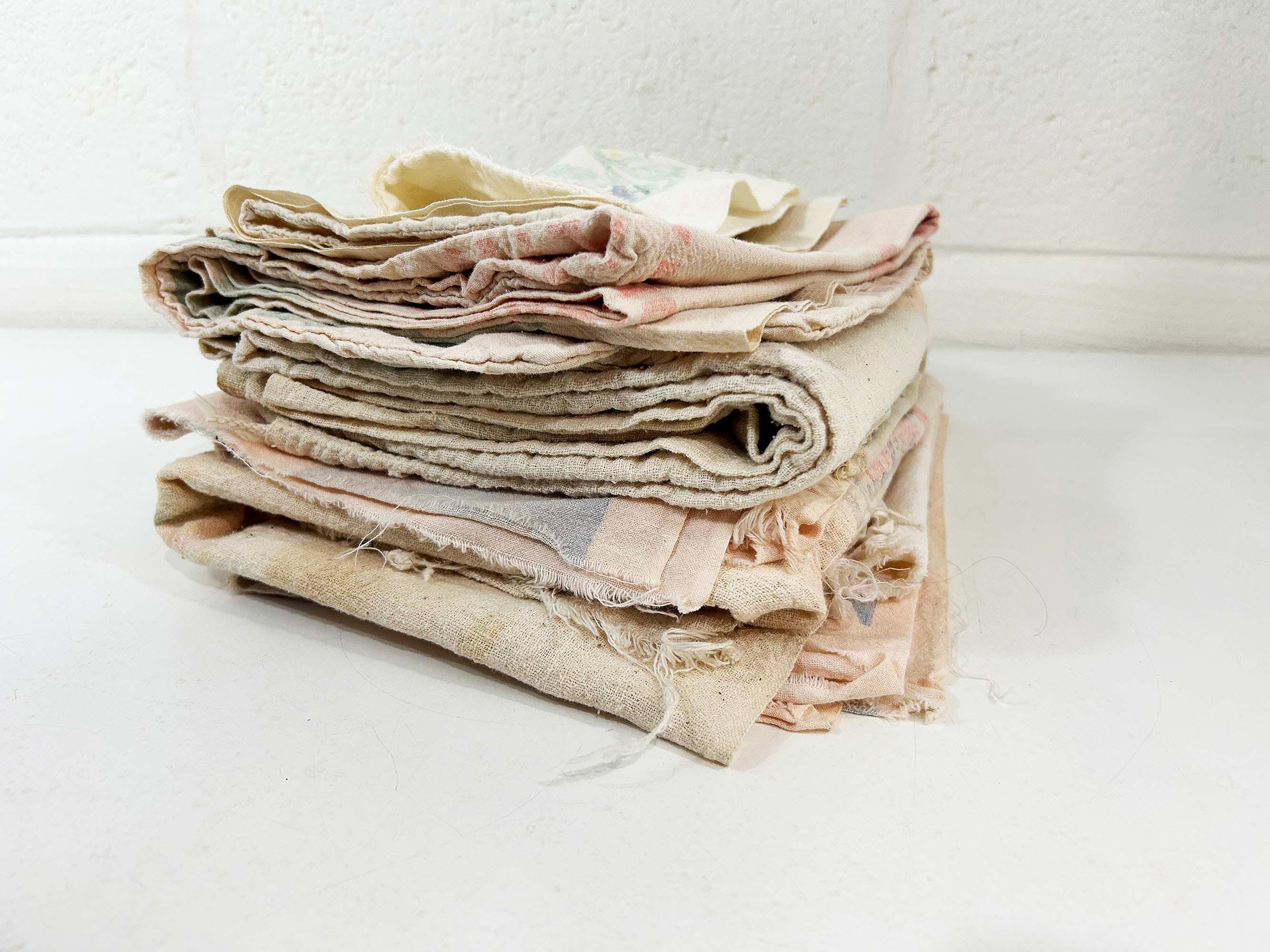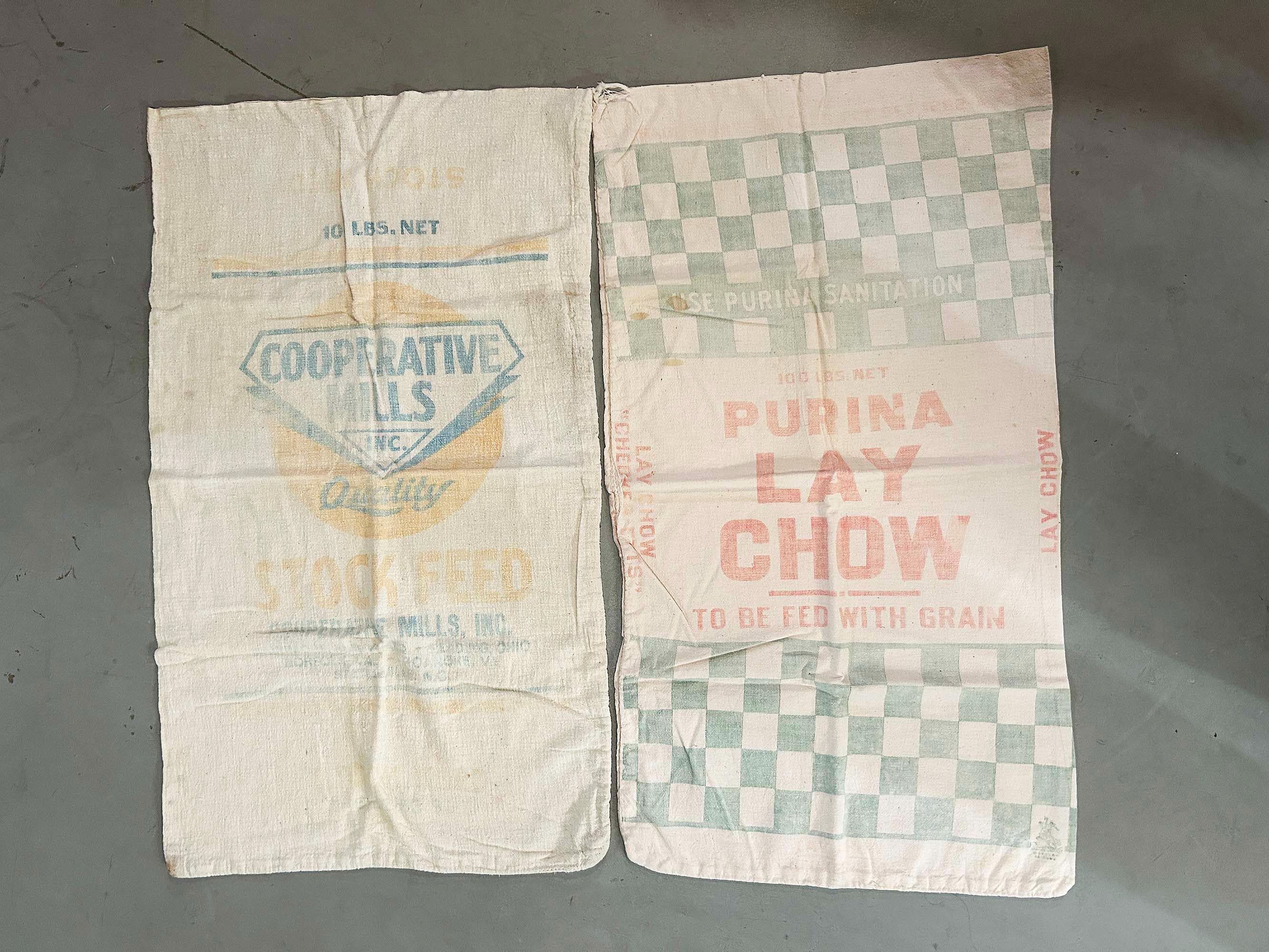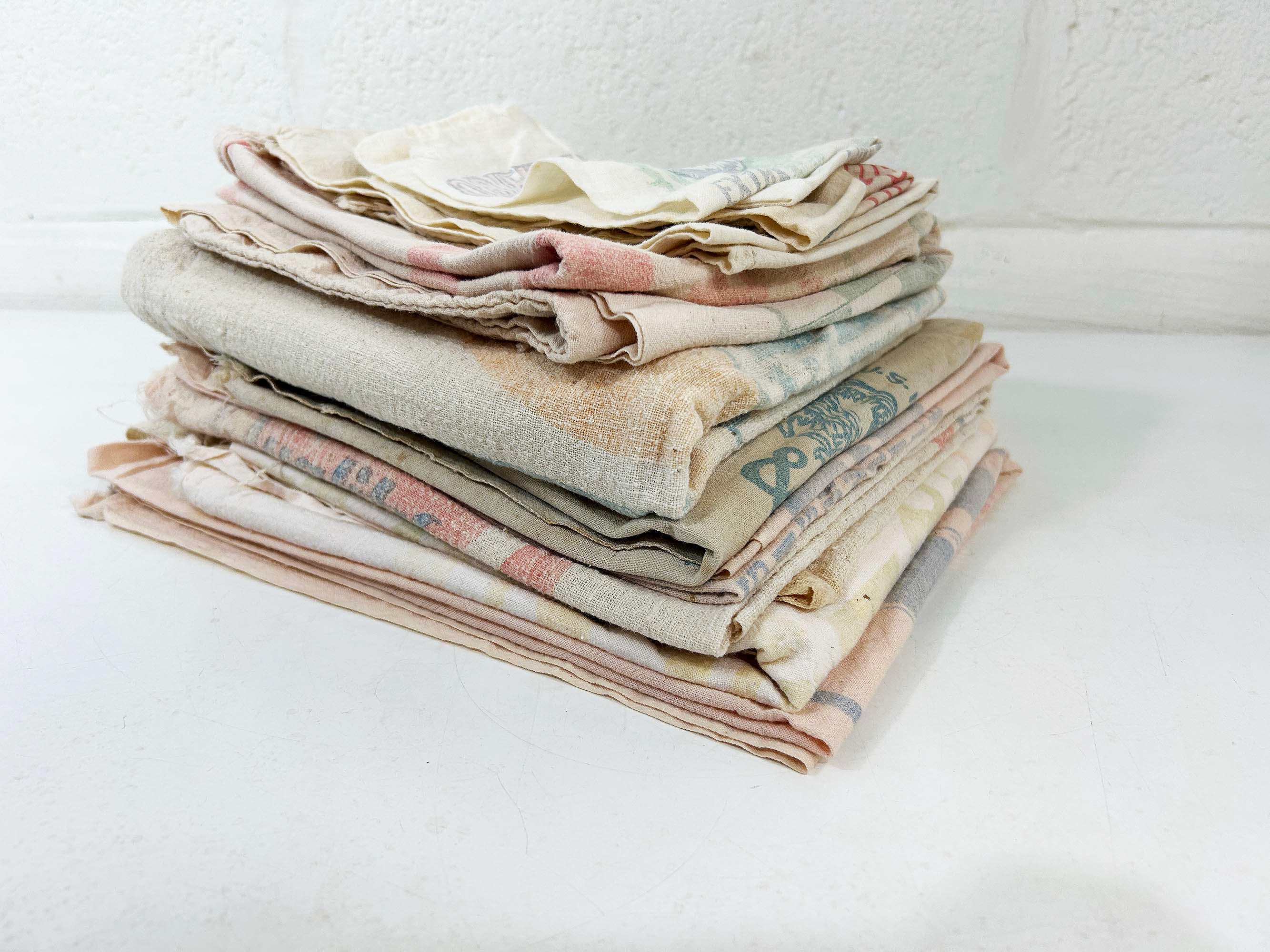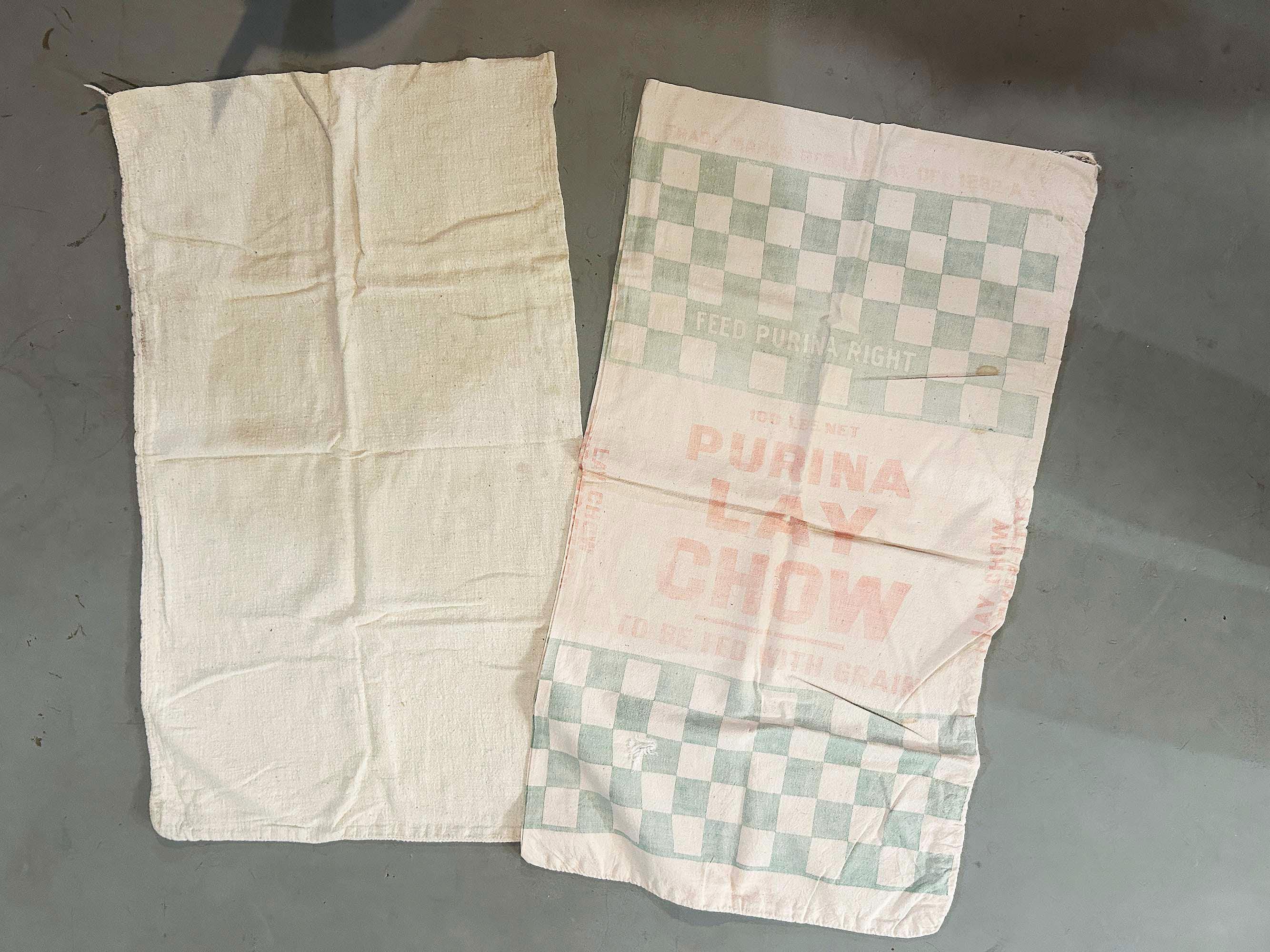 Very cool vintage feed, flour, and sugar fabric sacks. Two are complete and still bags and the other 5 have been cut up. All the fabric graphics are faded. Super cool for projects.