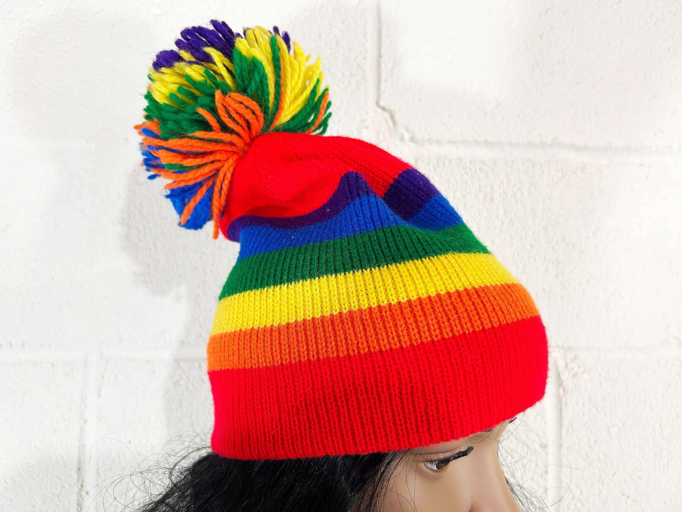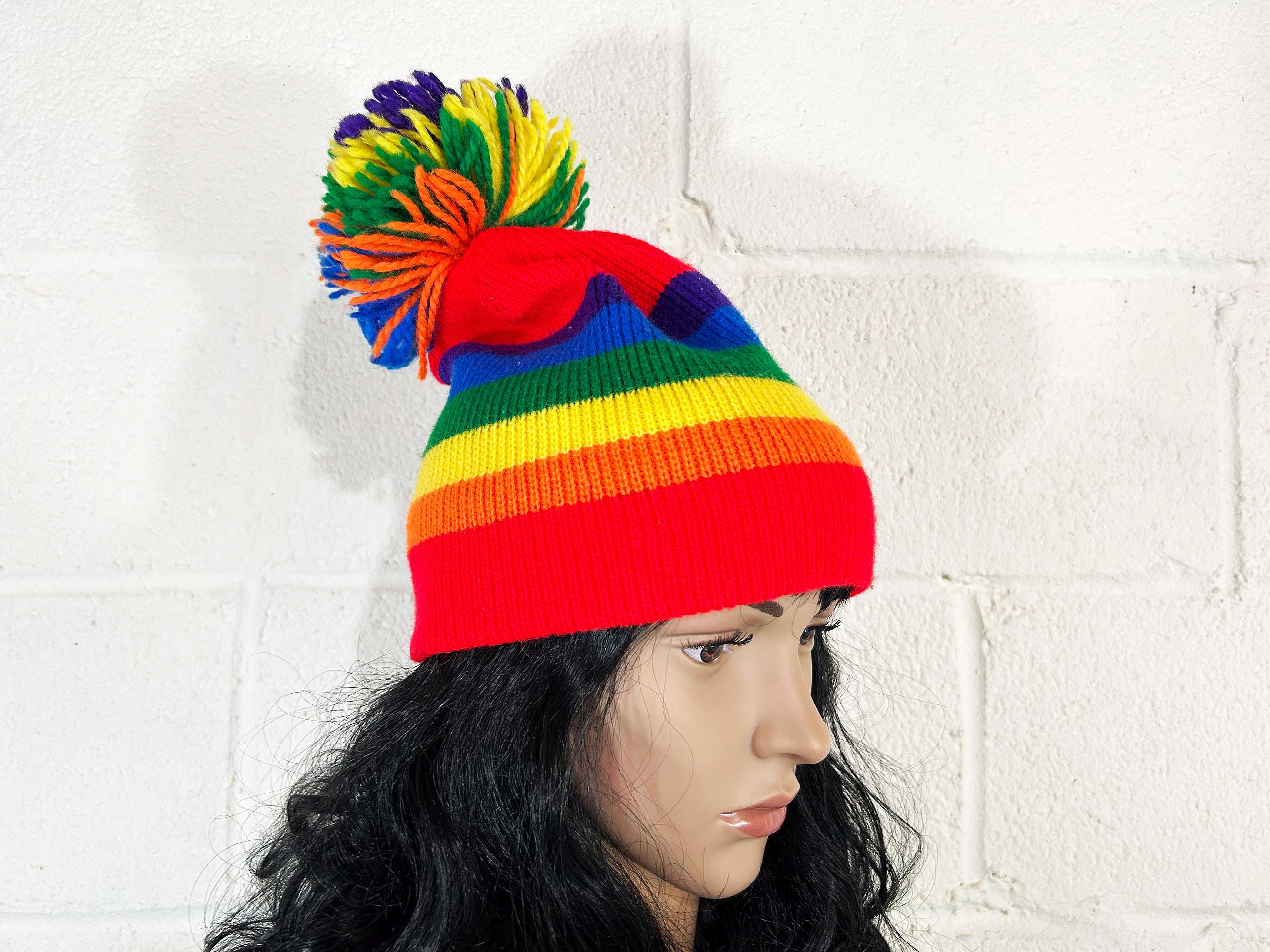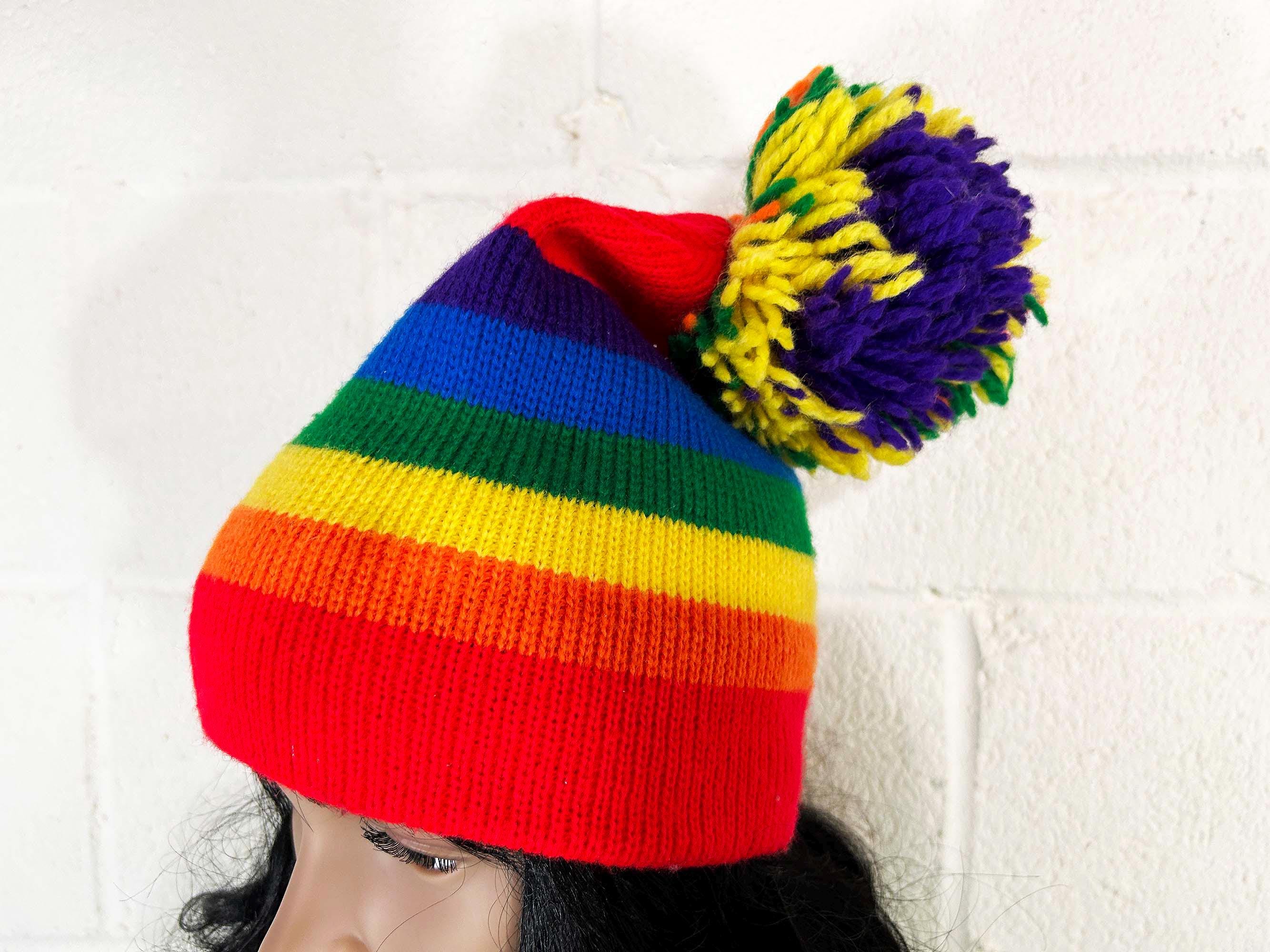 Adorable rainbow striped pom pom hat! Super cute and stretchy - perfect for the fall and winter.