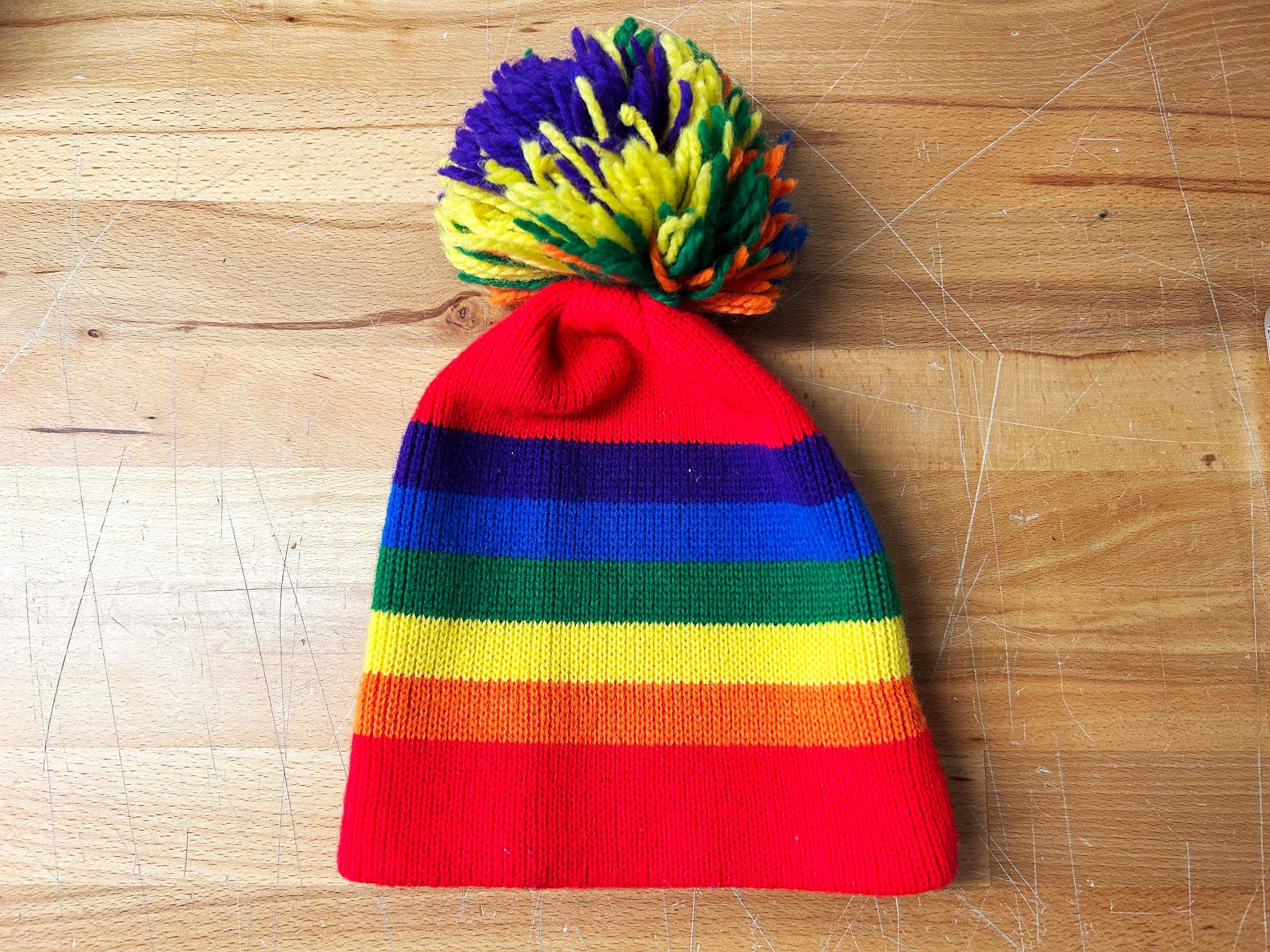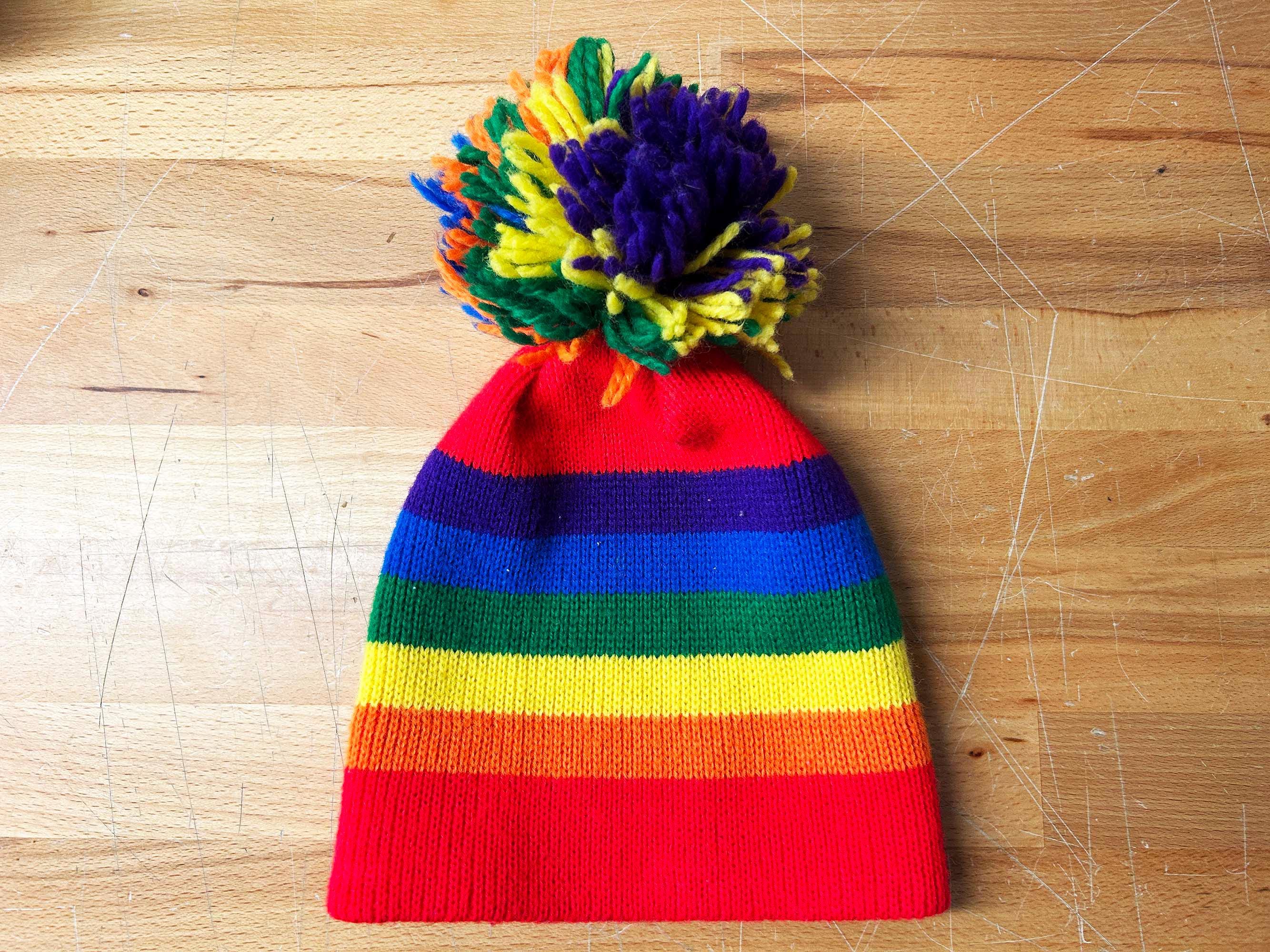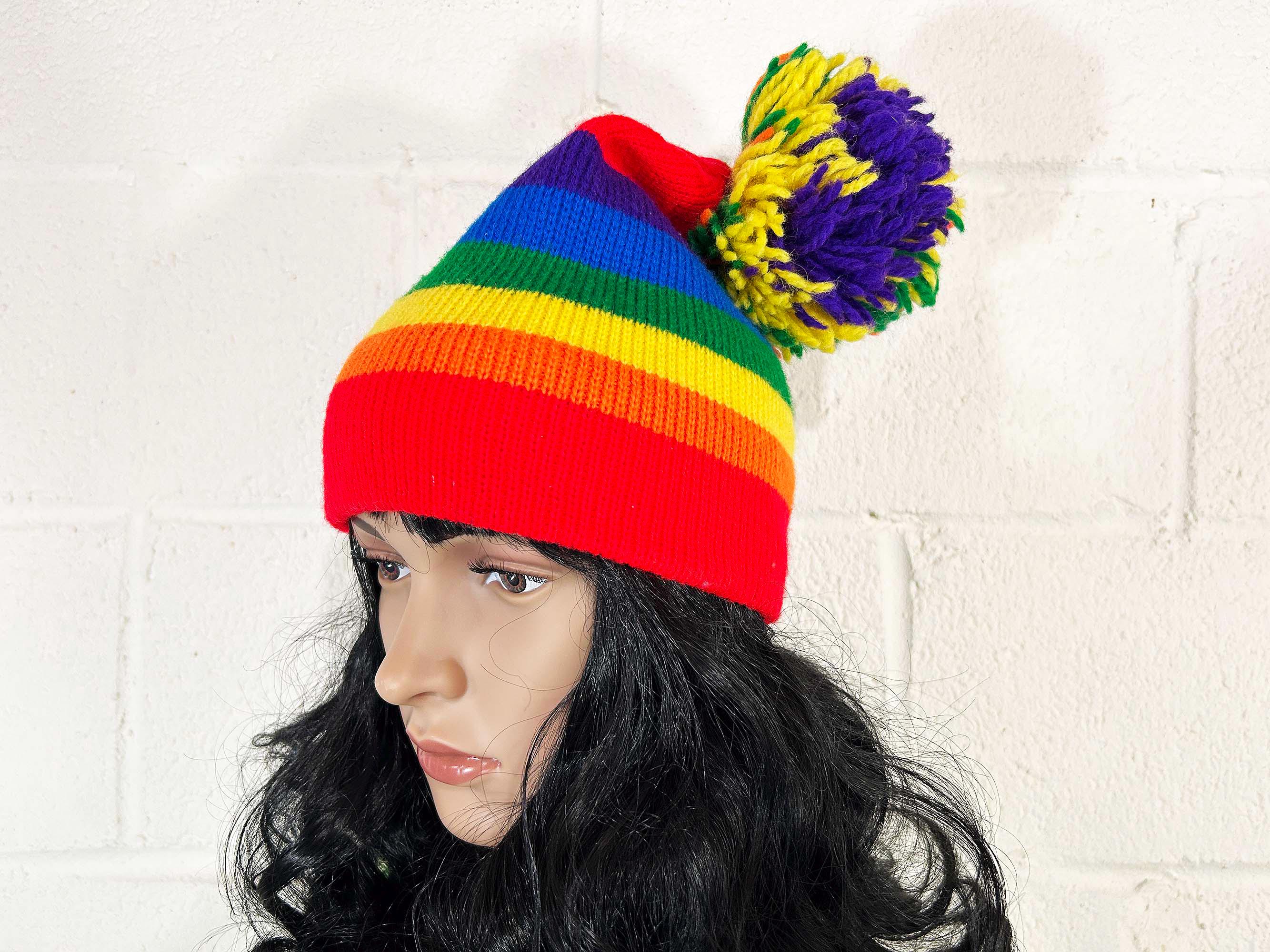 Adorable rainbow striped pom pom hat! Super cute and stretchy - perfect for the fall and winter.