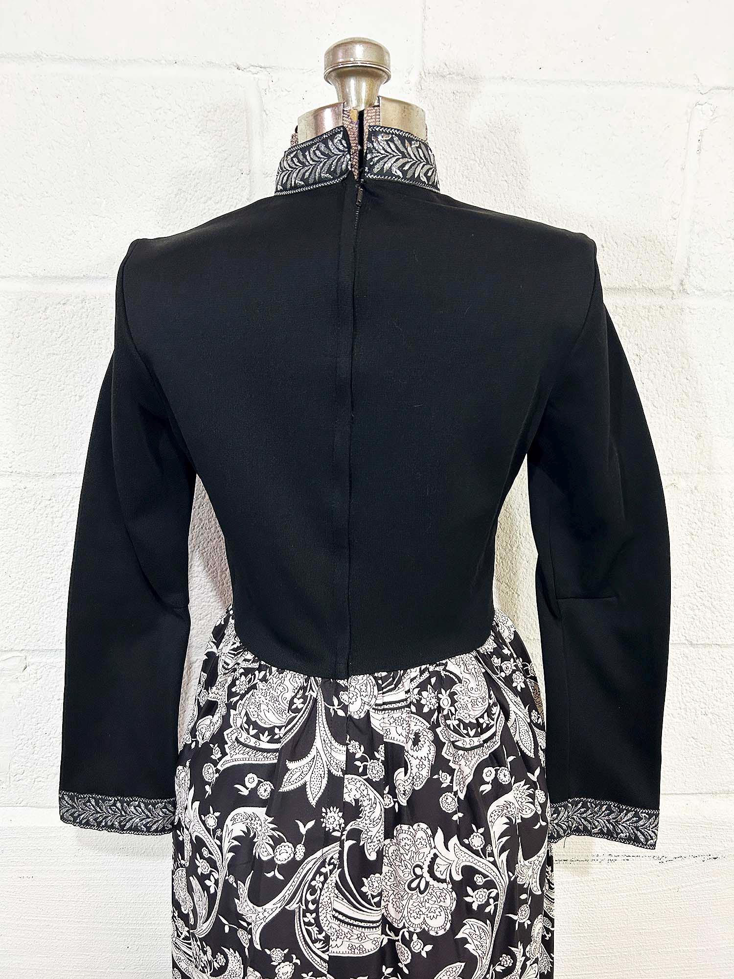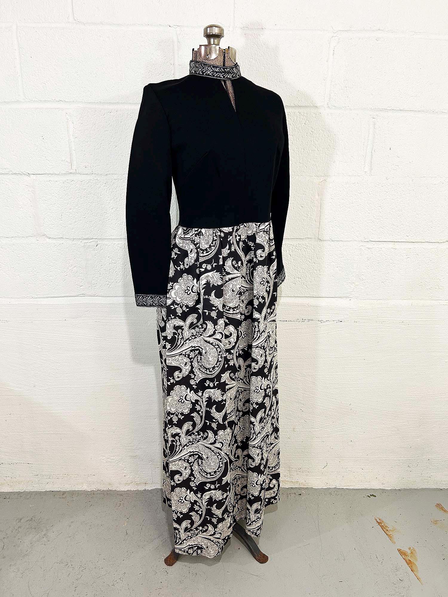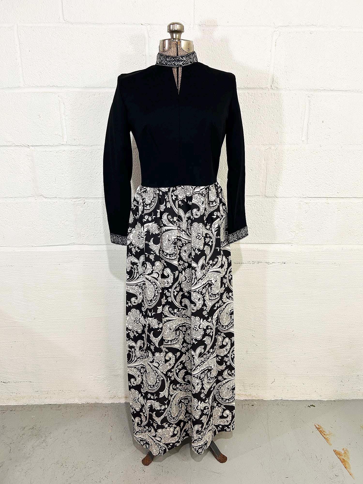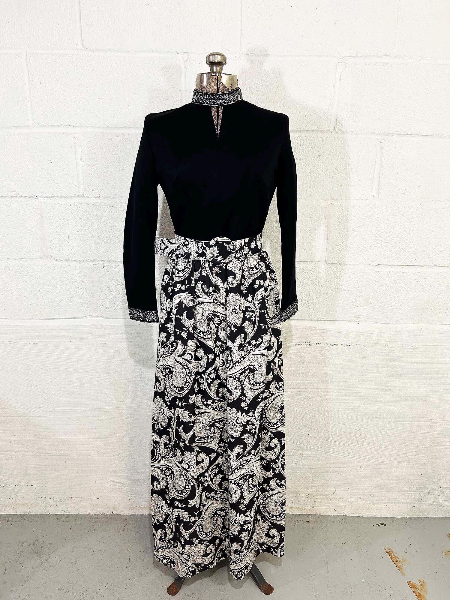 Lovely black and silver trimmed long sleeve maxi dress! Dress is in excellent vintage condition with no significant wear. Pull over style with metal zipper in the back. Bodice fabric has slight stretch, skirt fabric has NO stretch.