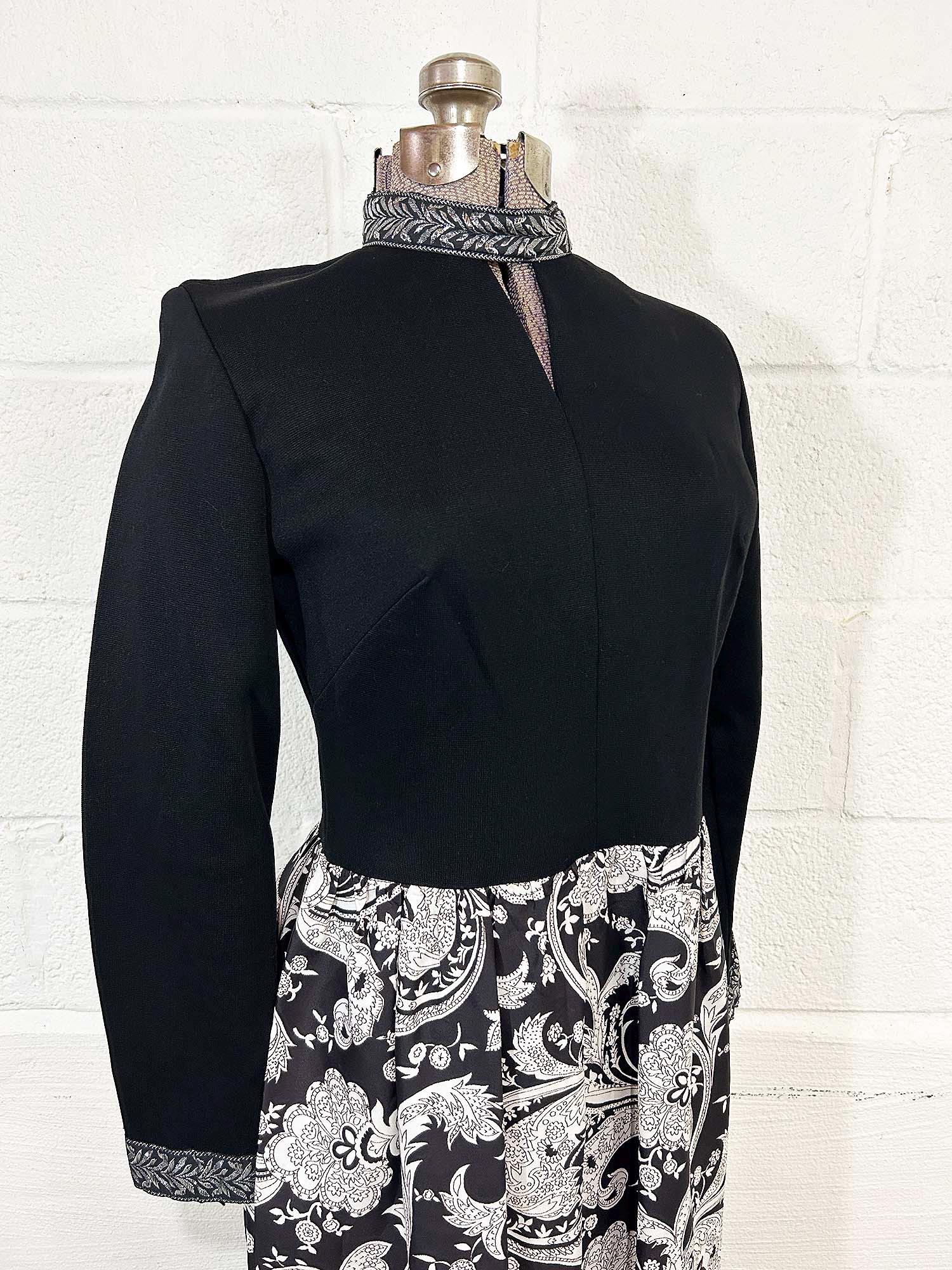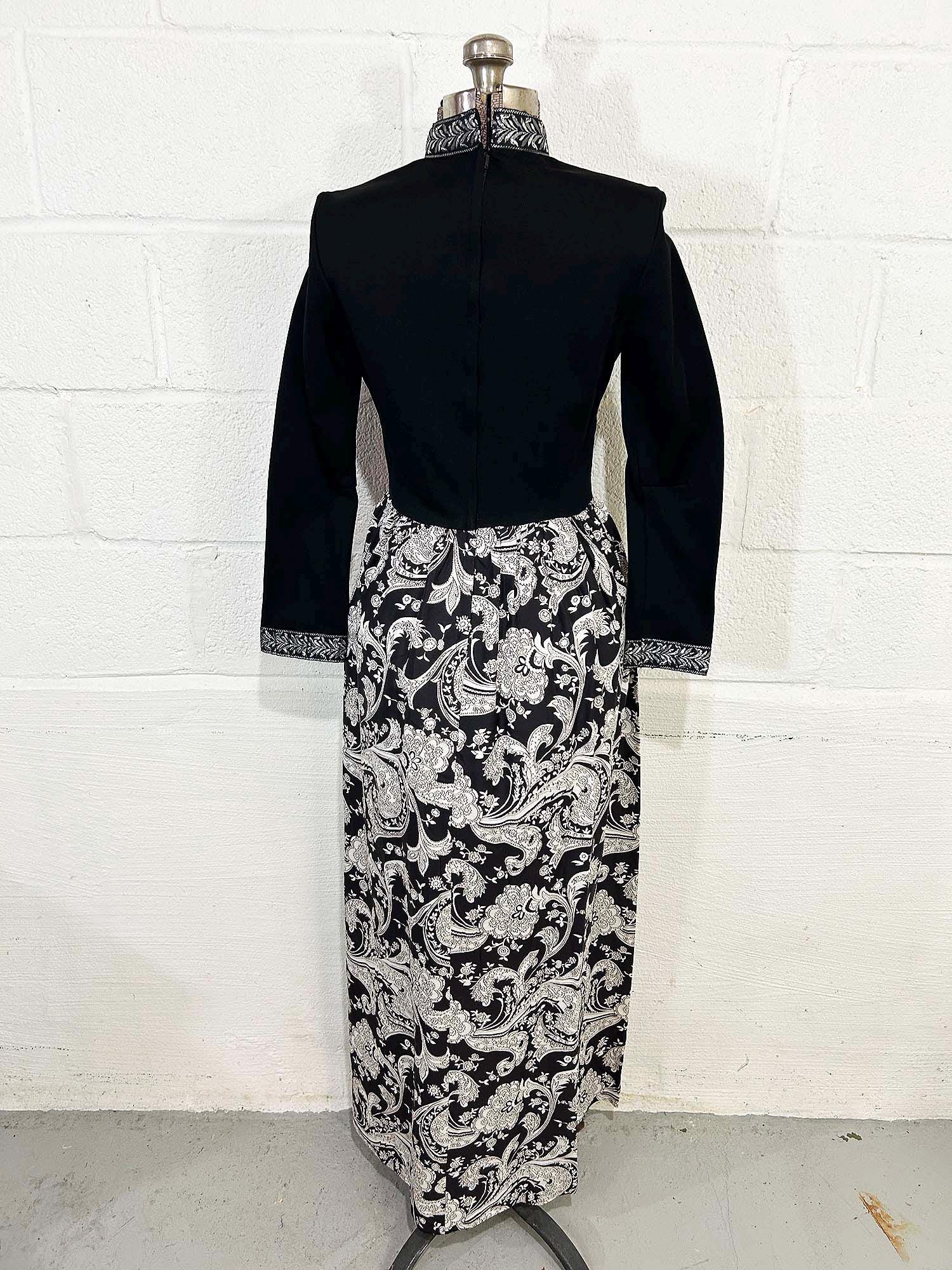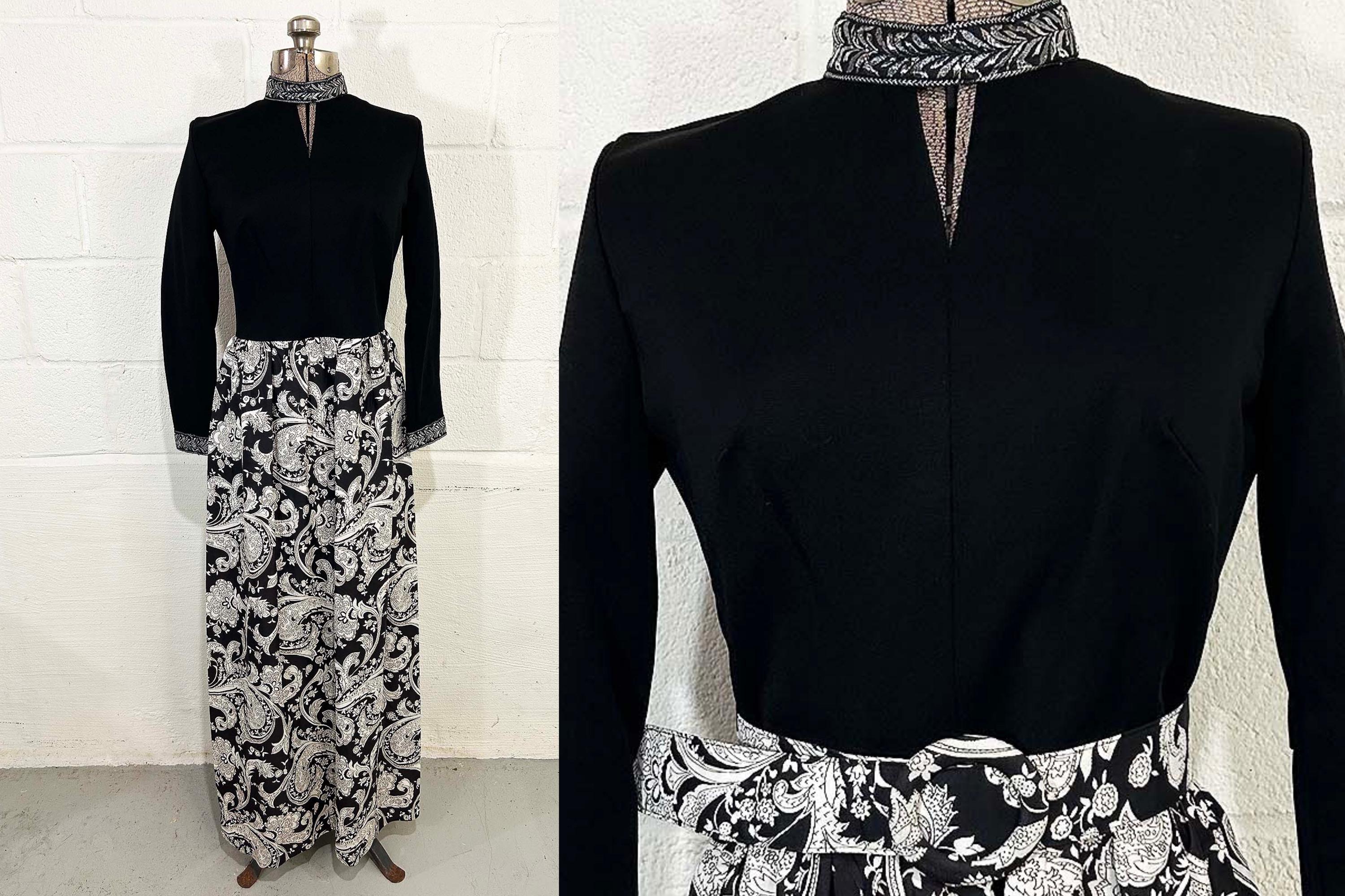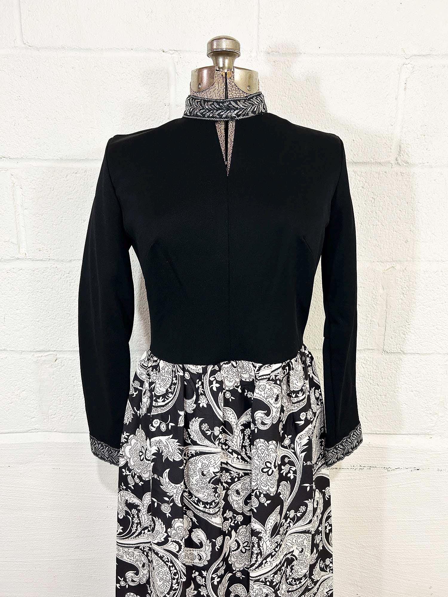 Lovely black and silver trimmed long sleeve maxi dress! Dress is in excellent vintage condition with no significant wear. Pull over style with metal zipper in the back. Bodice fabric has slight stretch, skirt fabric has NO stretch.