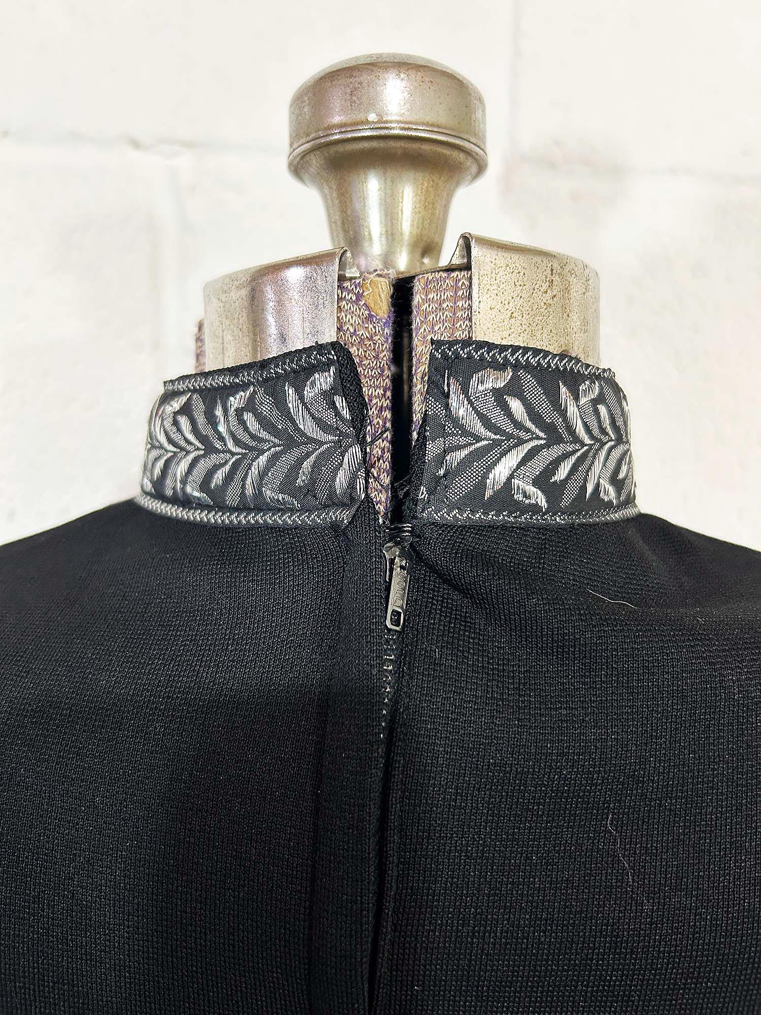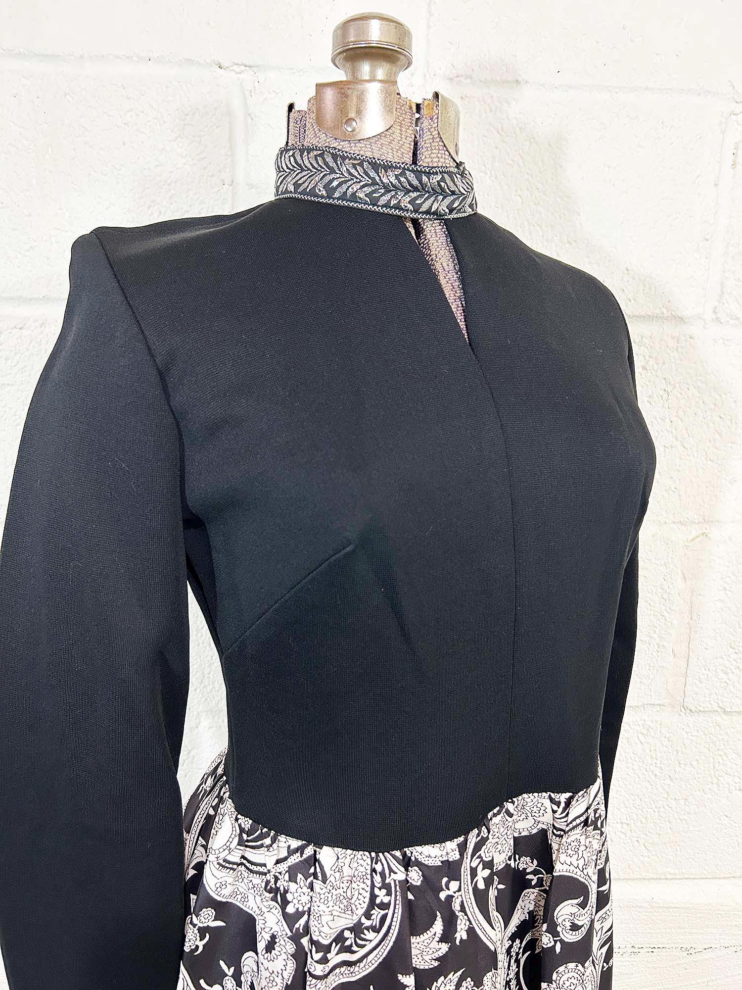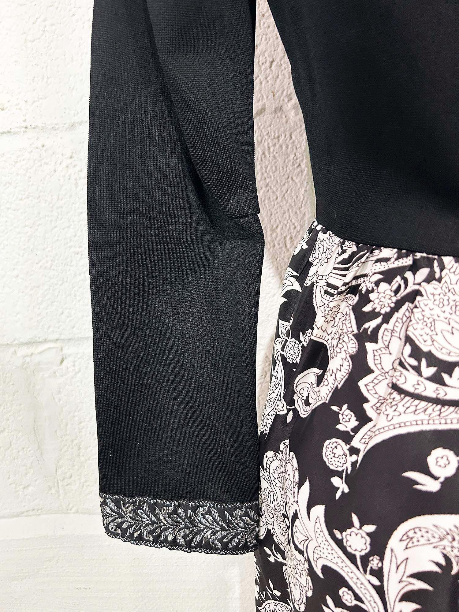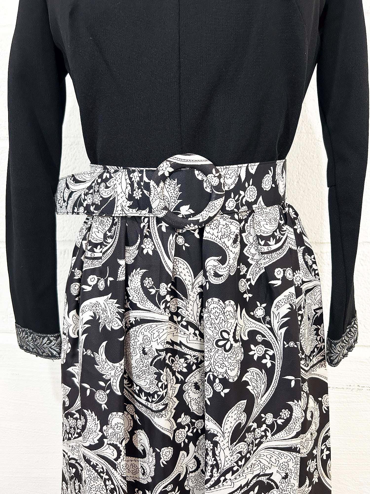 Lovely black and silver trimmed long sleeve maxi dress! Dress is in excellent vintage condition with no significant wear. Pull over style with metal zipper in the back. Bodice fabric has slight stretch, skirt fabric has NO stretch.