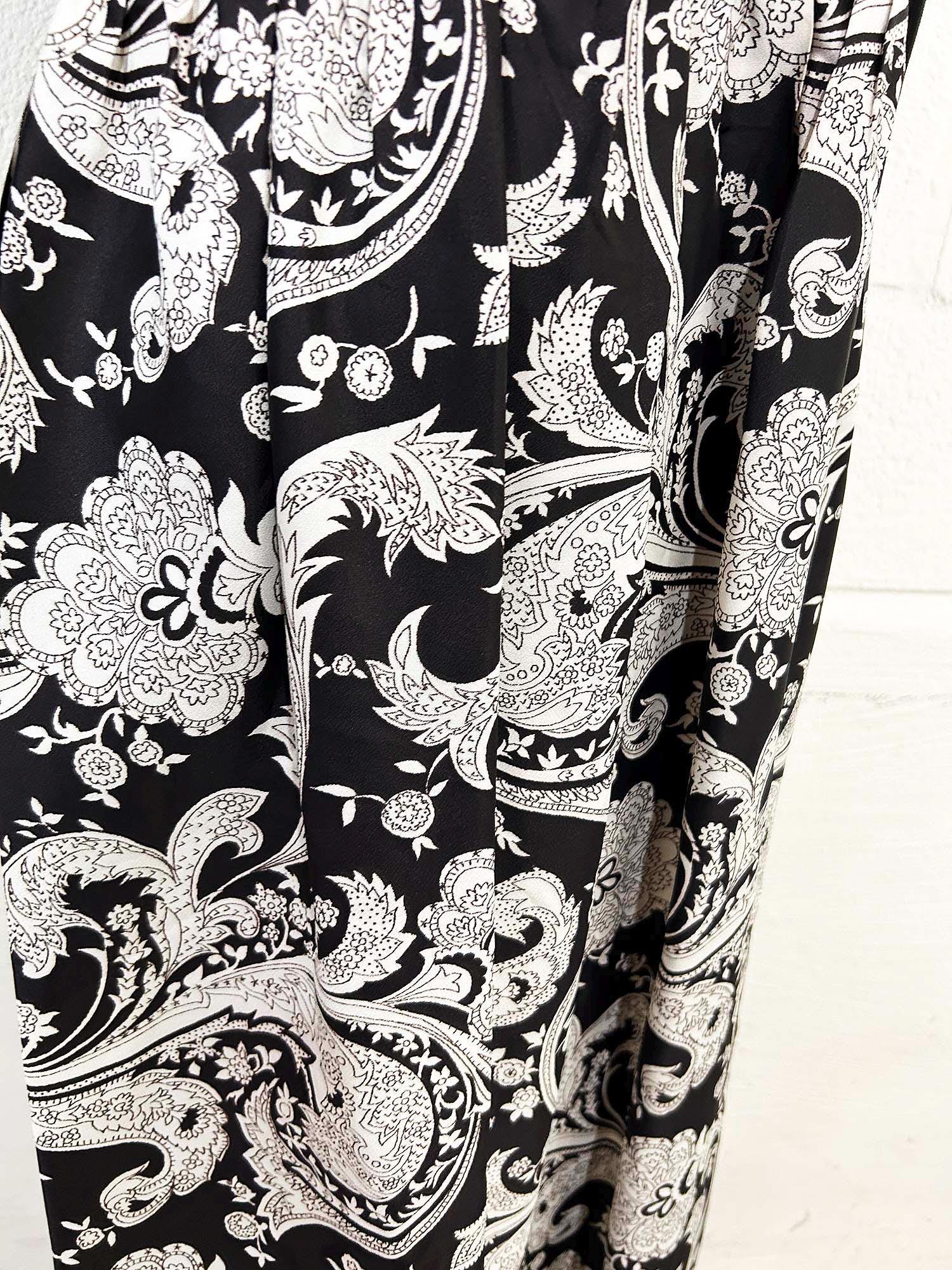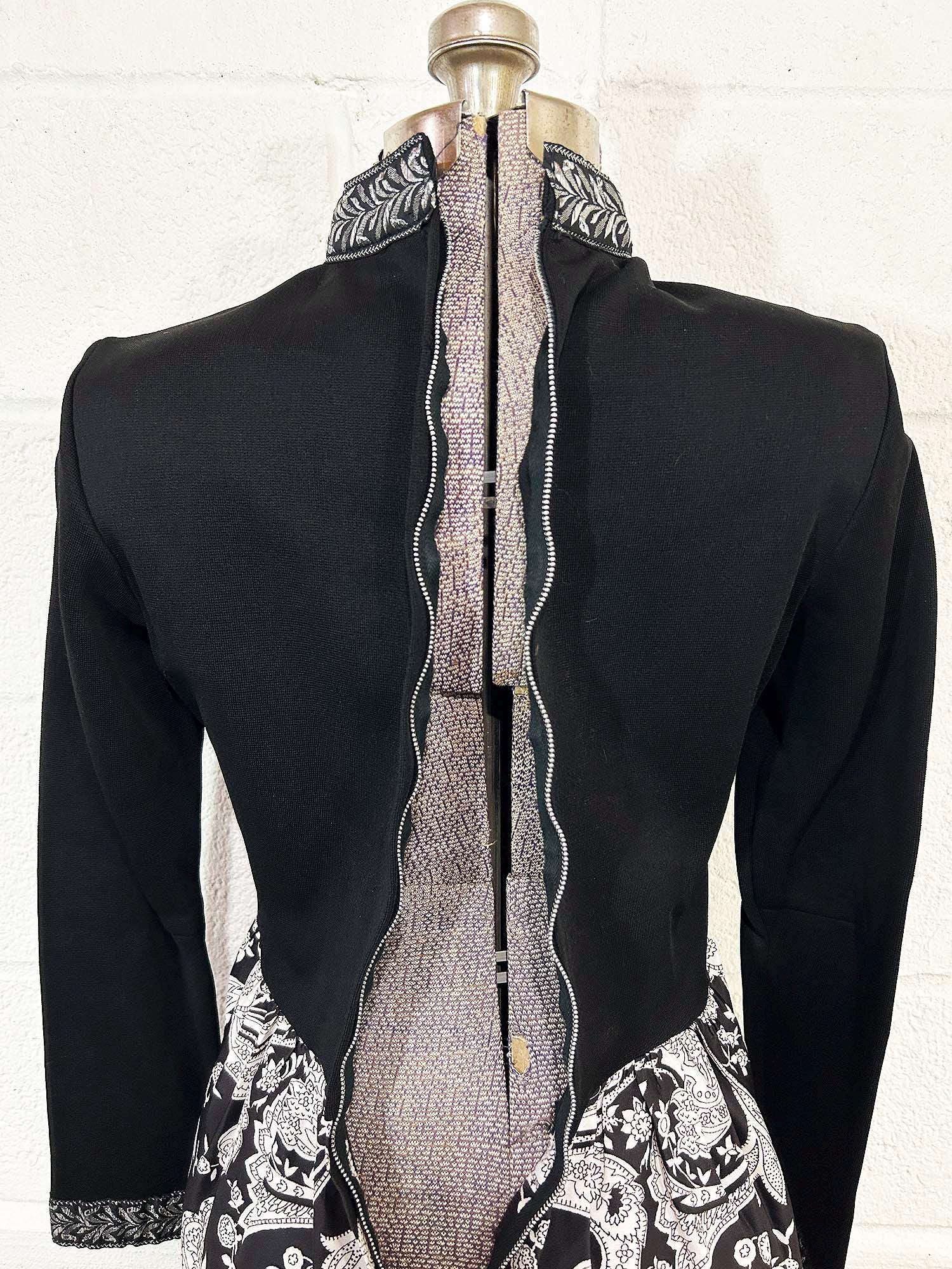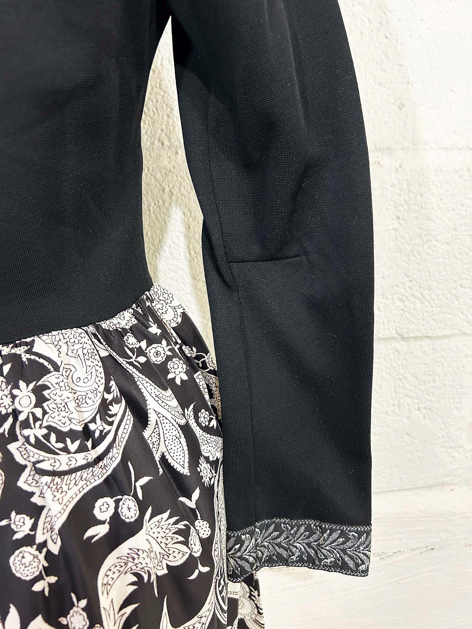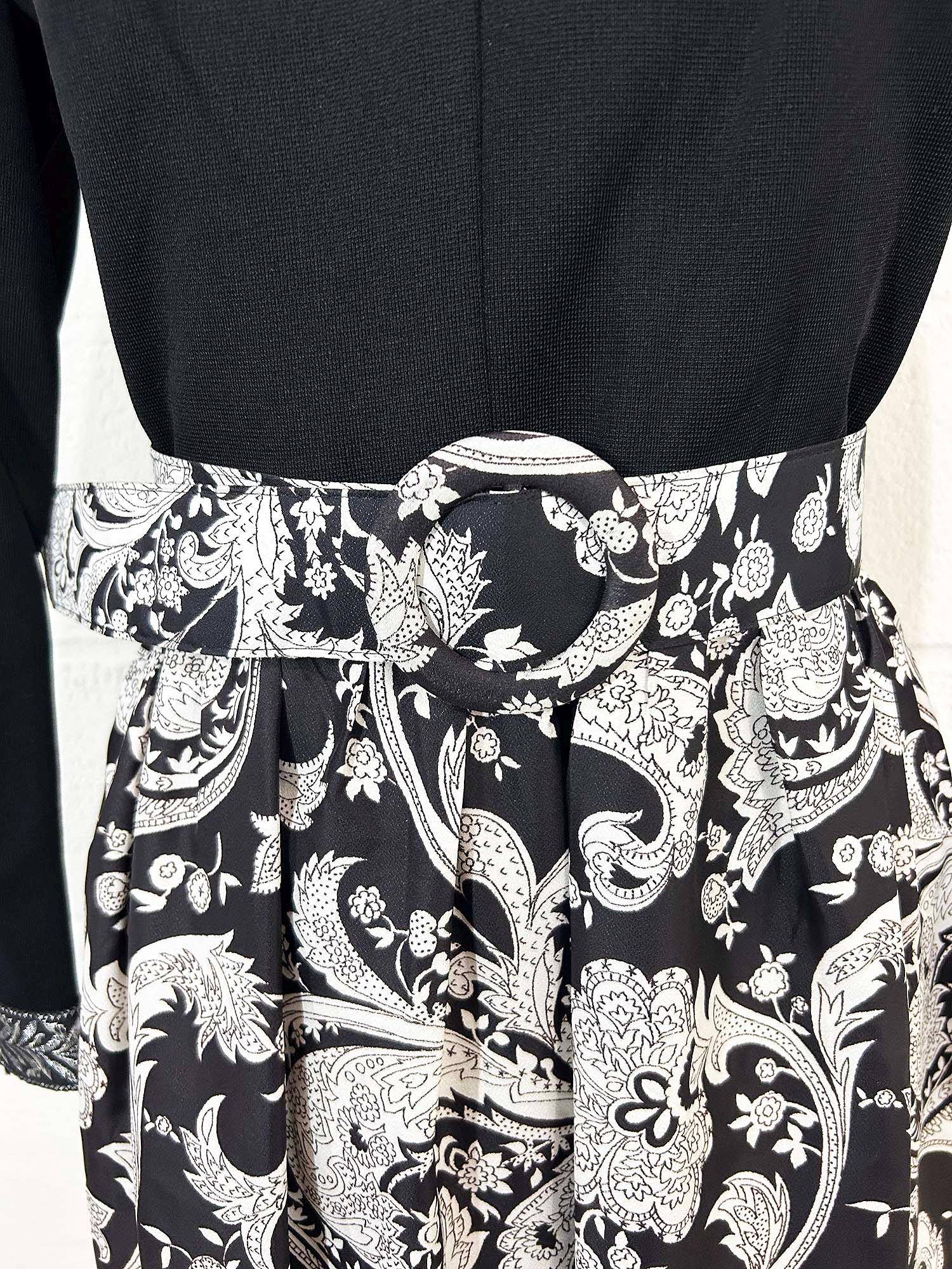 Lovely black and silver trimmed long sleeve maxi dress! Dress is in excellent vintage condition with no significant wear. Pull over style with metal zipper in the back. Bodice fabric has slight stretch, skirt fabric has NO stretch.