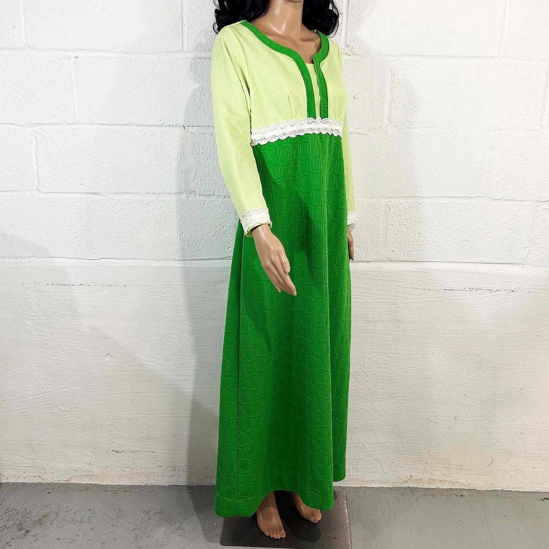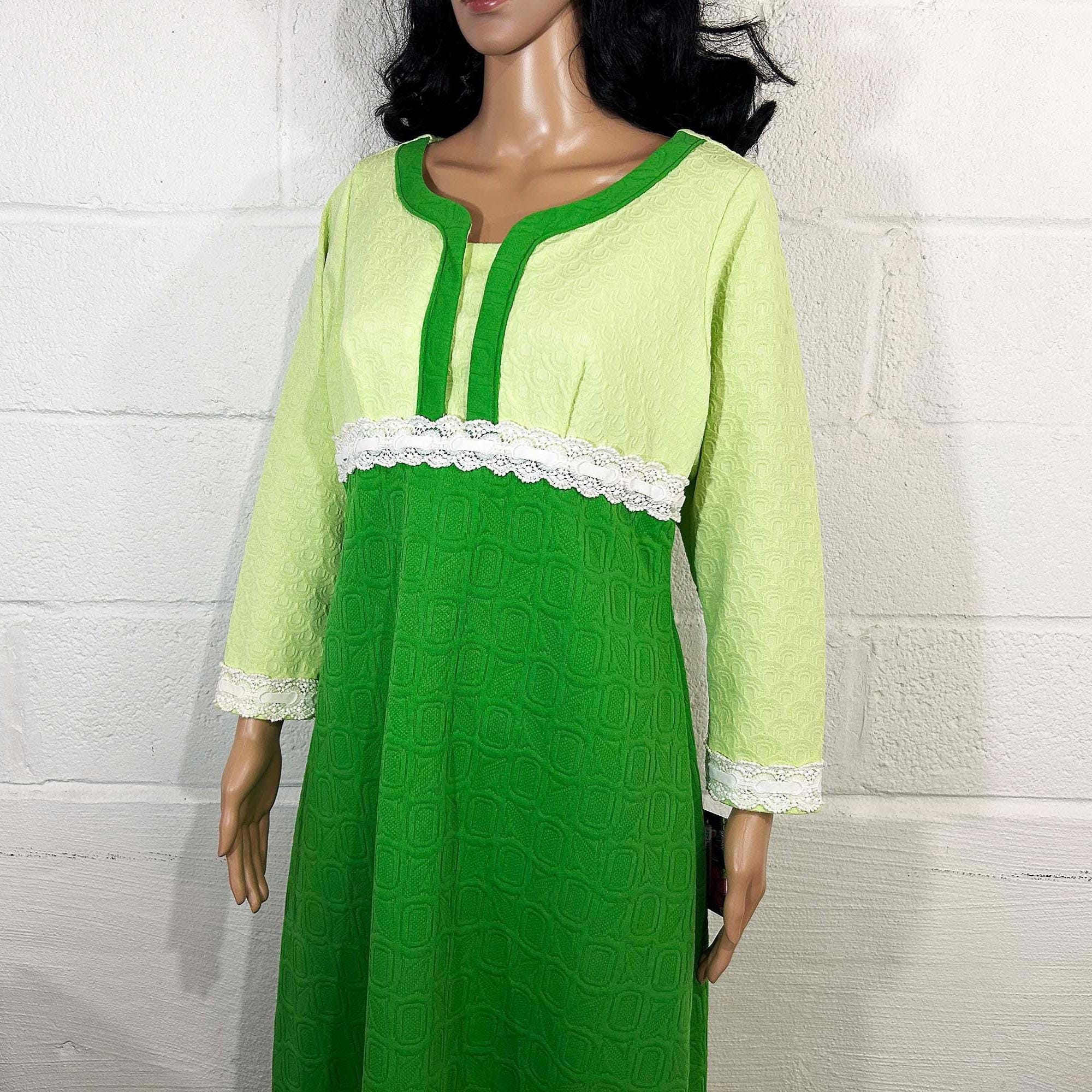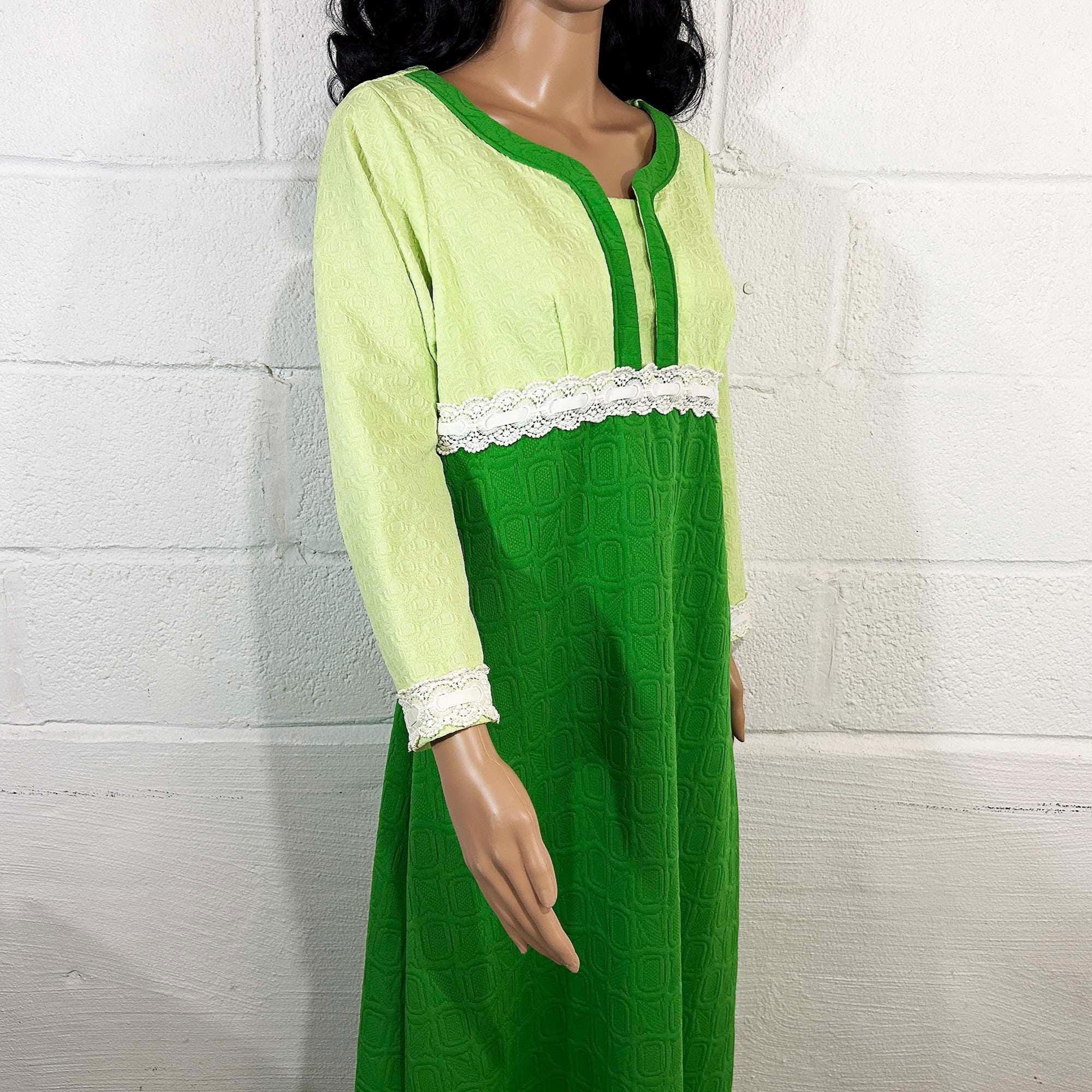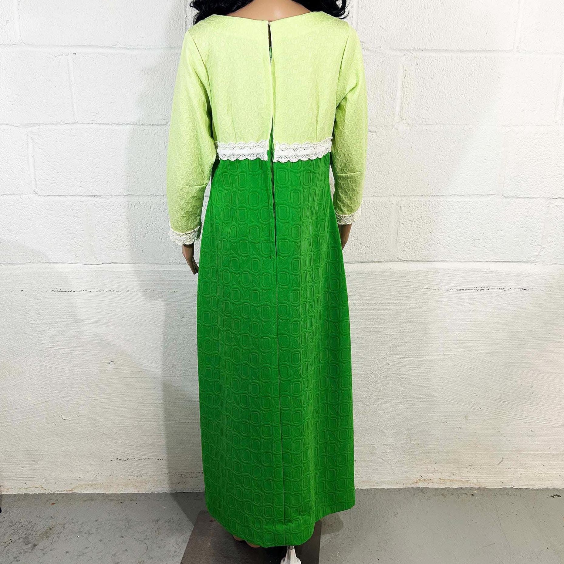 Super cute kelly and lime green mod maxi dress. Long sleeves, empire waist, and a zipper in the black. Lace trim at the waist and wrists. In good vintage condition with no significant wear. Please be sure to inspect all photos.