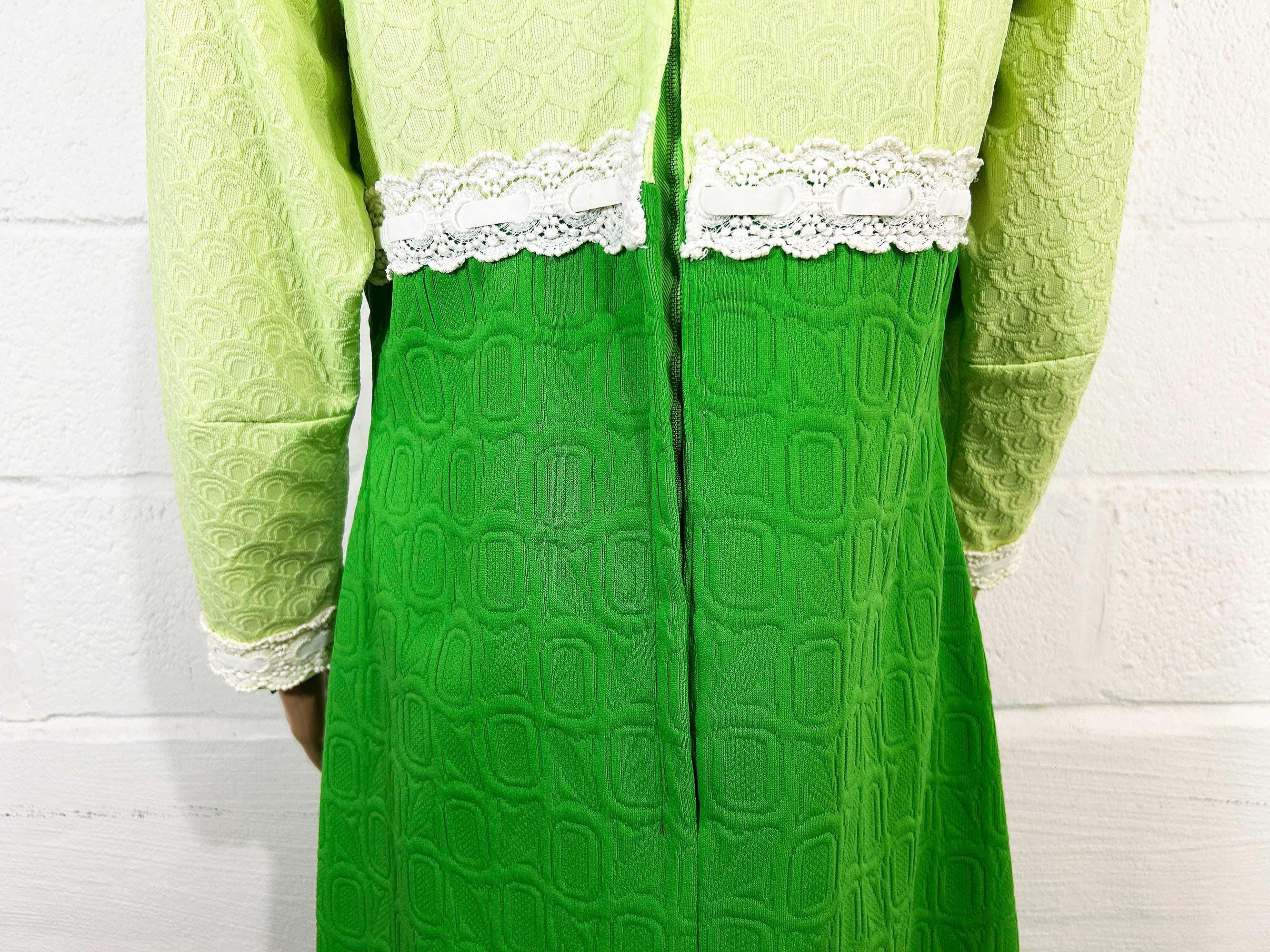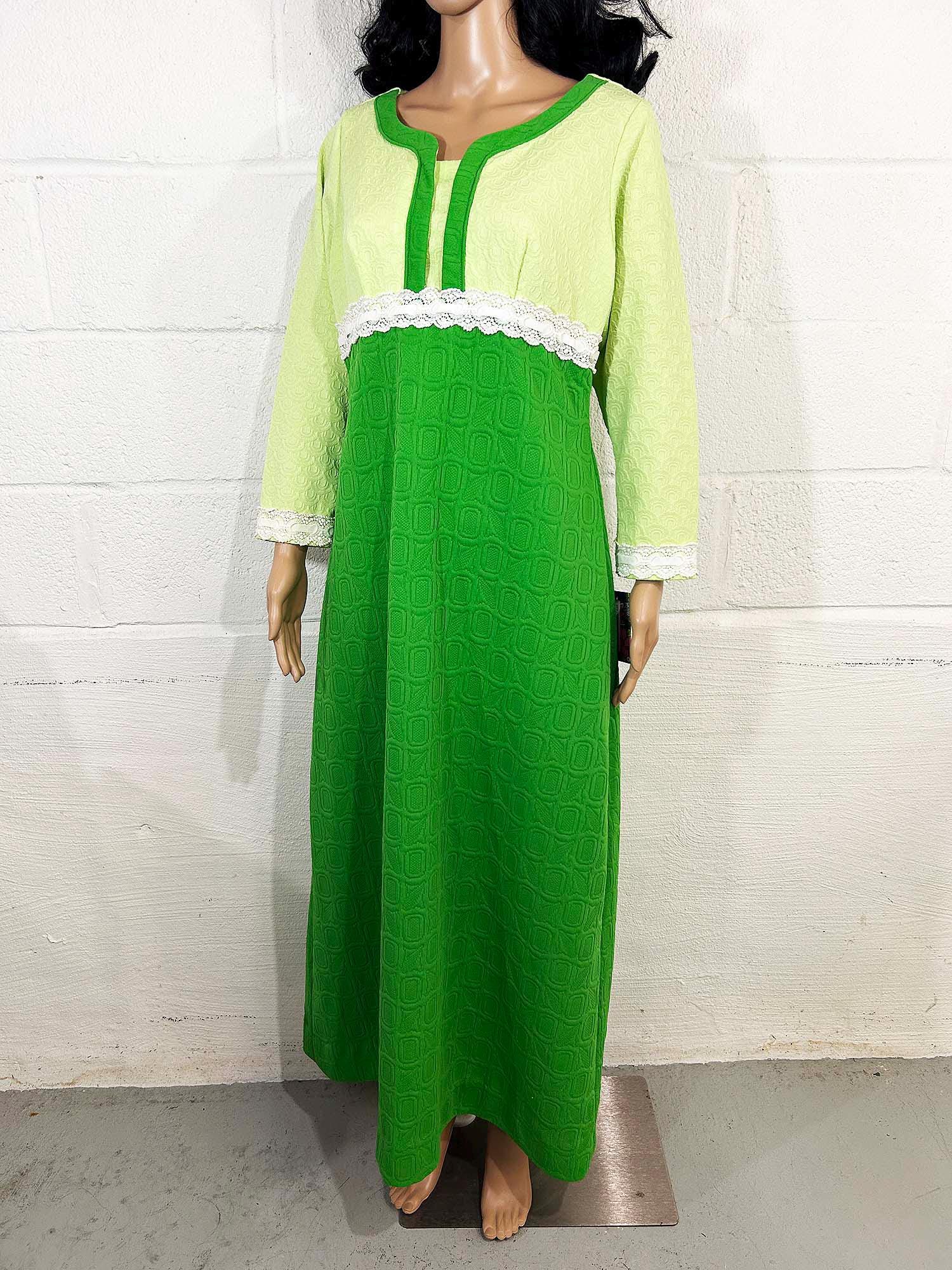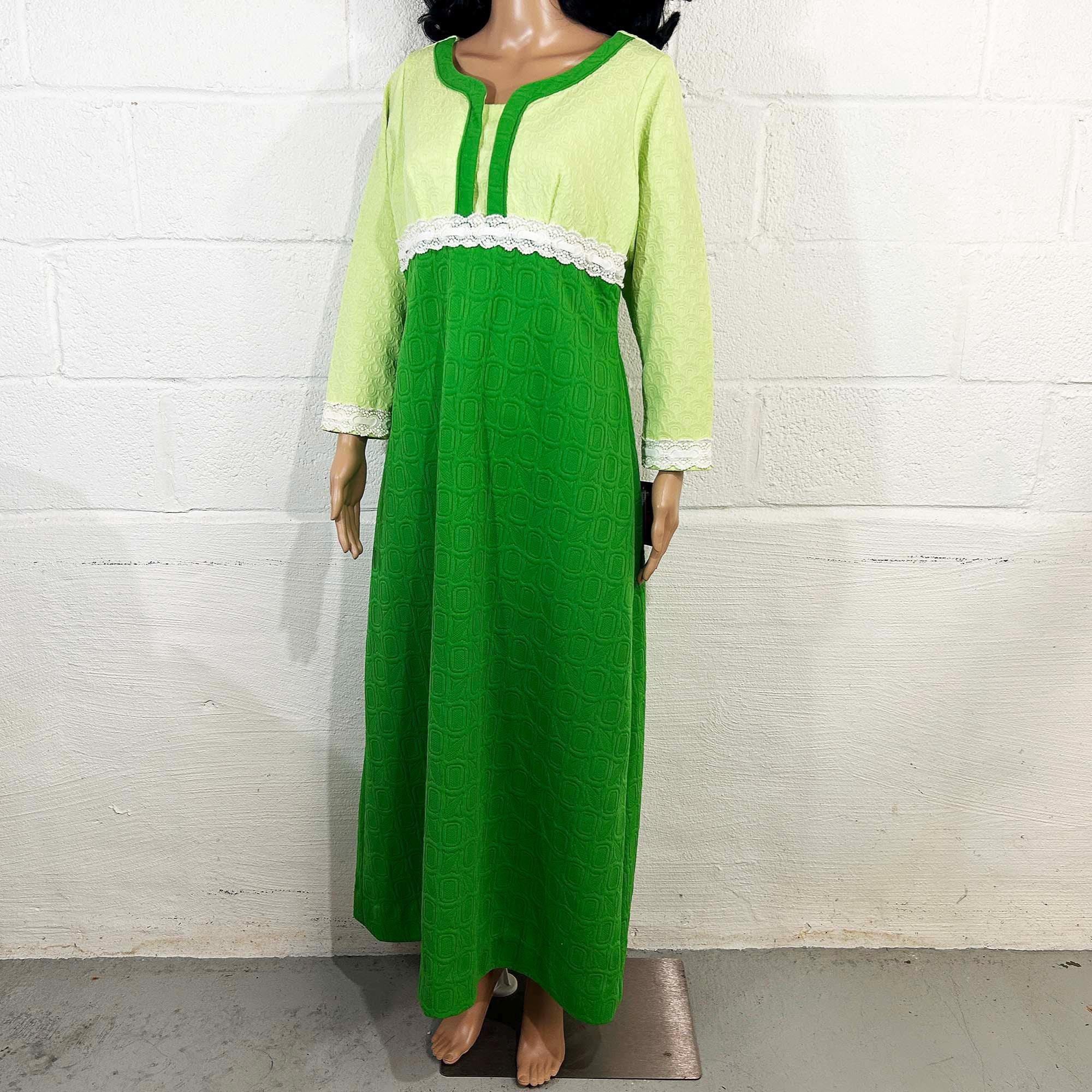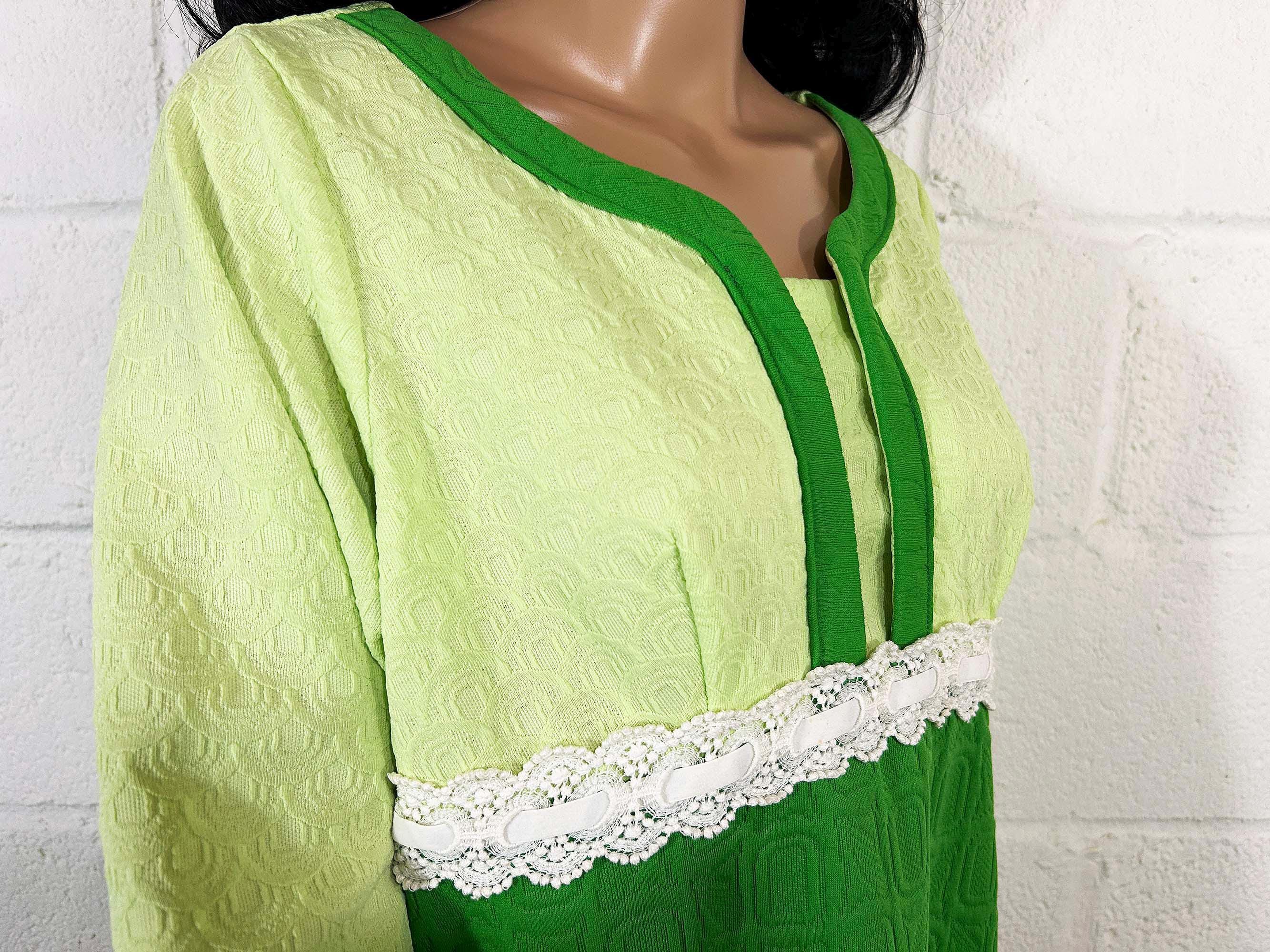 Super cute kelly and lime green mod maxi dress. Long sleeves, empire waist, and a zipper in the black. Lace trim at the waist and wrists. In good vintage condition with no significant wear. Please be sure to inspect all photos.