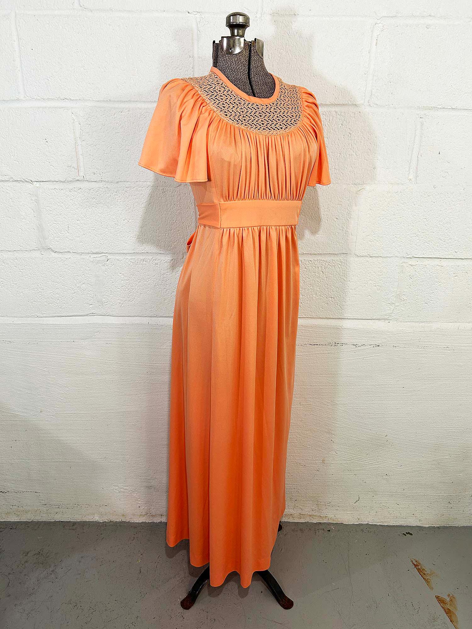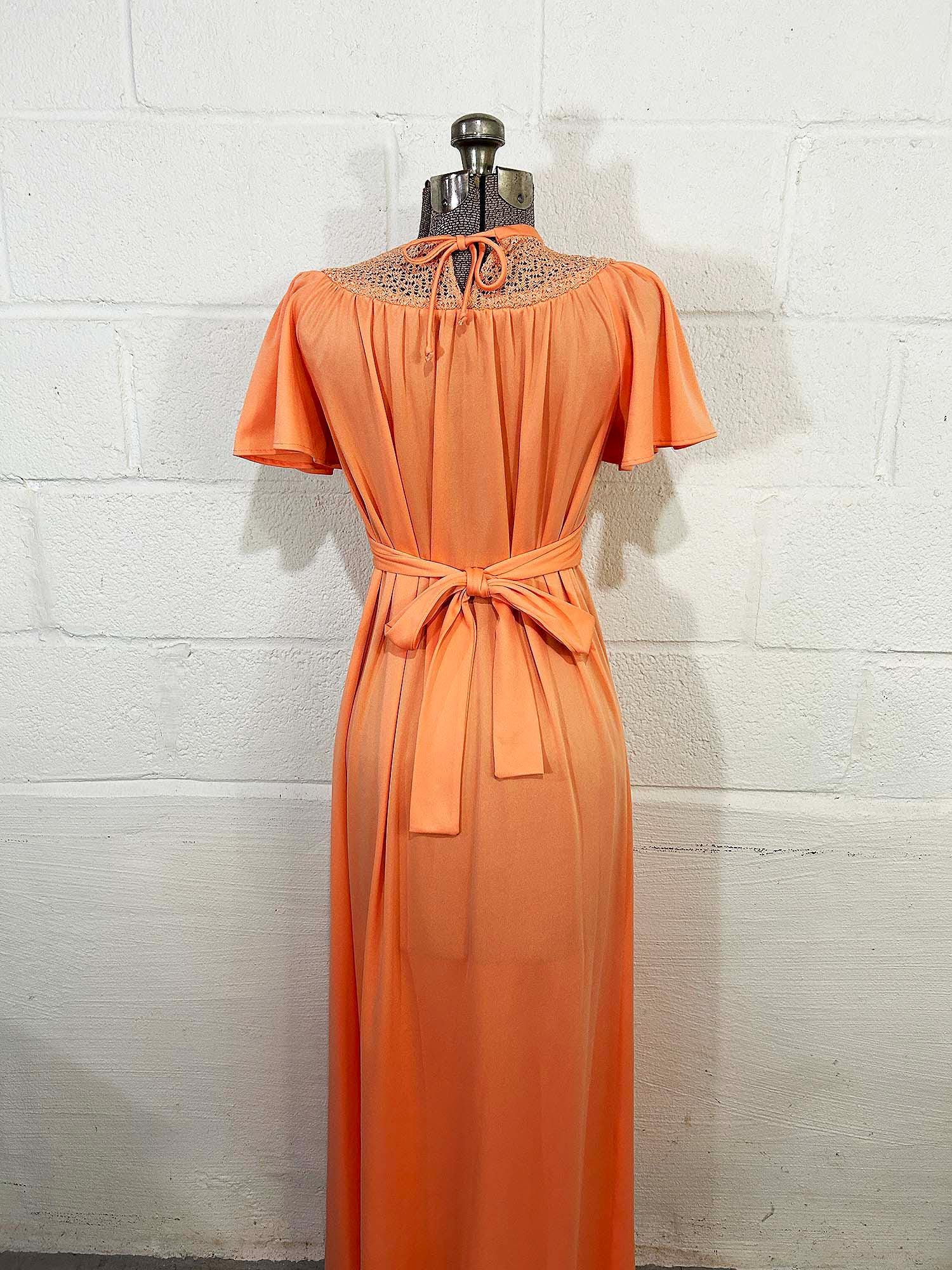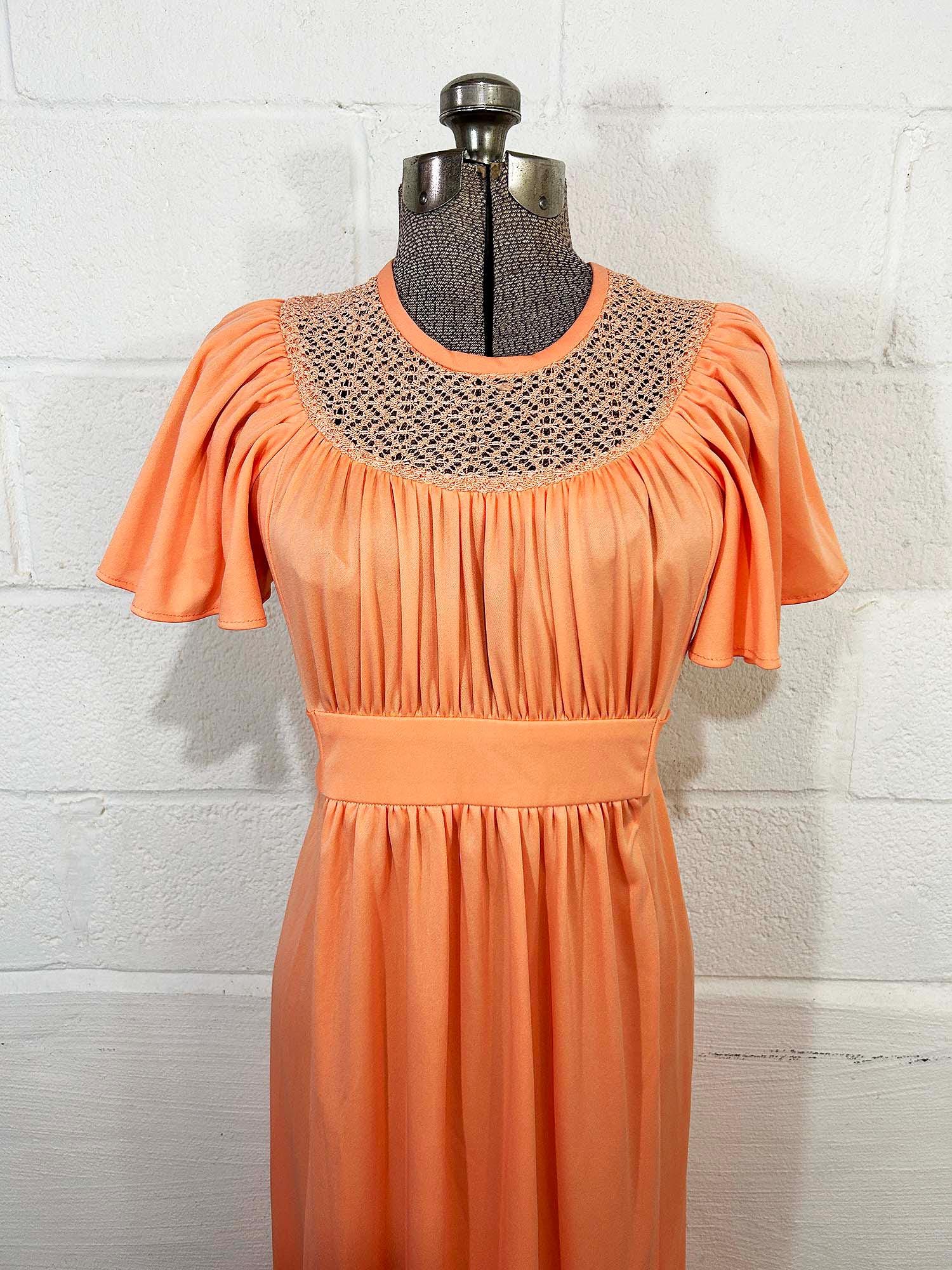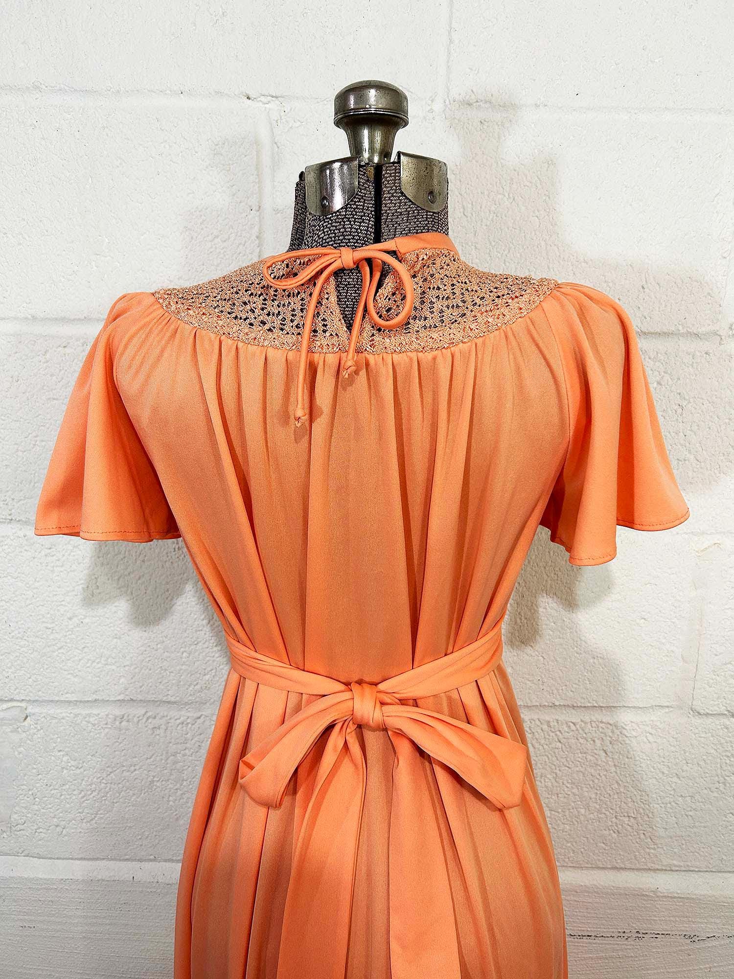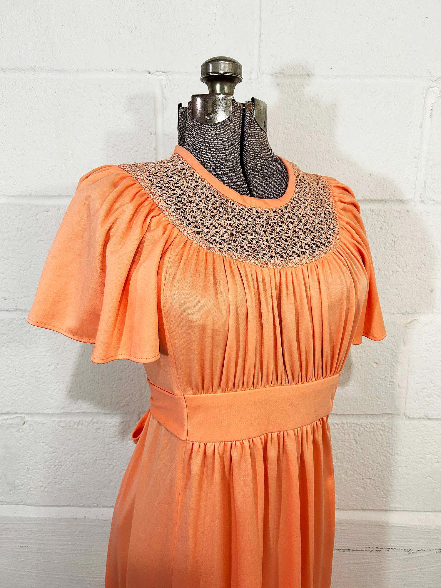 Incredible peach flutter sleeve maxi dress. High empire waist, attached tie belt, and long skirt. Pull over style with a tie at the back neckline. The fabric has slight stretch. It is in great condition with no significant wear.