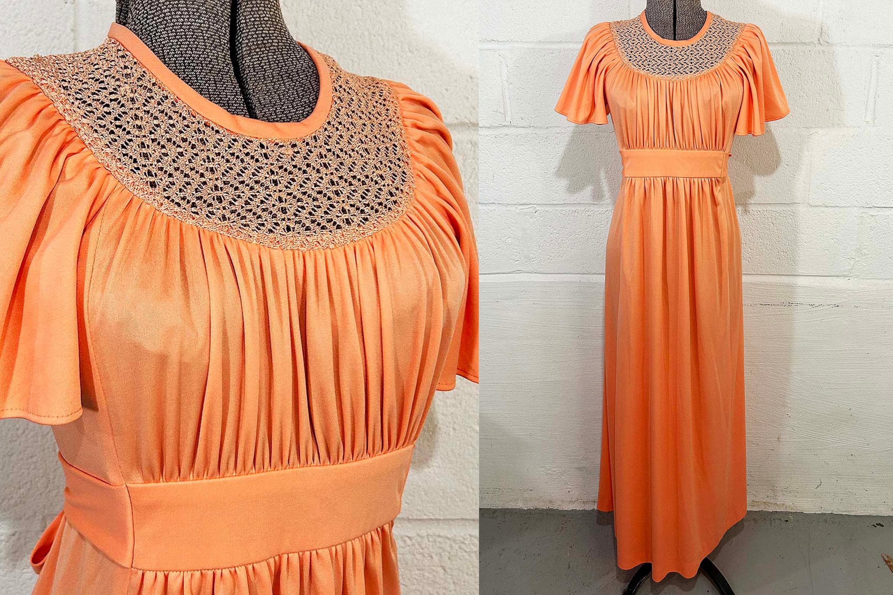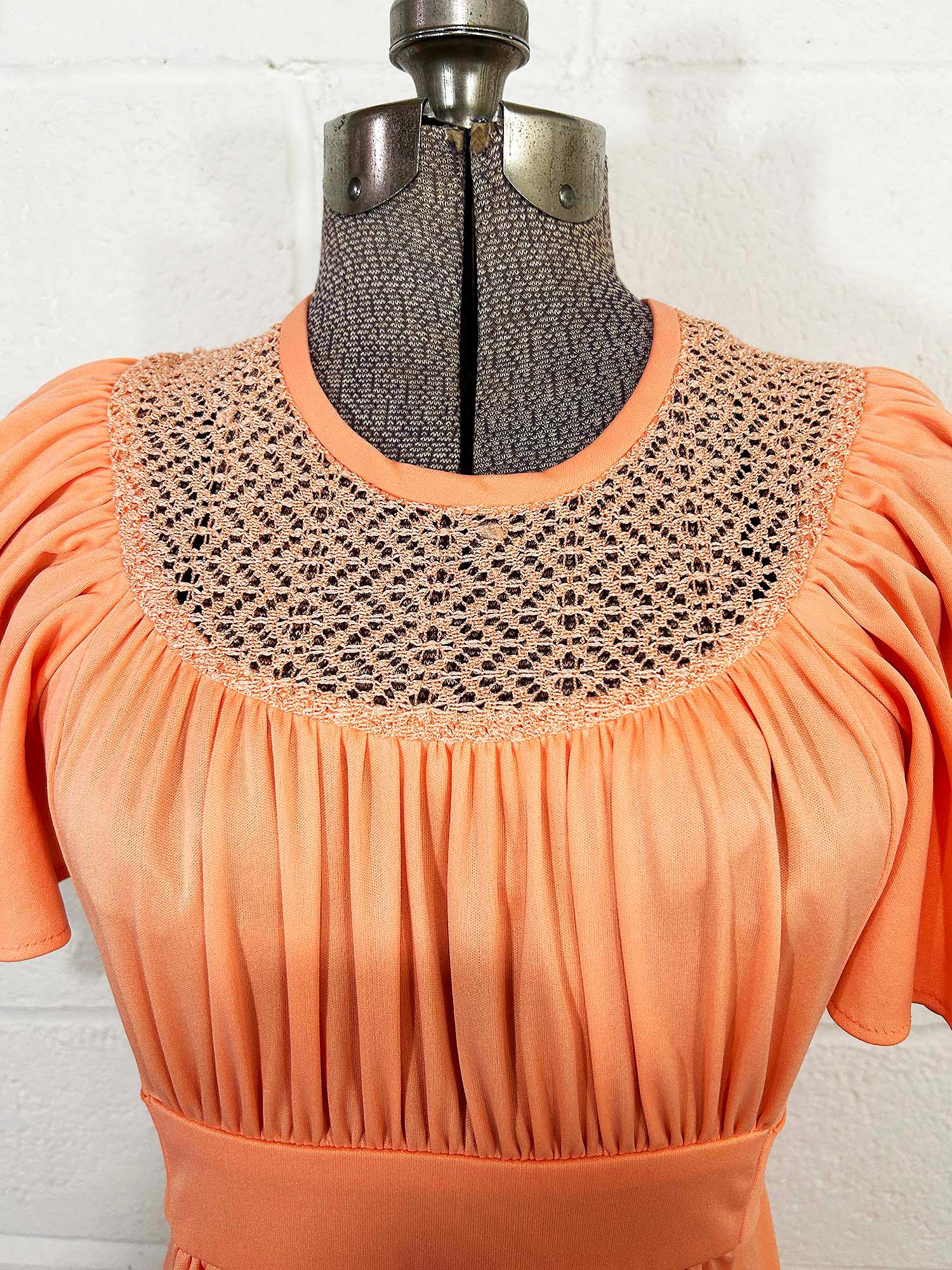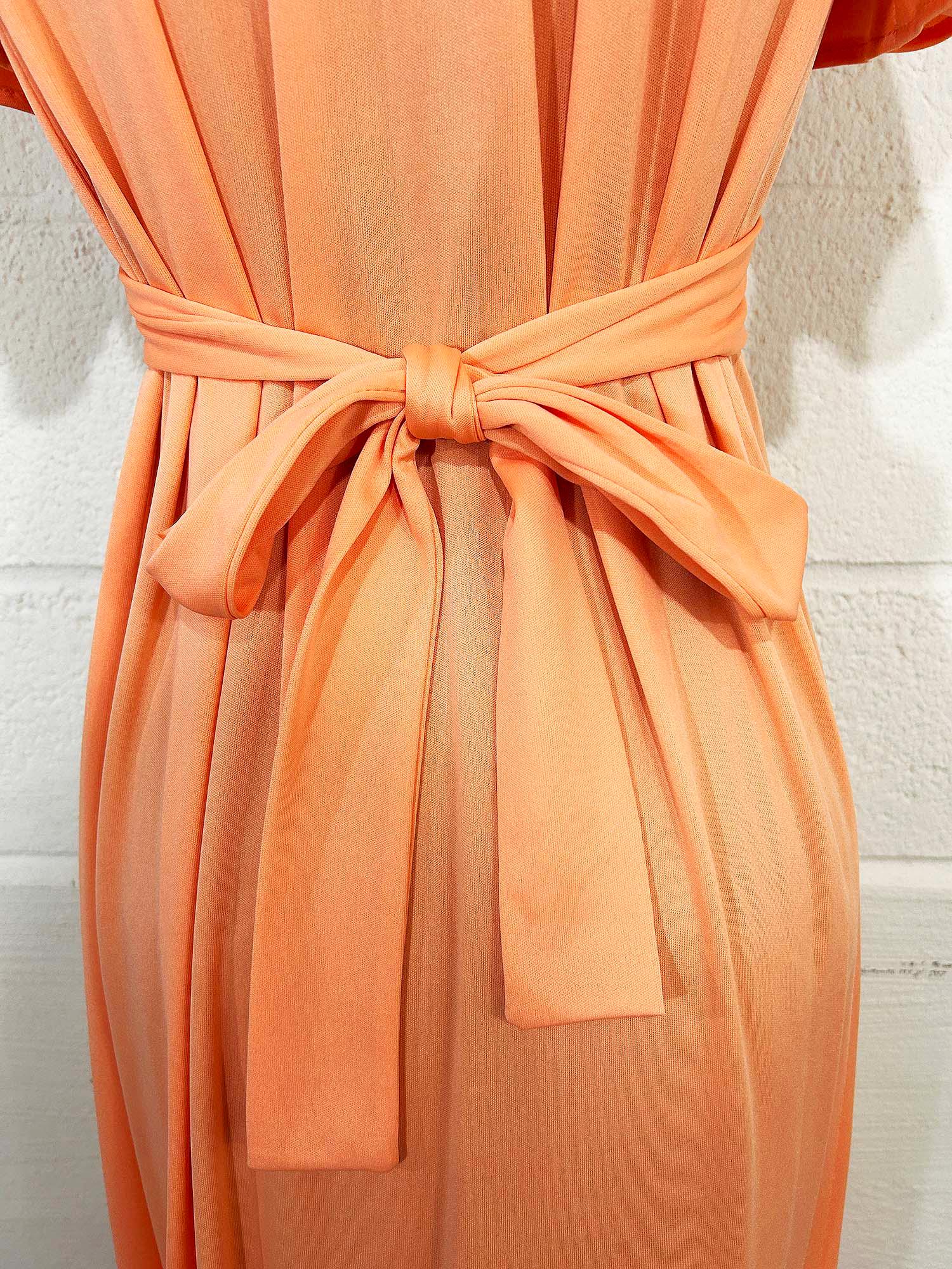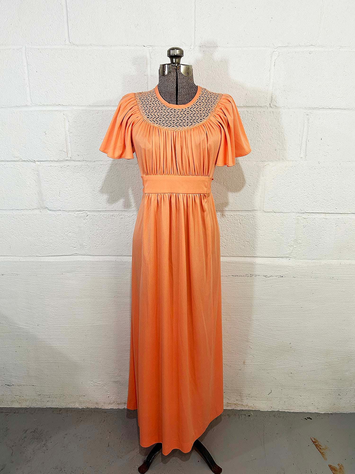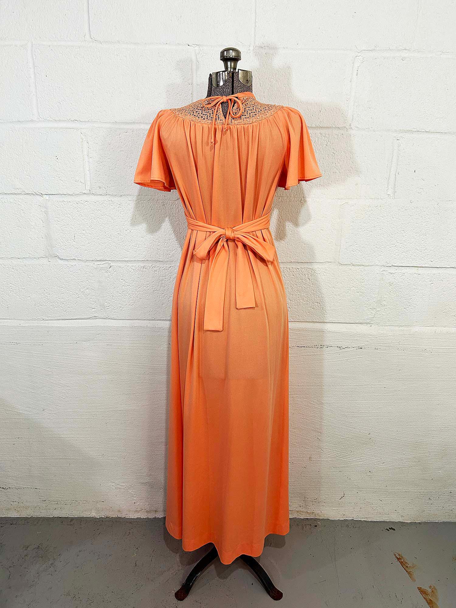 Incredible peach flutter sleeve maxi dress. High empire waist, attached tie belt, and long skirt. Pull over style with a tie at the back neckline. The fabric has slight stretch. It is in great condition with no significant wear.