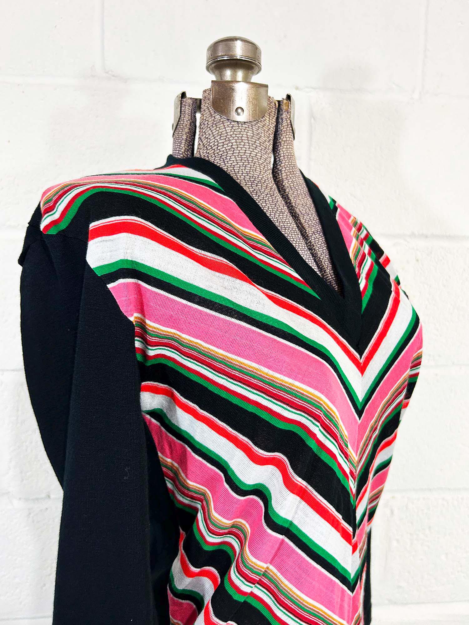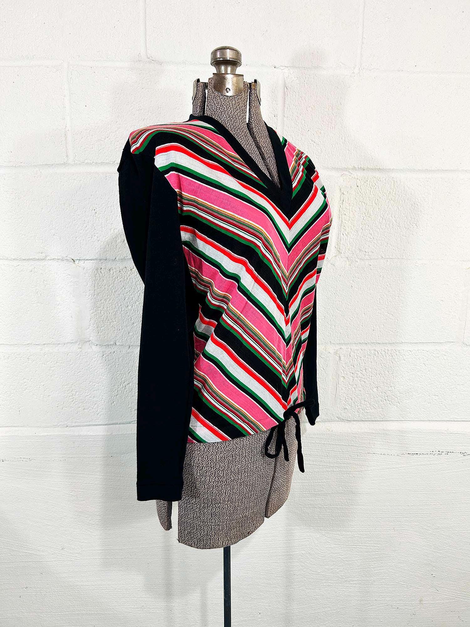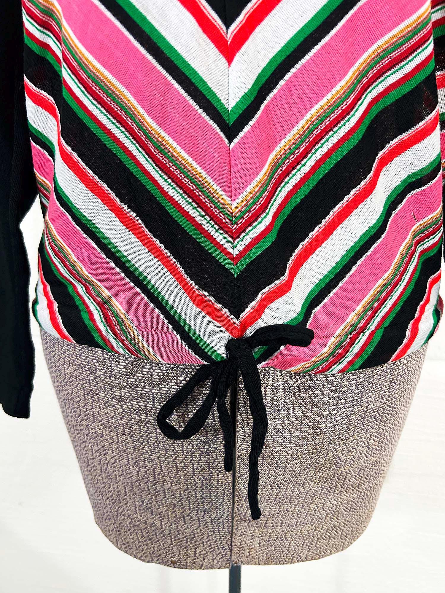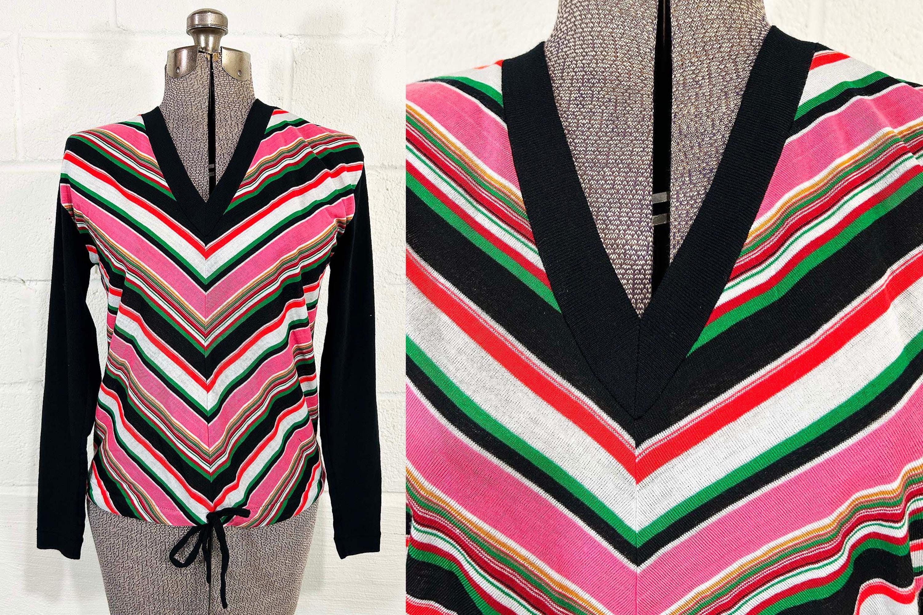 Soft lightweight chevron rainbow striped long sleeve sweater. It is in excellent condition with no significant wear. Pull over style with a deep v neck and a tie at the waistline. Fabric has some stretch.
