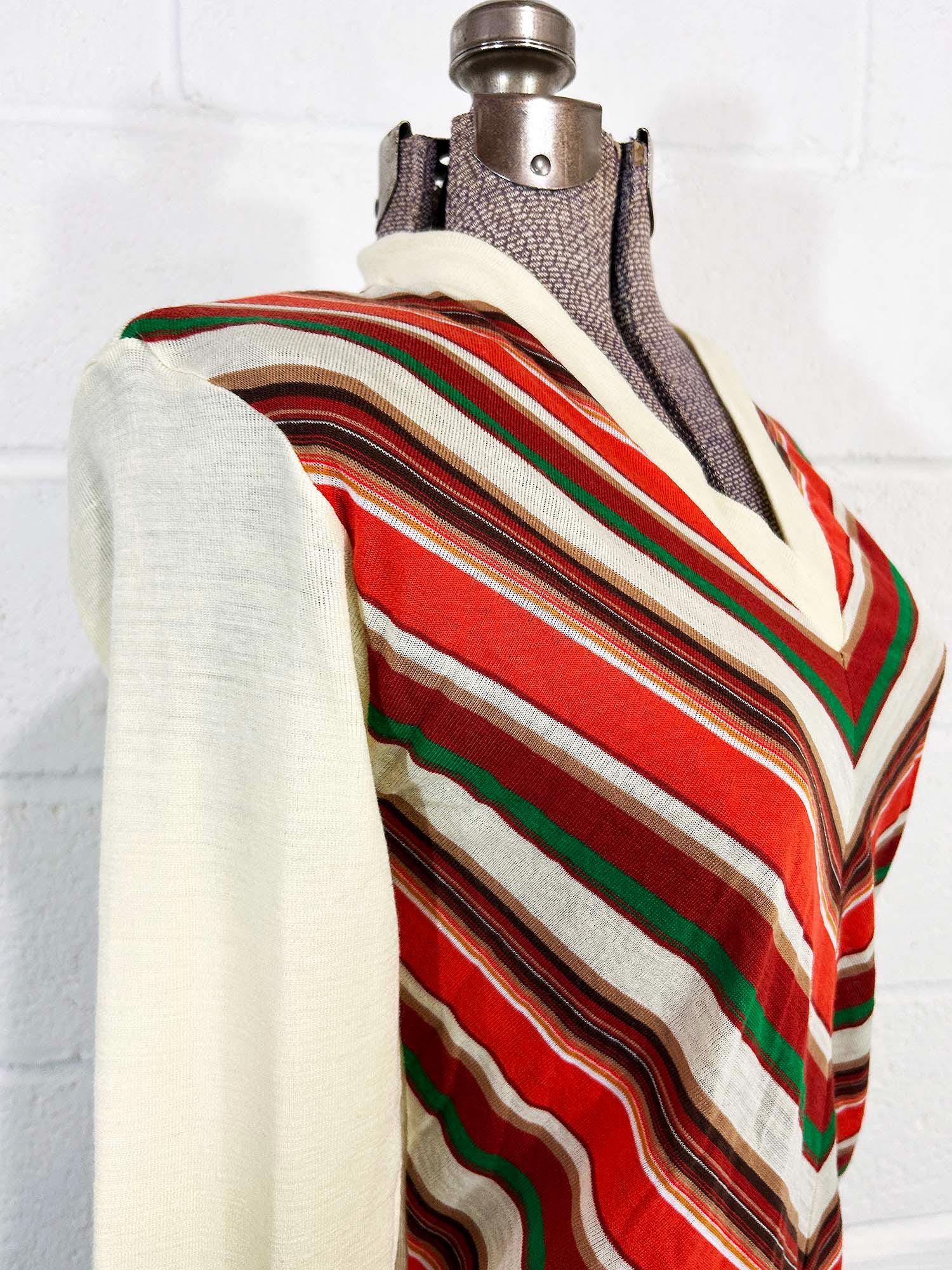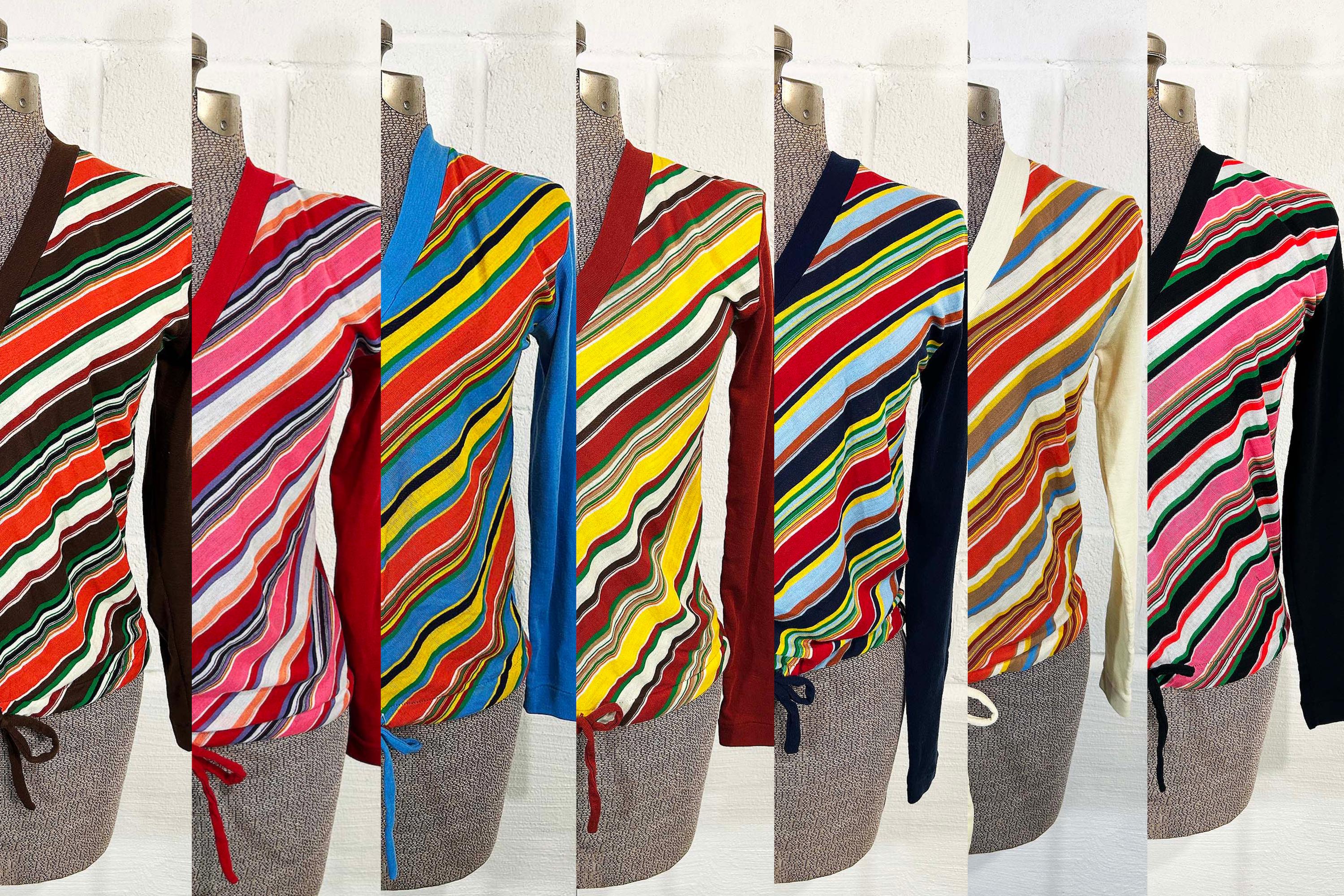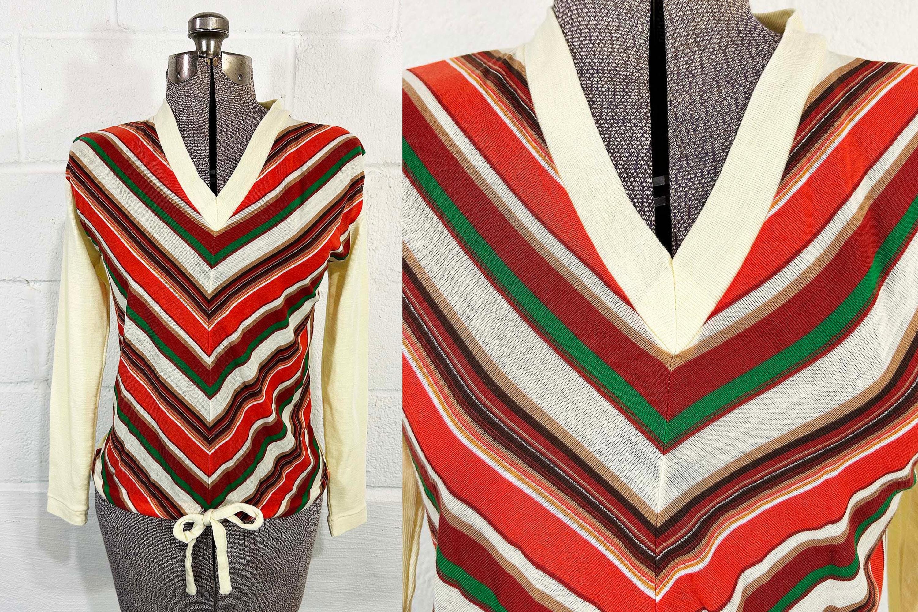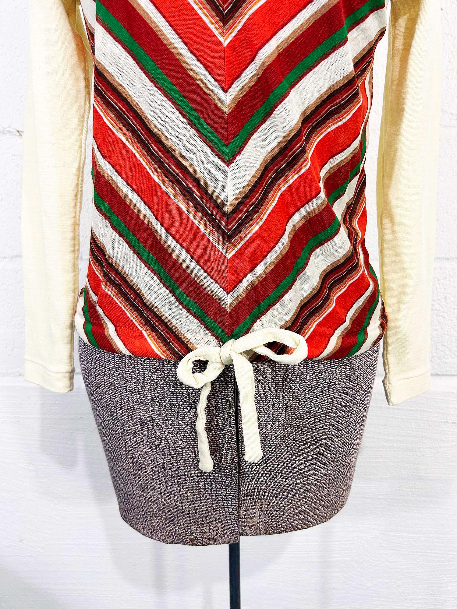 Soft lightweight chevron rainbow striped long sleeve sweater. It is in excellent condition with no significant wear. Pull over style with a deep v neck and a tie at the waistline. Fabric has some stretch.