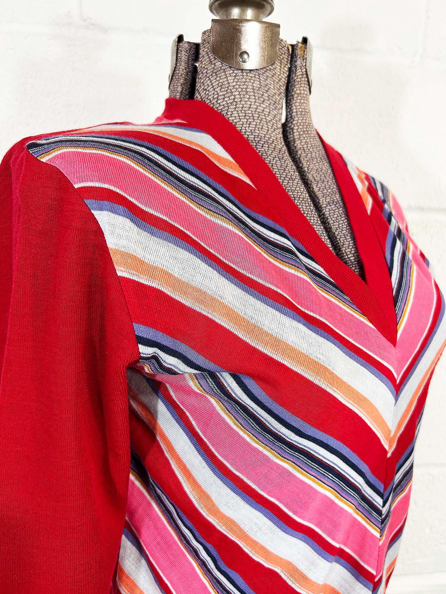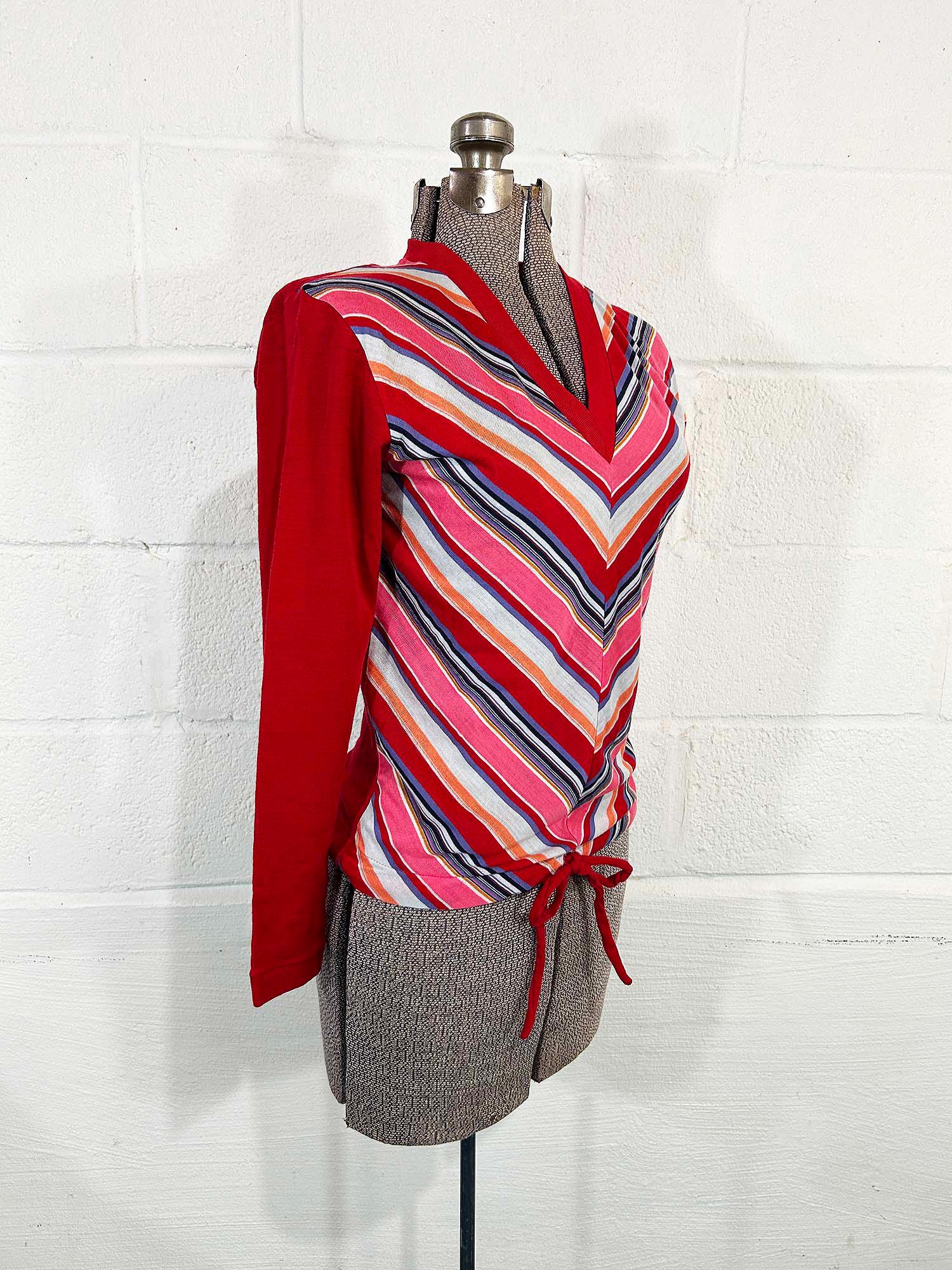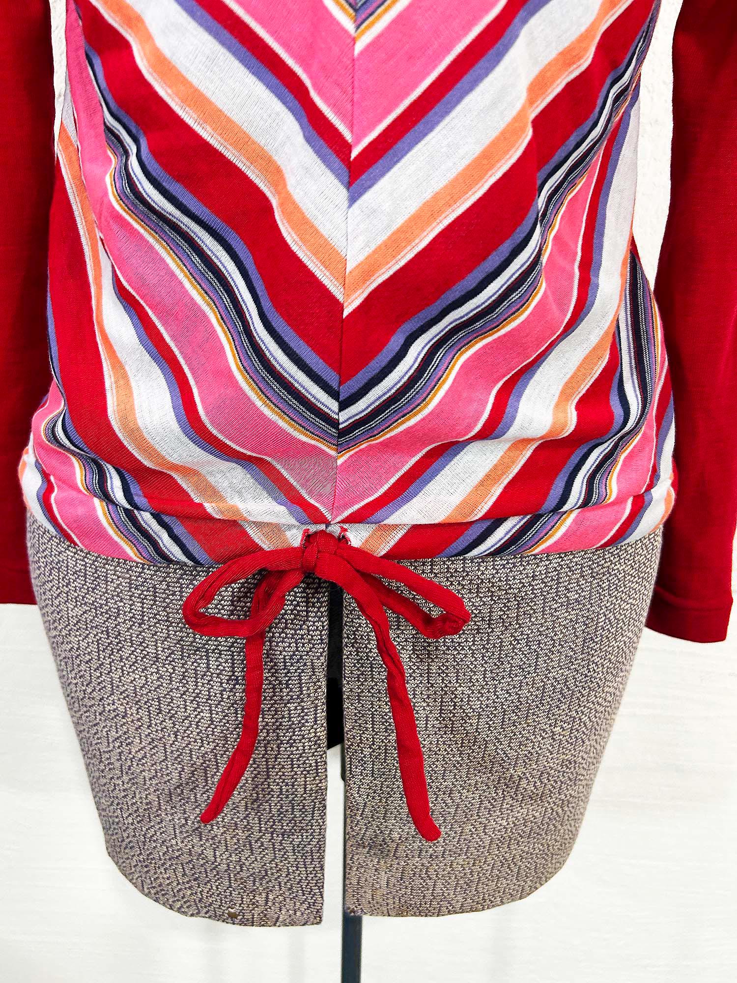 Soft lightweight chevron rainbow striped long sleeve sweater. It is in excellent condition with no significant wear. Pull over style with a deep v neck and a tie at the waistline. Fabric has some stretch.