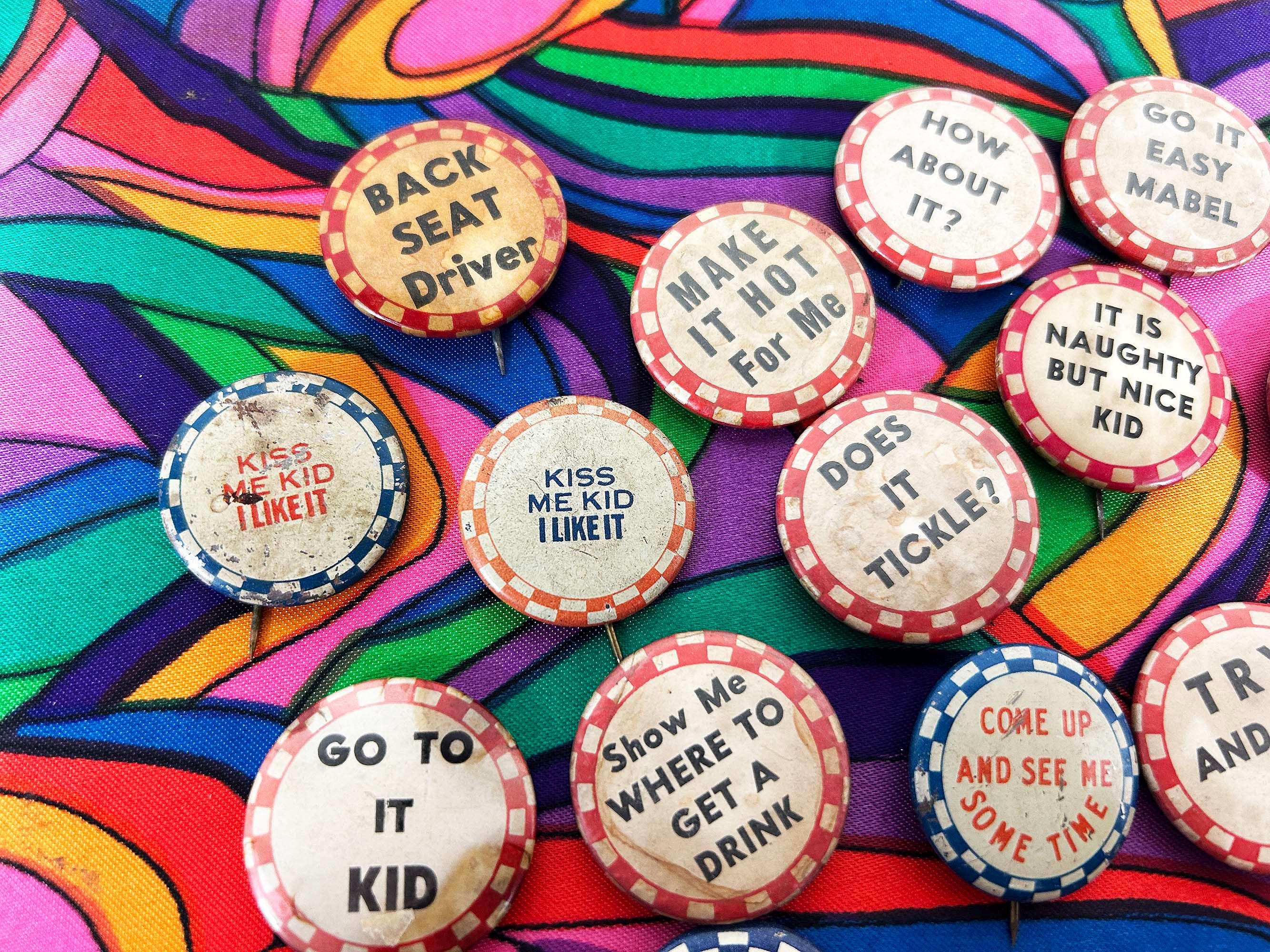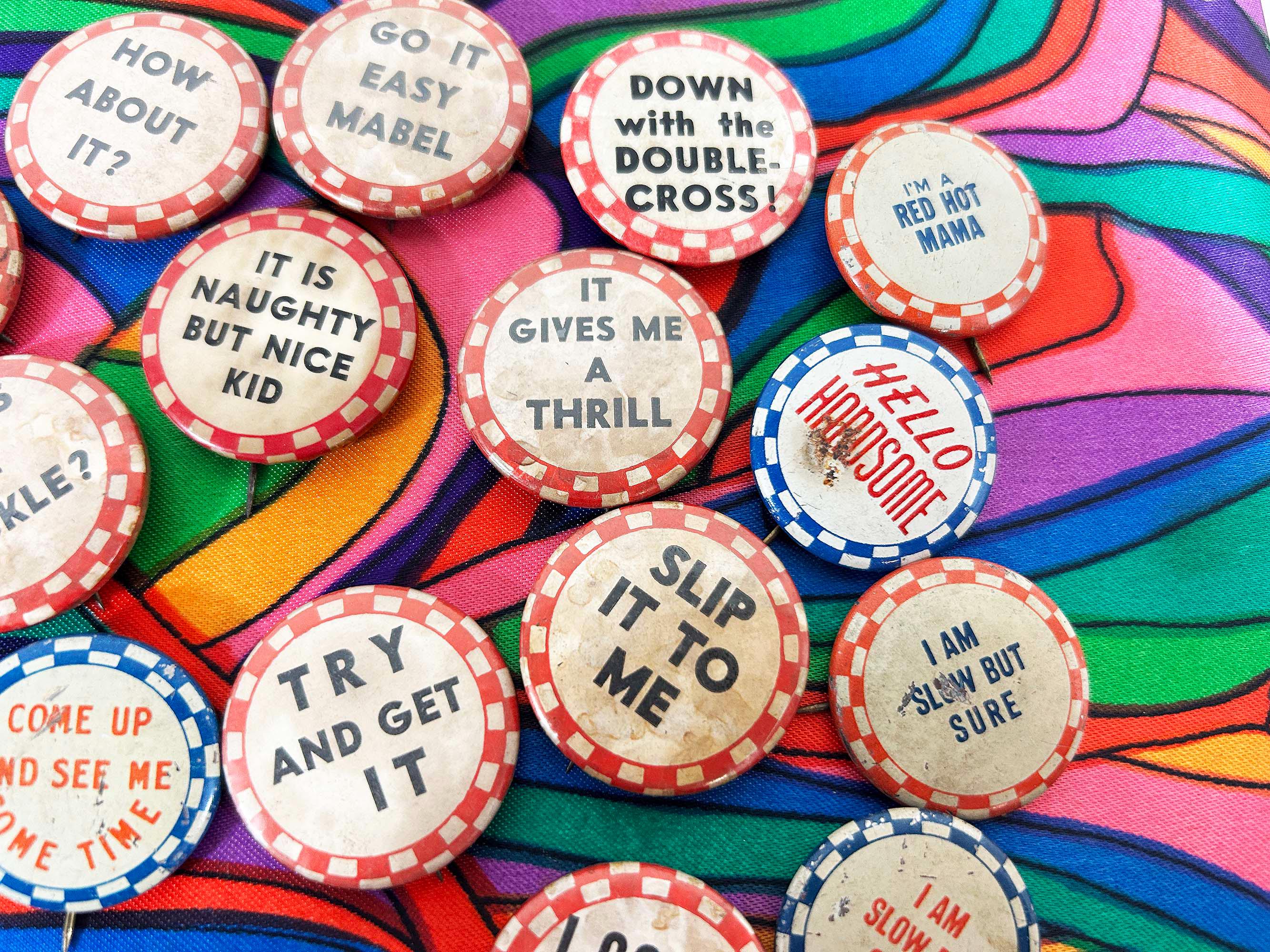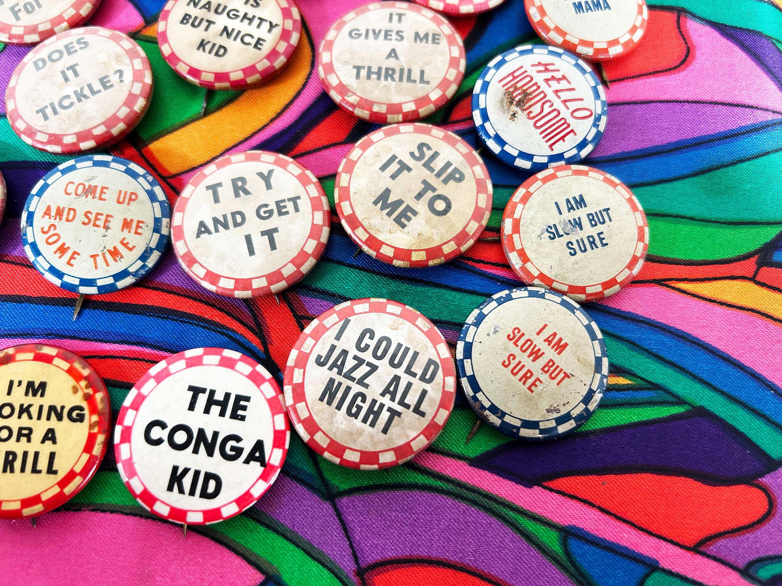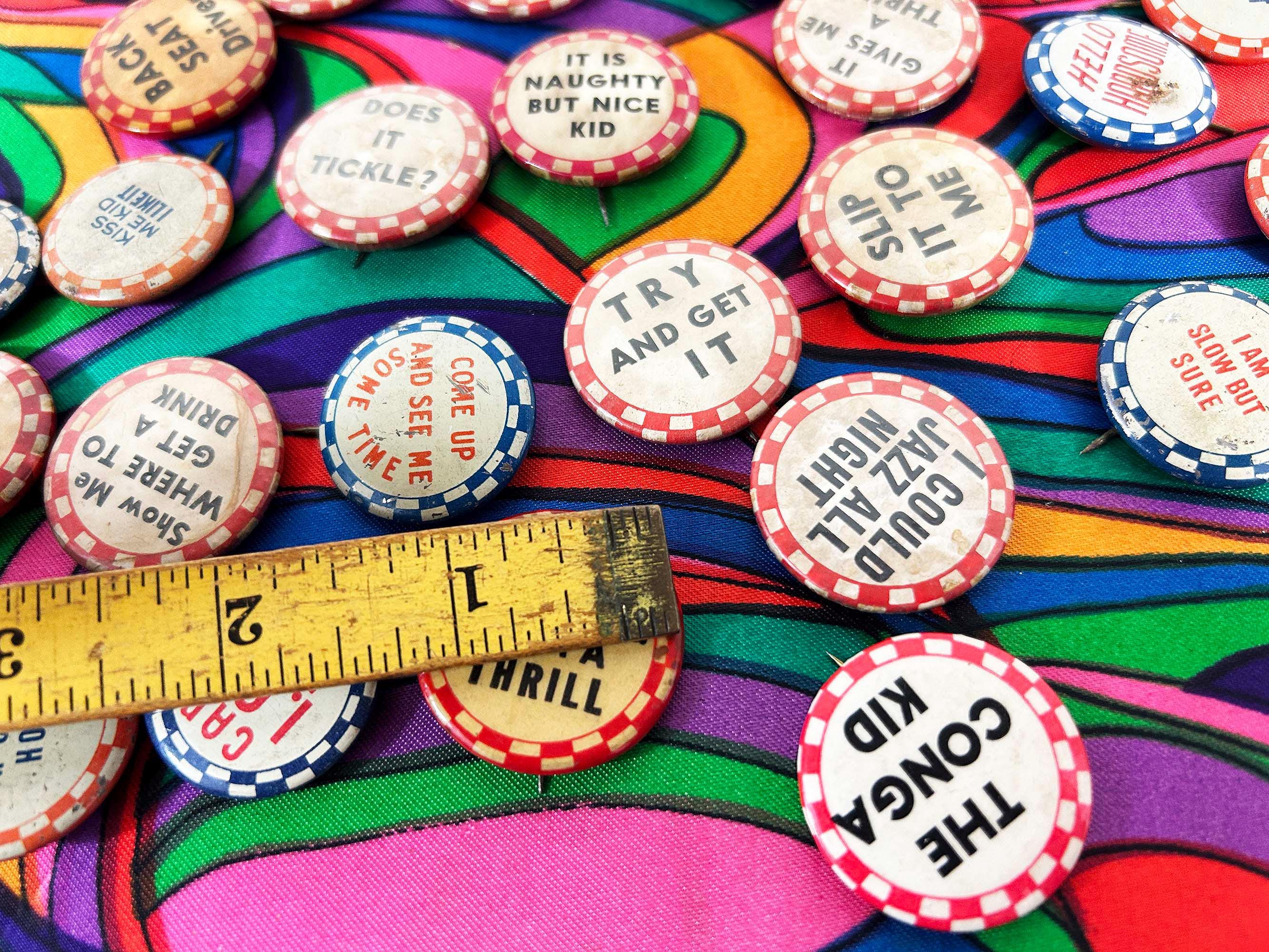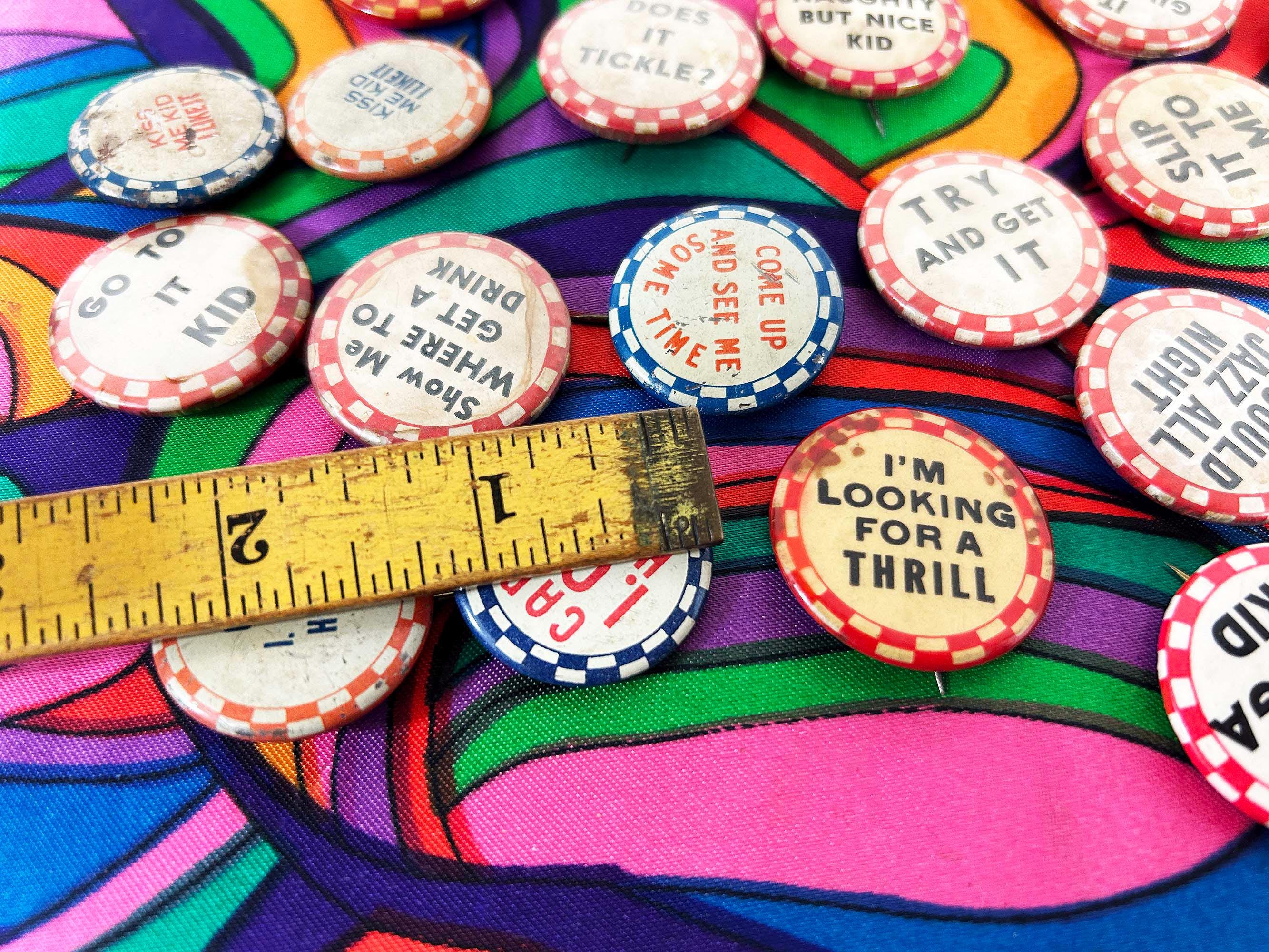 Super cool 1940s era pinback buttons with funny sayings. They are all showing signs of age and wear including rust and staining - please be sure to inspect all photos. The buttons are a little over 1 inch in diameter. Each button is sold individually - choose the one you'd like from the drop down menu!