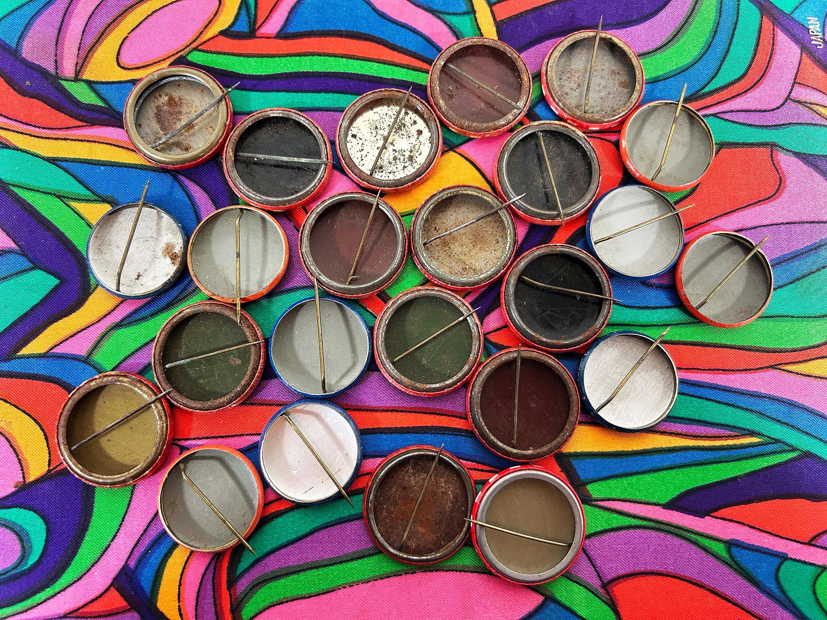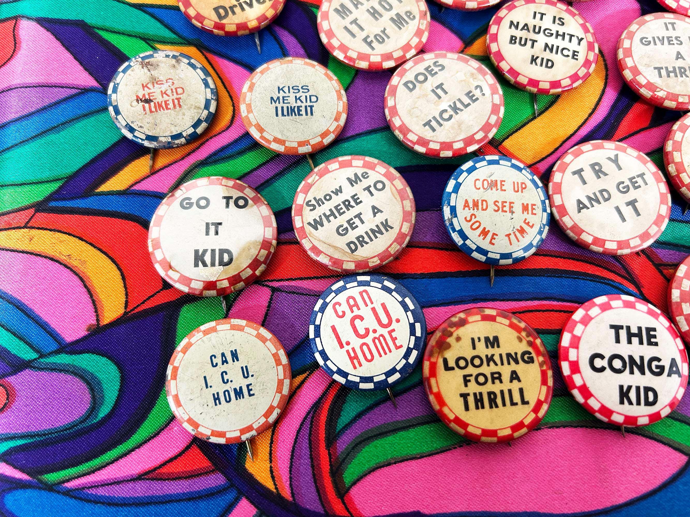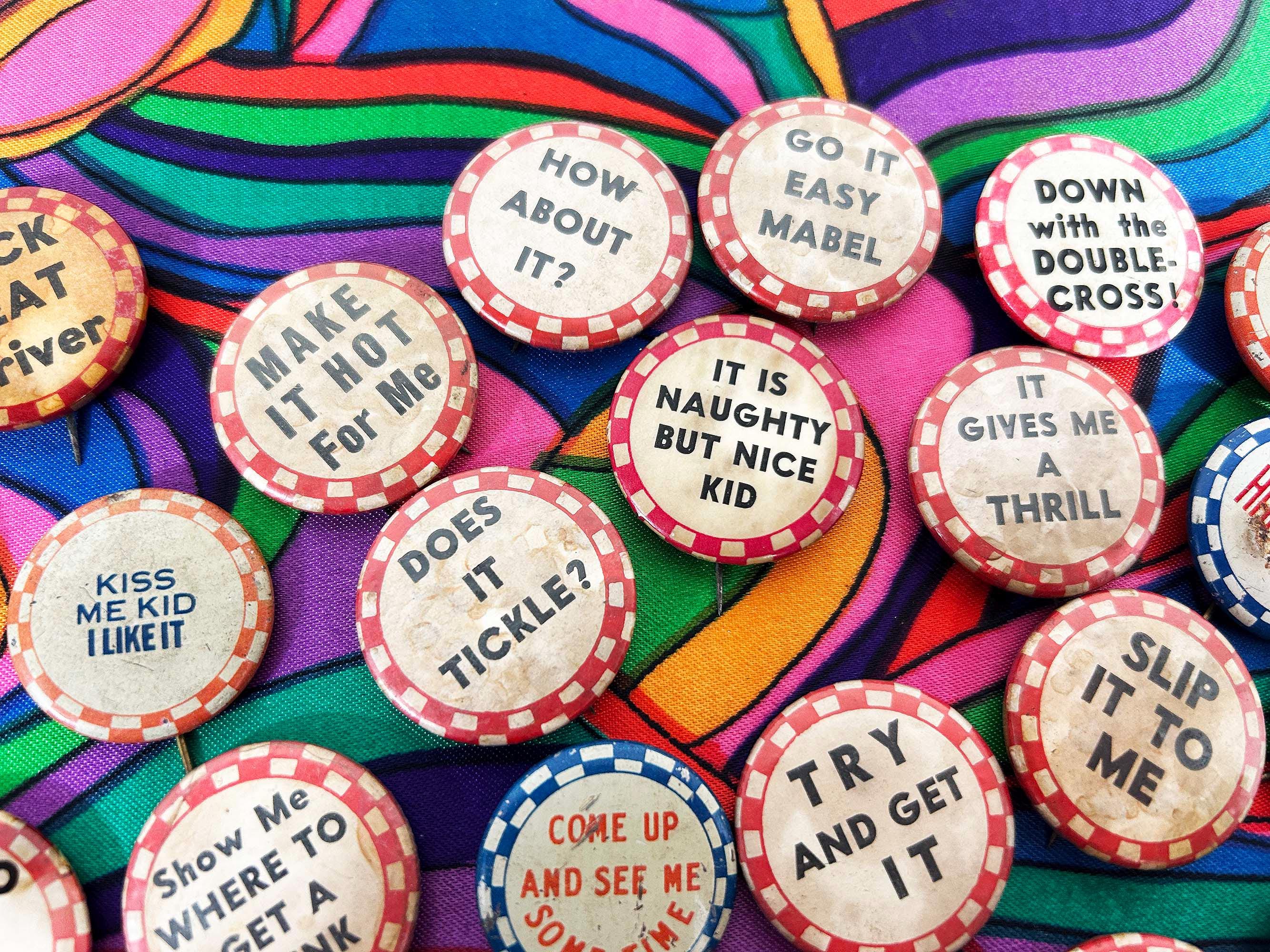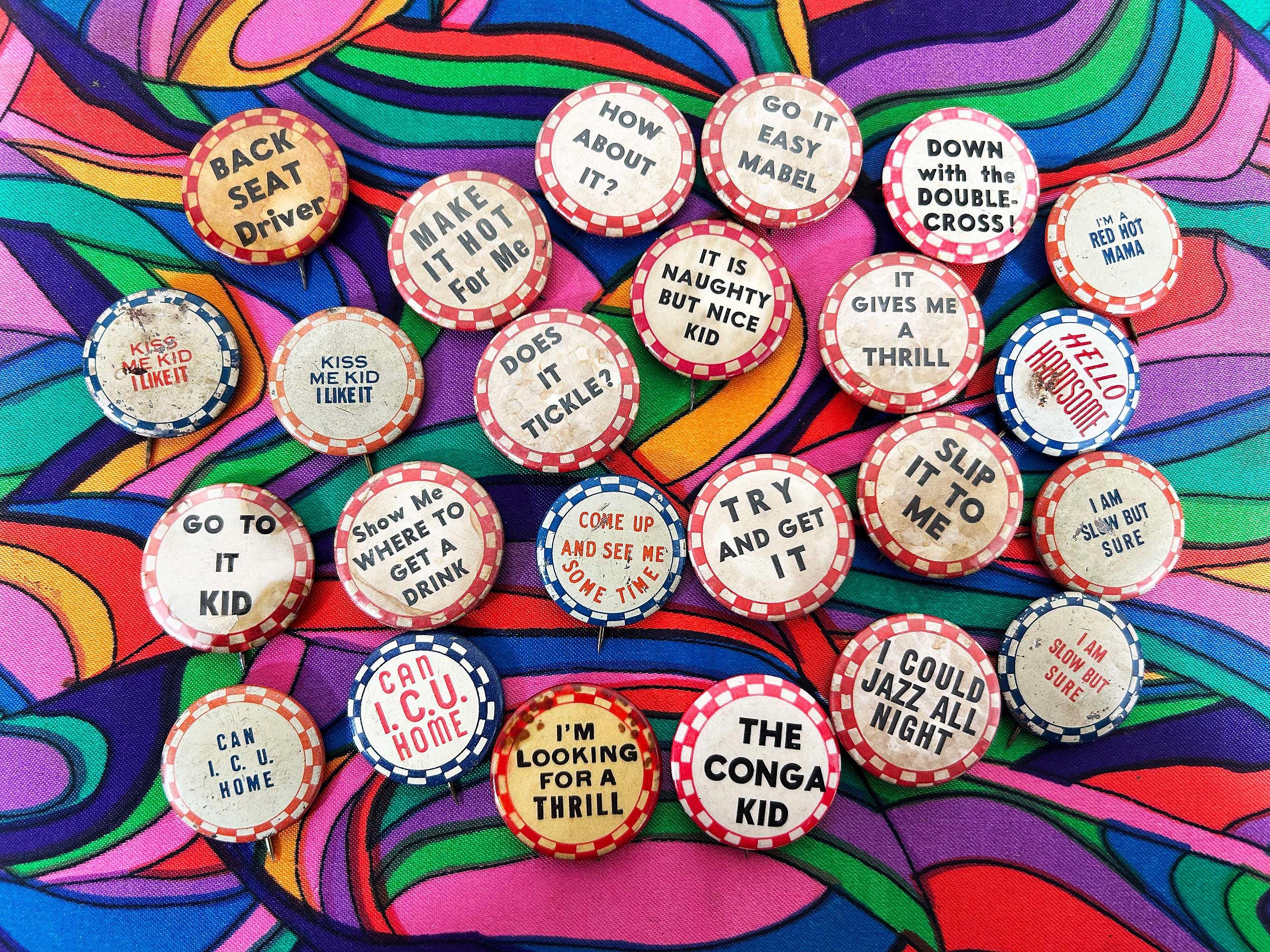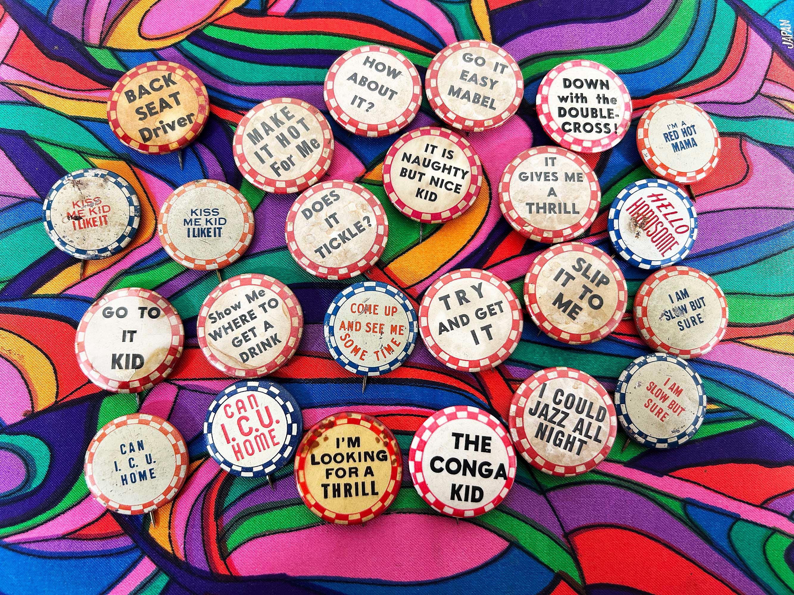 Super cool 1940s era pinback buttons with funny sayings. They are all showing signs of age and wear including rust and staining - please be sure to inspect all photos. The buttons are a little over 1 inch in diameter. Each button is sold individually - choose the one you'd like from the drop down menu!