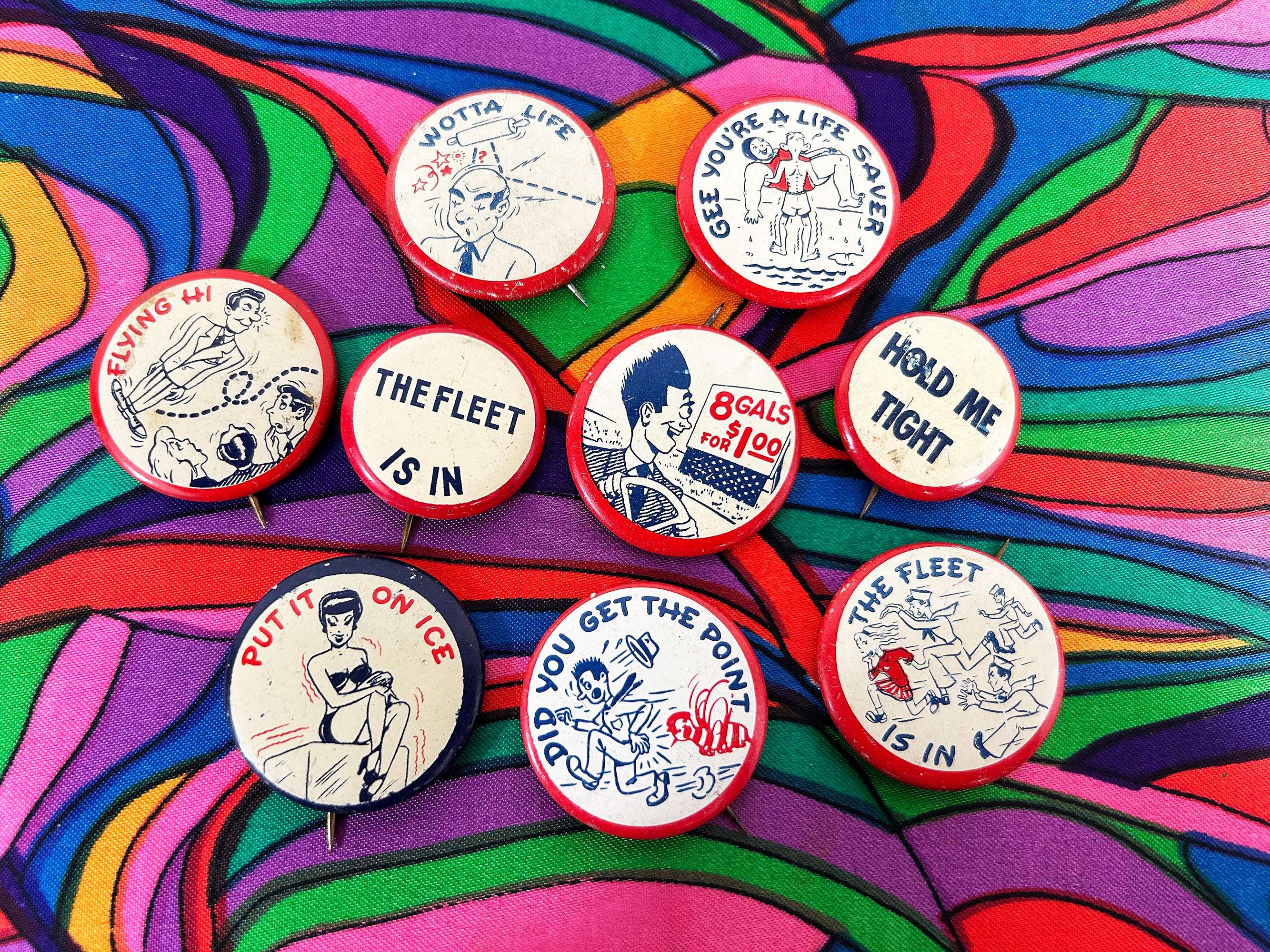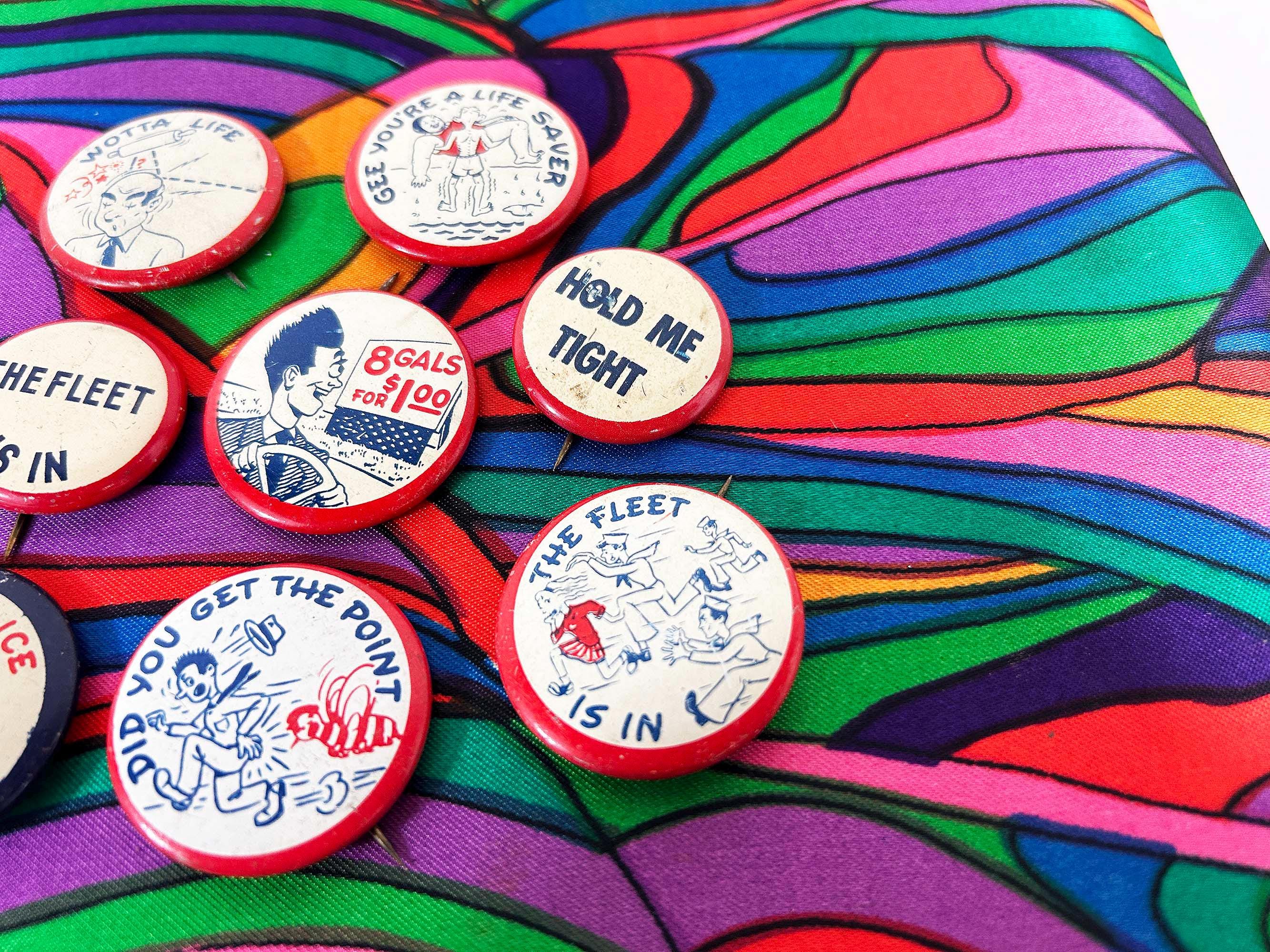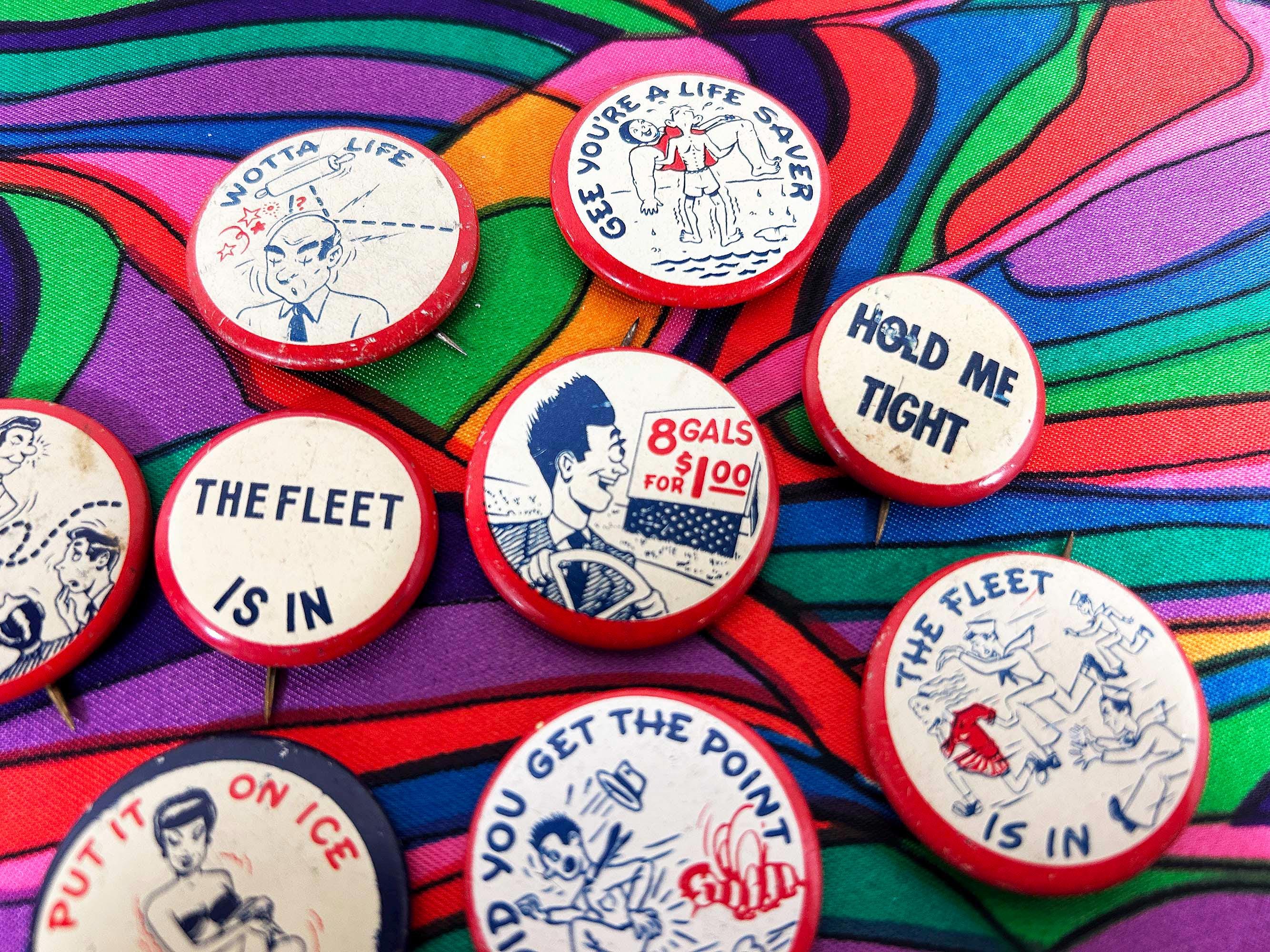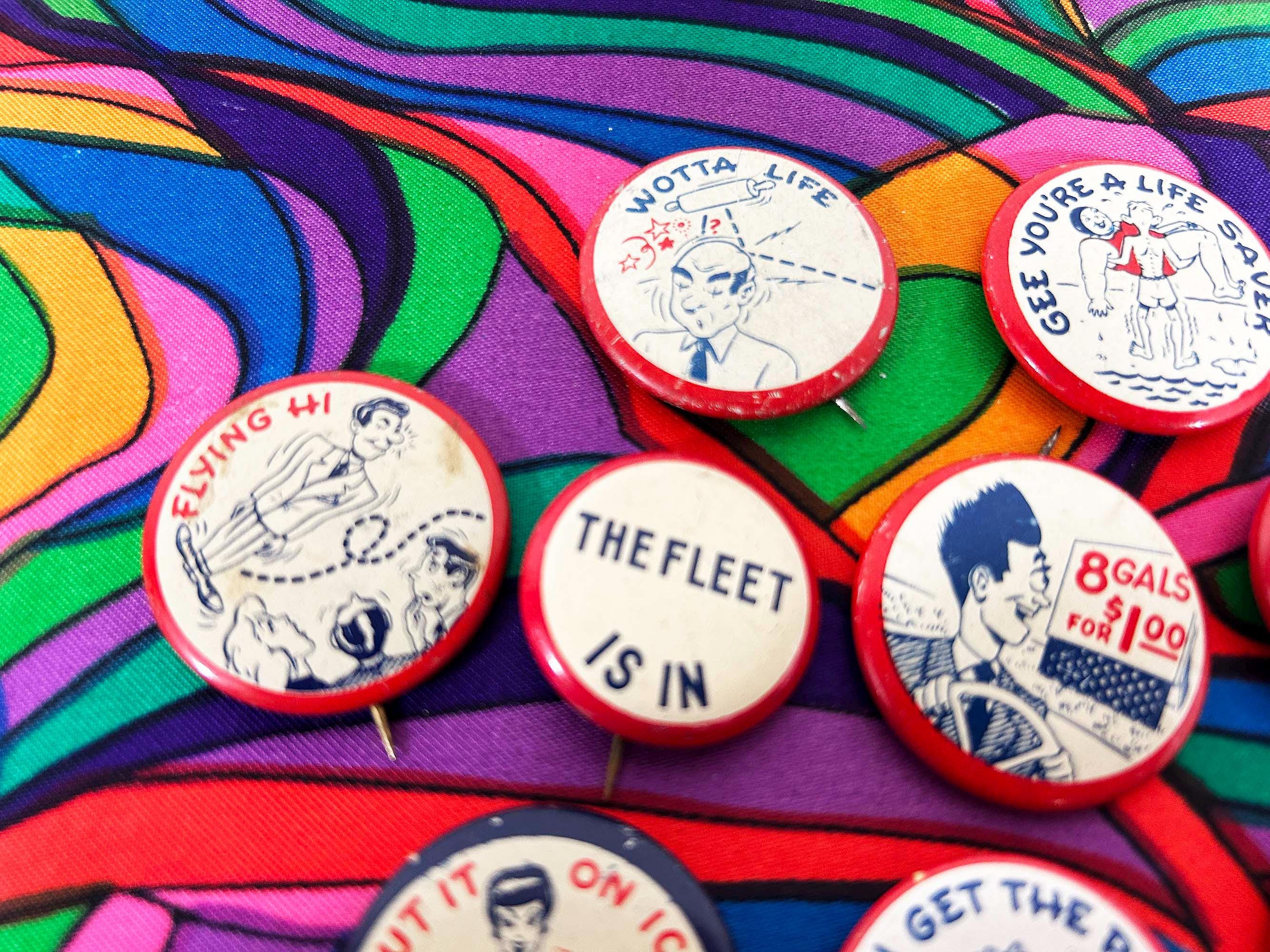 Super cool 1940s era pinback buttons with funny sayings. They are all showing signs of age and wear - please be sure to inspect all photos. The buttons are a little over 1 inch in diameter or about 1 1/4 inches in diameter. Each button is sold individually - choose the one you'd like from the drop down menu!