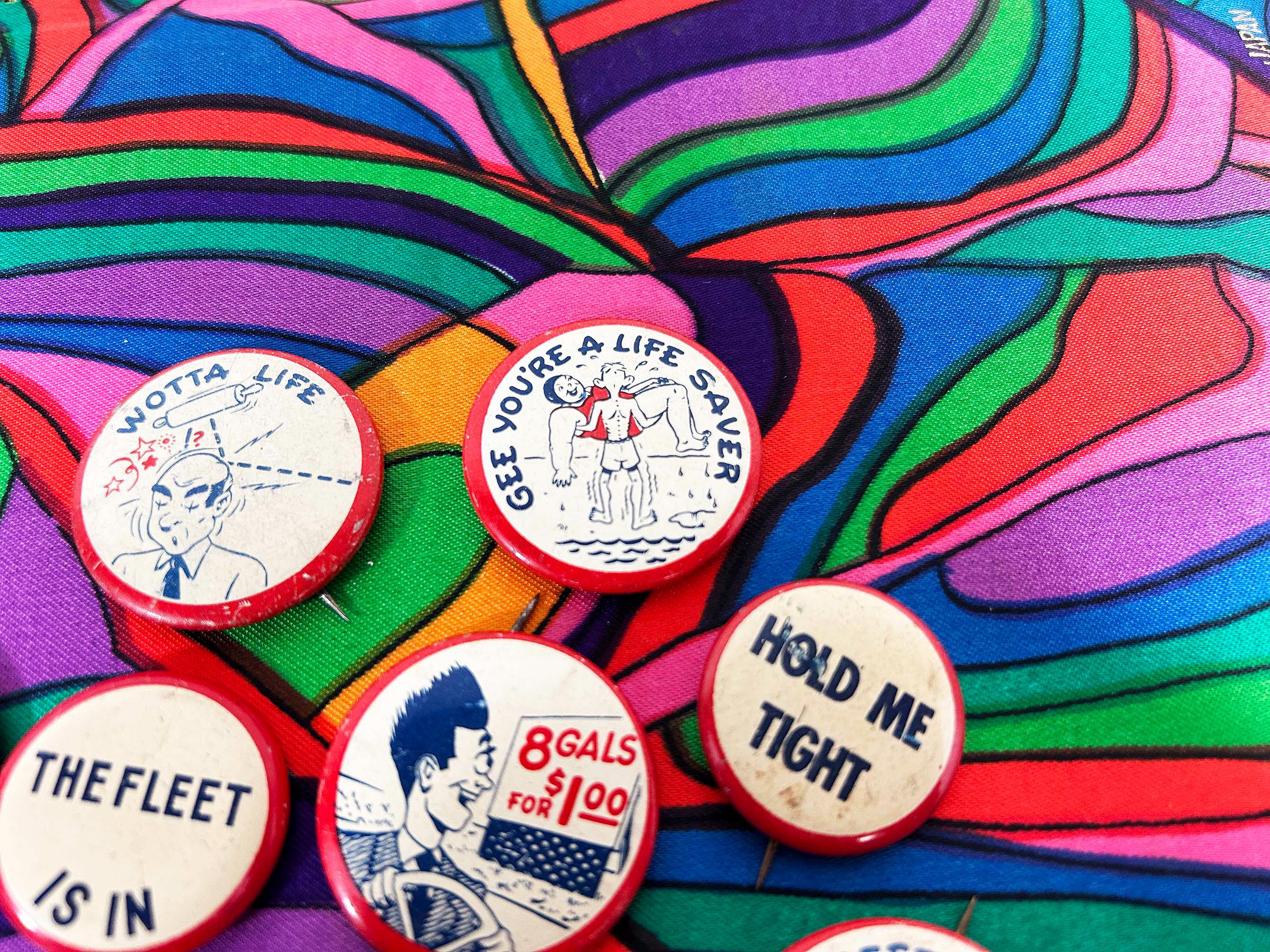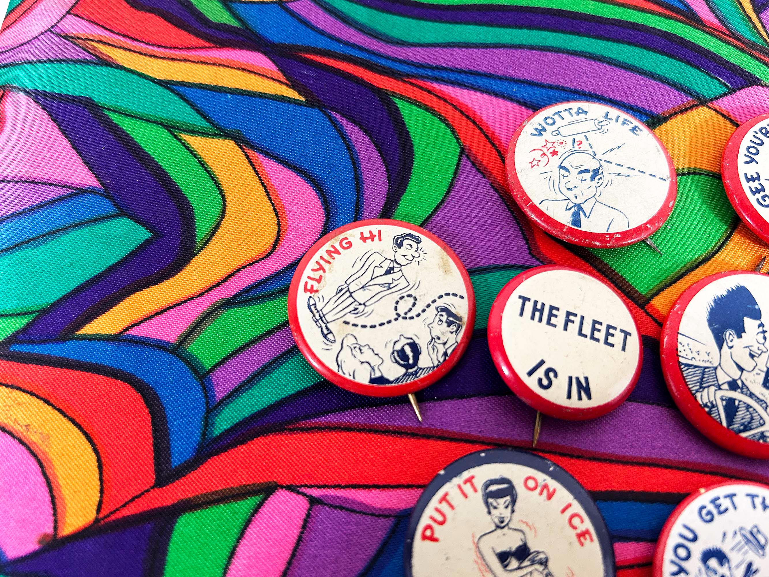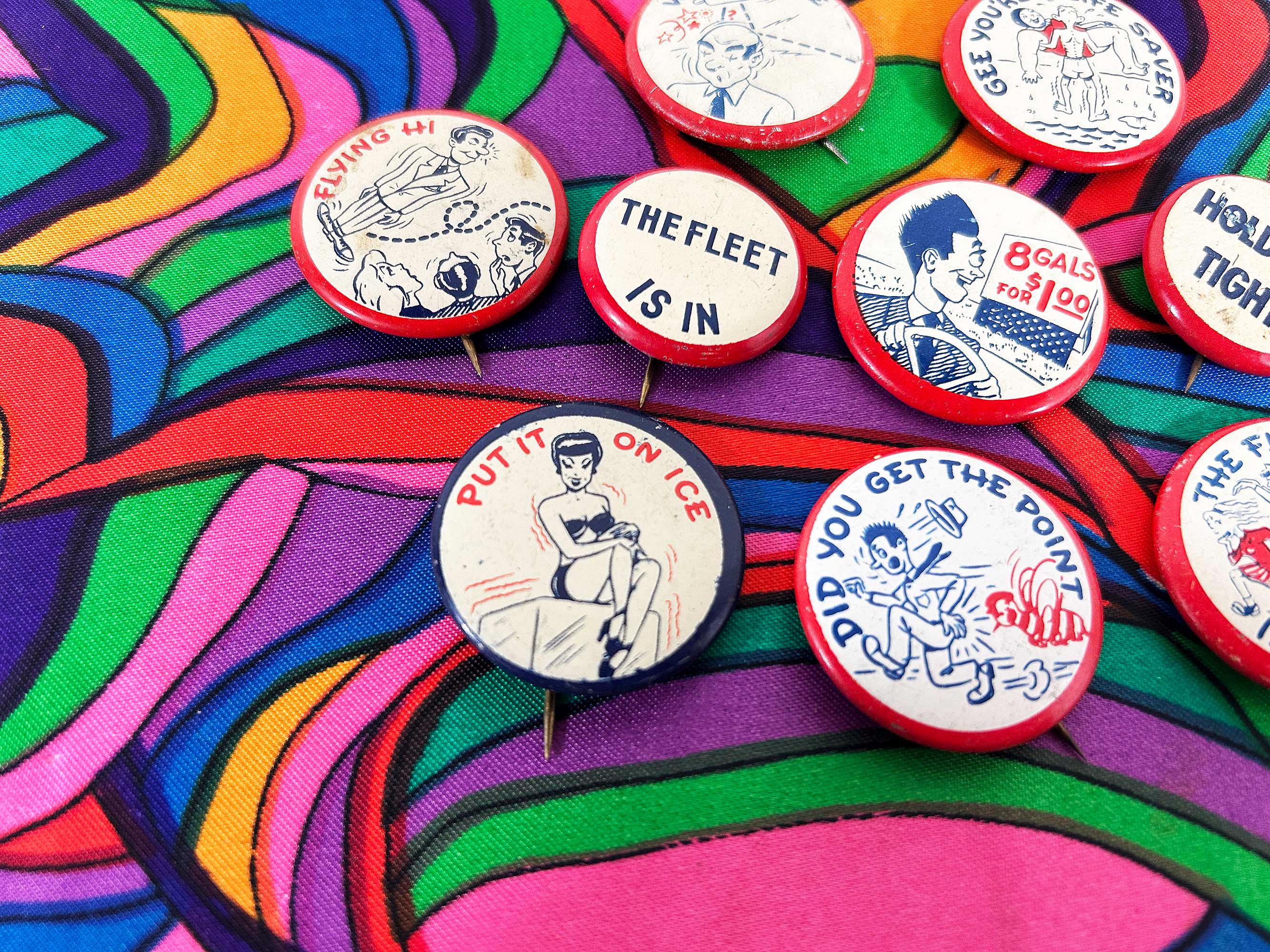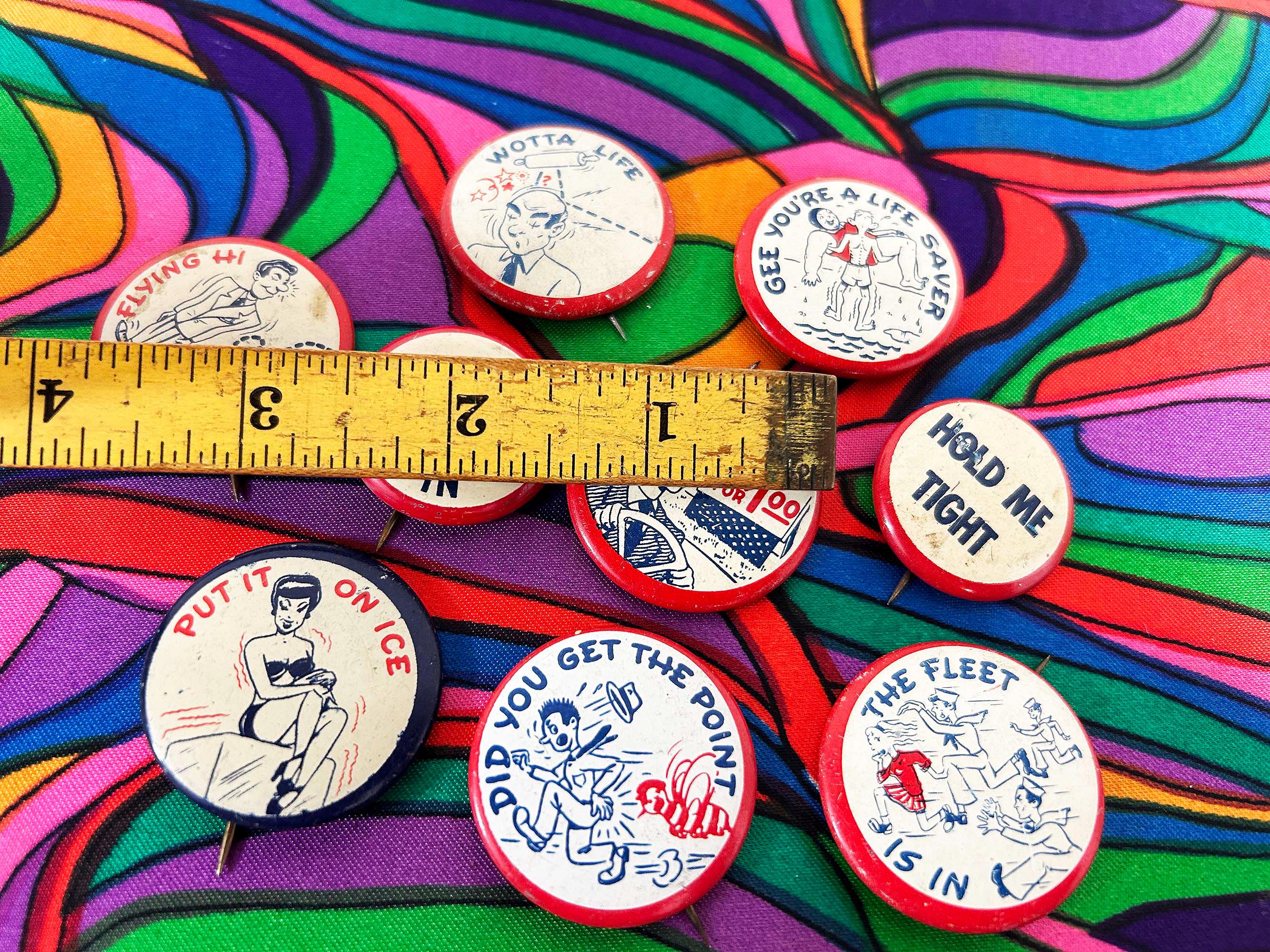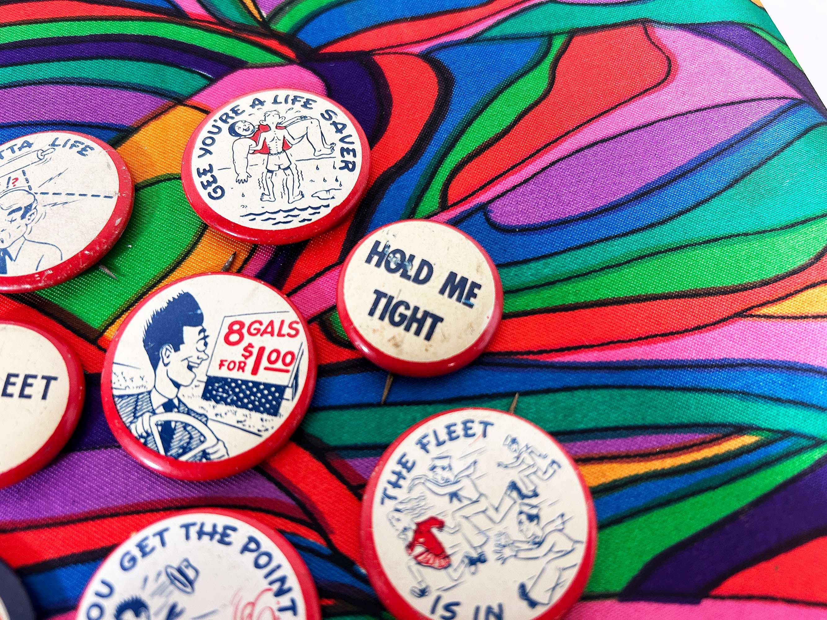 Super cool 1940s era pinback buttons with funny sayings. They are all showing signs of age and wear - please be sure to inspect all photos. The buttons are a little over 1 inch in diameter or about 1 1/4 inches in diameter. Each button is sold individually - choose the one you'd like from the drop down menu!
