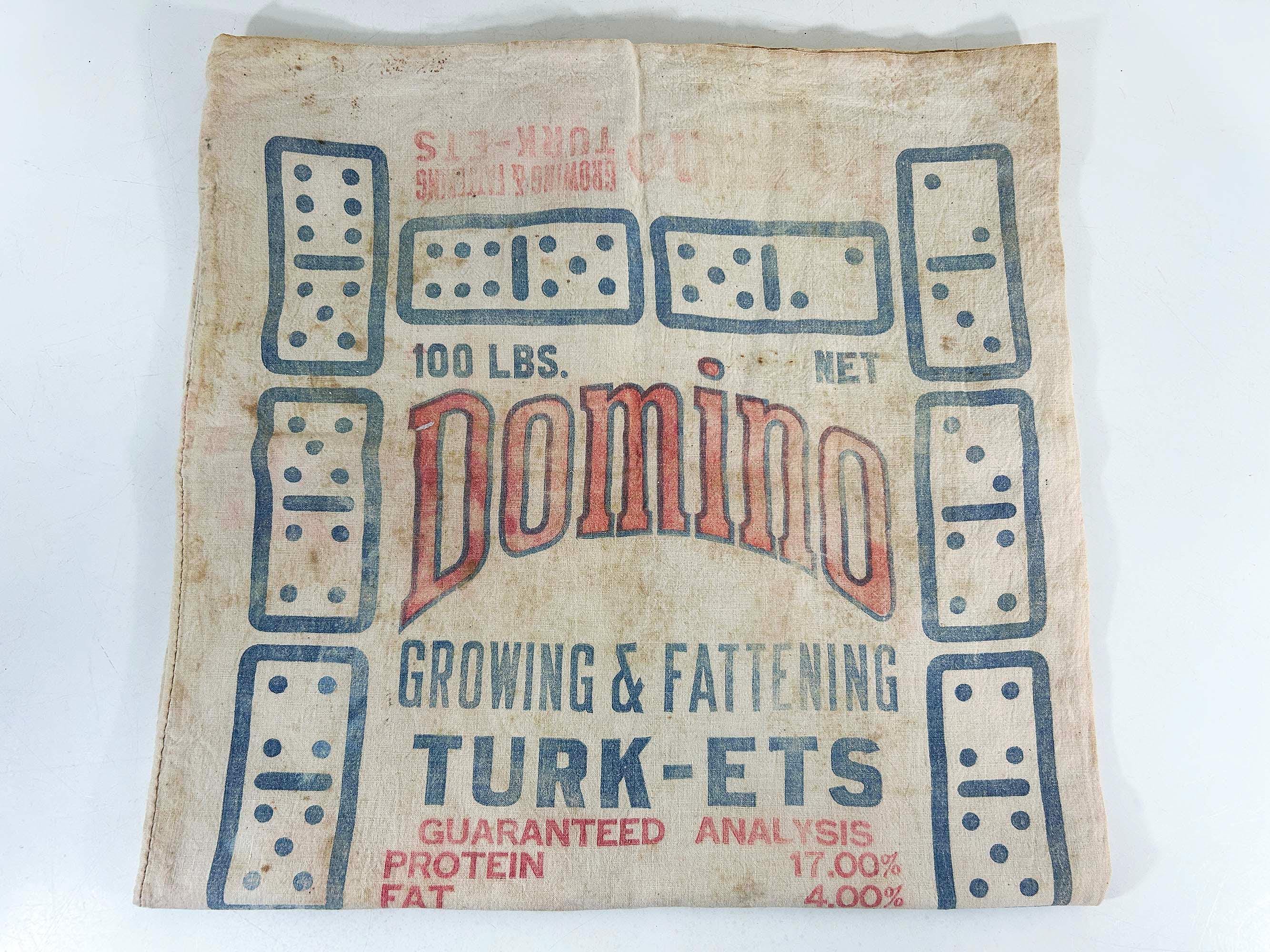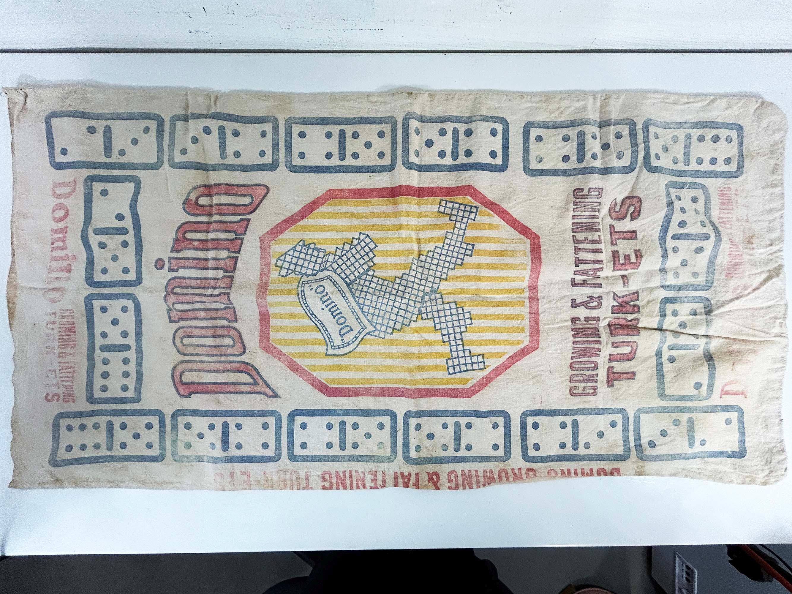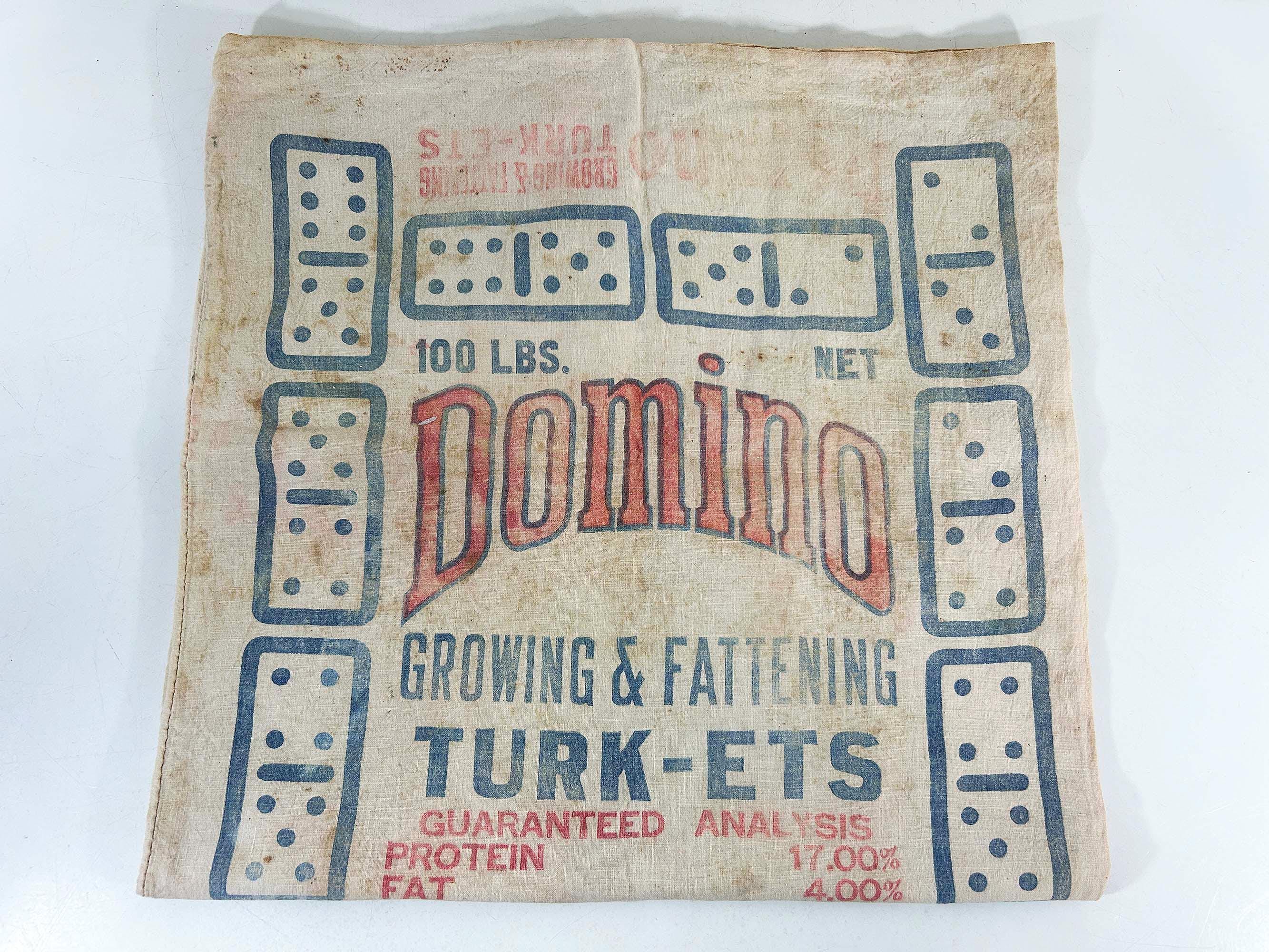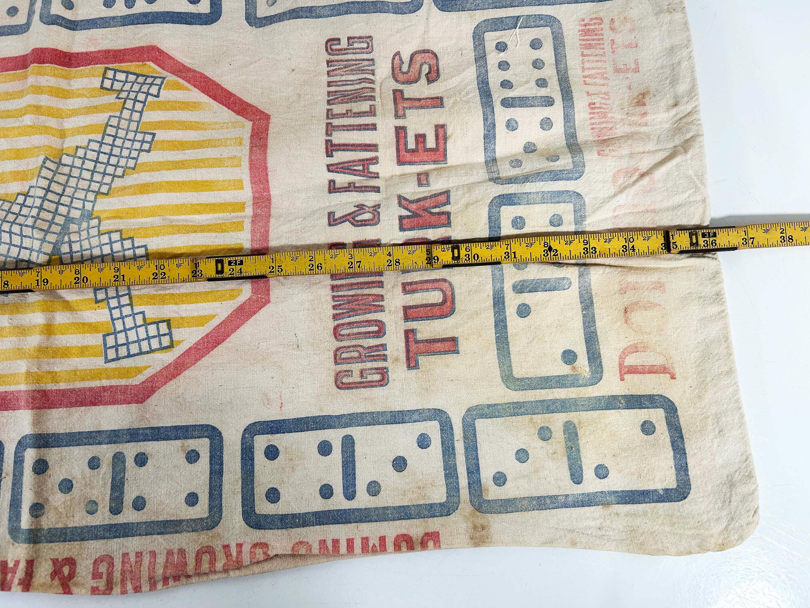 Very cool large cotton feed sack. Incredible branding and graphics! It is showing all over wear including stains and a few tears but it is still a very unique piece of history. It is approximately 36 inches long and 18 1/2 inches wide.