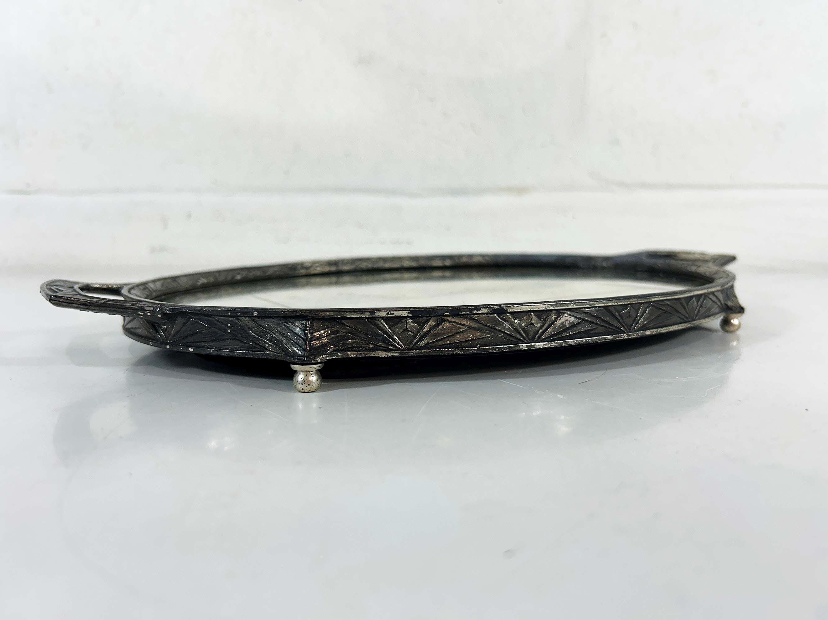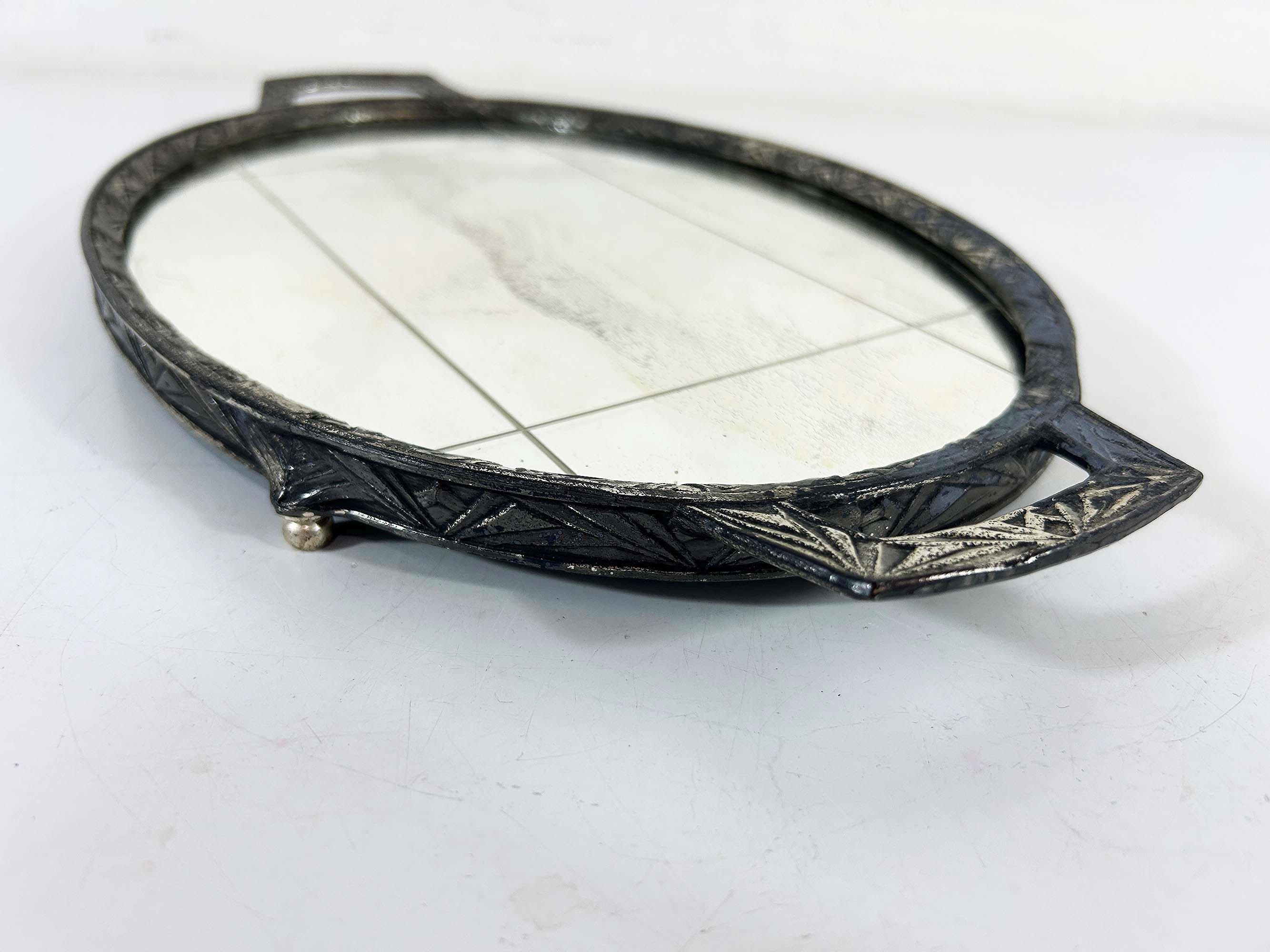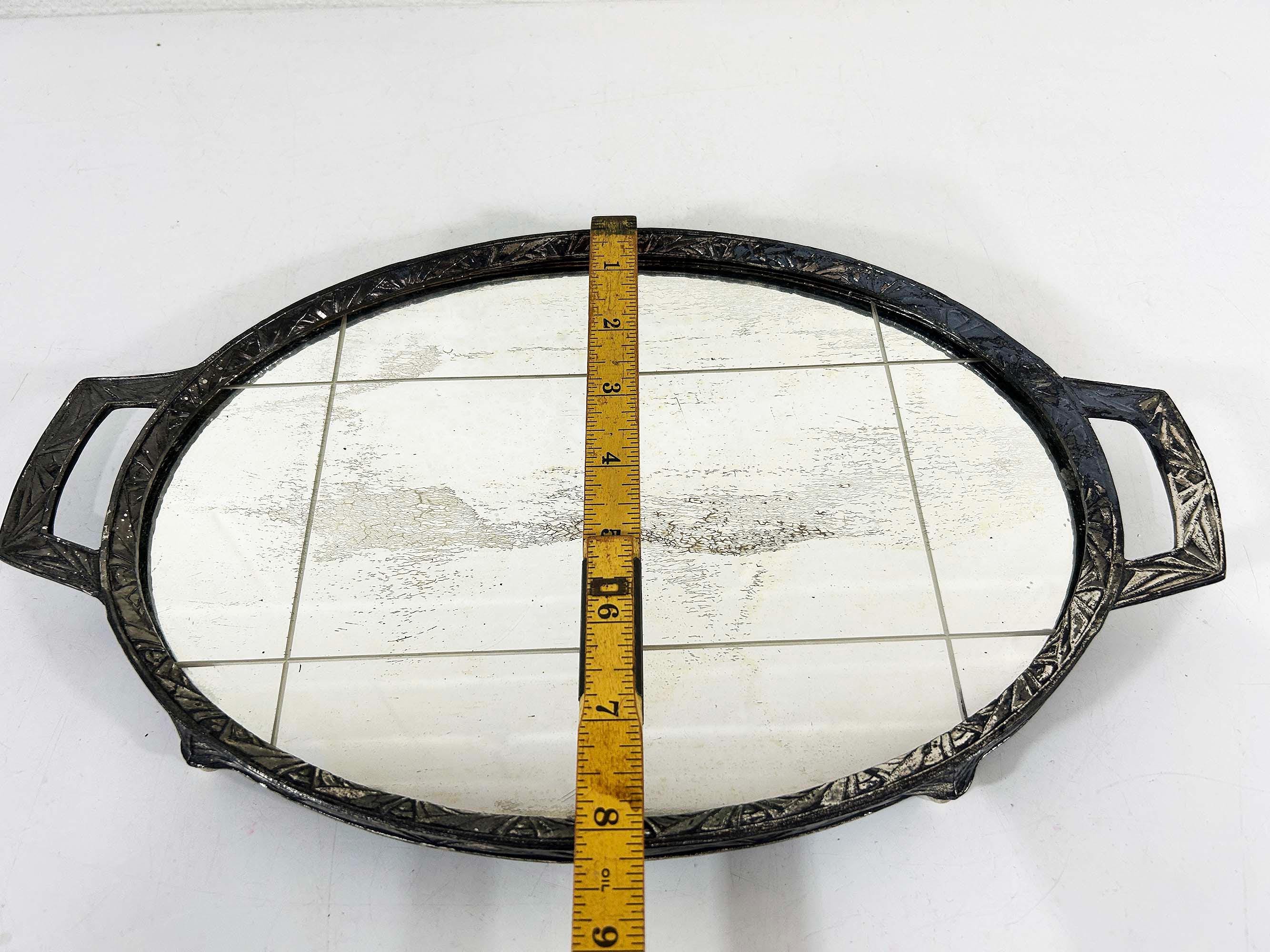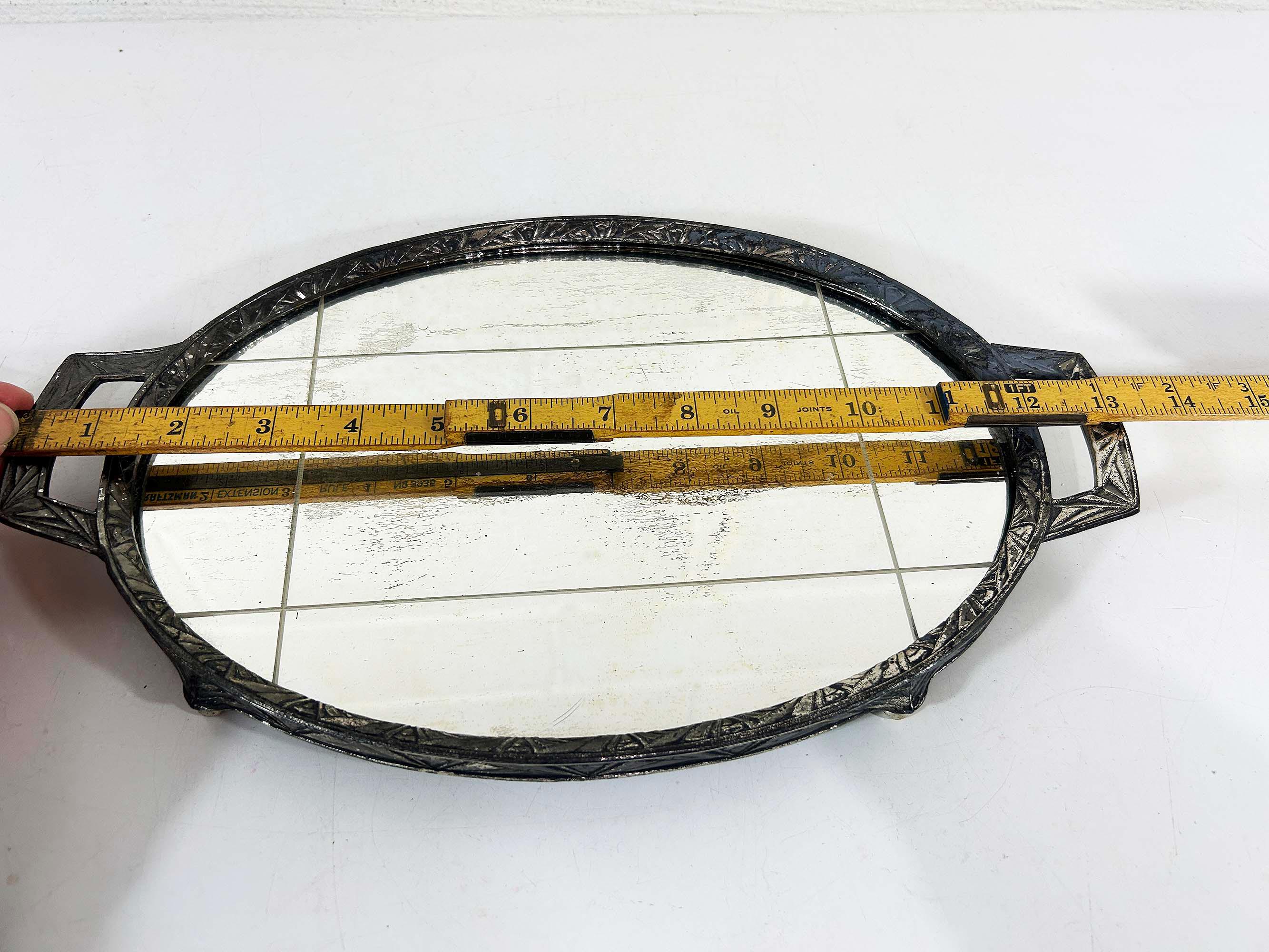Lovely art deco silver vanity mirror tray made by Progressive Novelty Casting Works. Marked PNCW on the bottom of the handles. In fair condition with some all over discoloration on the metal some damage to the backing. It measures about 13 inches in wide including the handles and 8 inches deep.