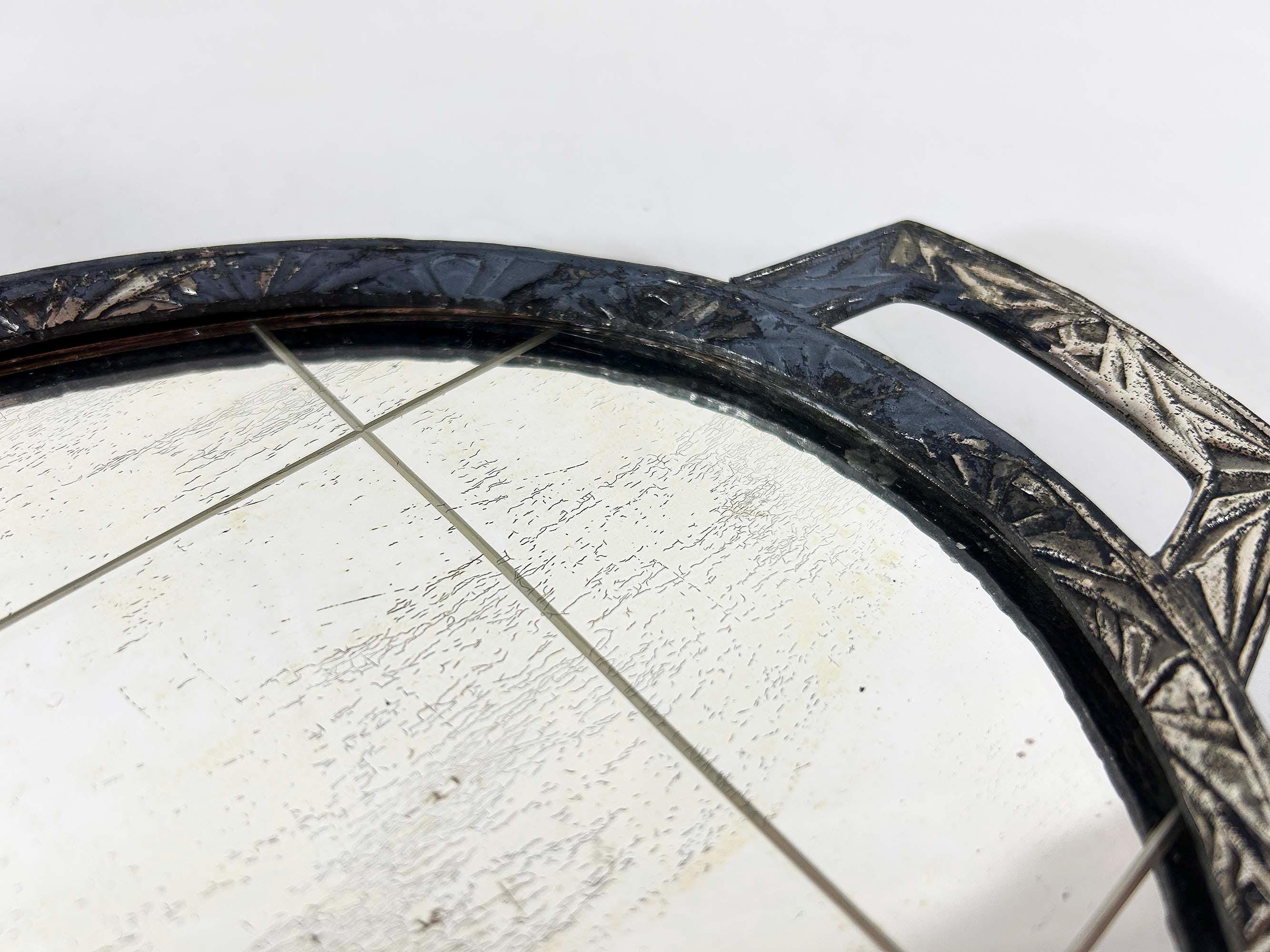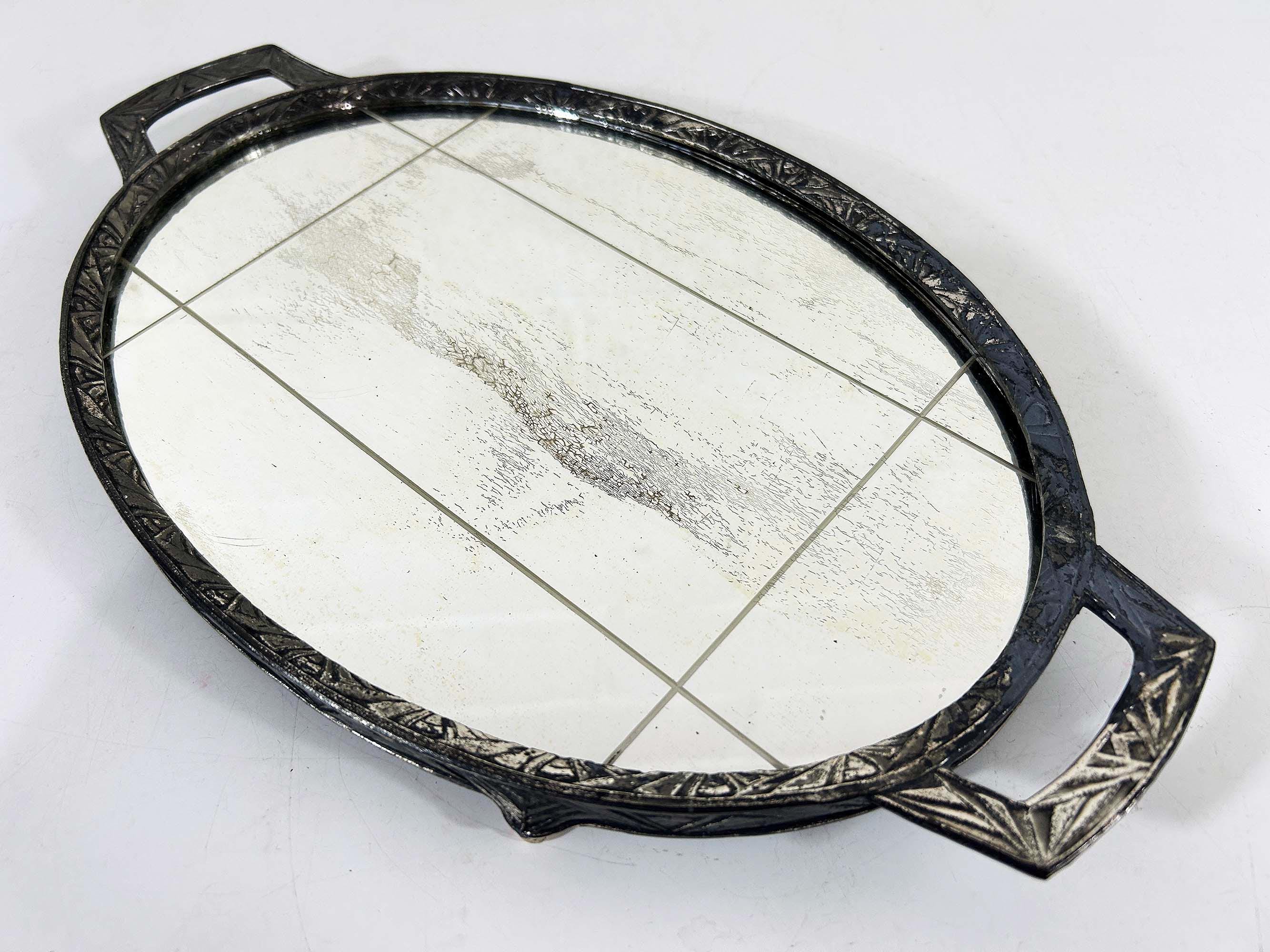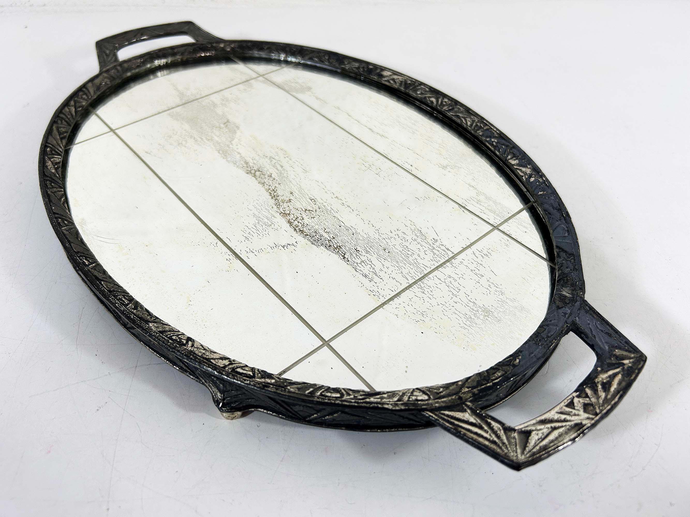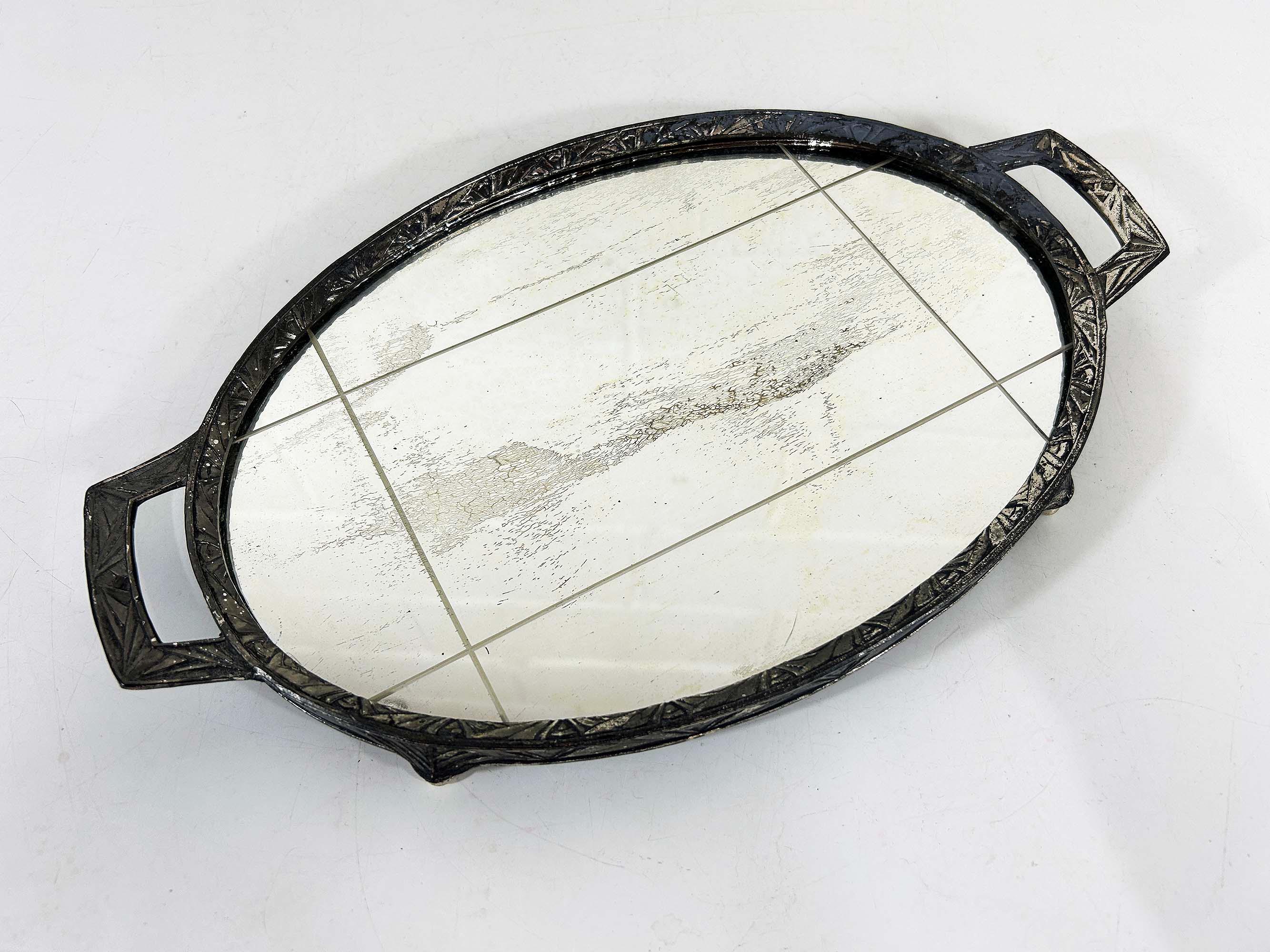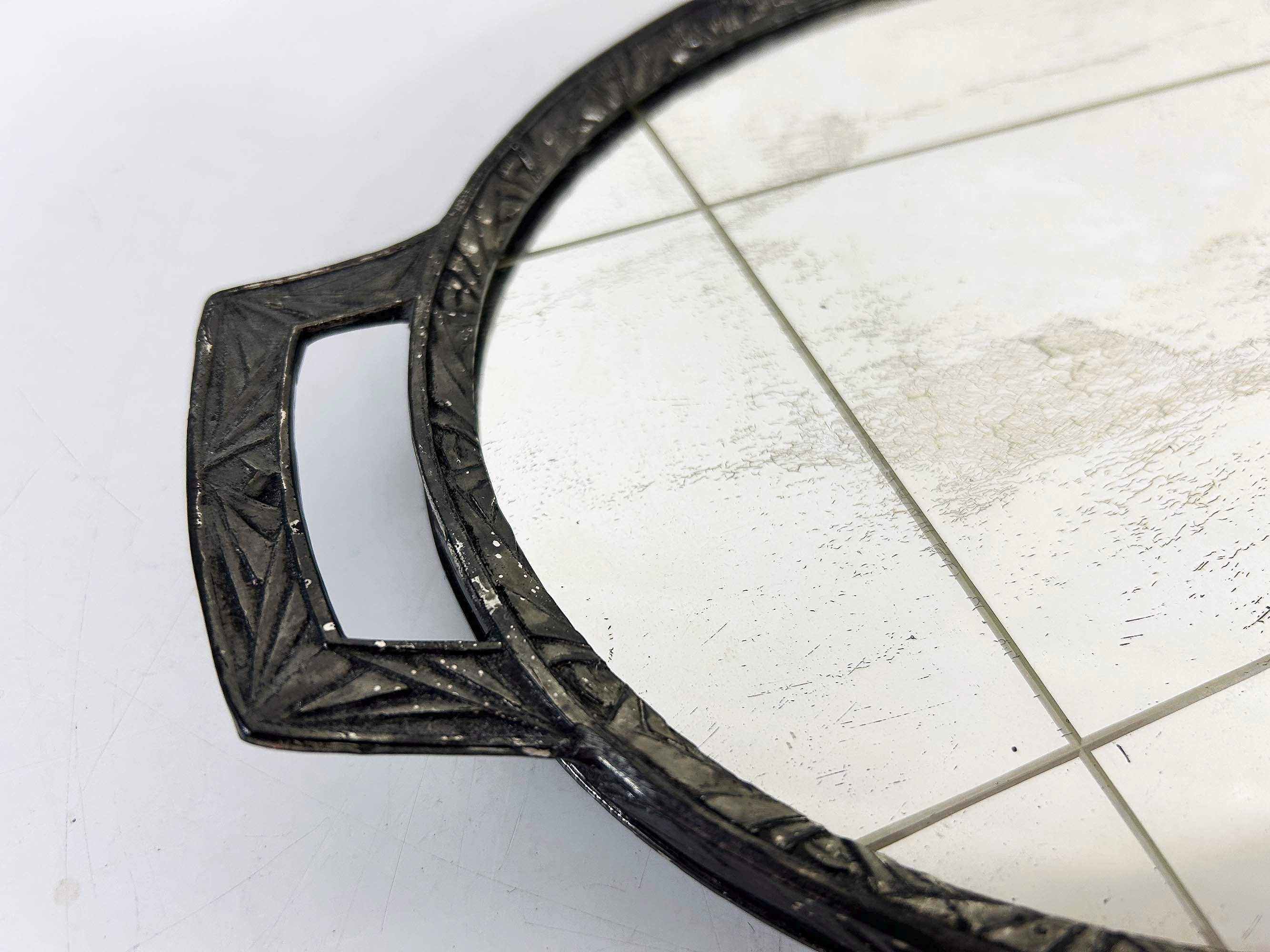 Lovely art deco silver vanity mirror tray made by Progressive Novelty Casting Works. Marked PNCW on the bottom of the handles. In fair condition with some all over discoloration on the metal some damage to the backing. It measures about 13 inches in wide including the handles and 8 inches deep.