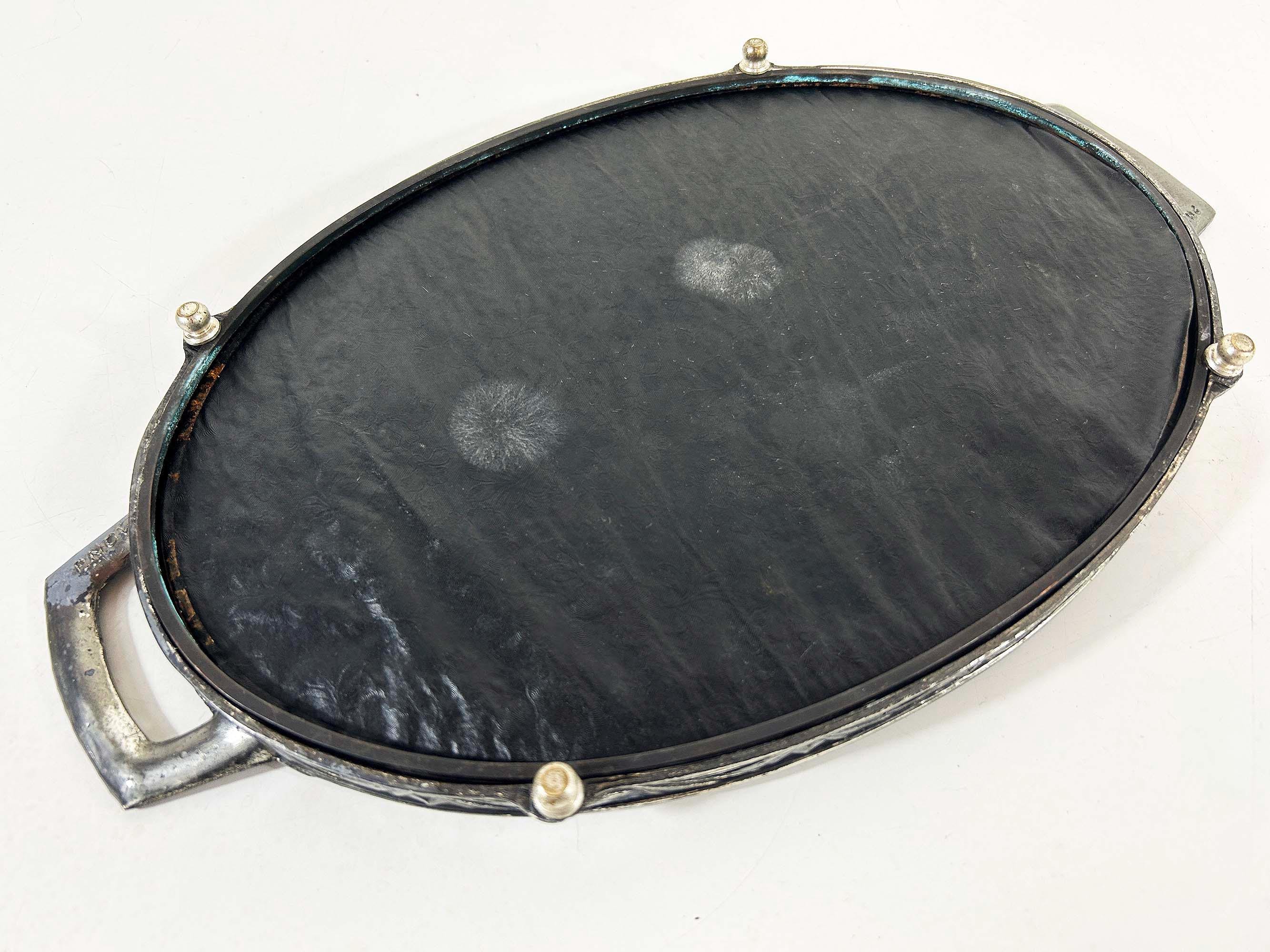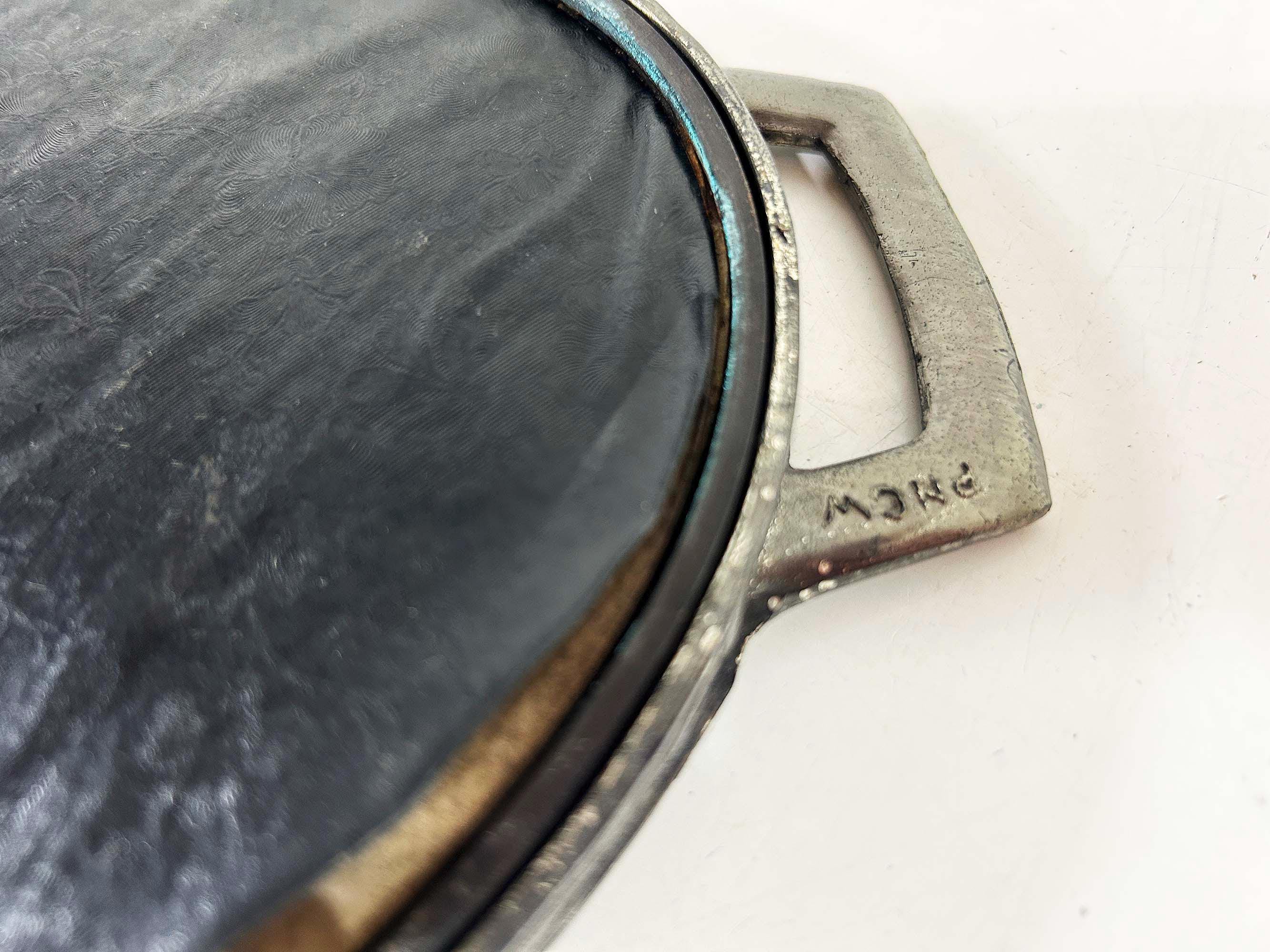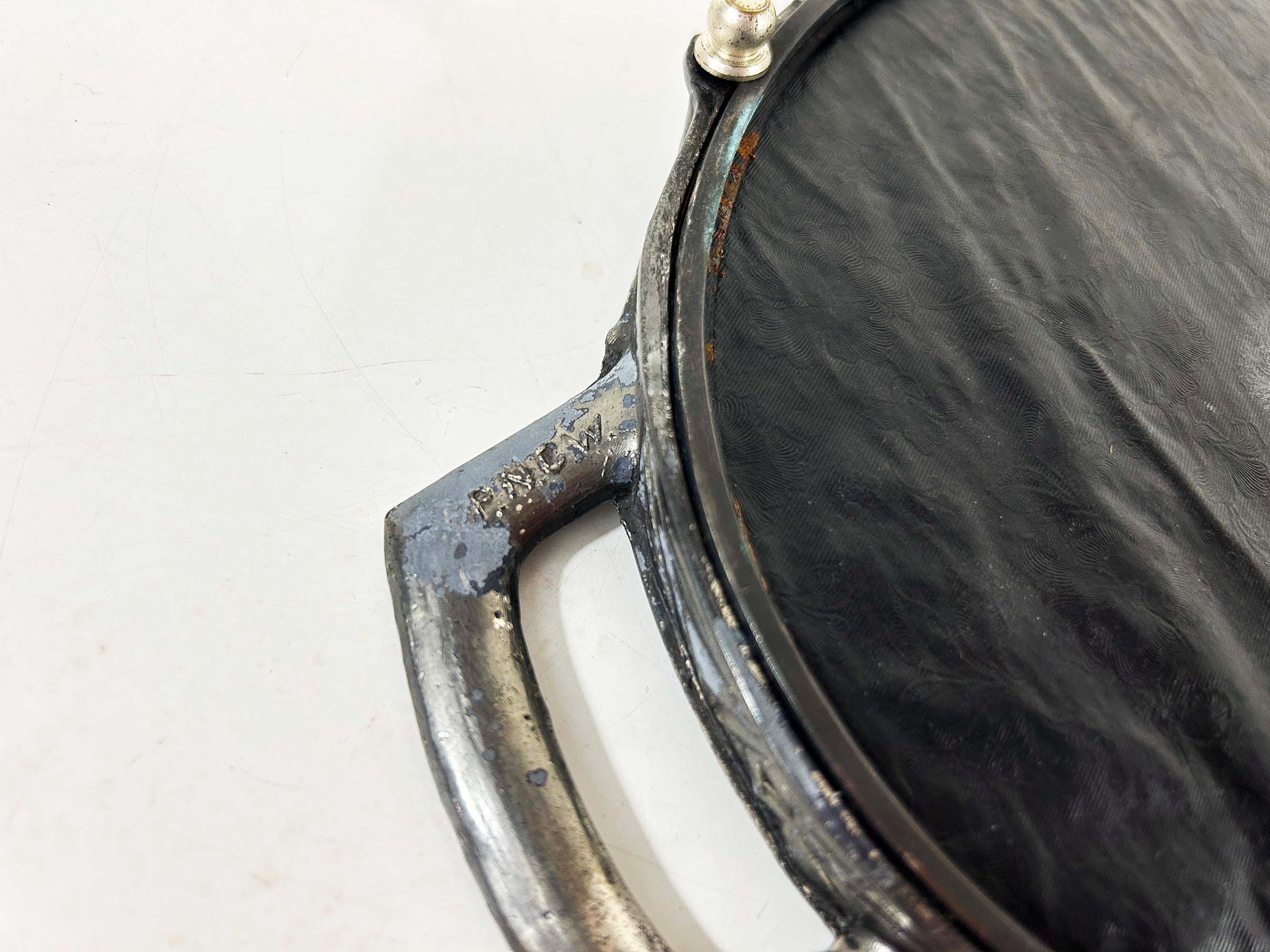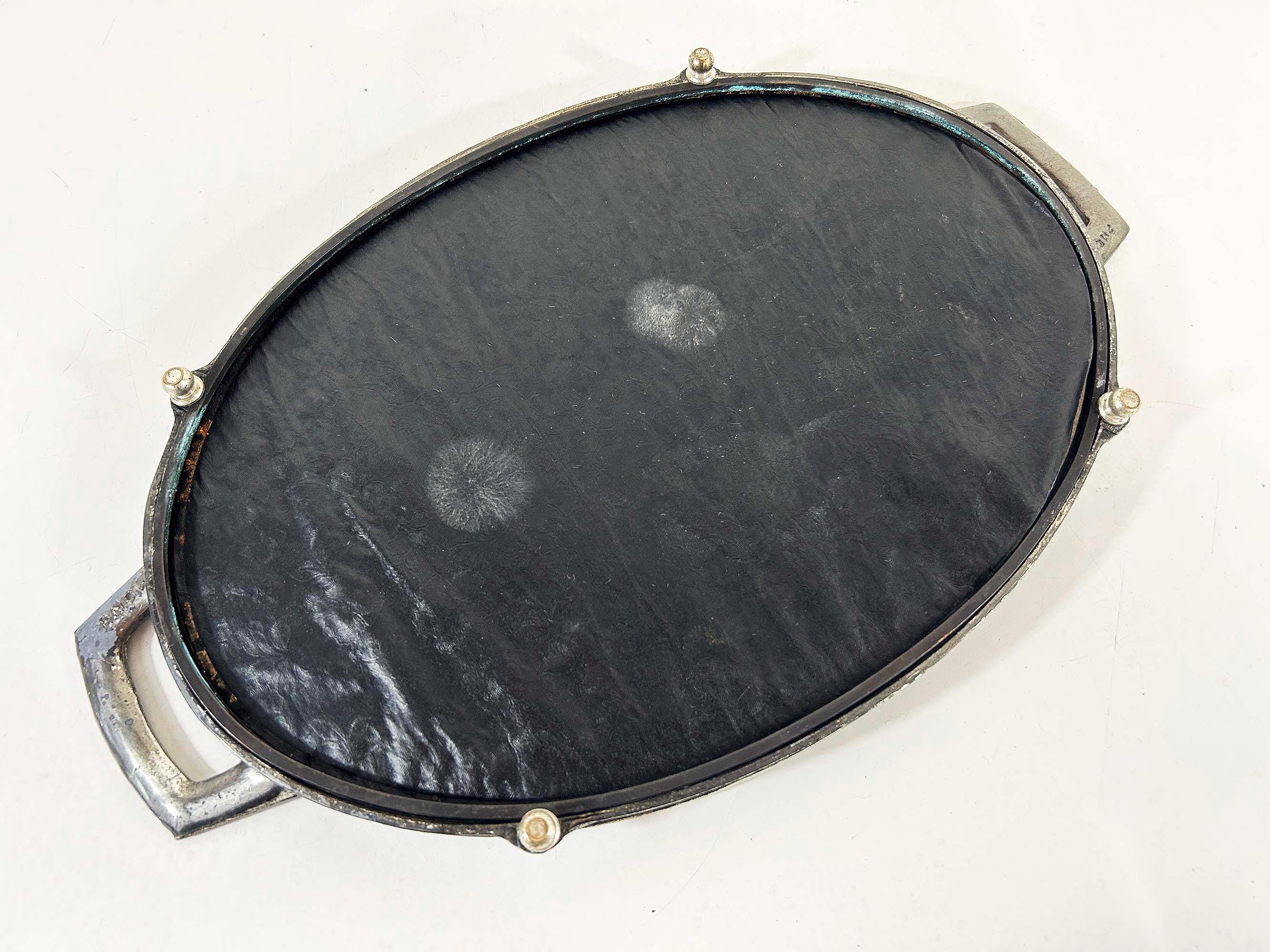 Lovely art deco silver vanity mirror tray made by Progressive Novelty Casting Works. Marked PNCW on the bottom of the handles. In fair condition with some all over discoloration on the metal some damage to the backing. It measures about 13 inches in wide including the handles and 8 inches deep.