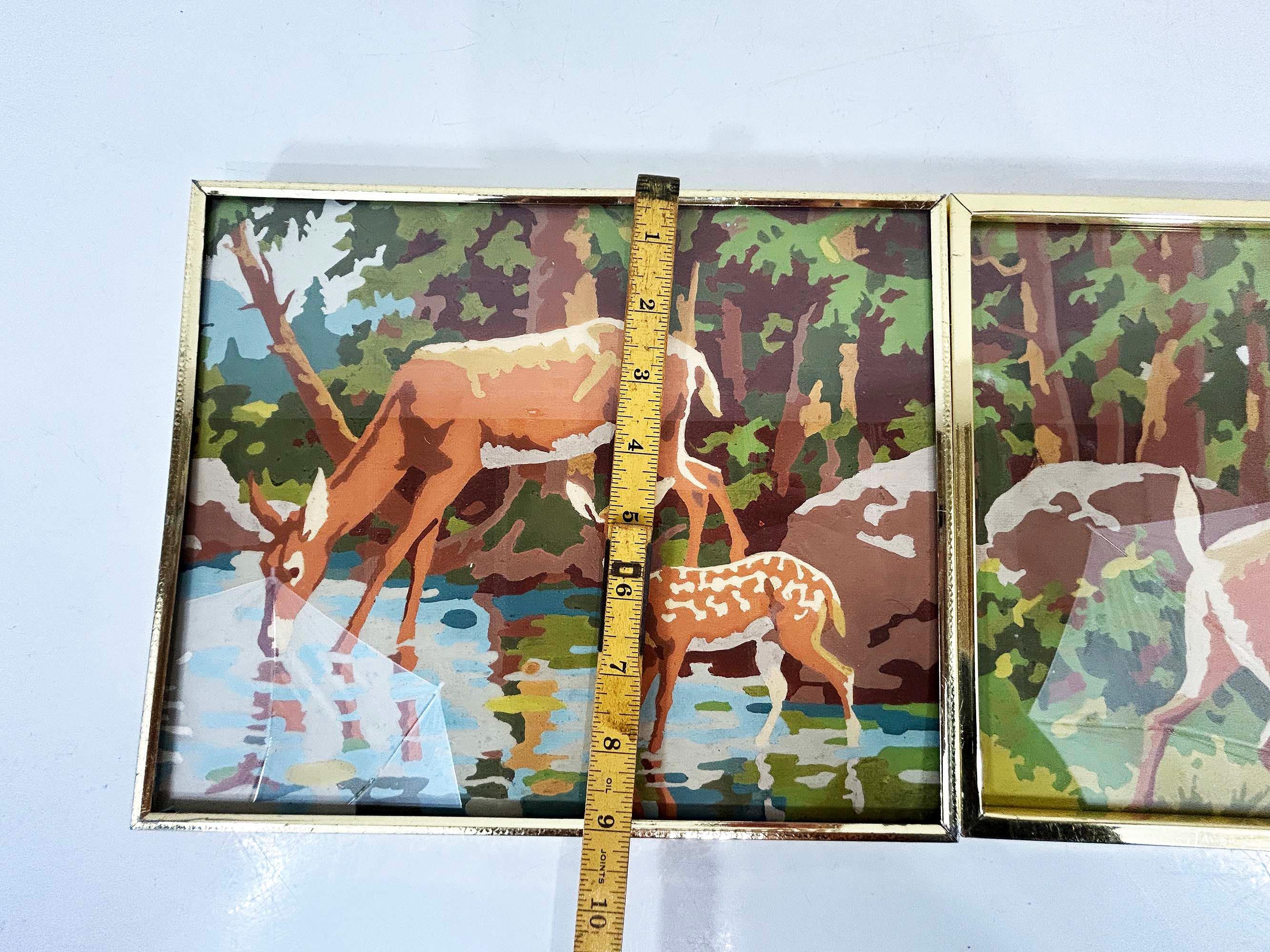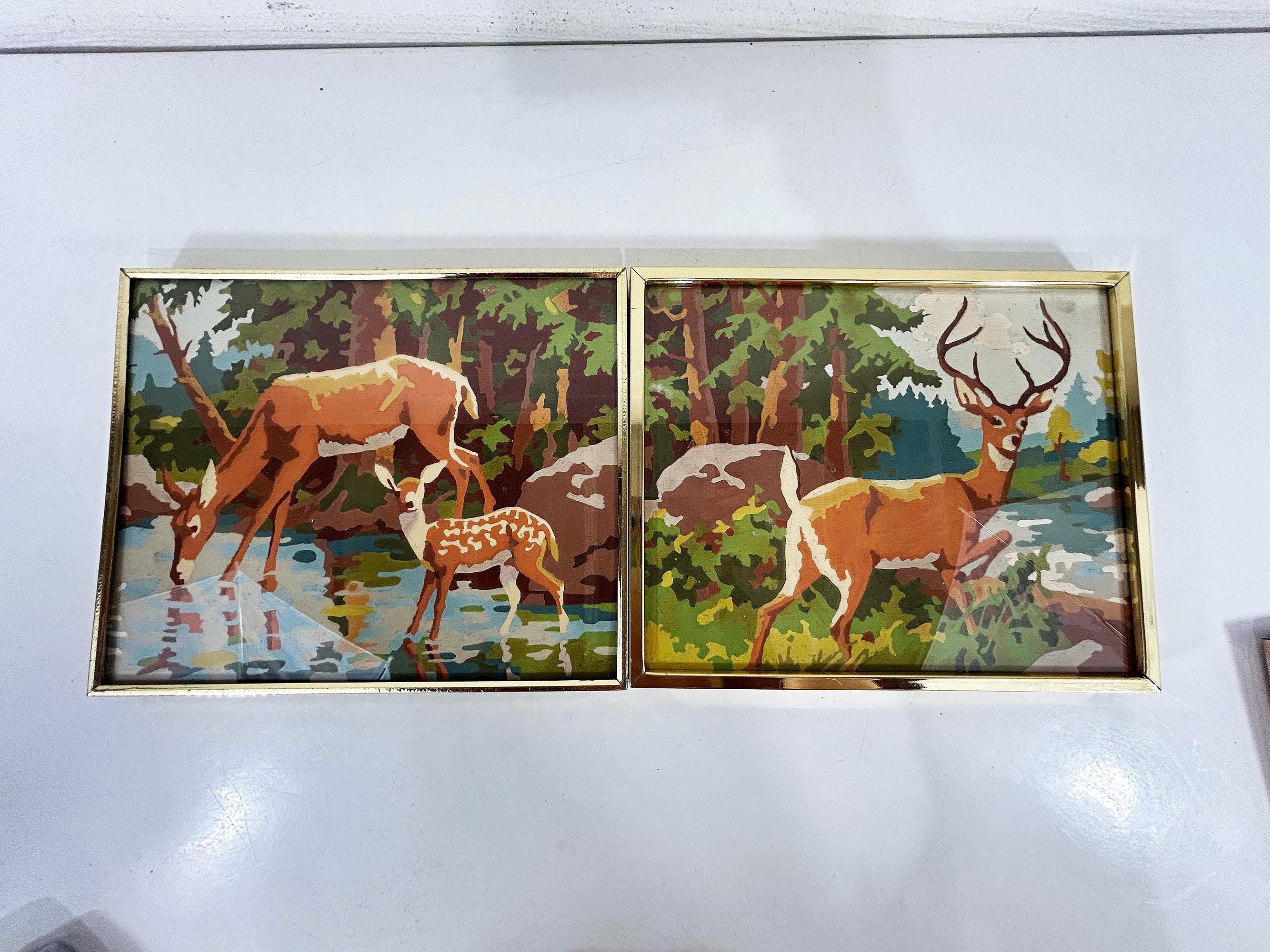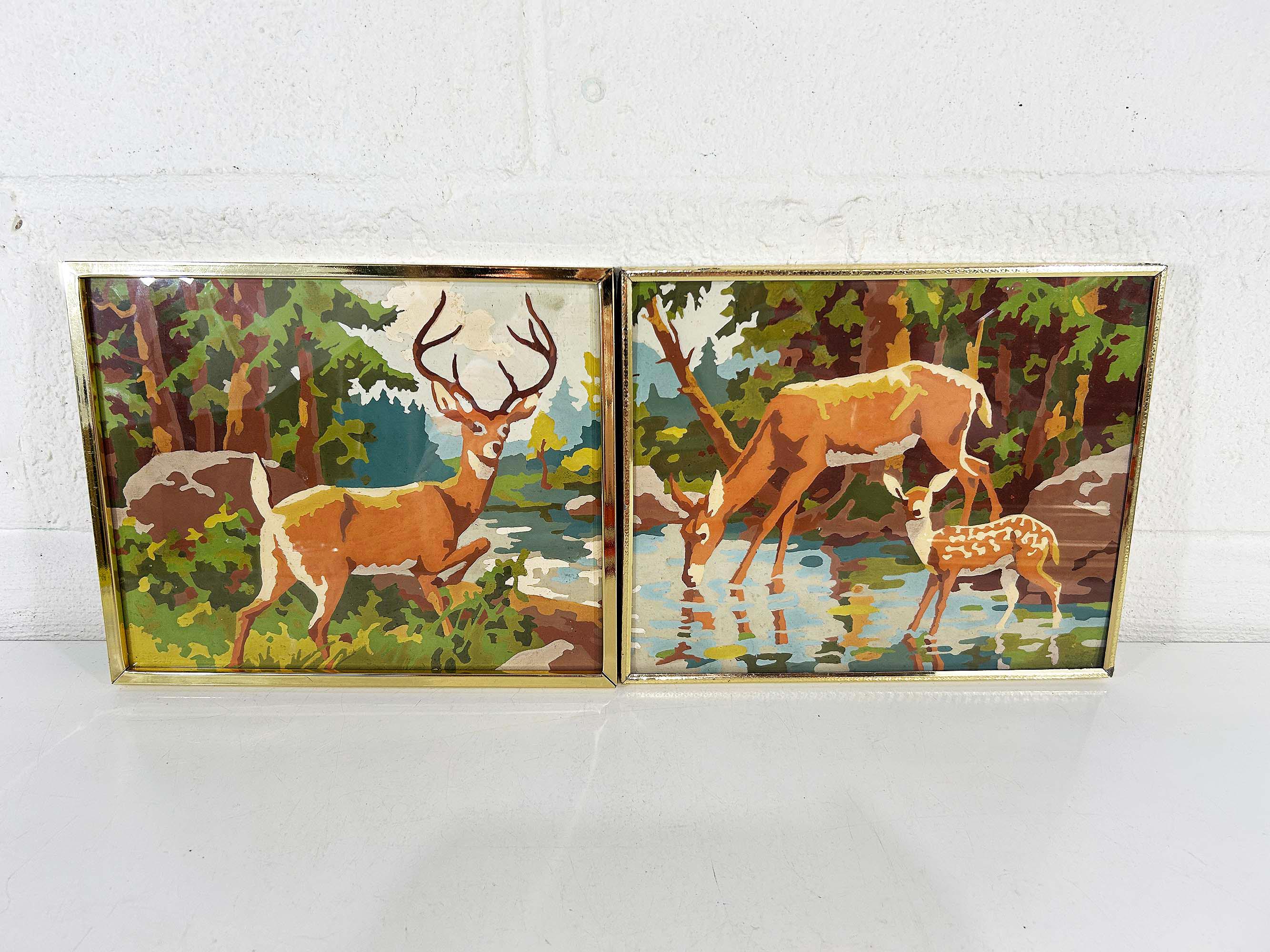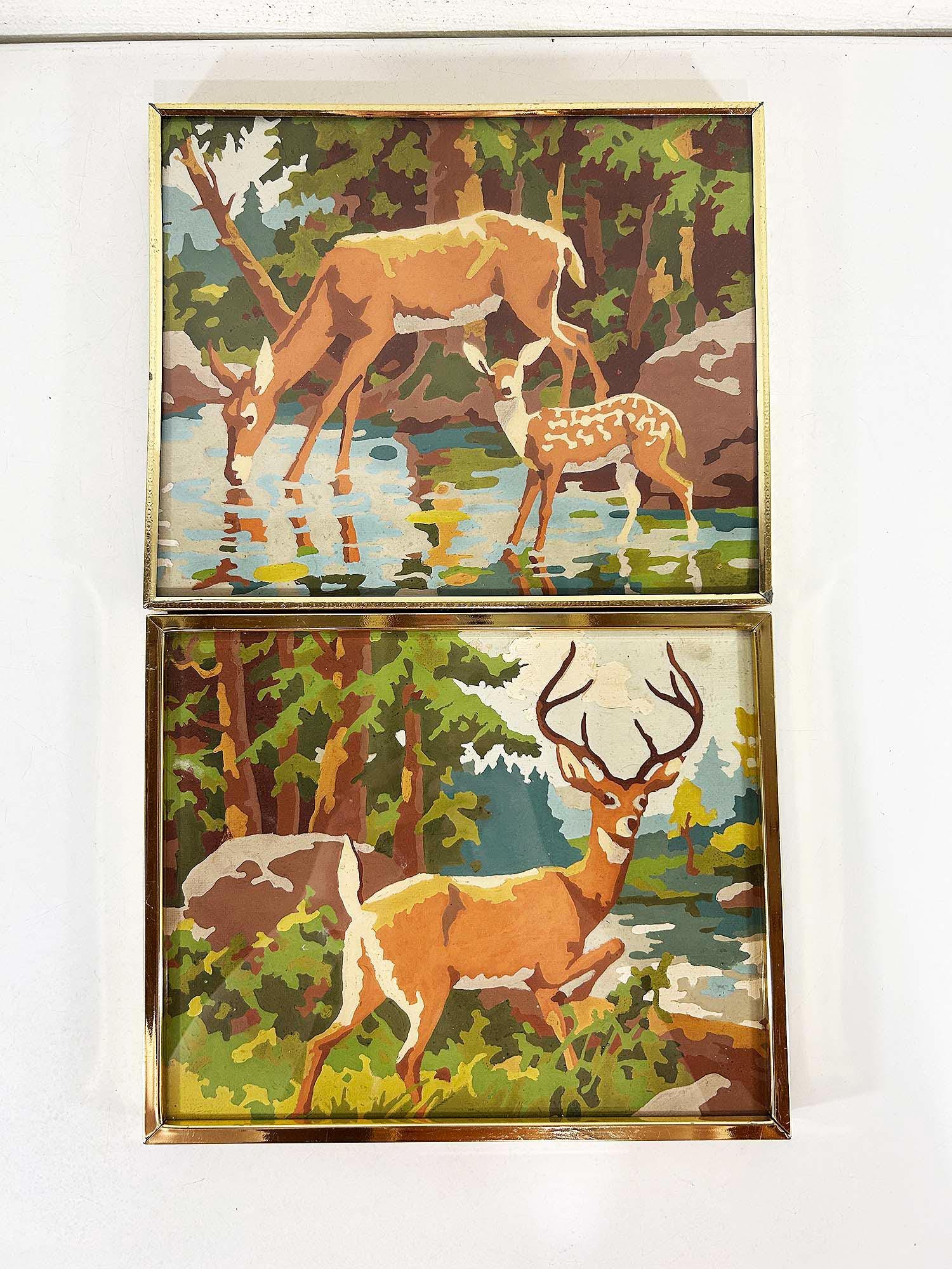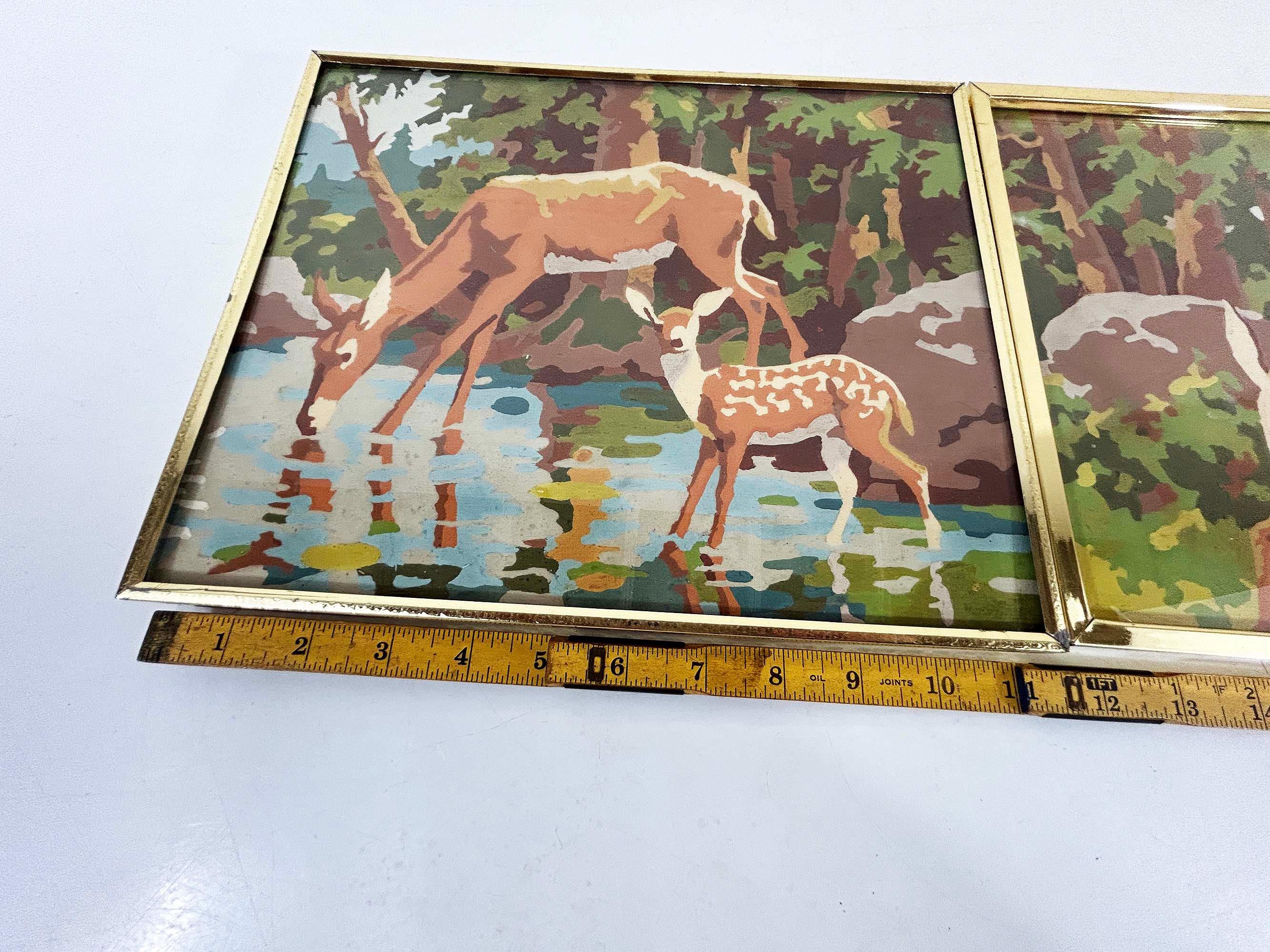 Really lovely pair of framed deer paint by numbers. Each frame is approximately 9 inches tall and 12 inches wide. These are really well done - very clean job by the painter! They are in good vintage condition with some signs on wear on the art and the frames - please be sure to inspect all photos closely. Frames are slightly different styles but the same size.