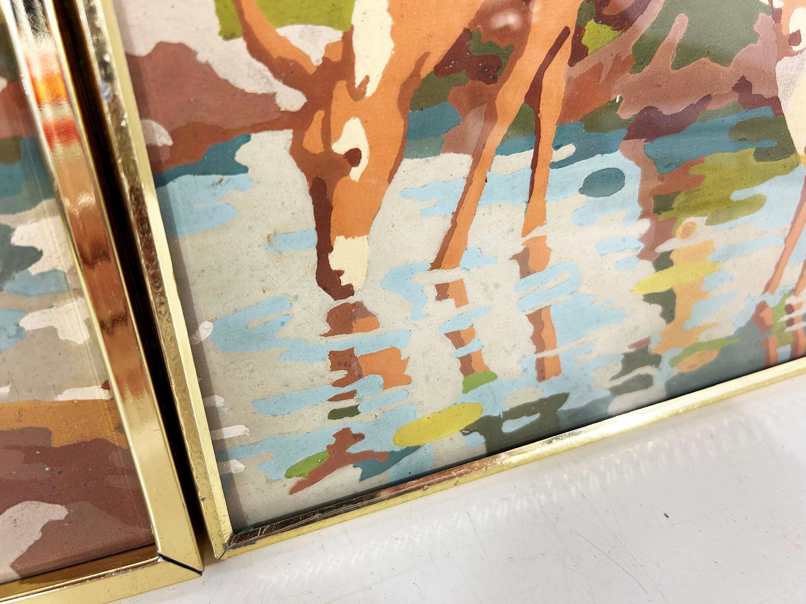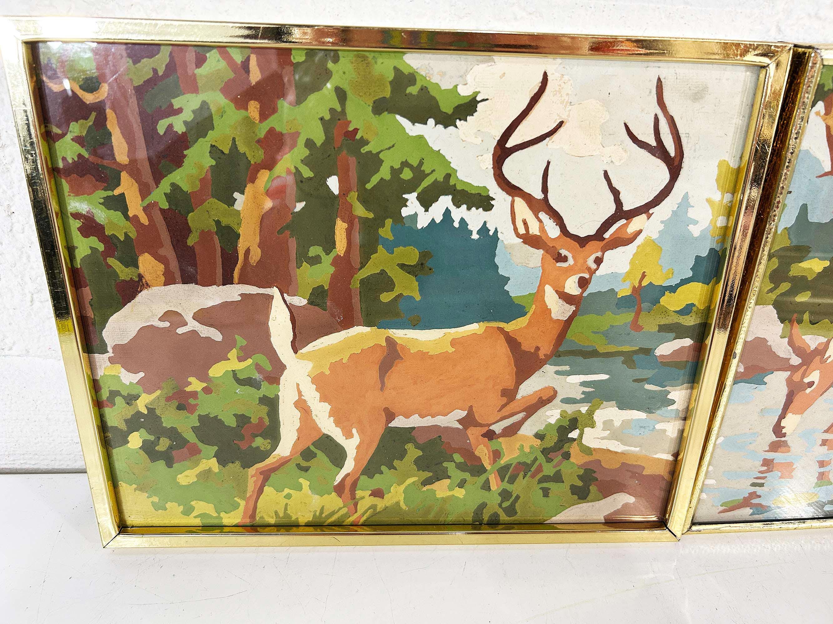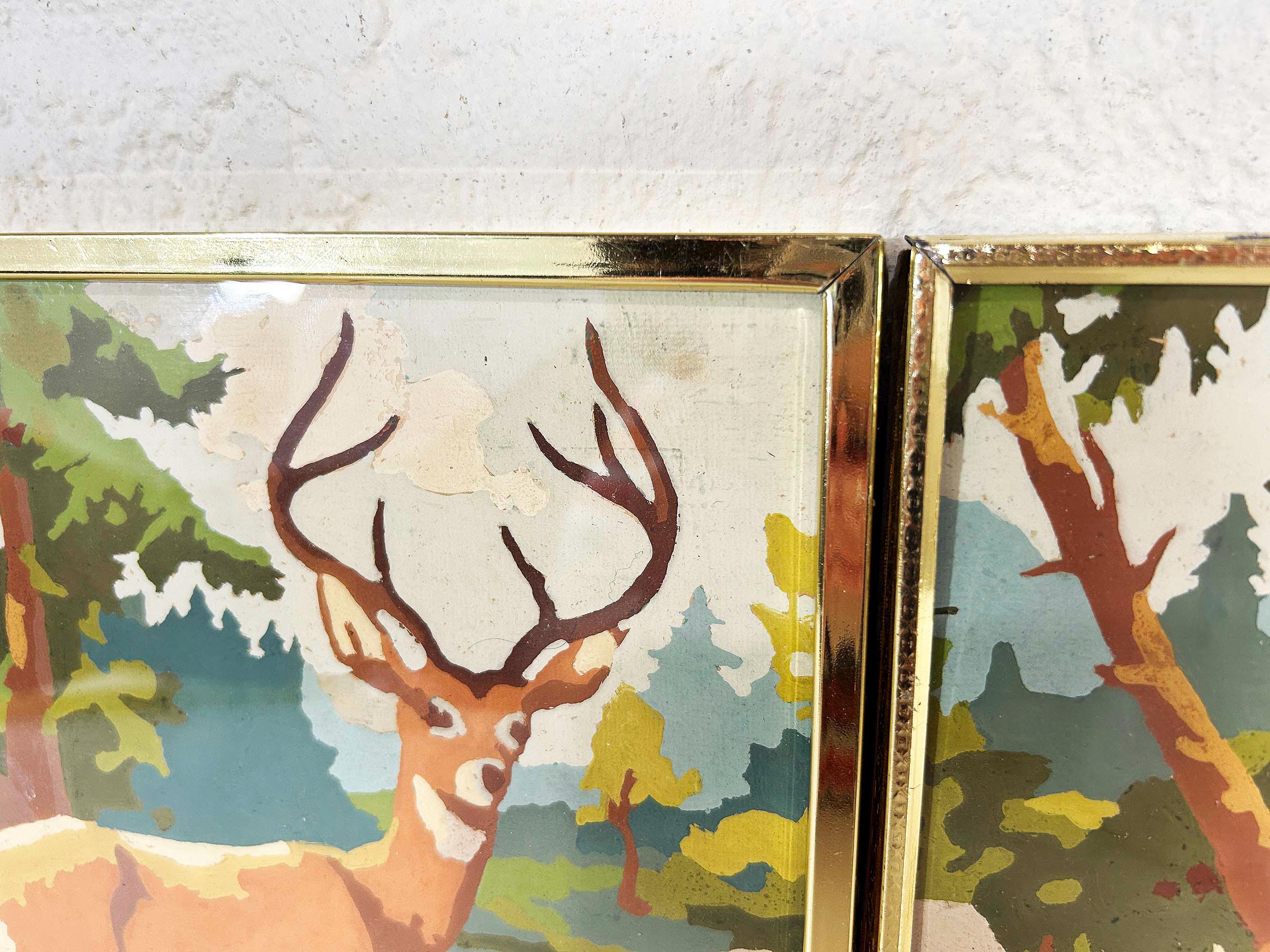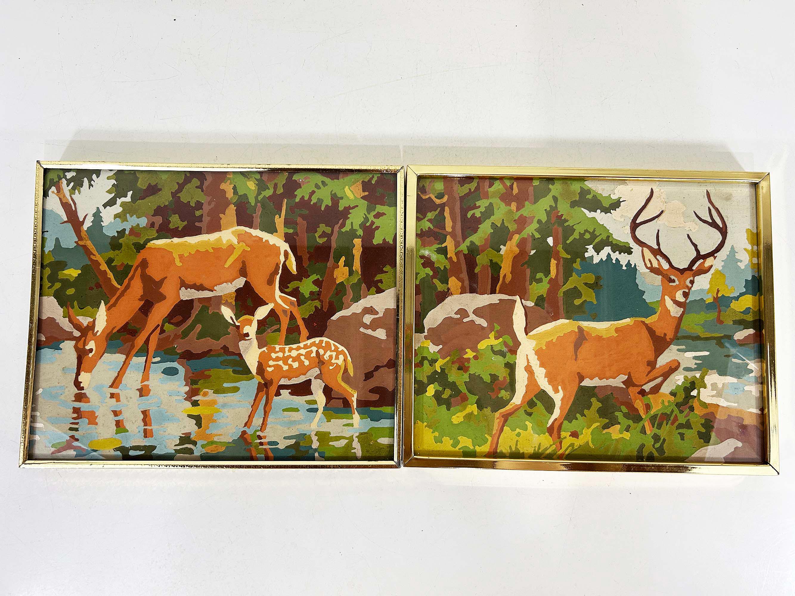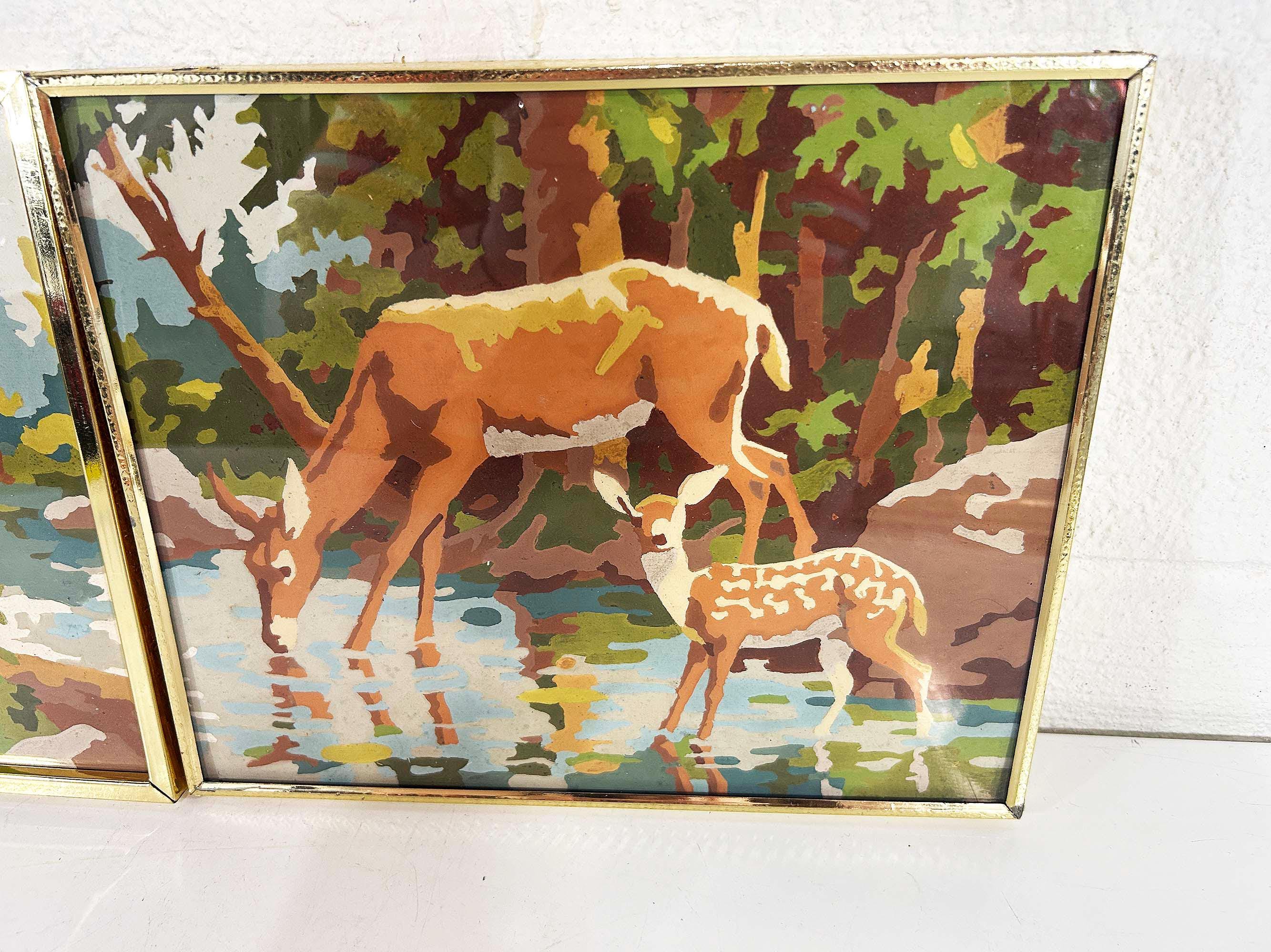 Really lovely pair of framed deer paint by numbers. Each frame is approximately 9 inches tall and 12 inches wide. These are really well done - very clean job by the painter! They are in good vintage condition with some signs on wear on the art and the frames - please be sure to inspect all photos closely. Frames are slightly different styles but the same size.