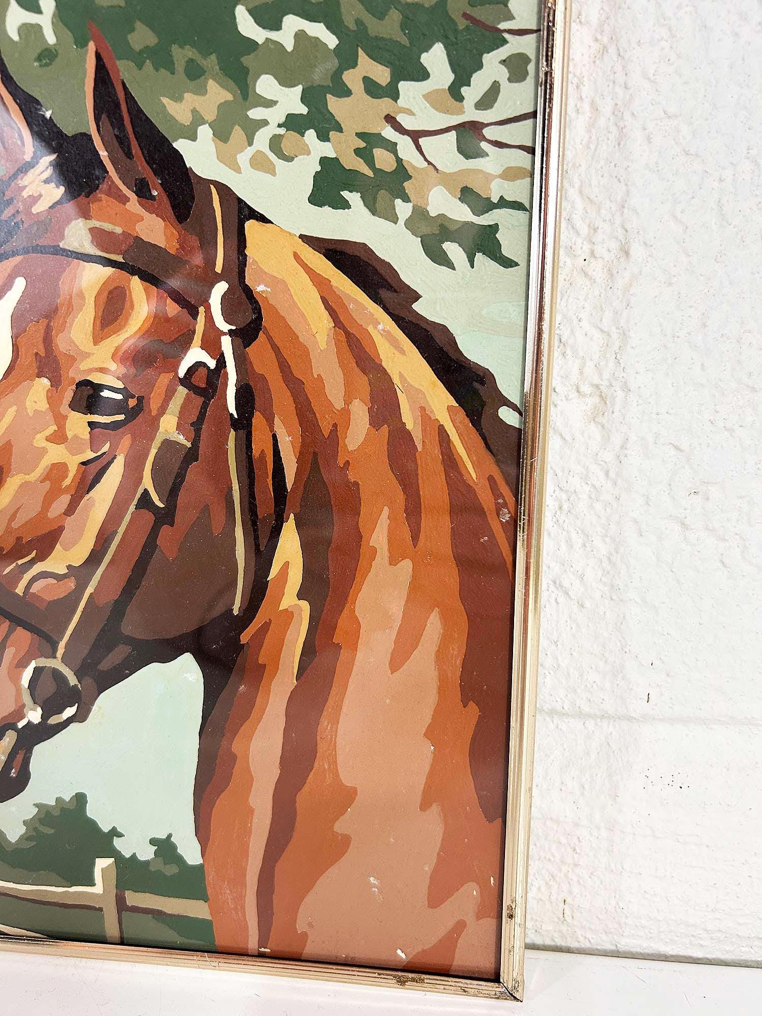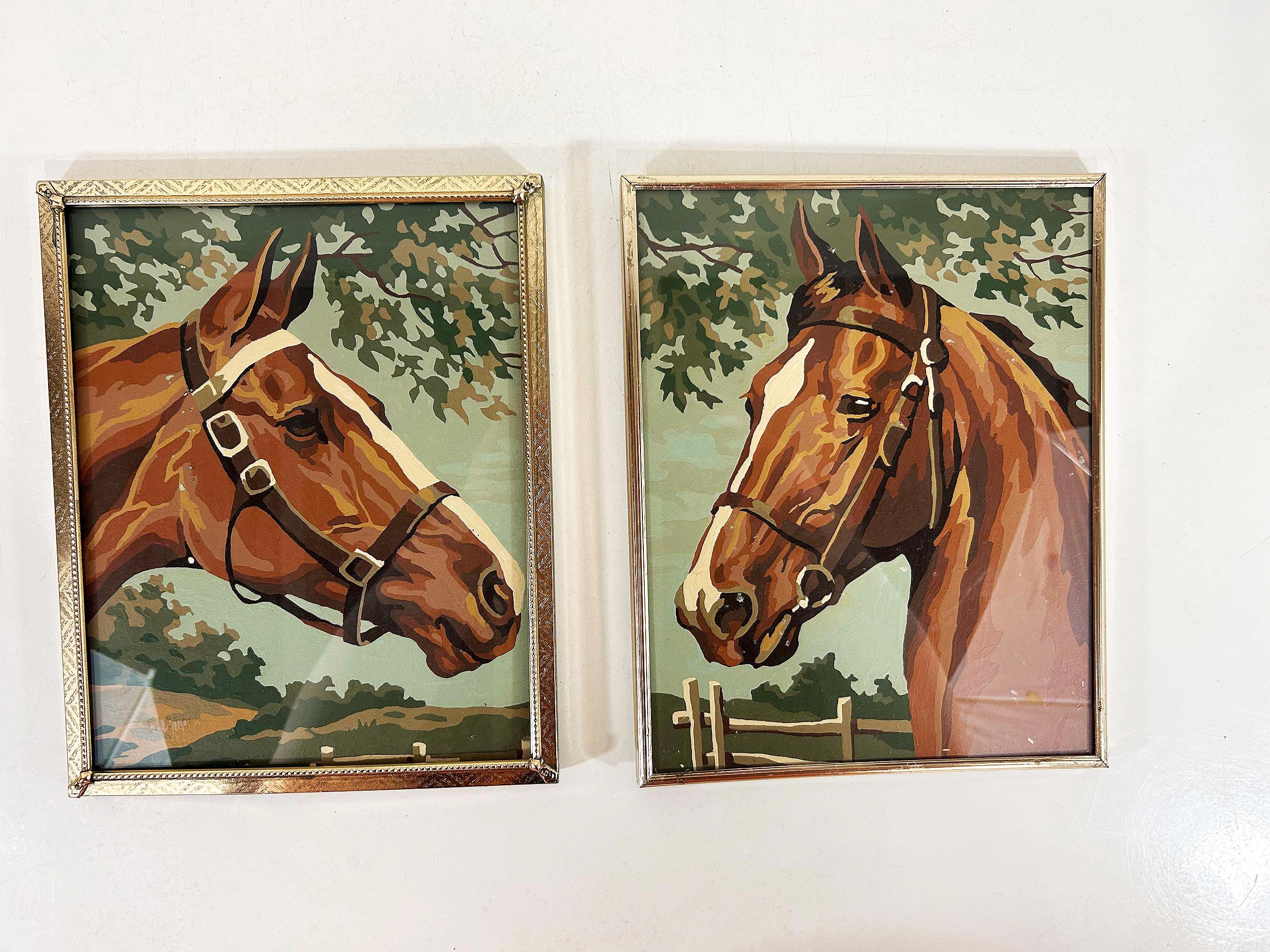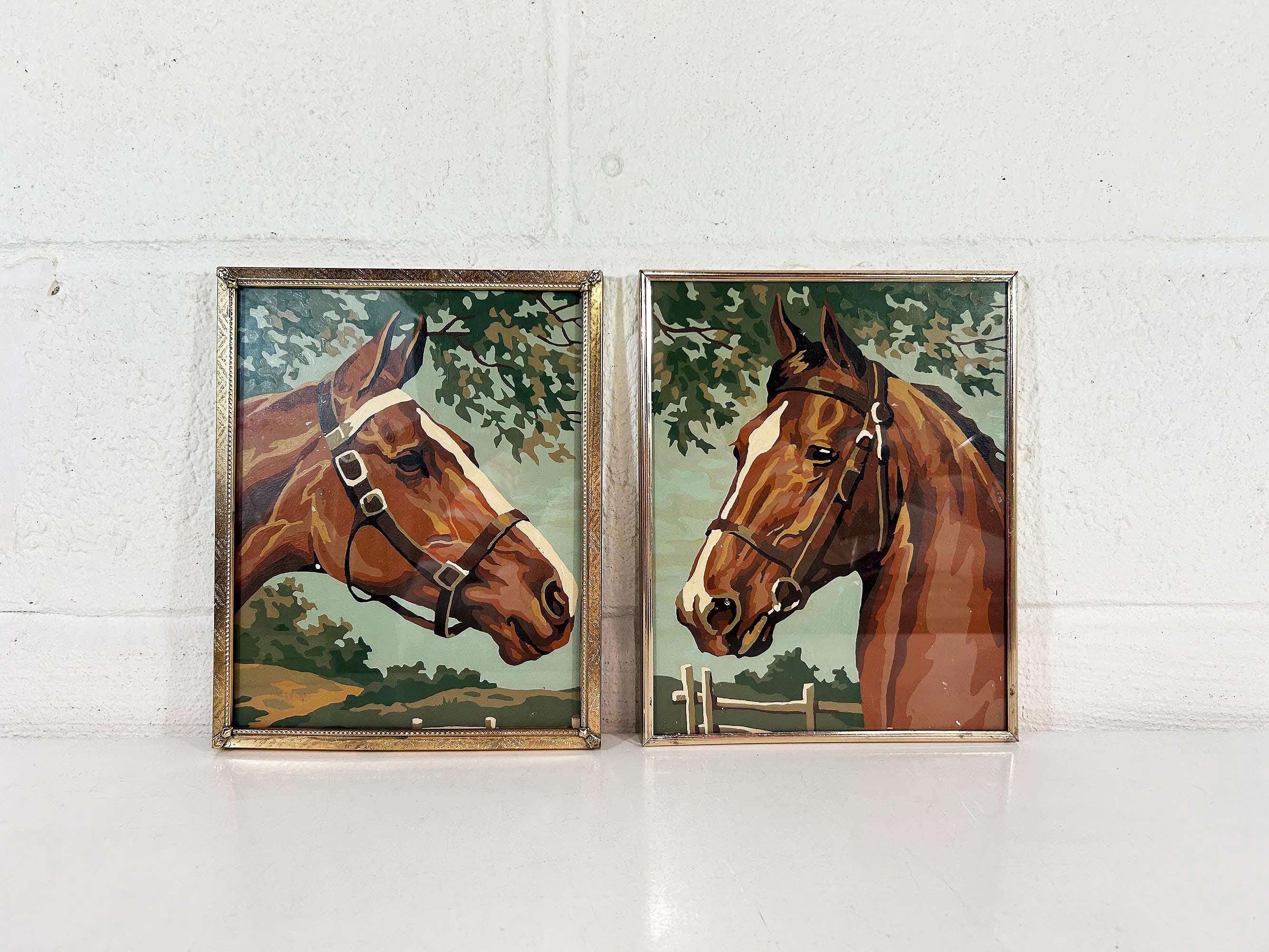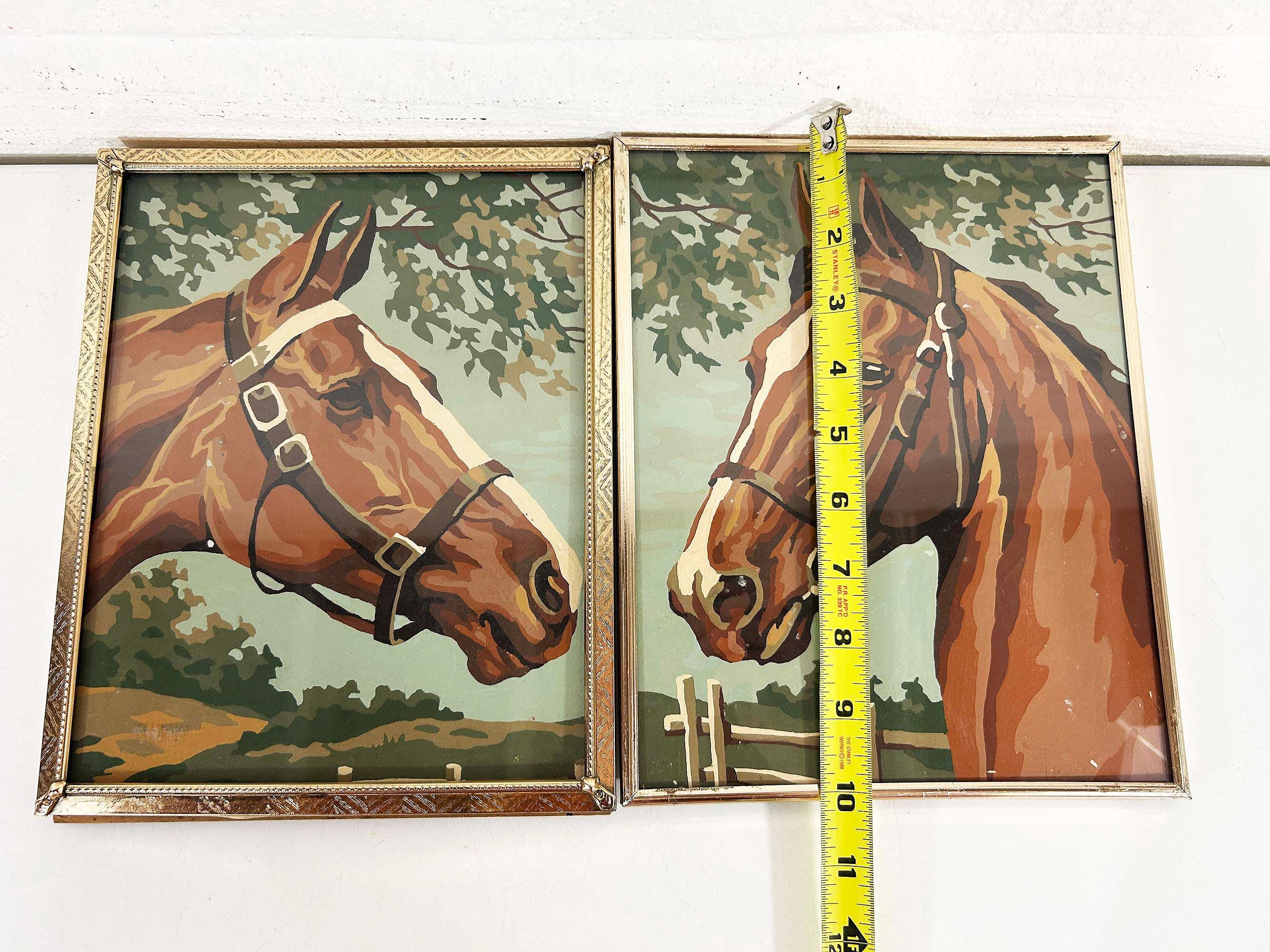 Really lovely pair of framed horse paint by numbers. Each frame is approximately 10 inches tall and 8 inches wide. These are really well done - very clean job by the painter! They are in good vintage condition with some signs on wear on the art and the frames - please be sure to inspect all photos closely. Frames are slightly different styles but the same size.