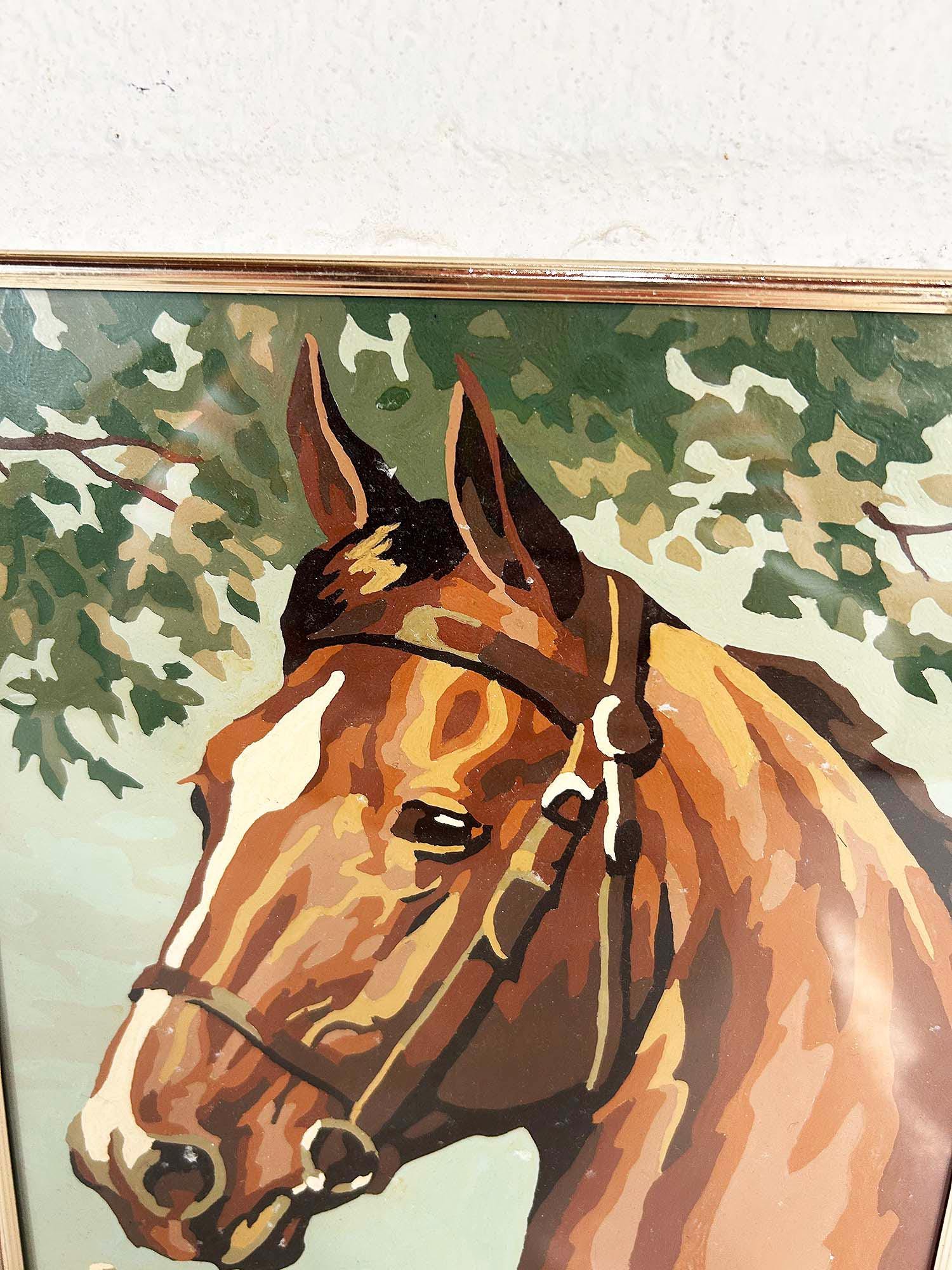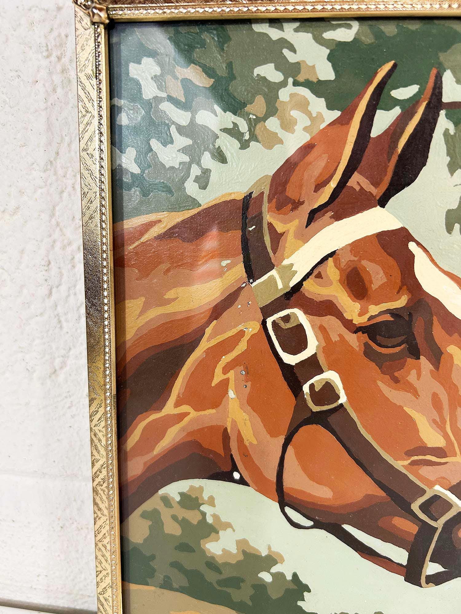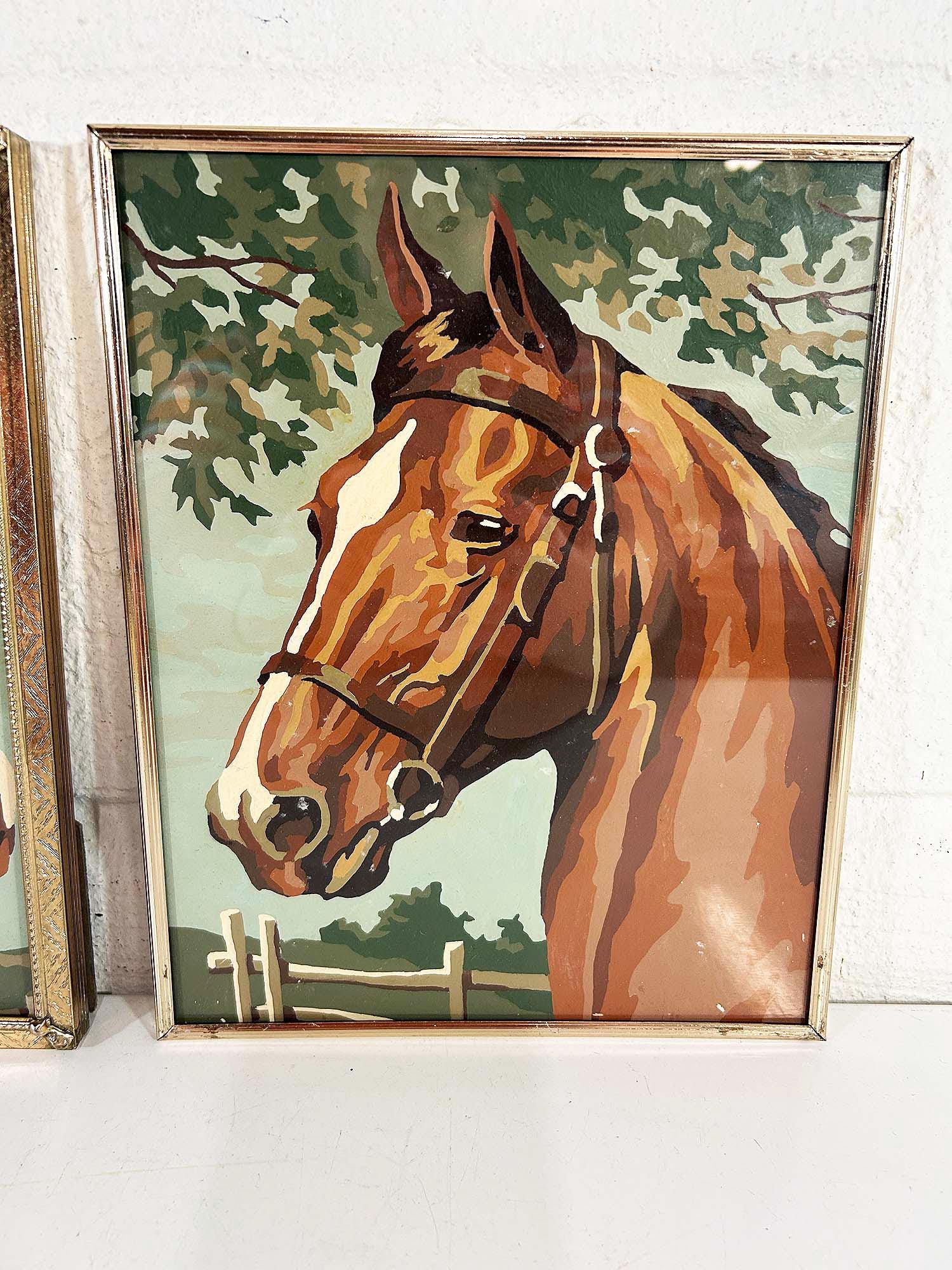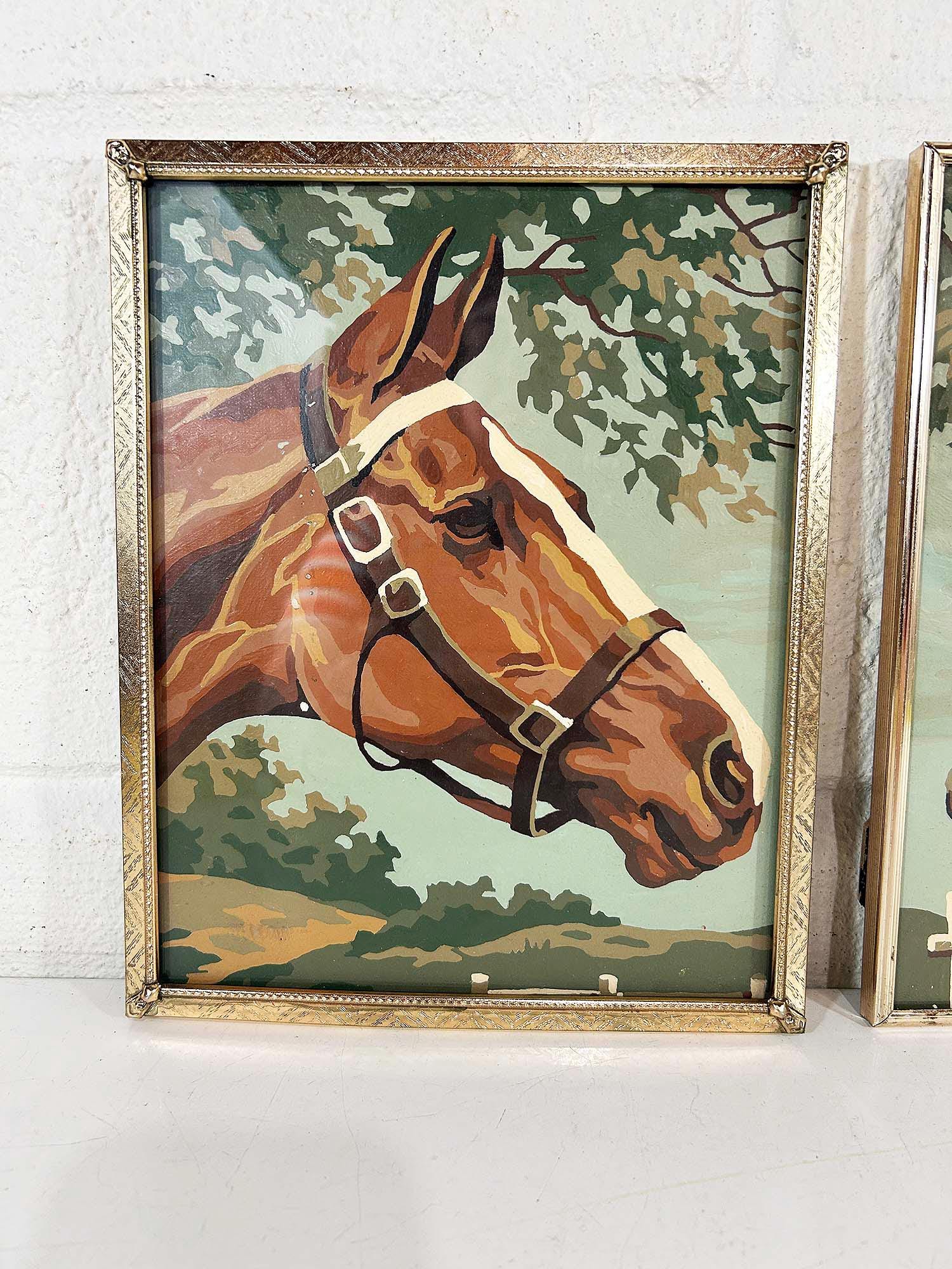 Really lovely pair of framed horse paint by numbers. Each frame is approximately 10 inches tall and 8 inches wide. These are really well done - very clean job by the painter! They are in good vintage condition with some signs on wear on the art and the frames - please be sure to inspect all photos closely. Frames are slightly different styles but the same size.