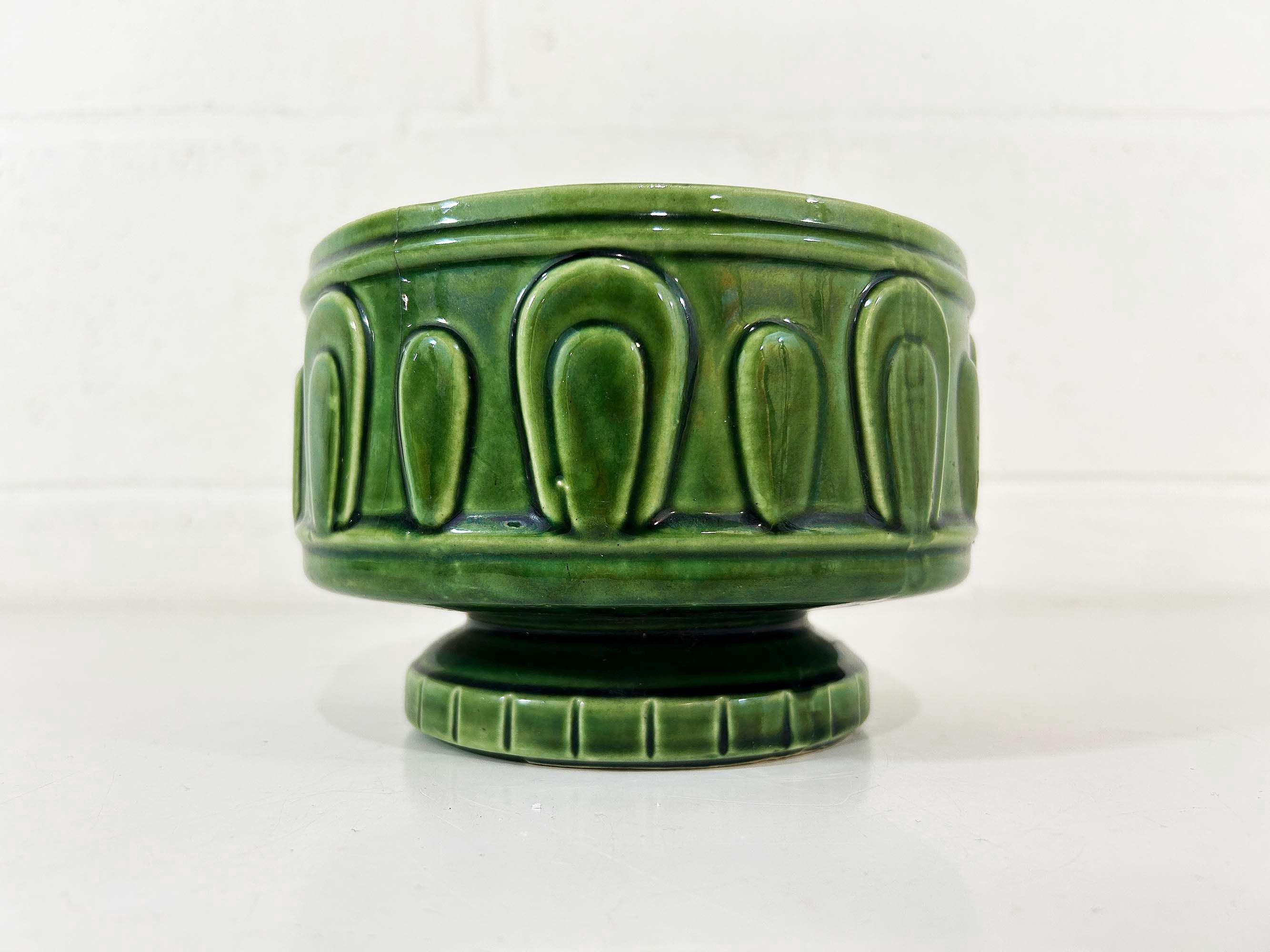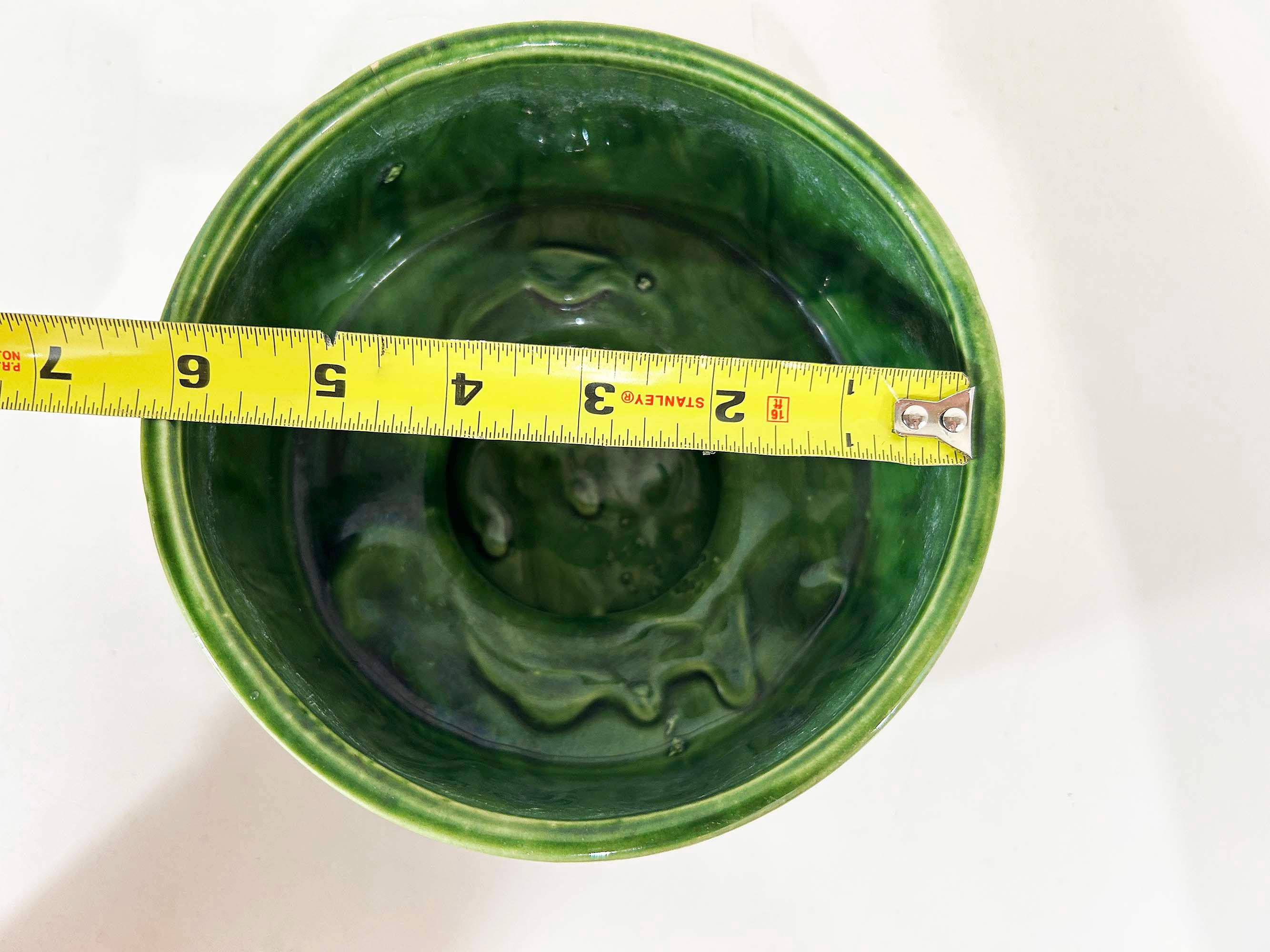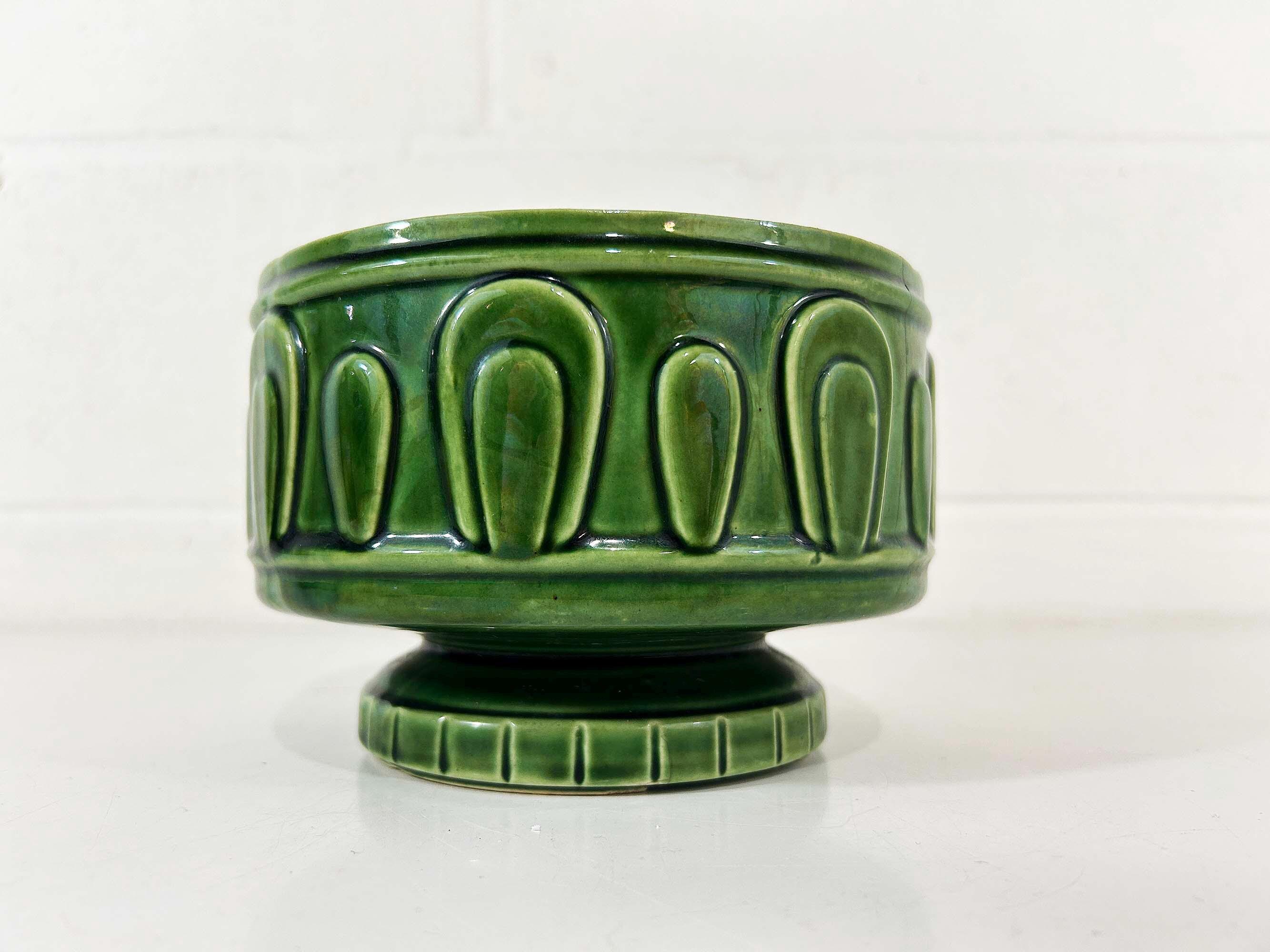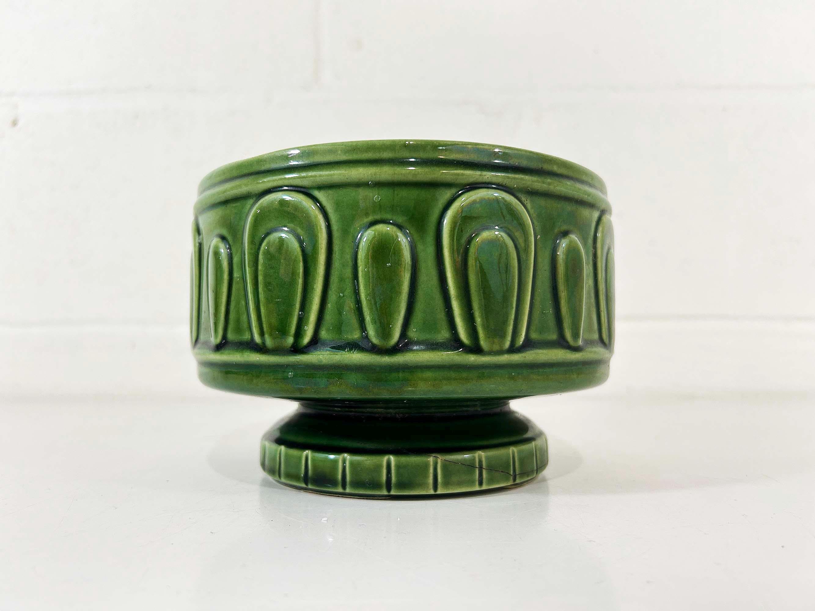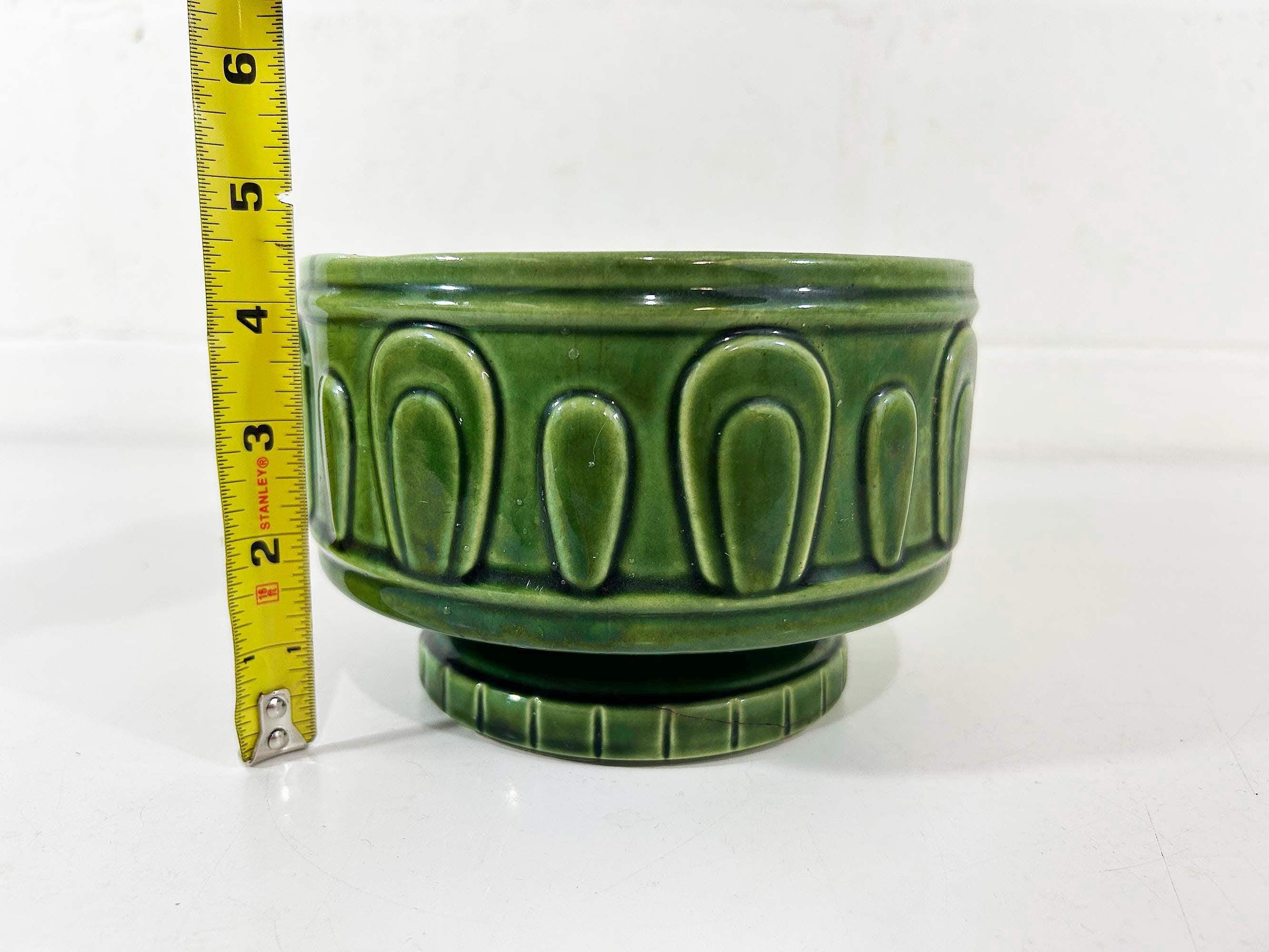 Really lovely deep green pedestal planter for your indoor plants! The pot is in good vintage condition with no significant wear. It has some all over crazing in the glaze. The planter is about 4 1/2 inches tall and 6 inches in diameter.