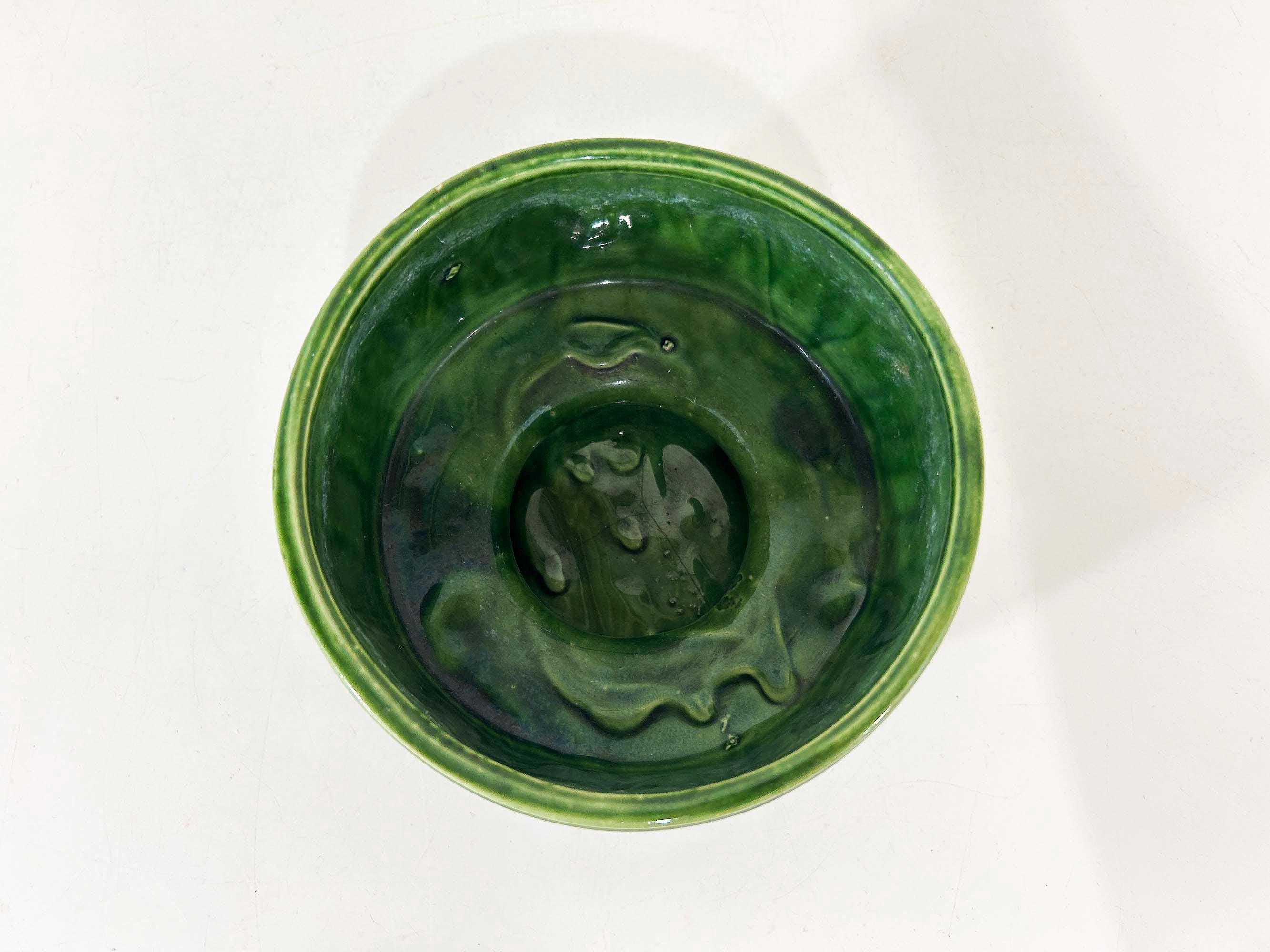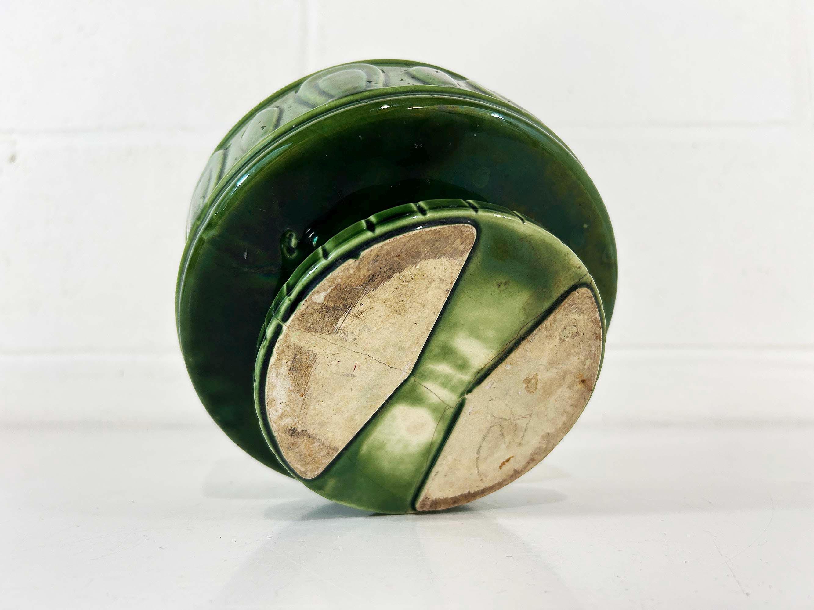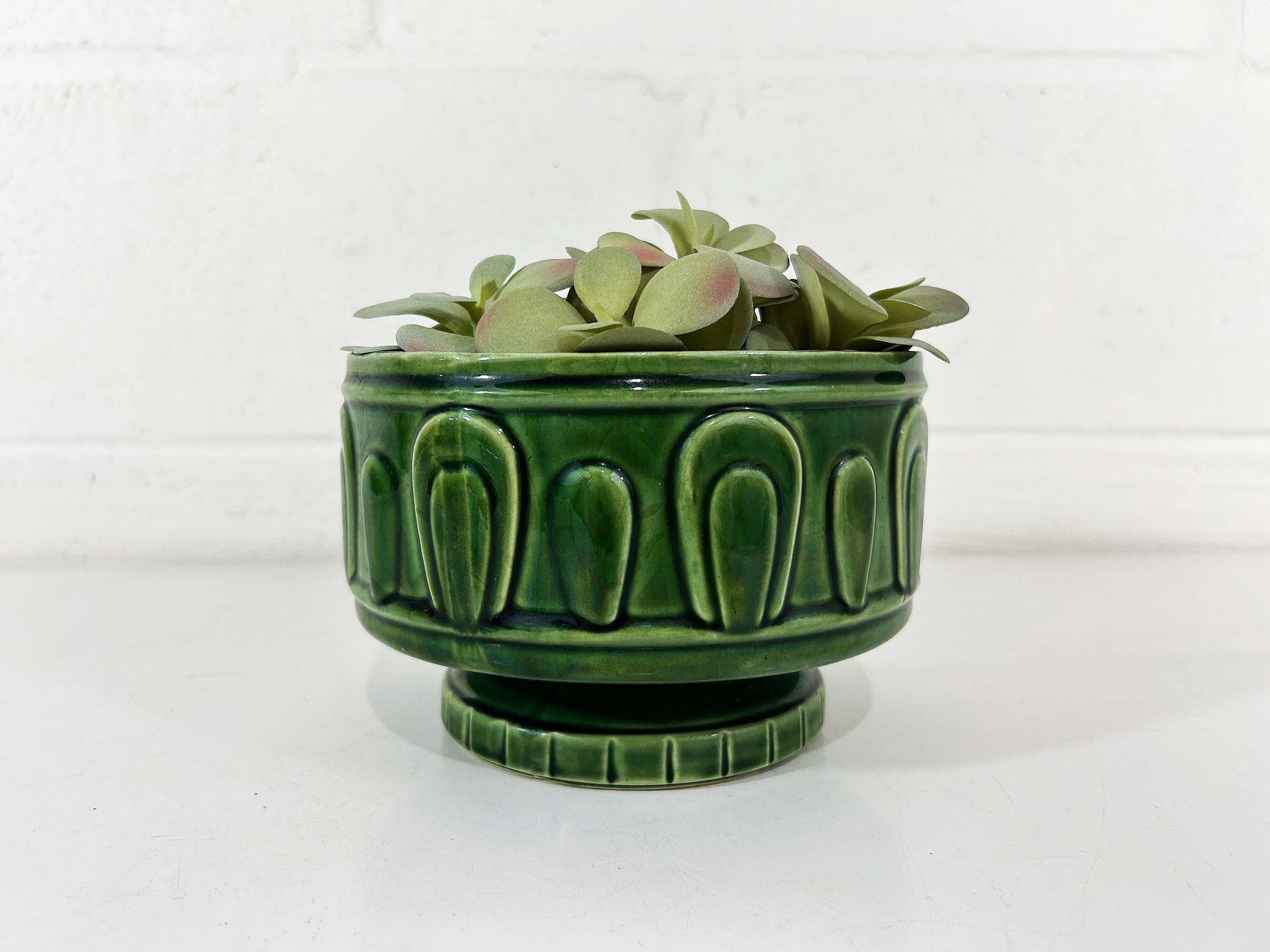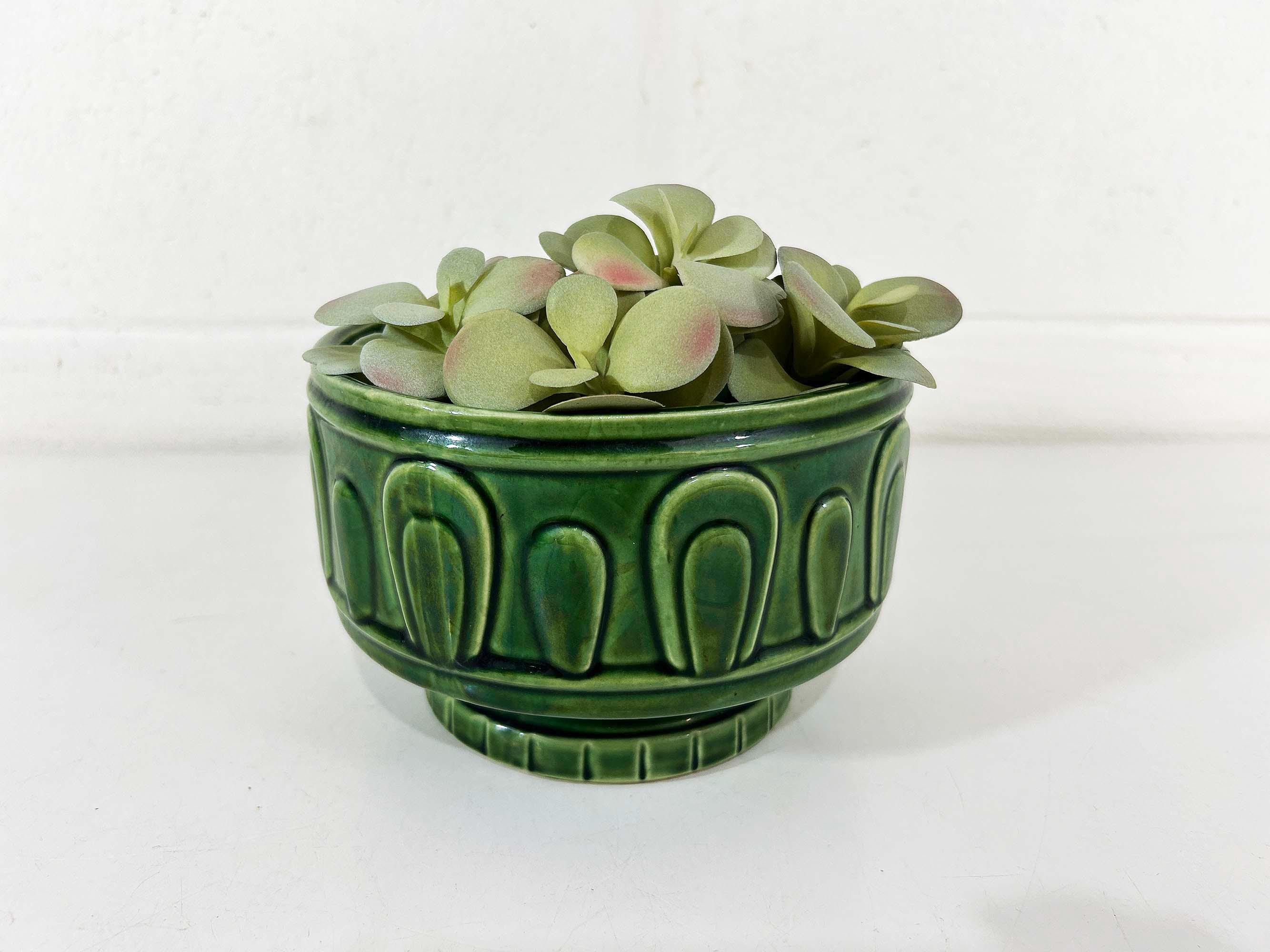Really lovely deep green pedestal planter for your indoor plants! The pot is in good vintage condition with no significant wear. It has some all over crazing in the glaze. The planter is about 4 1/2 inches tall and 6 inches in diameter.