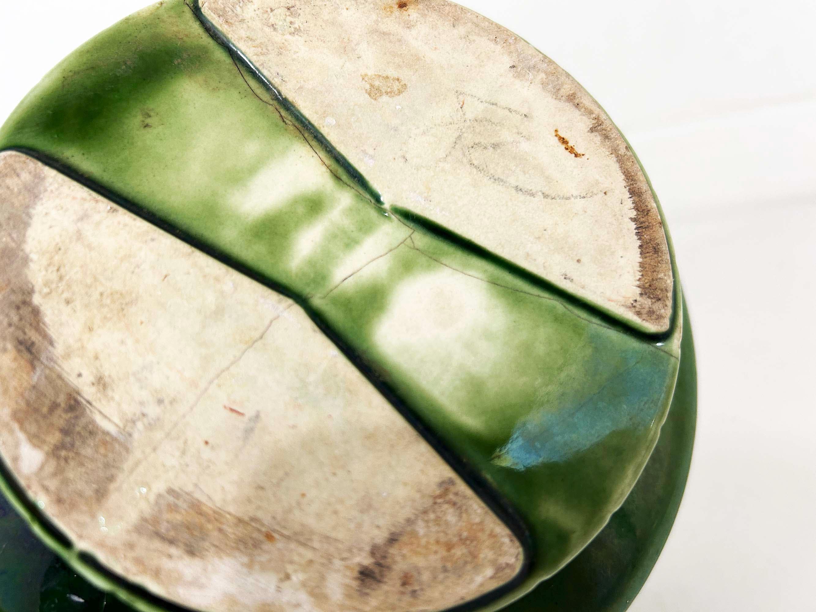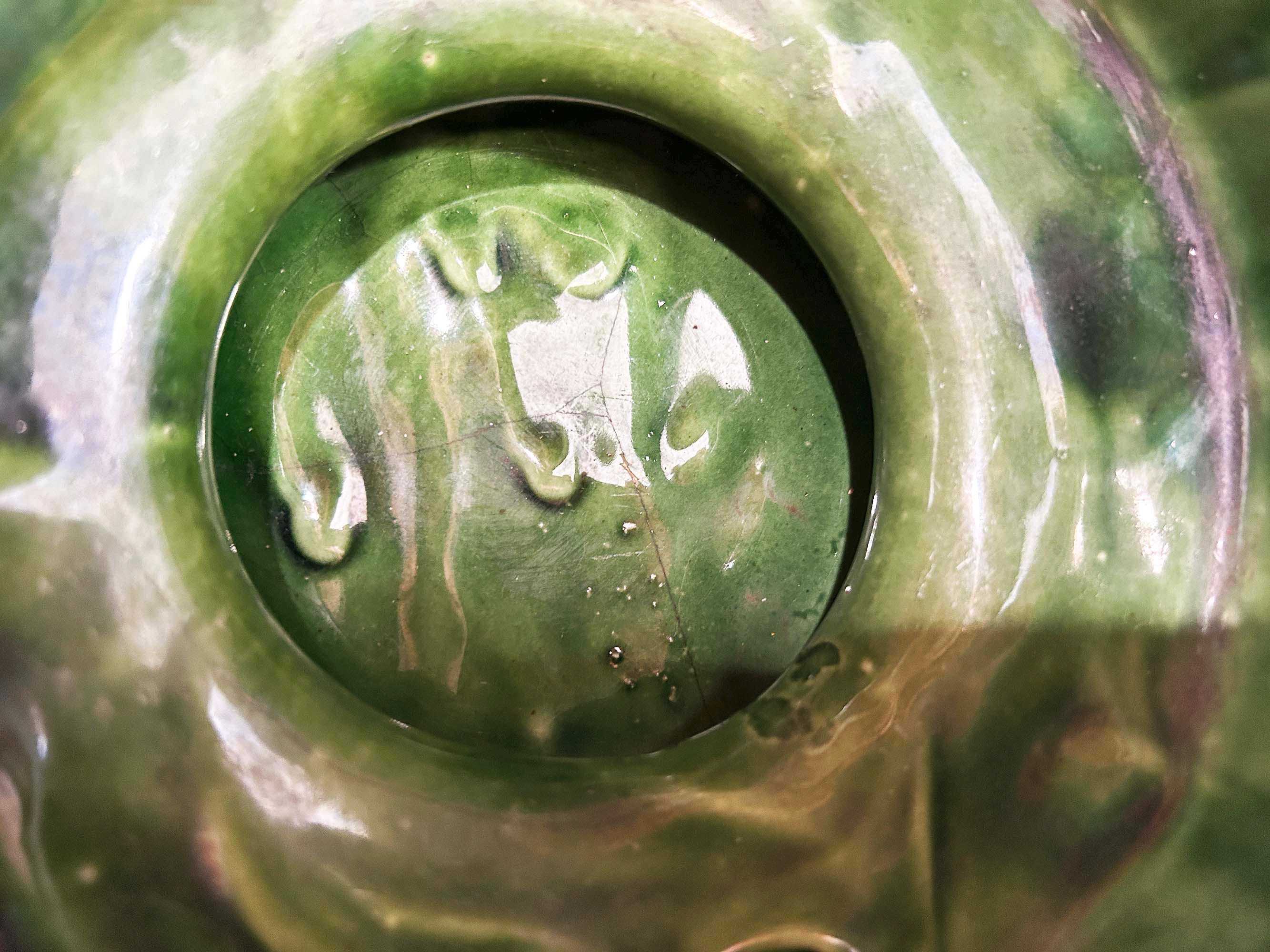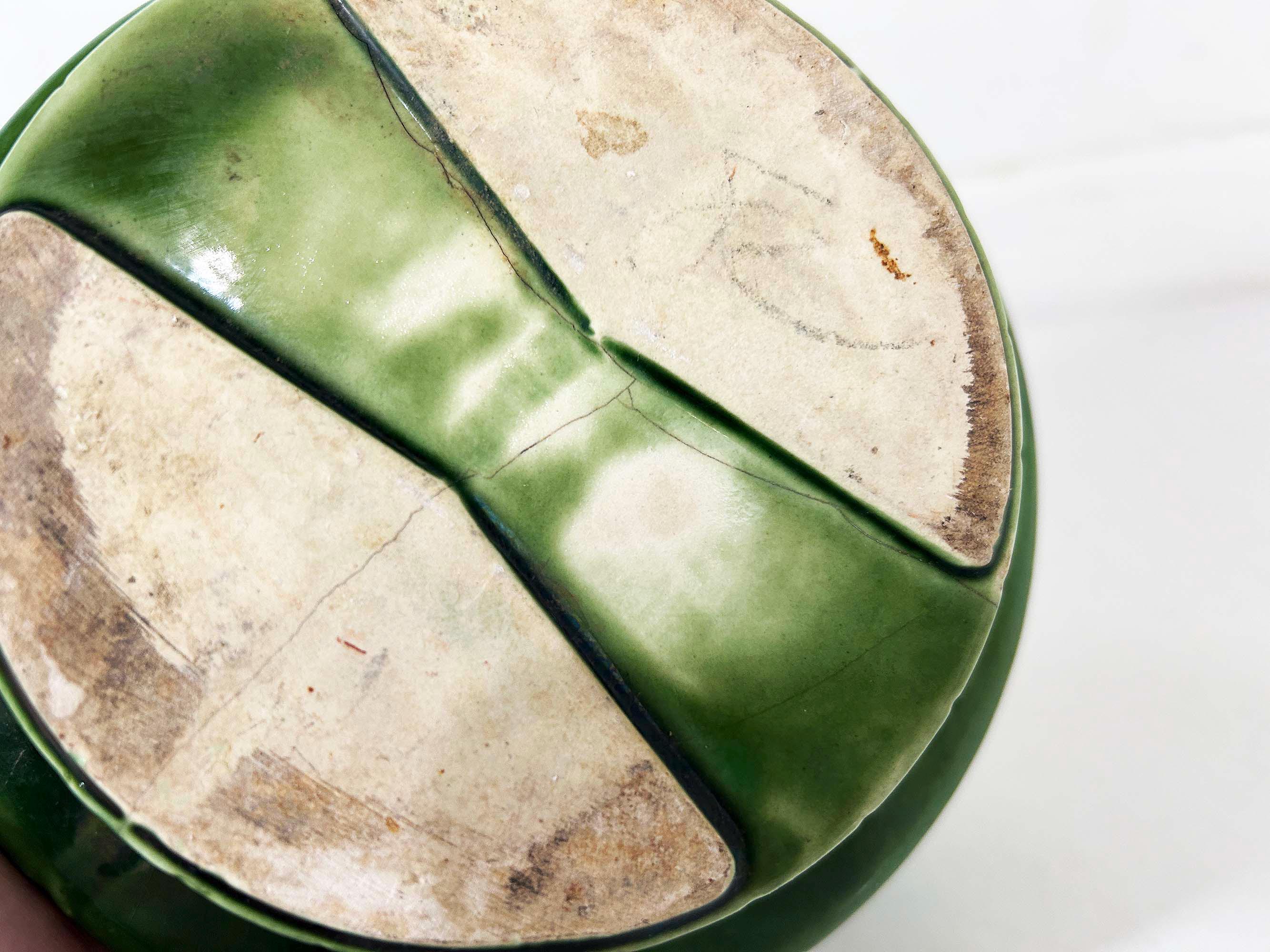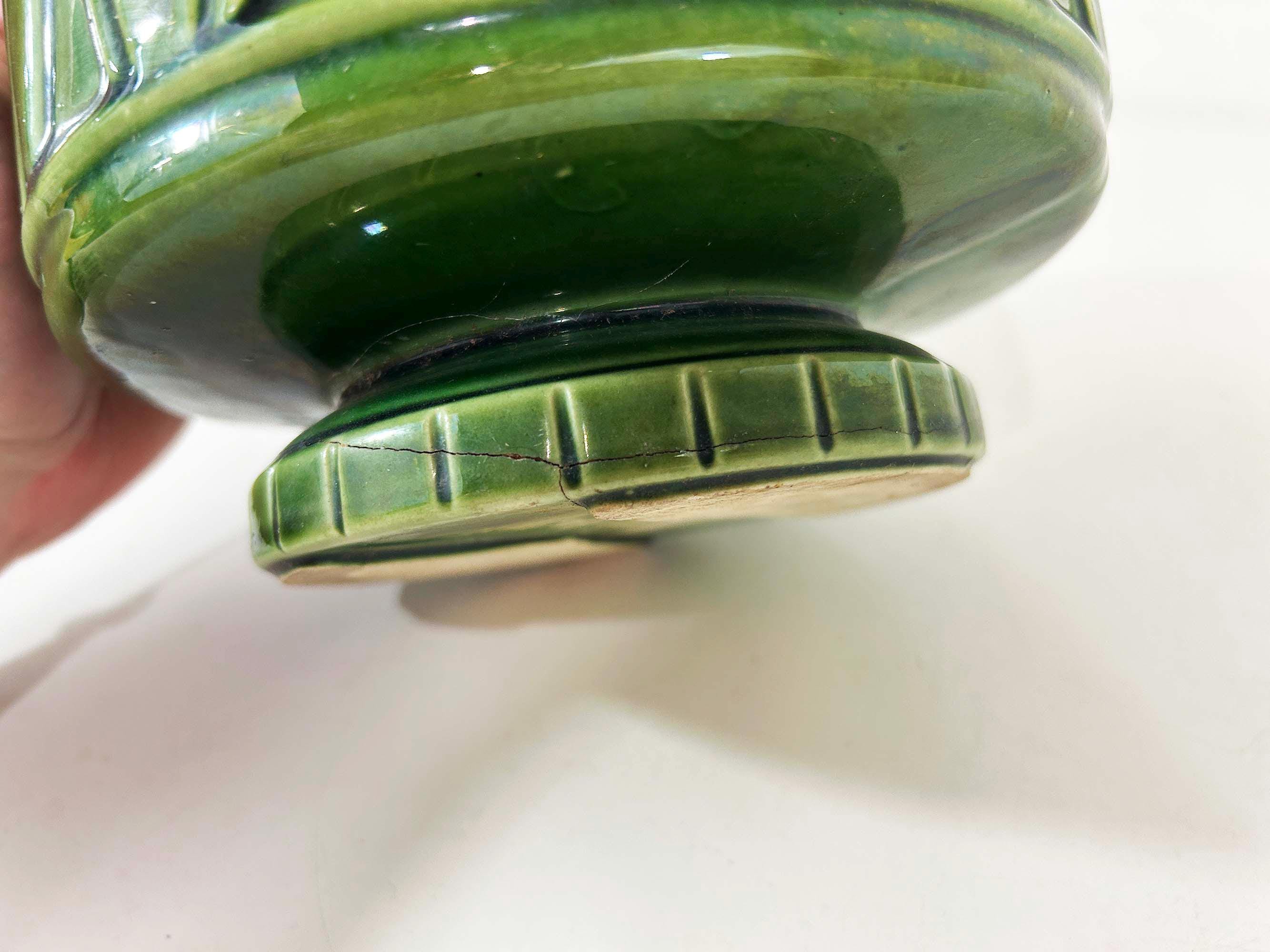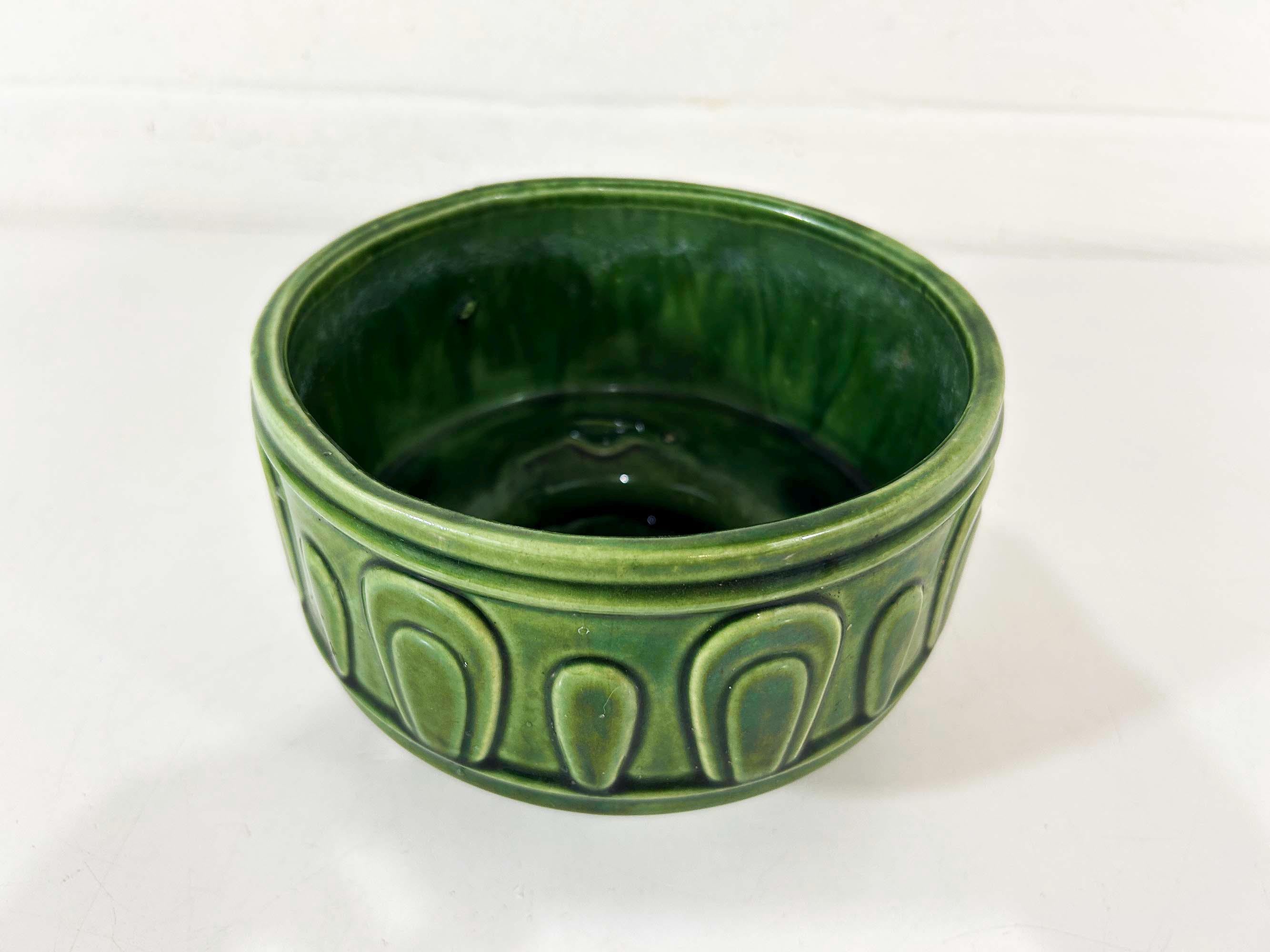 Really lovely deep green pedestal planter for your indoor plants! The pot is in good vintage condition with no significant wear. It has some all over crazing in the glaze. The planter is about 4 1/2 inches tall and 6 inches in diameter.