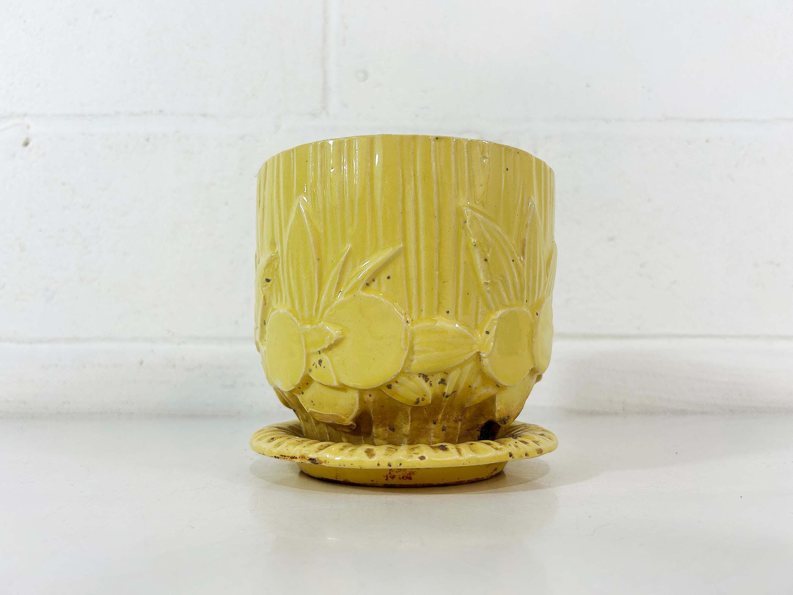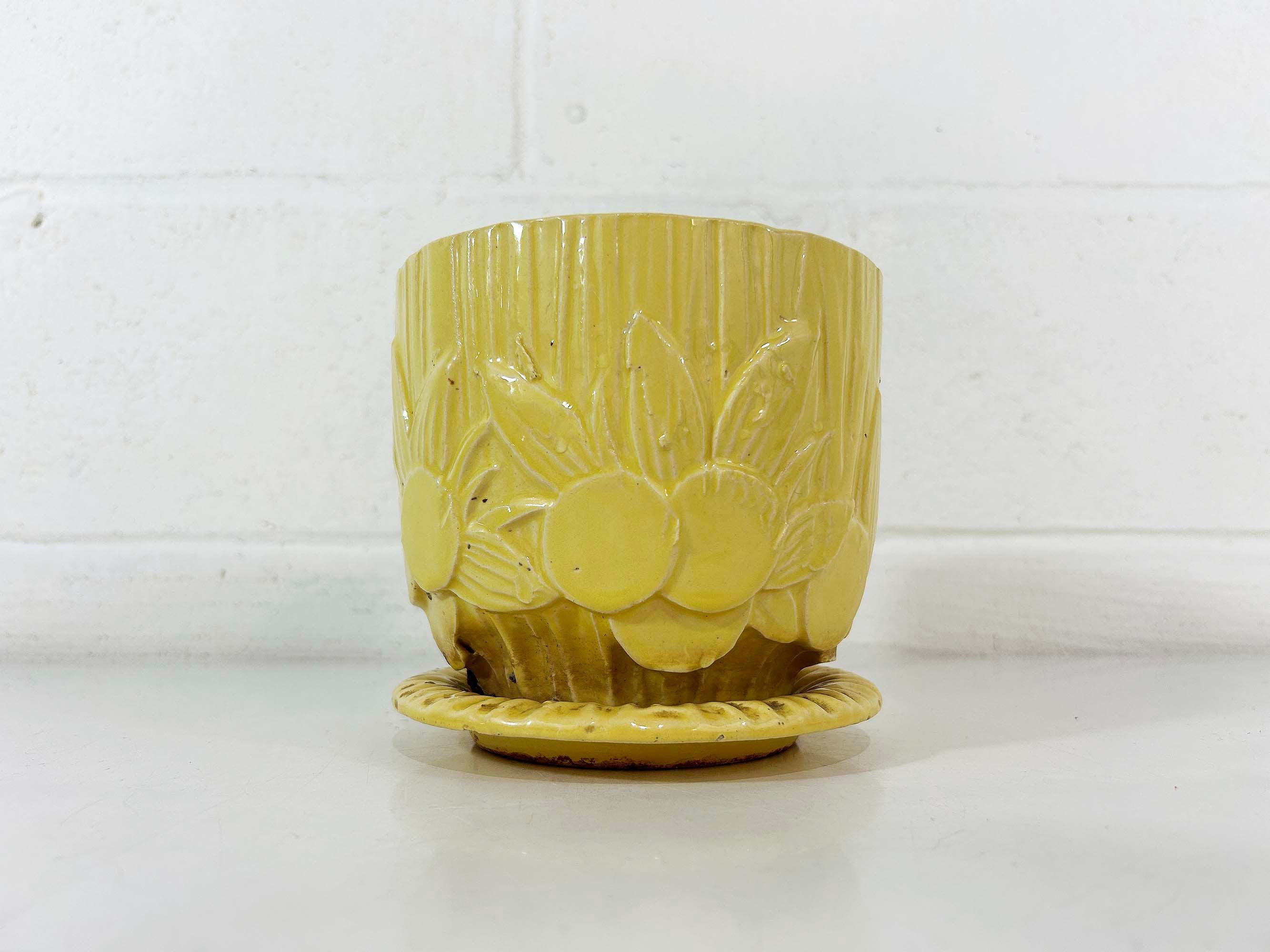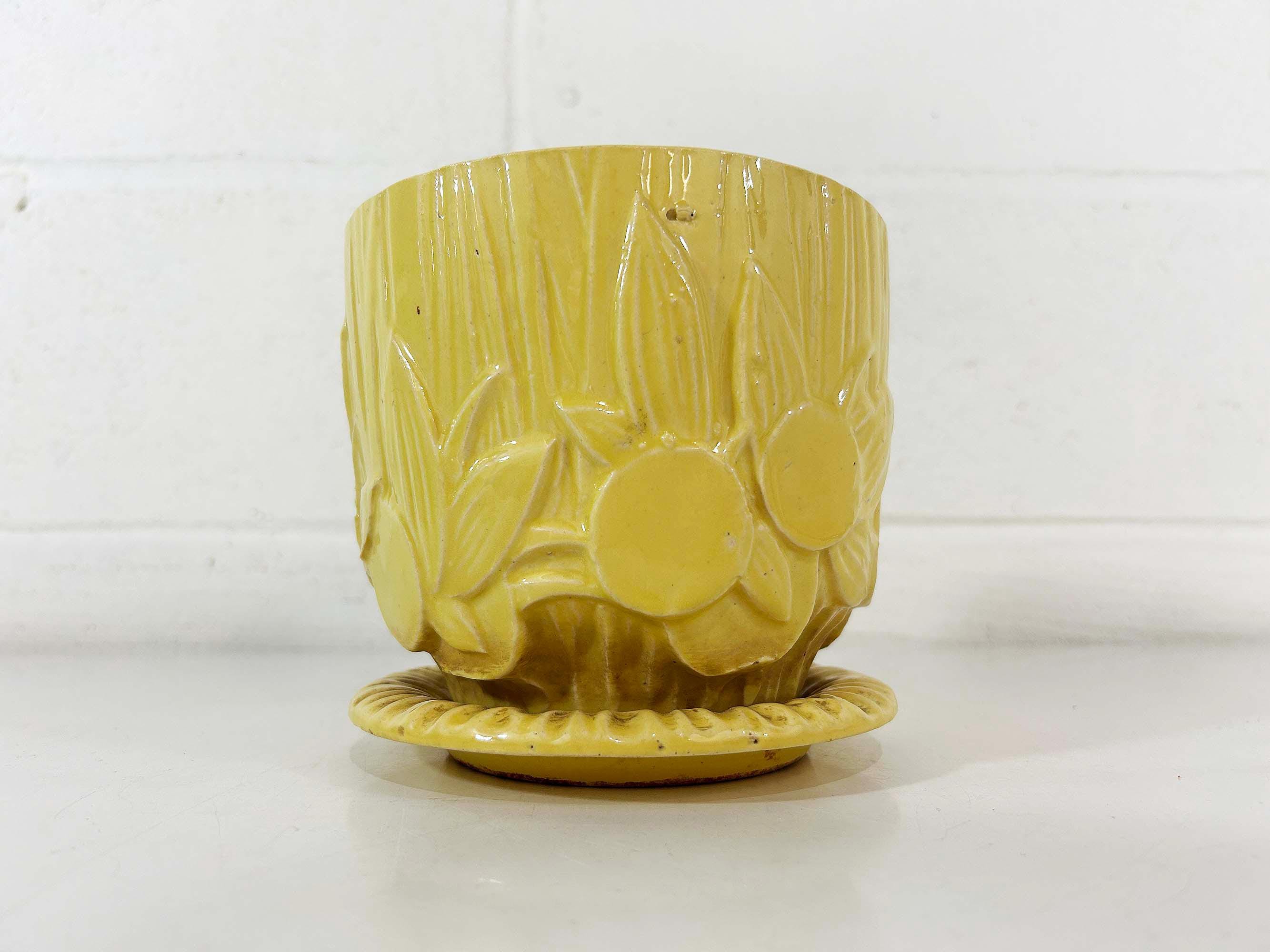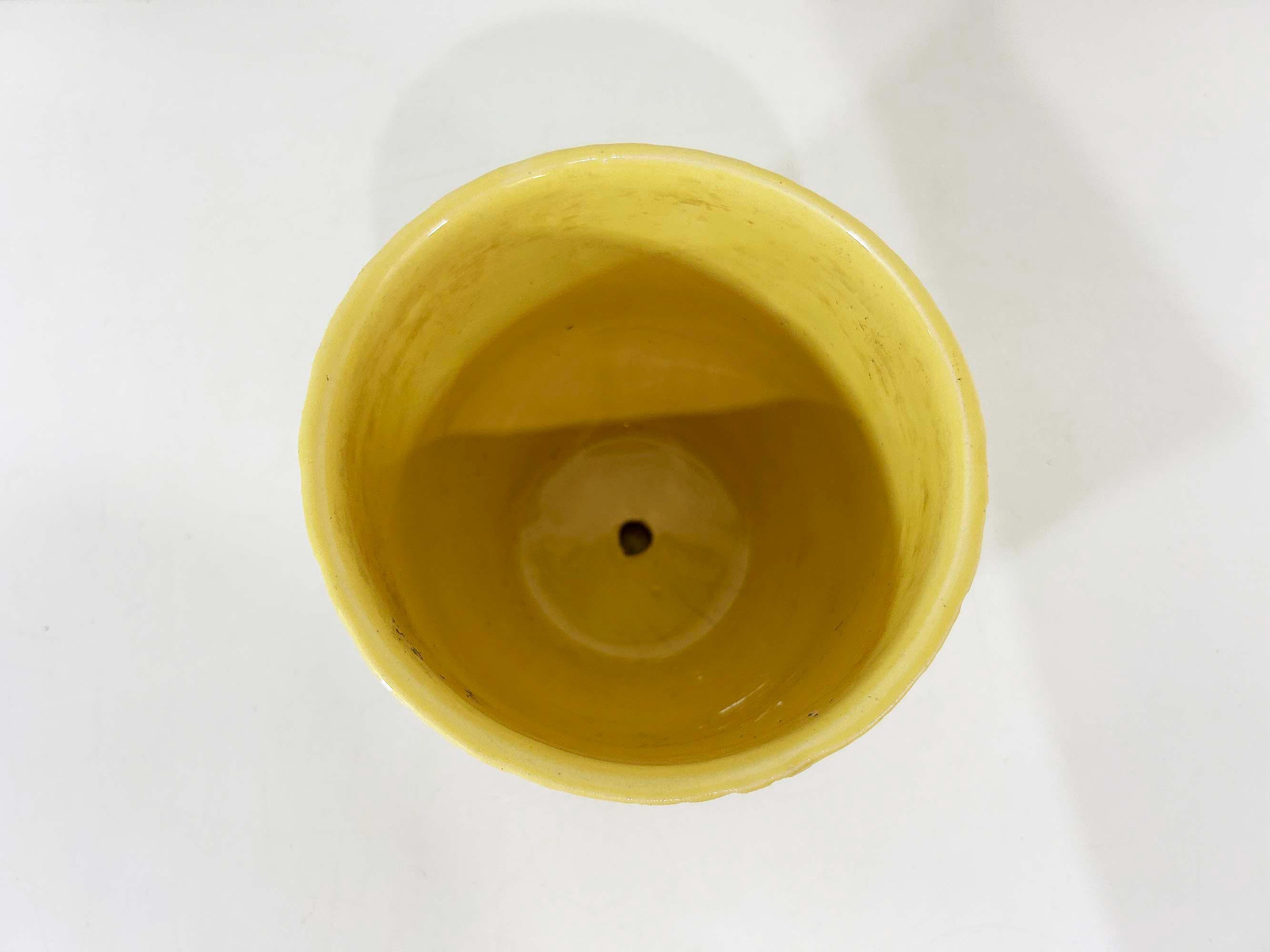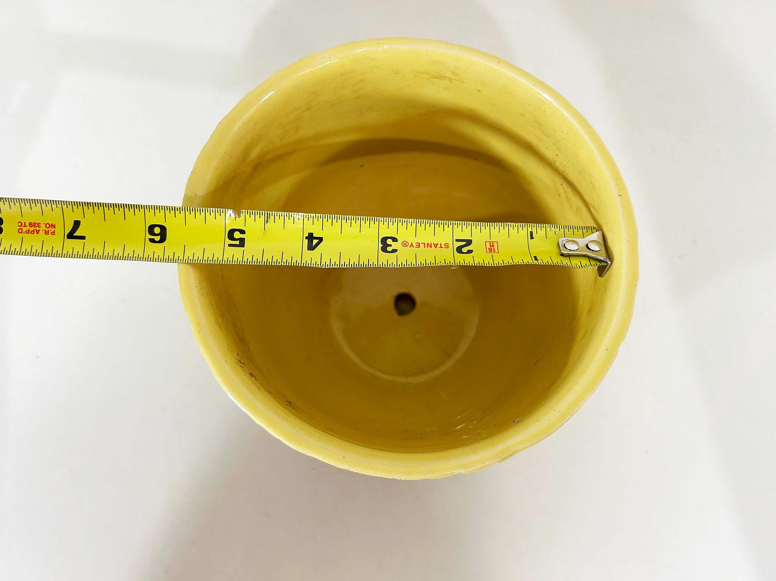 Really lovely sunshine yellow planter for your plants! It would look great holding a plant in your home or on your porch. The pot is in fair vintage condition - there is some all over staining from prior use and the glaze has a bit of crazing. The planter is about 5 1/2 inches tall and 5 1/2 inches in diameter across the top.