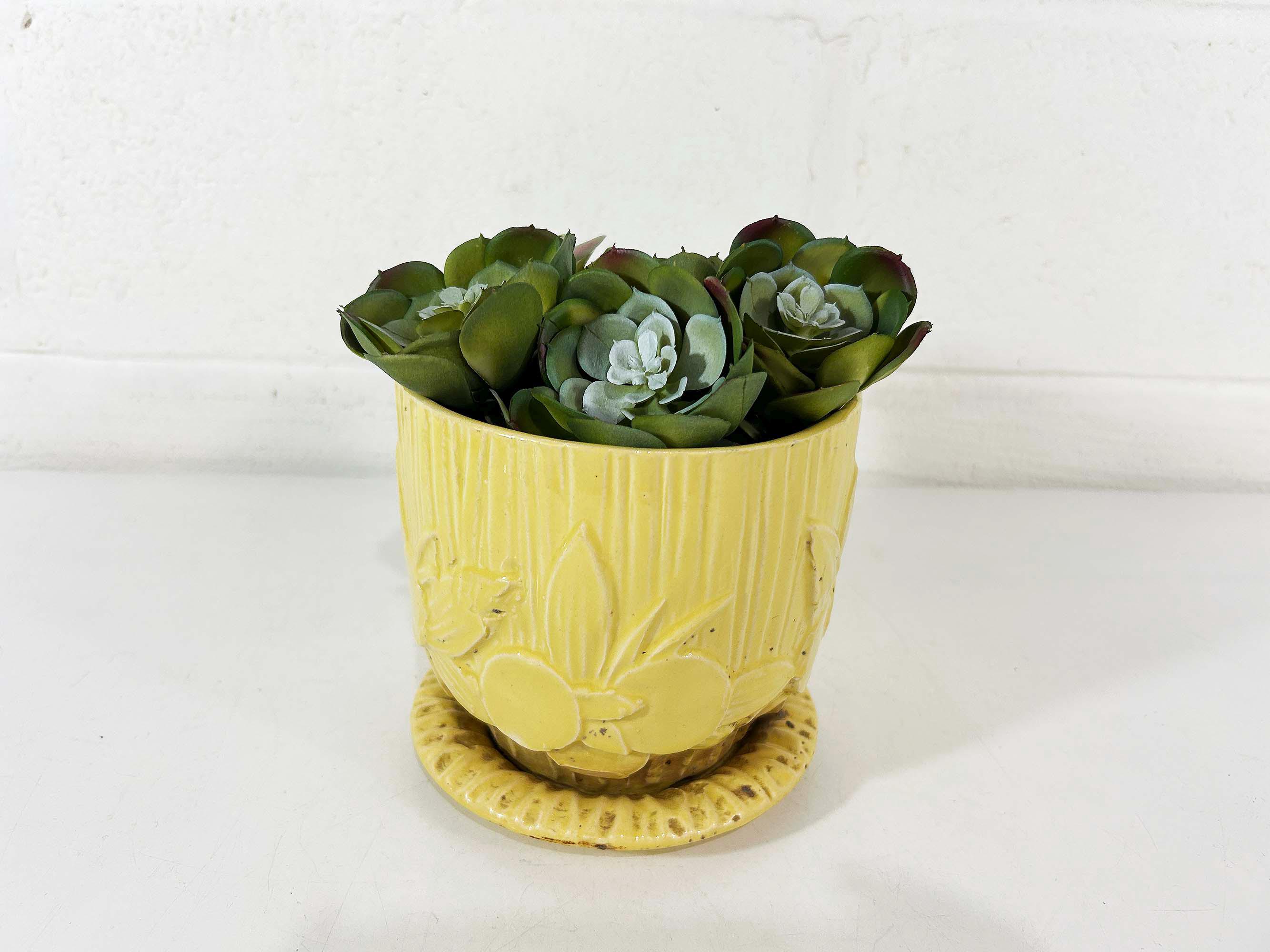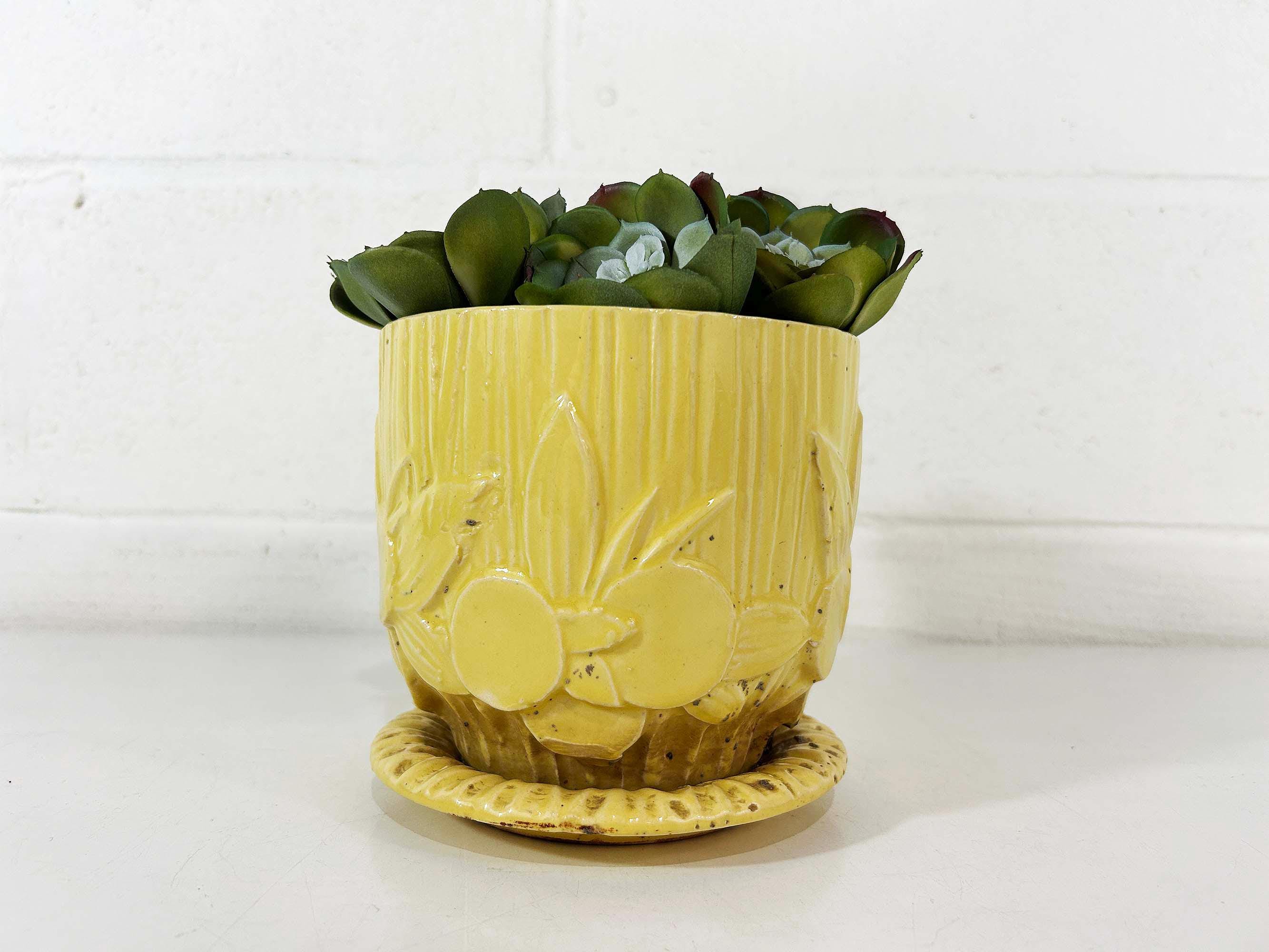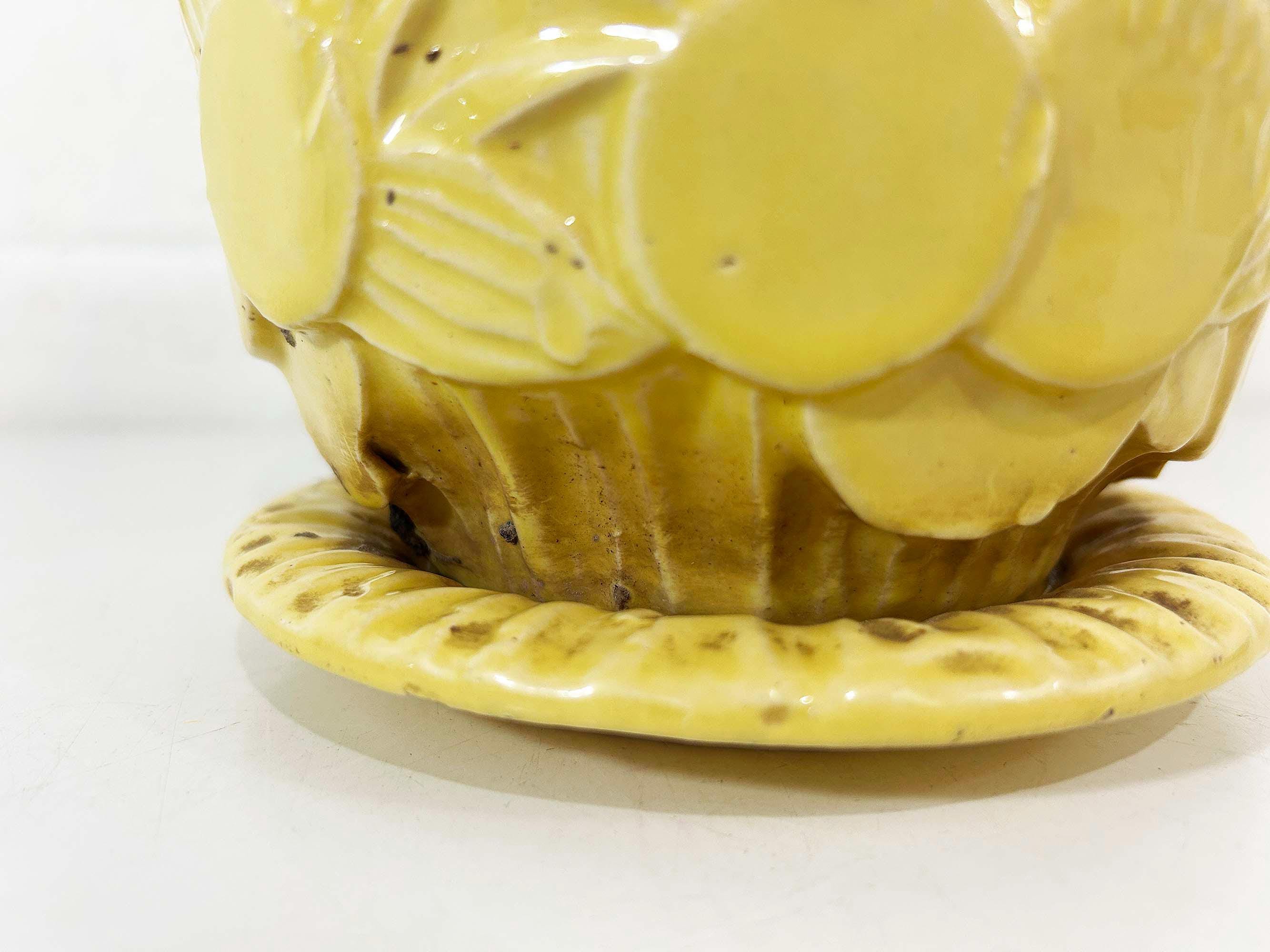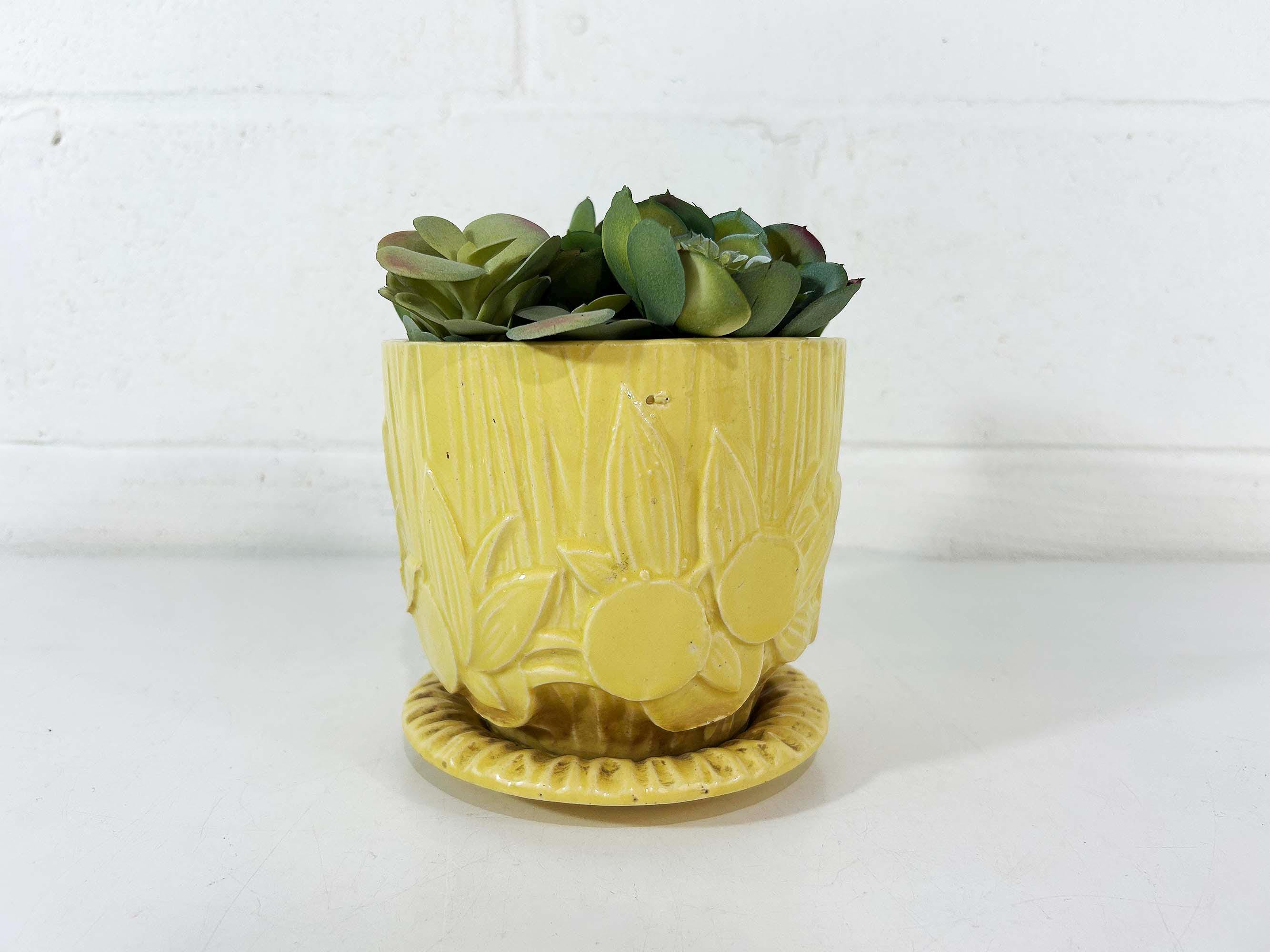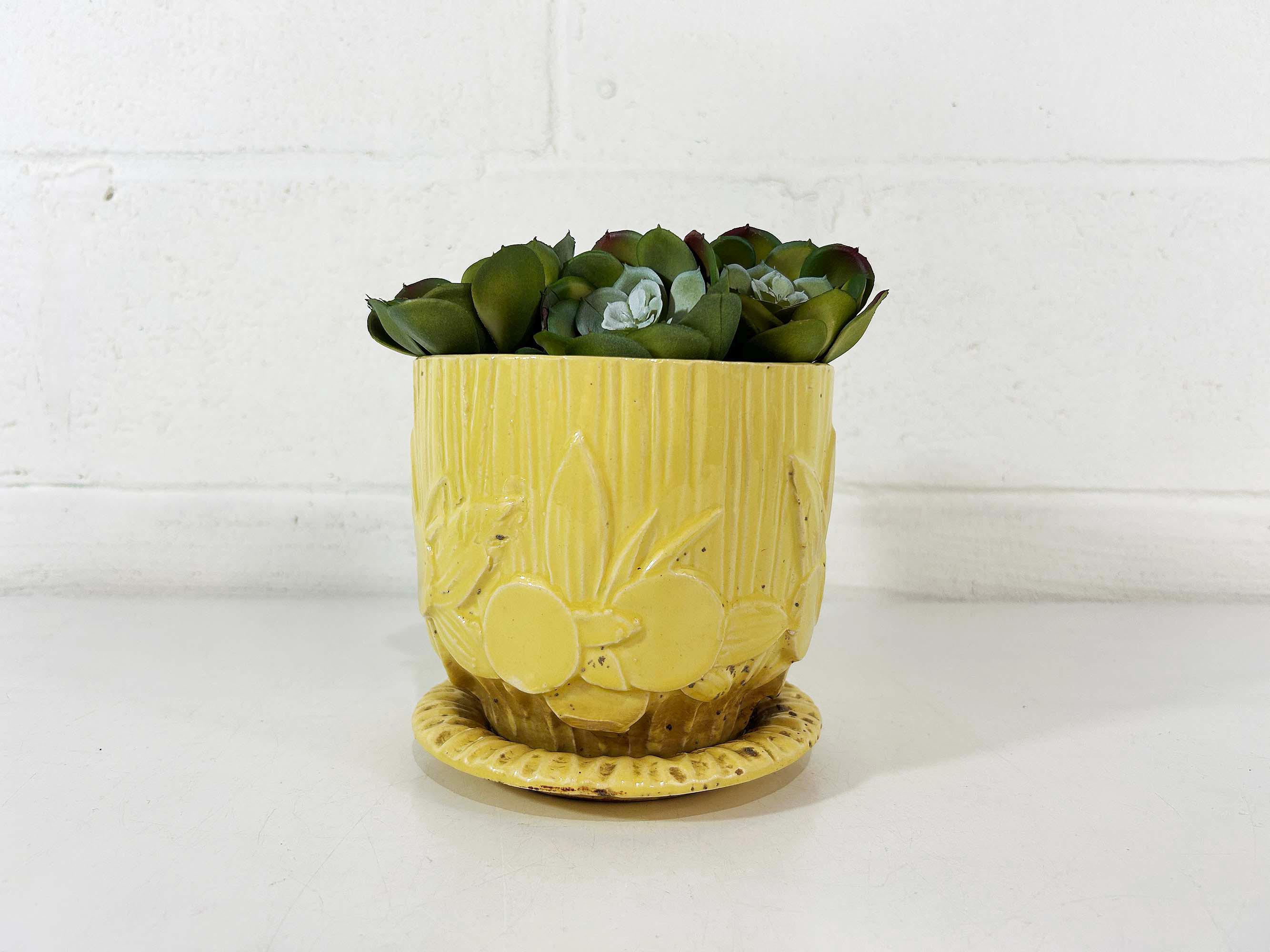 Really lovely sunshine yellow planter for your plants! It would look great holding a plant in your home or on your porch. The pot is in fair vintage condition - there is some all over staining from prior use and the glaze has a bit of crazing. The planter is about 5 1/2 inches tall and 5 1/2 inches in diameter across the top.