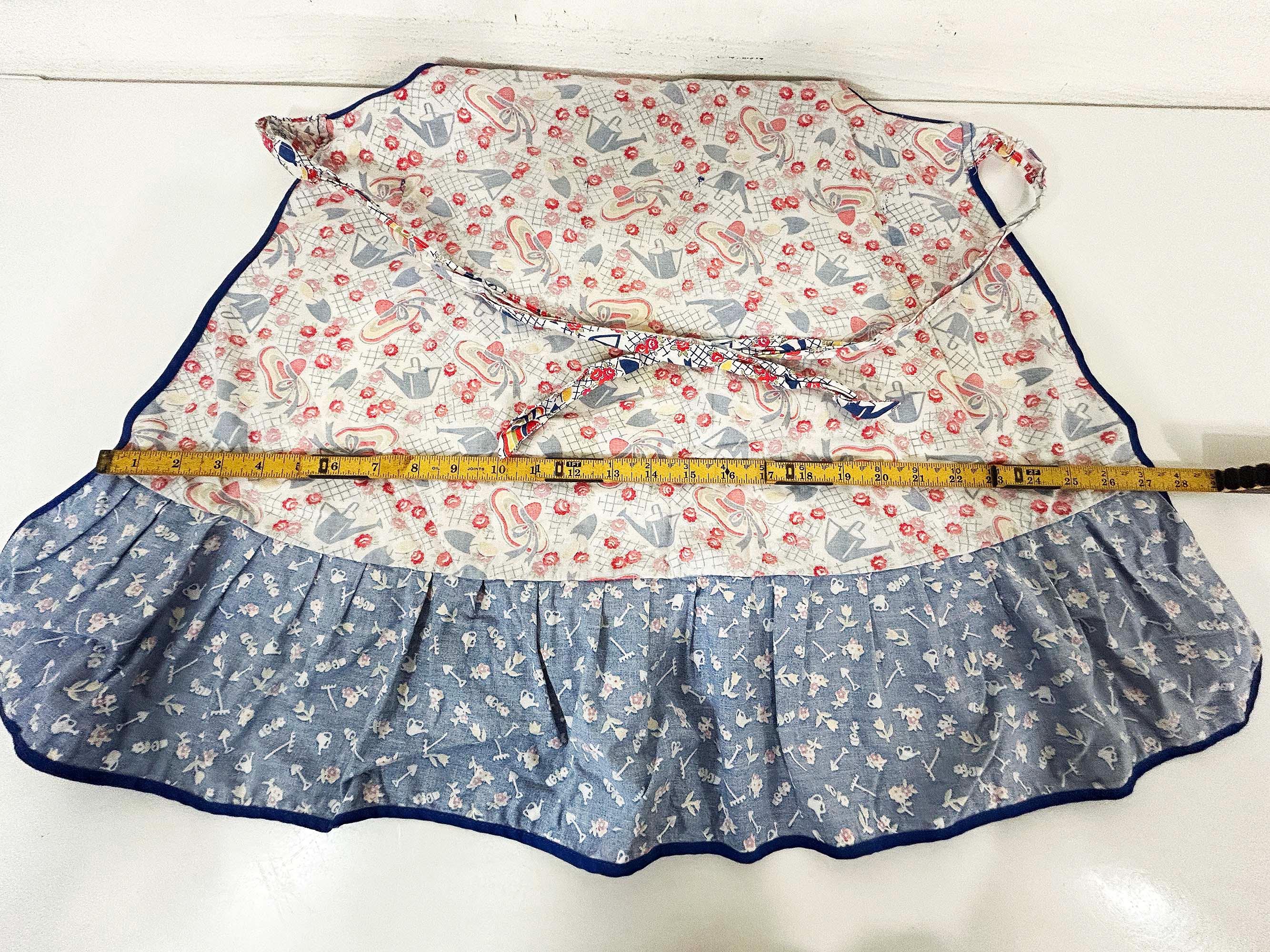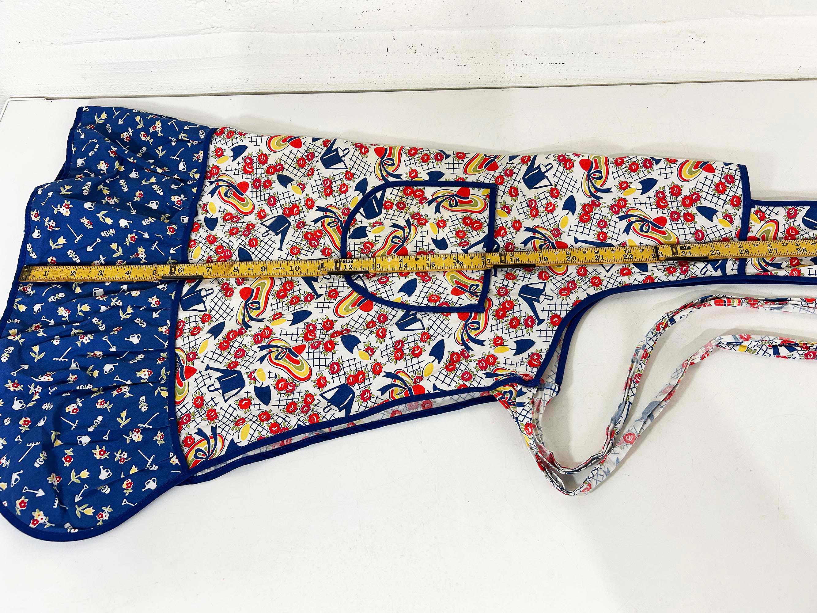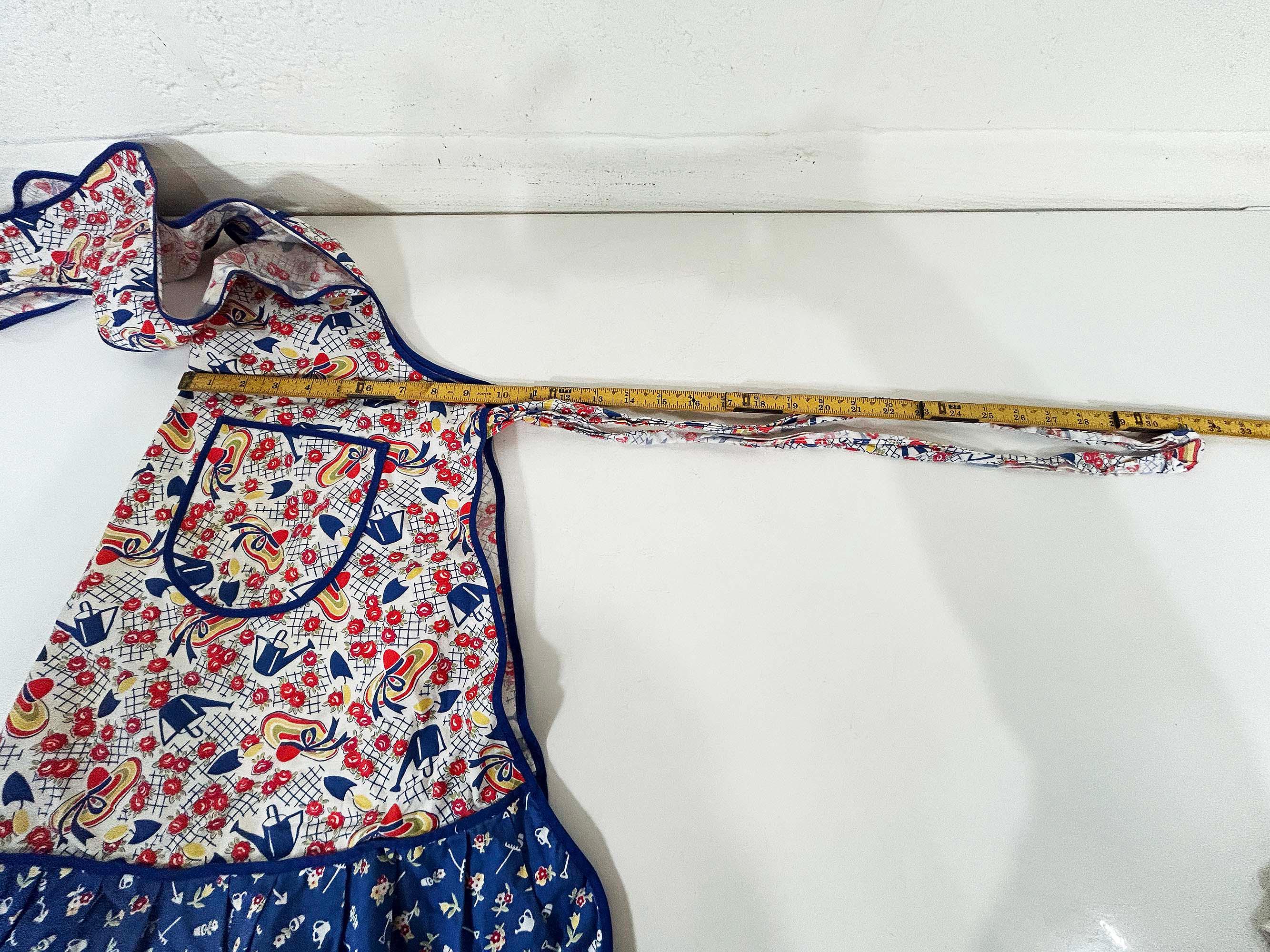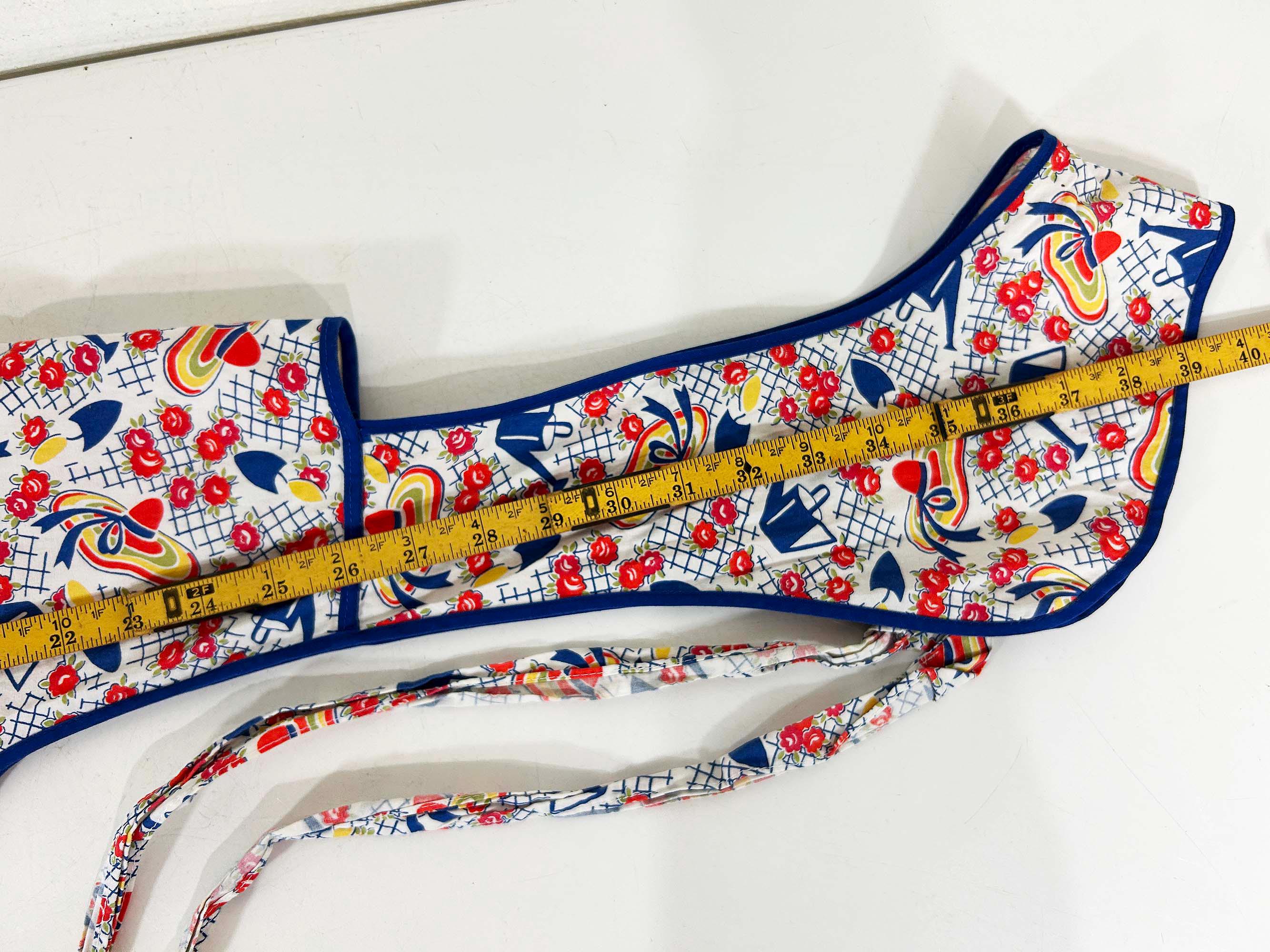 This lovely cotton apron has a cute retro print! Measures approximately 26 inches long and 27 inches wide at the bottom hem. The tie belt is 62 inches from end to end. It is in good vintage condition with some wear on the print and the ties.