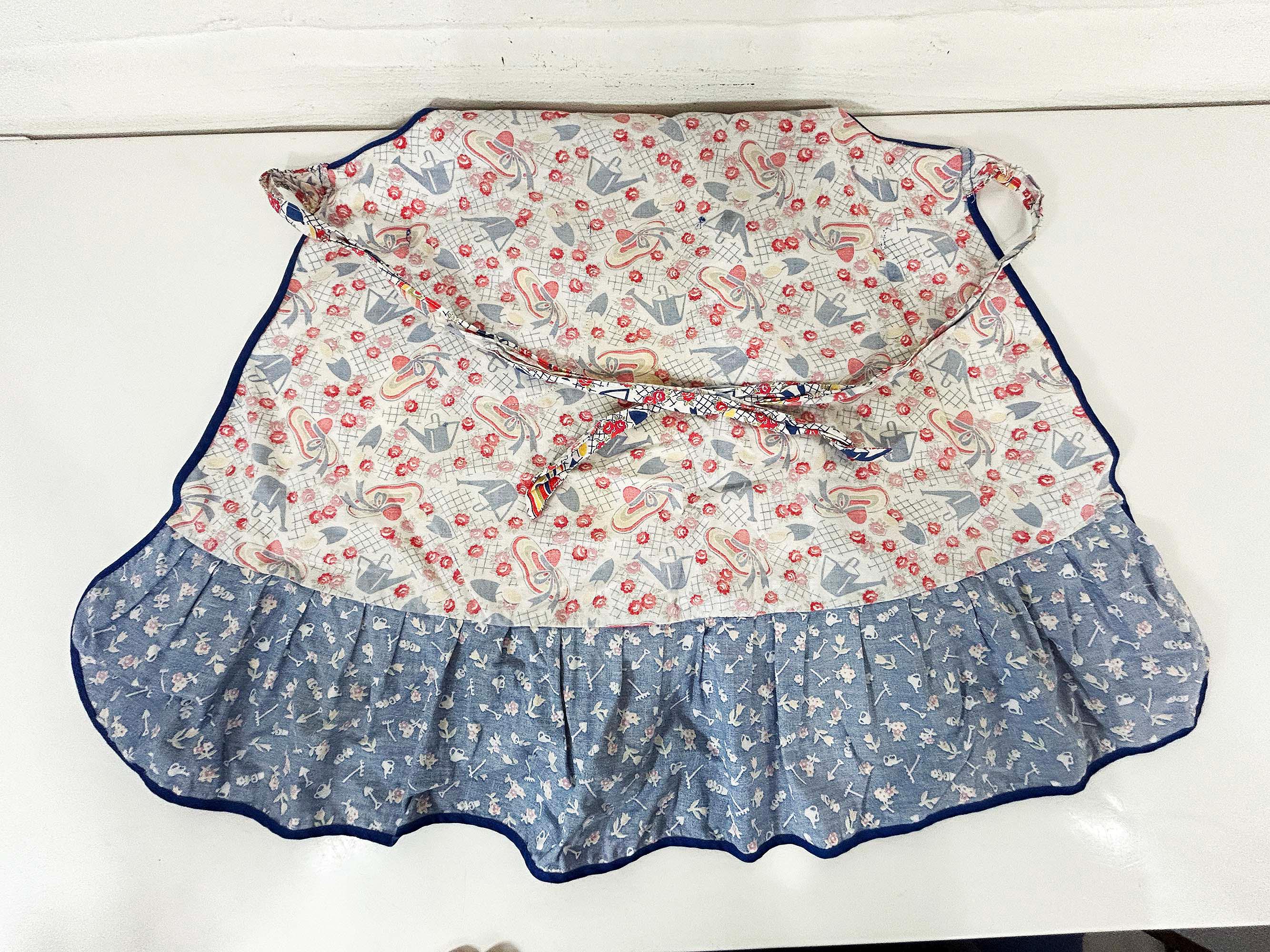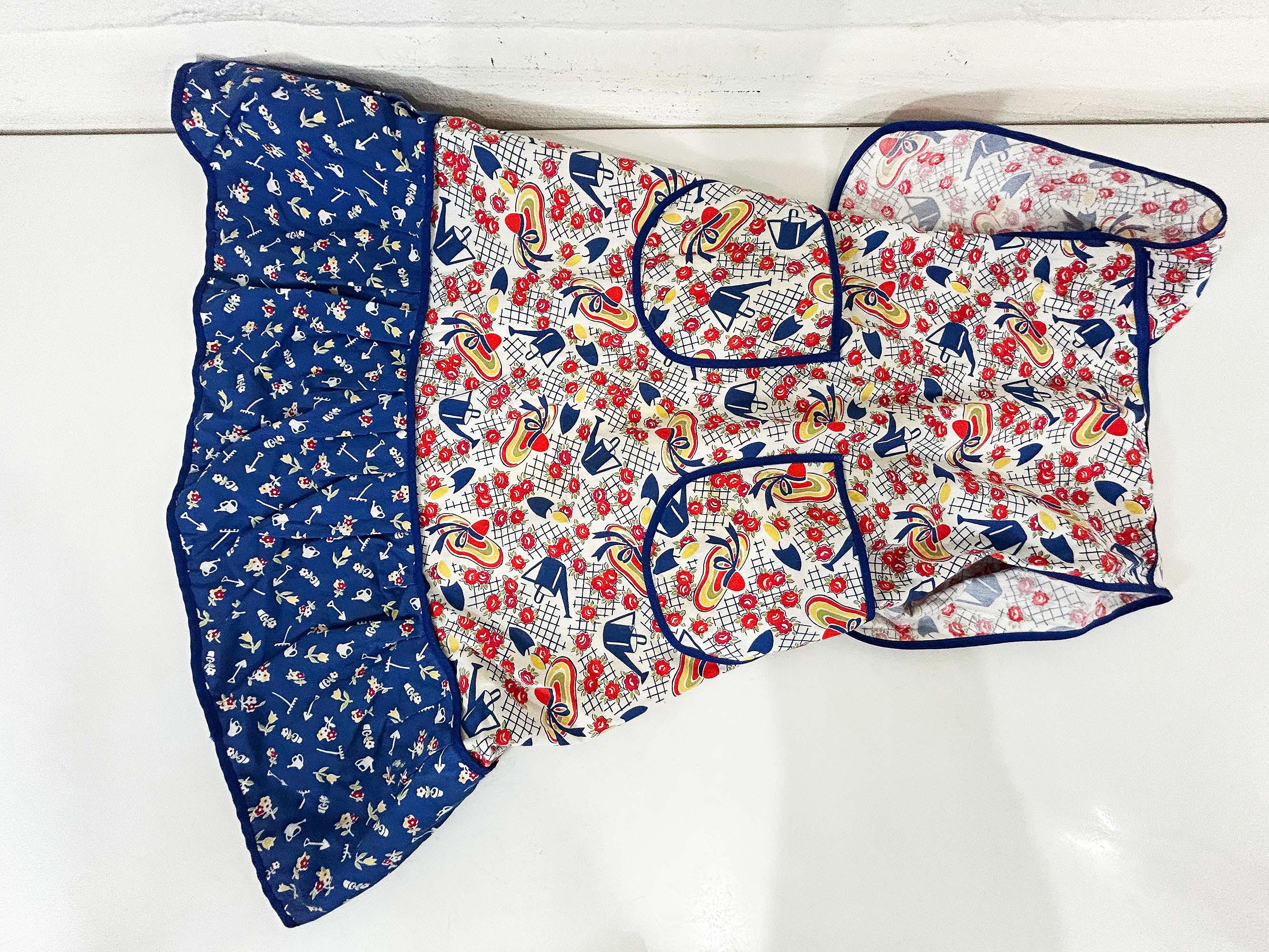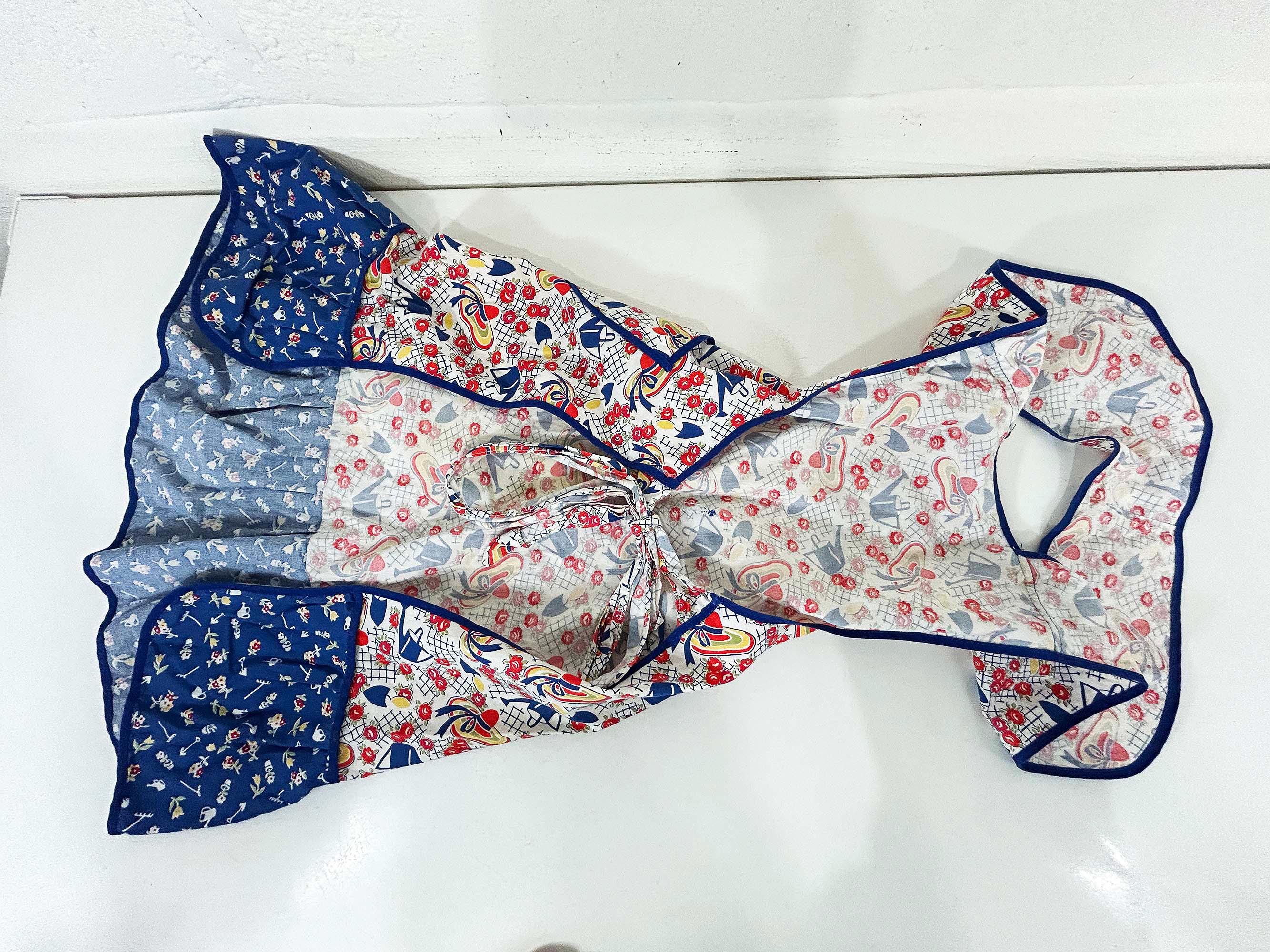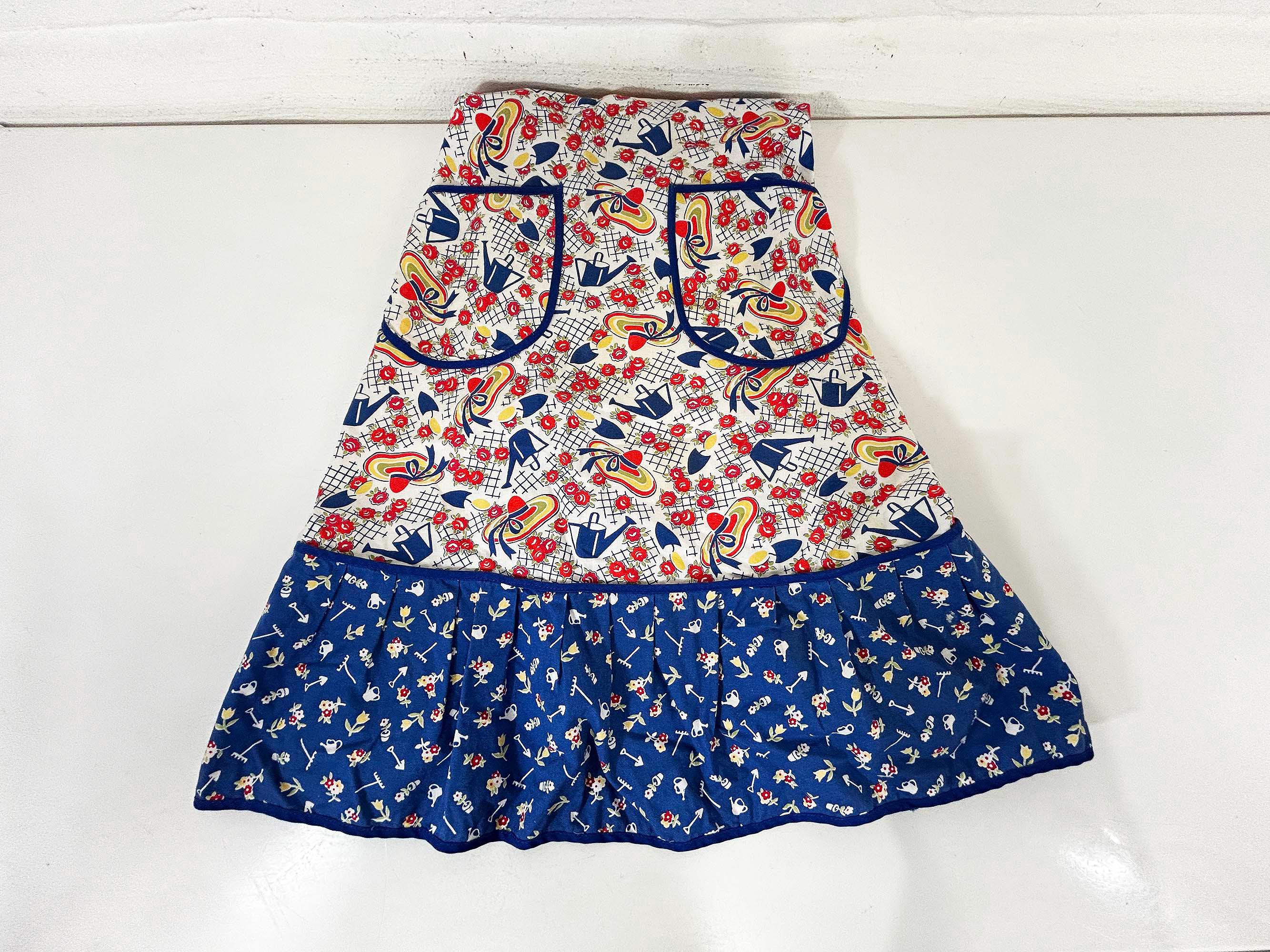 This lovely cotton apron has a cute retro print! Measures approximately 26 inches long and 27 inches wide at the bottom hem. The tie belt is 62 inches from end to end. It is in good vintage condition with some wear on the print and the ties.