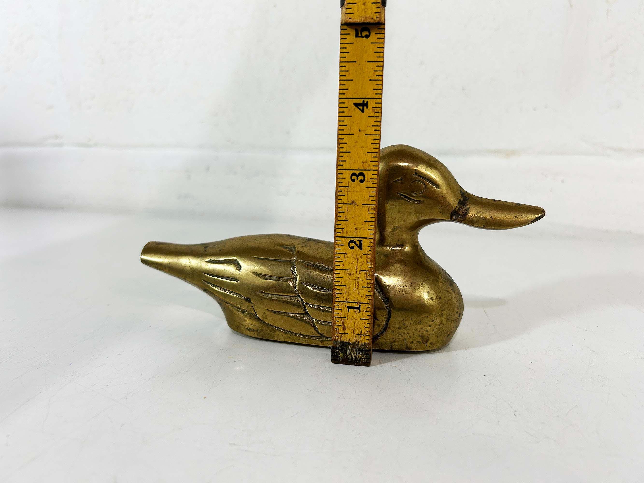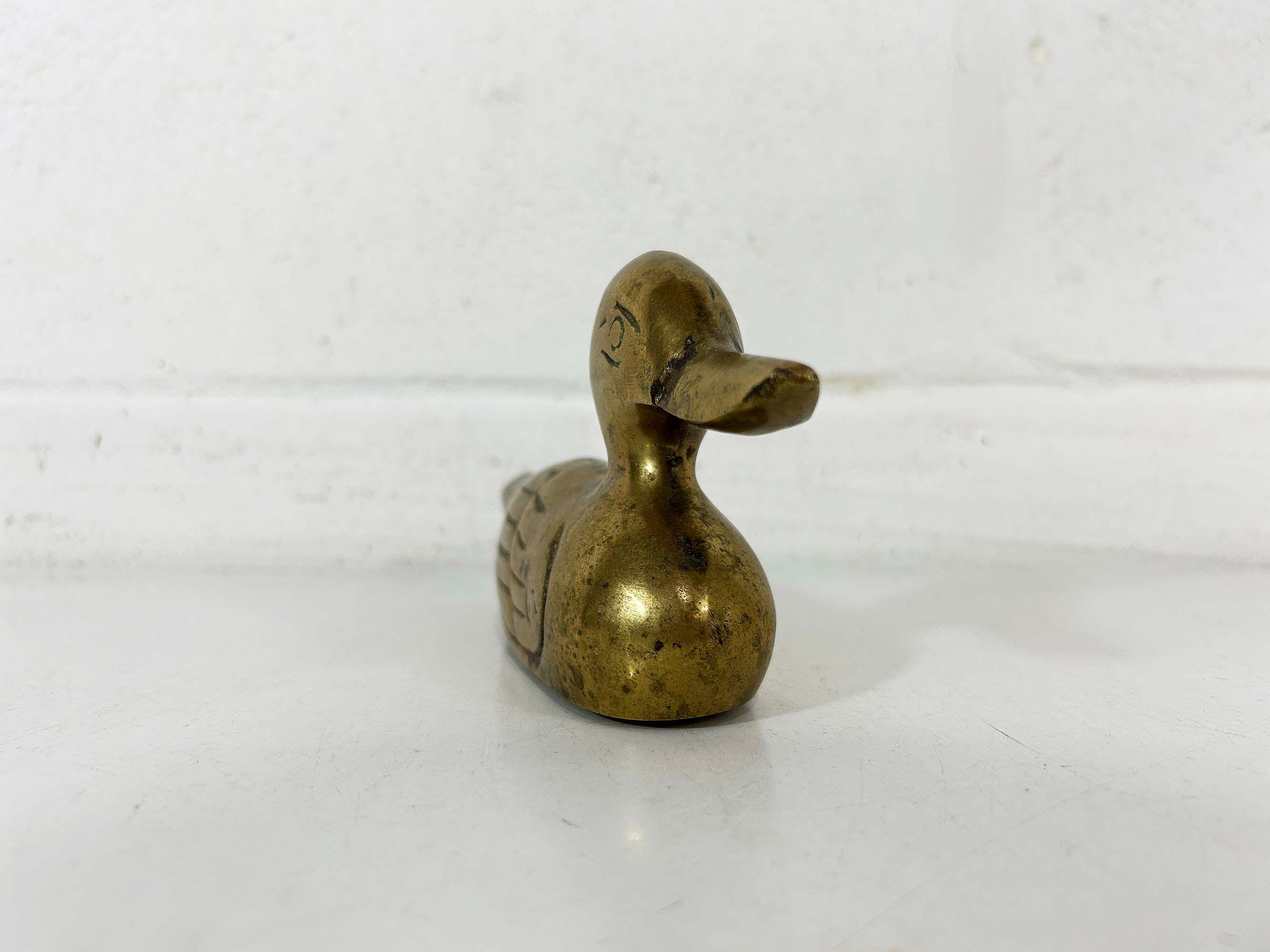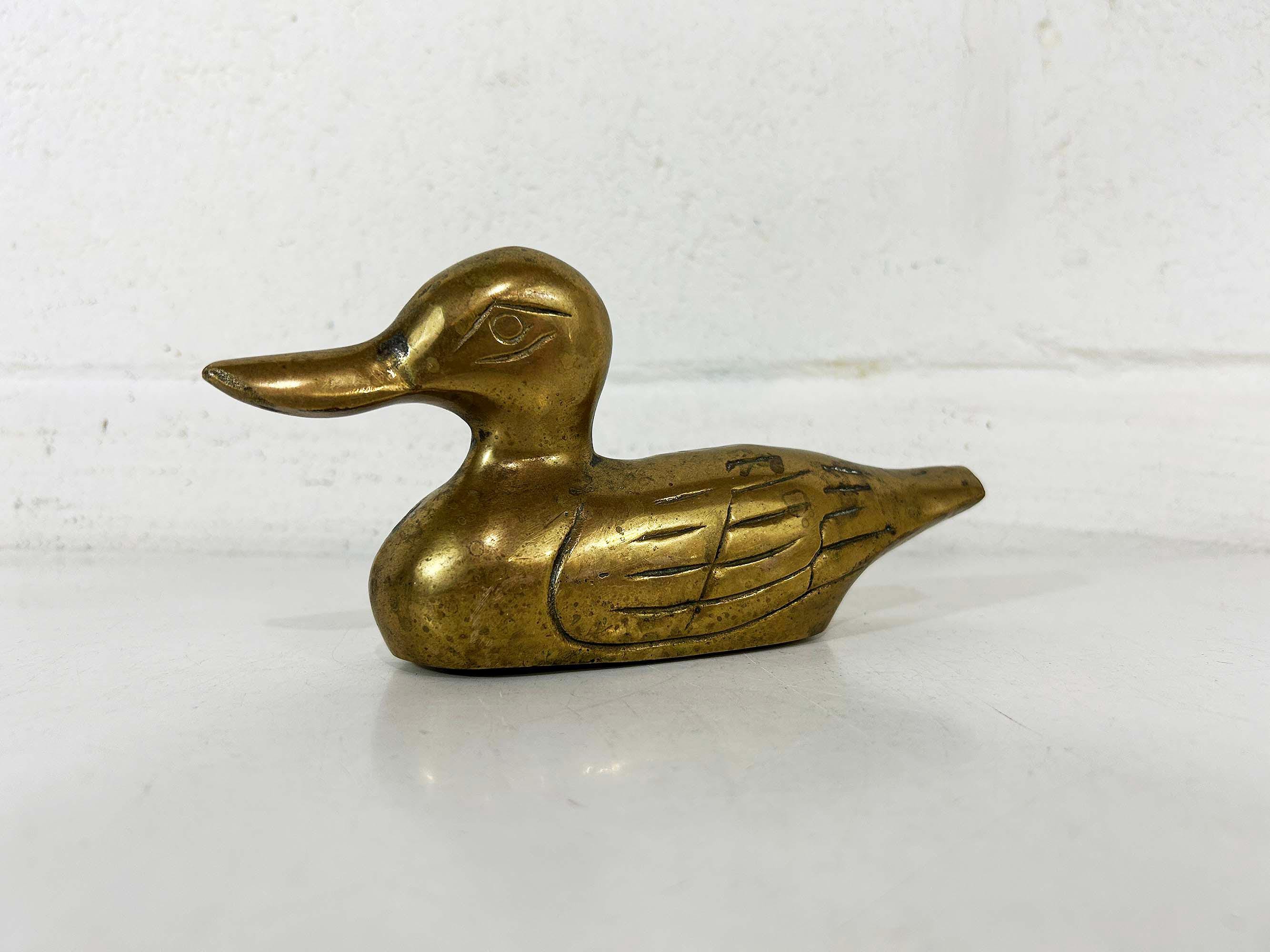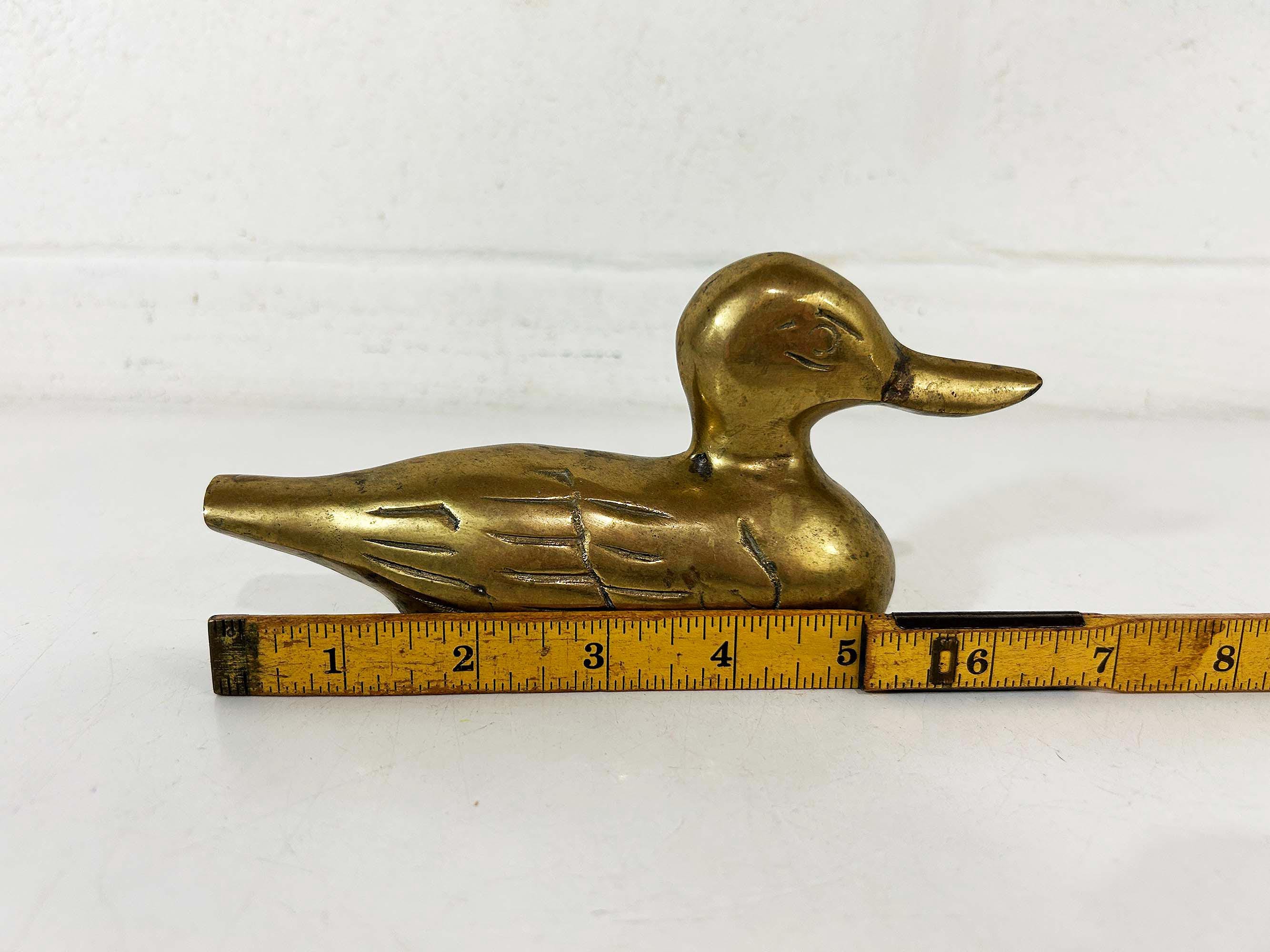 This is super cute brass duck is an fun way to make a statement on a side table or bookshelf. It is in good vintage condition with some patina. It is approximately 6 1/2 inches wide and 3 1/2 inches tall.