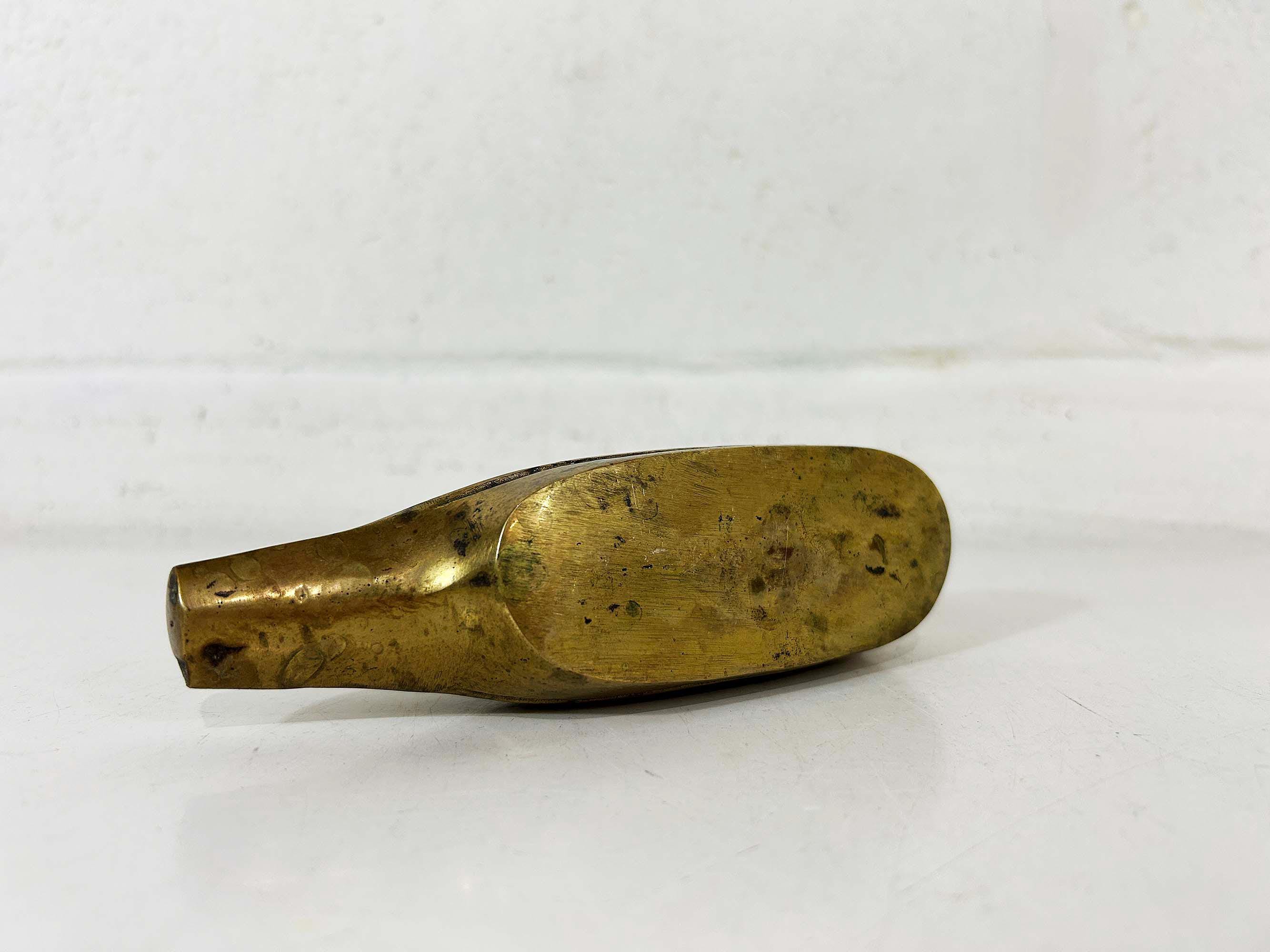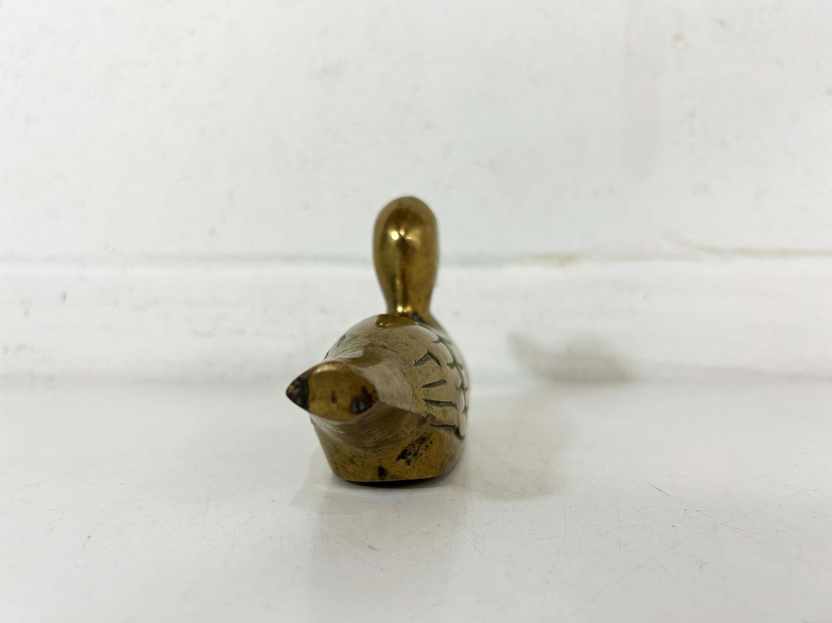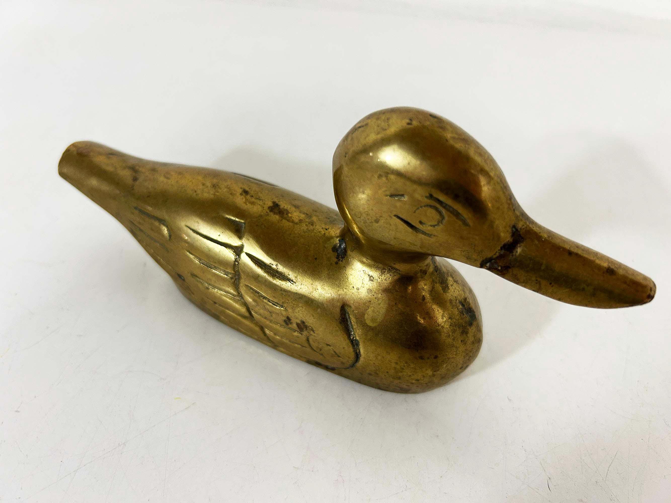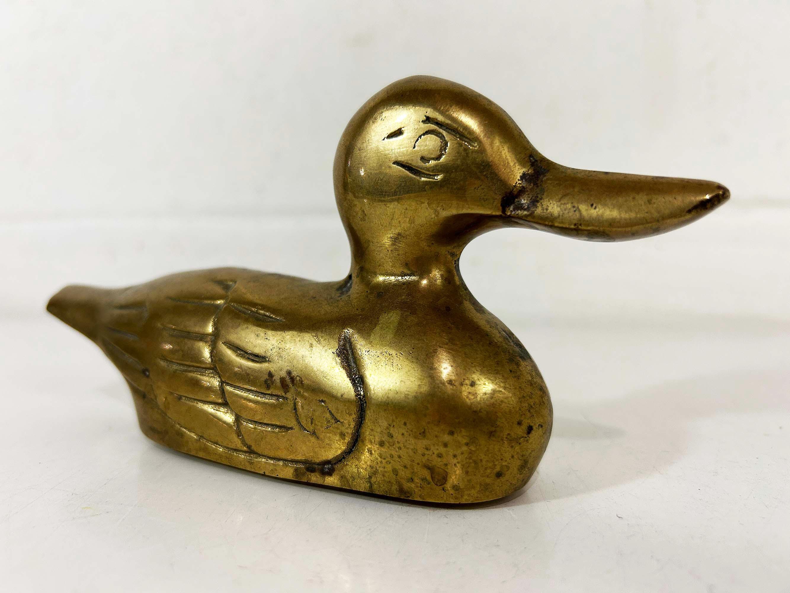 This is super cute brass duck is an fun way to make a statement on a side table or bookshelf. It is in good vintage condition with some patina. It is approximately 6 1/2 inches wide and 3 1/2 inches tall.