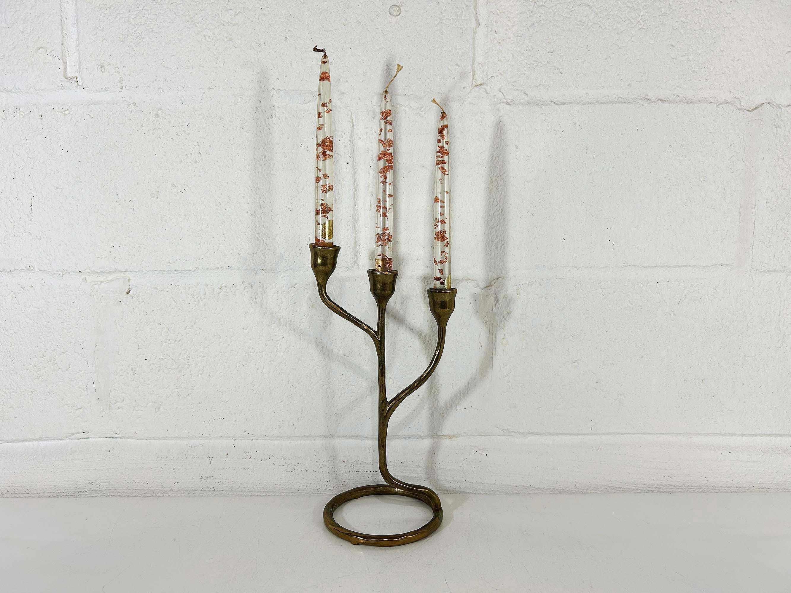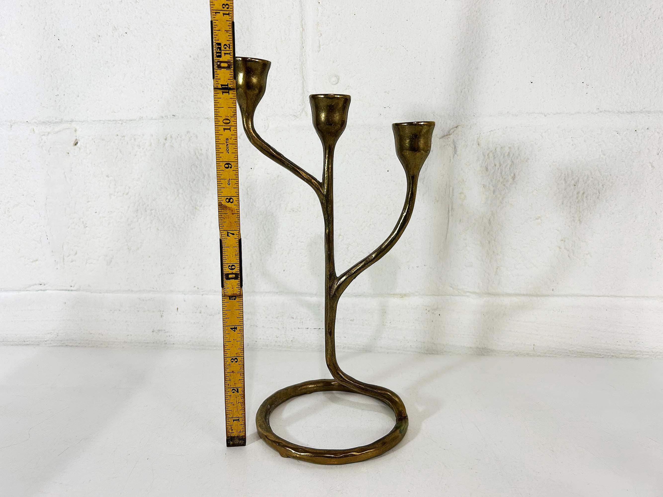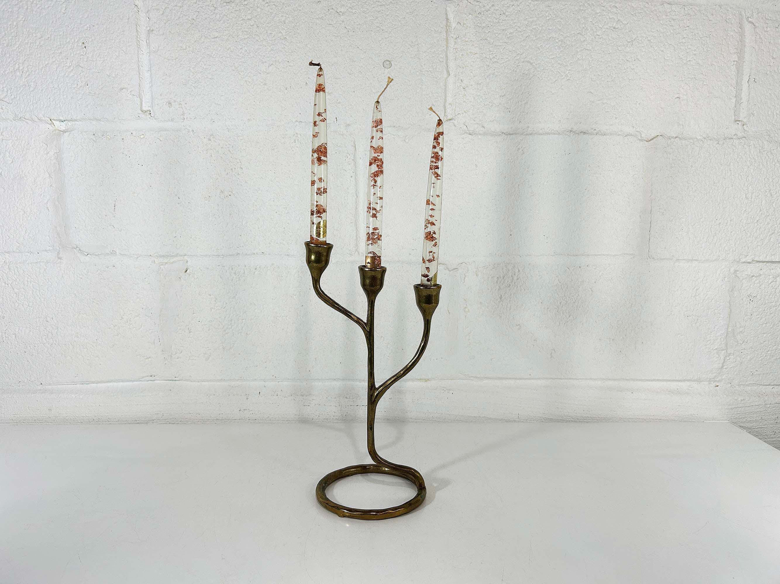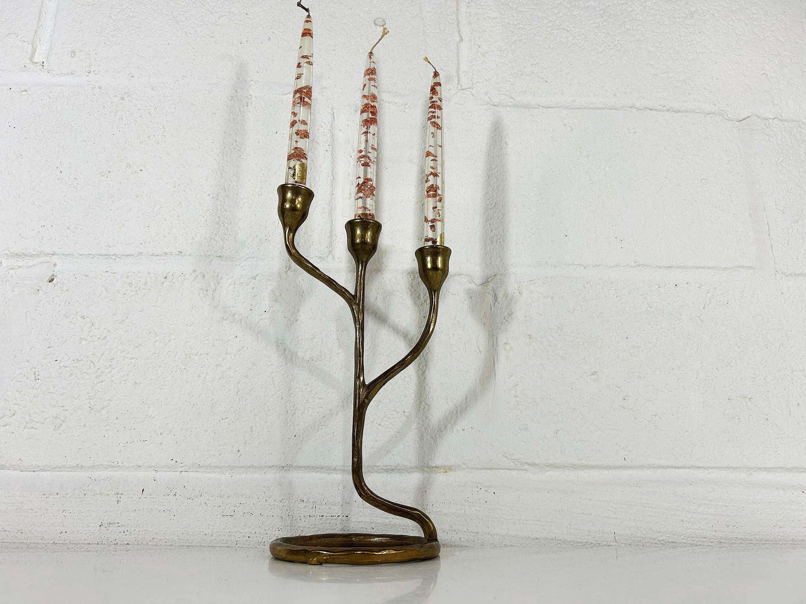 Incredibly striking and unique heavy golden metal candelabra. It holds 3 candles at varying heights. Such a cool vintage decor for your home! It is made of a heavy golden metal - either brass or bronze. It is very organic - lots of texture on the metal. It is approximately 12 inches tall and 5 inches in diameter at the base.
