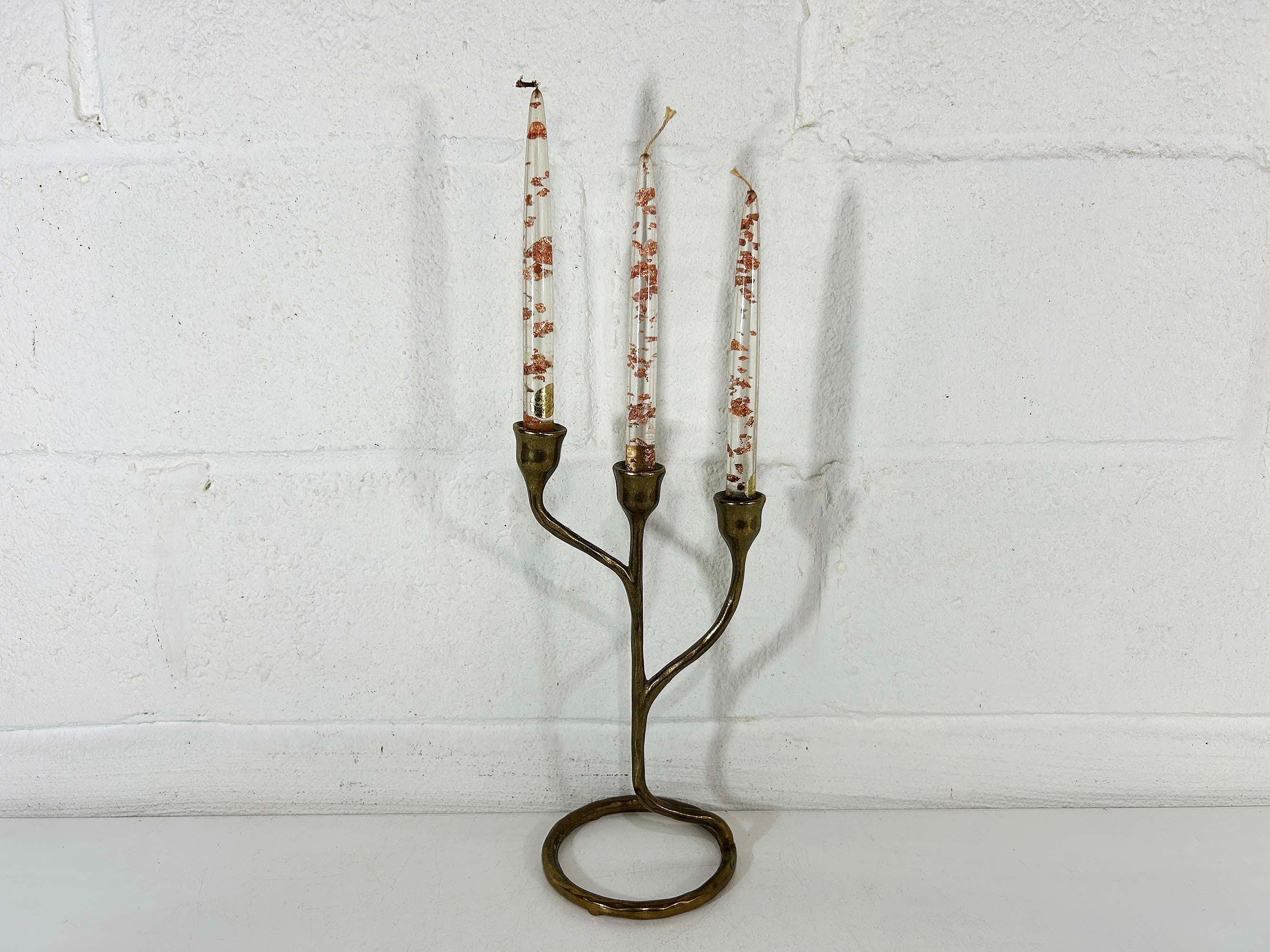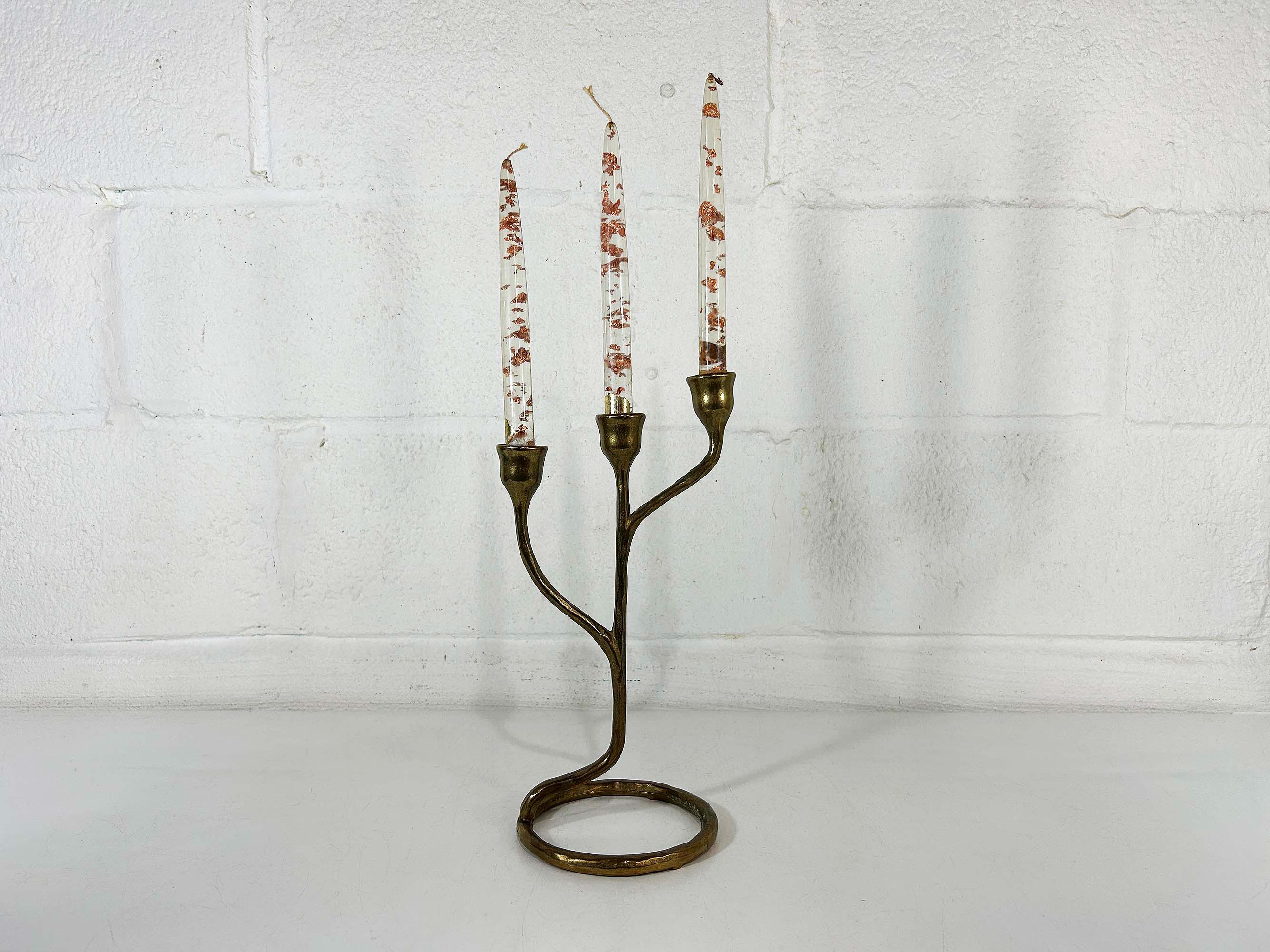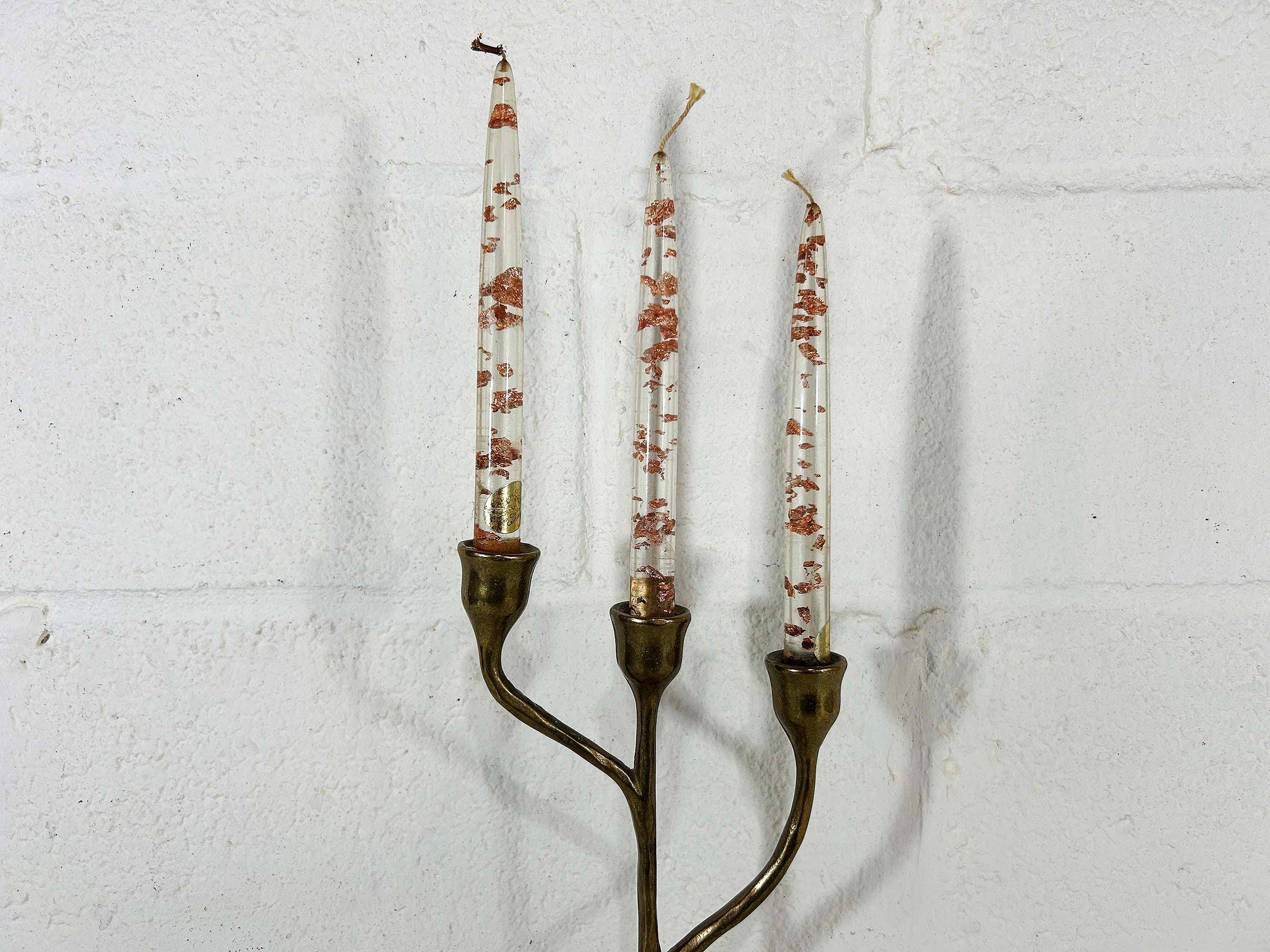 Incredibly striking and unique heavy golden metal candelabra. It holds 3 candles at varying heights. Such a cool vintage decor for your home! It is made of a heavy golden metal - either brass or bronze. It is very organic - lots of texture on the metal. It is approximately 12 inches tall and 5 inches in diameter at the base.