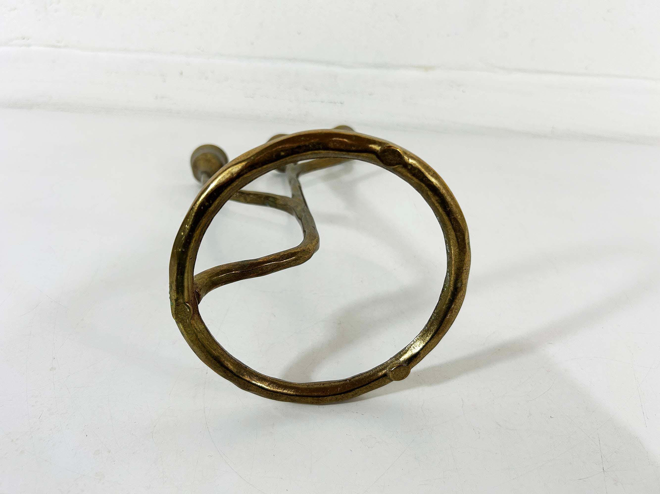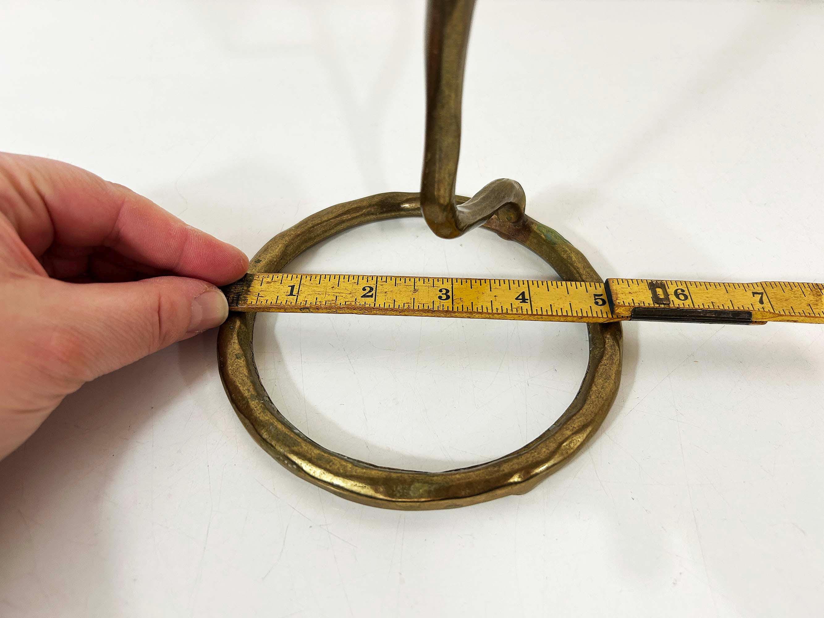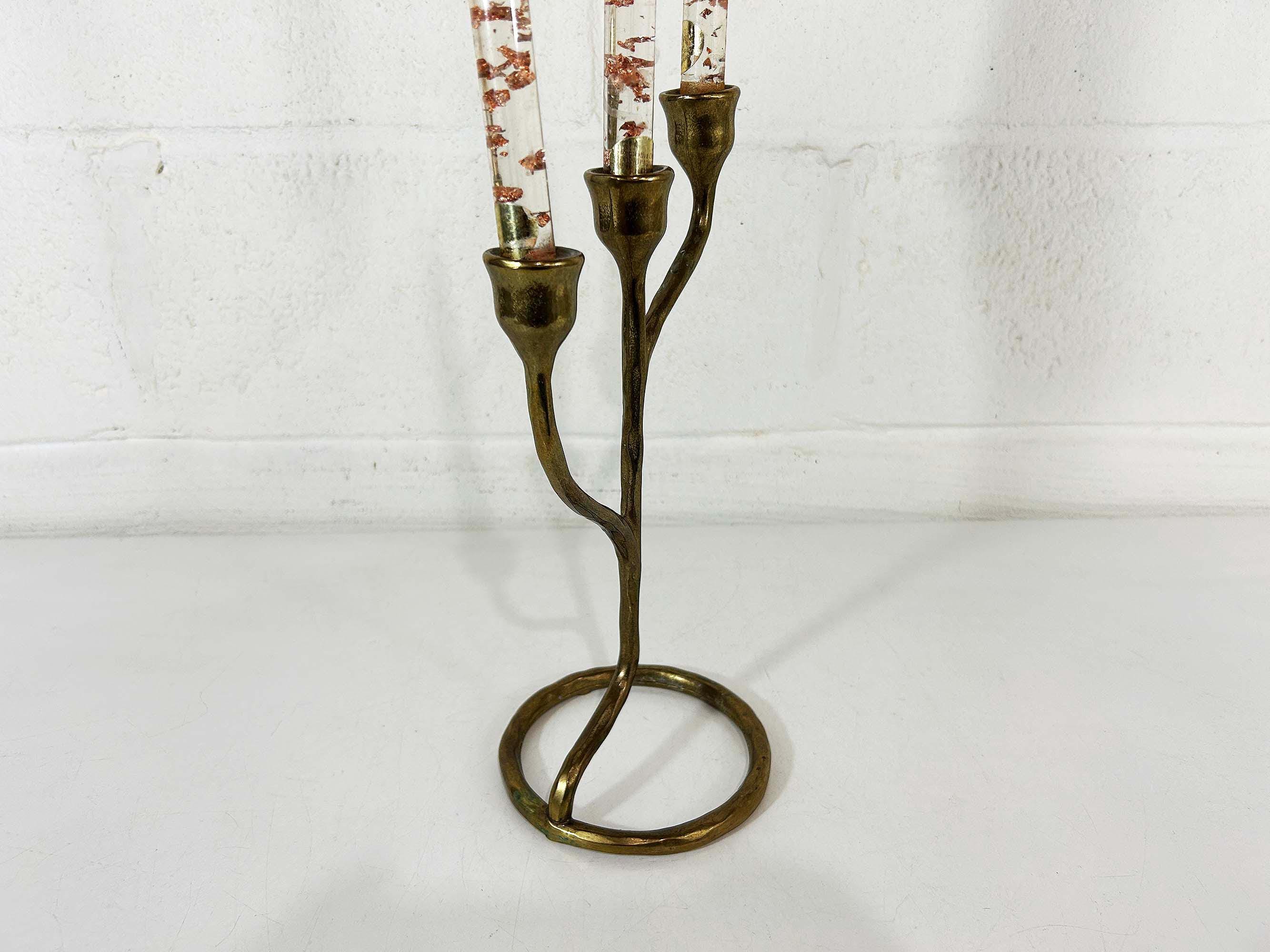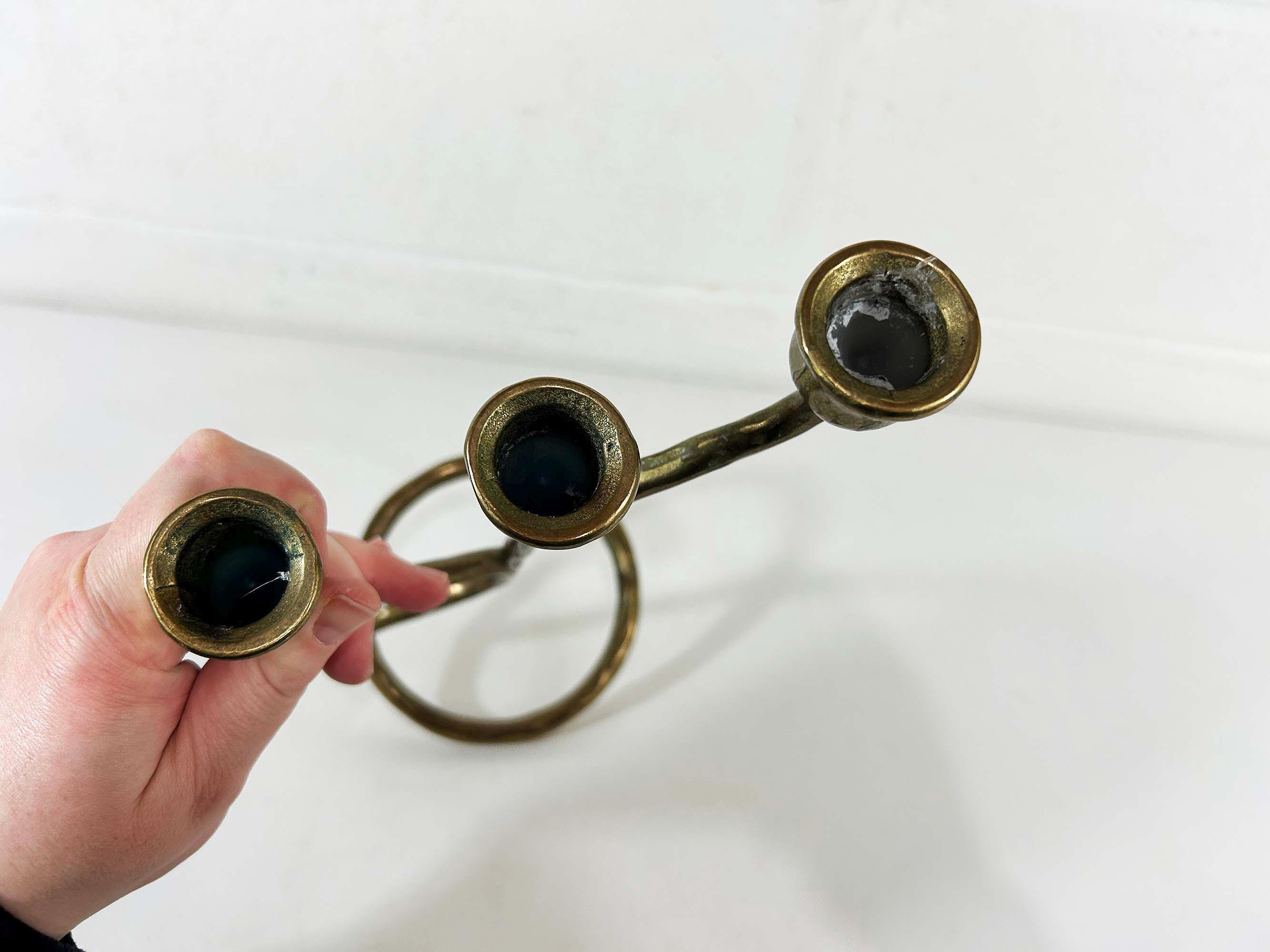Incredibly striking and unique heavy golden metal candelabra. It holds 3 candles at varying heights. Such a cool vintage decor for your home! It is made of a heavy golden metal - either brass or bronze. It is very organic - lots of texture on the metal. It is approximately 12 inches tall and 5 inches in diameter at the base.