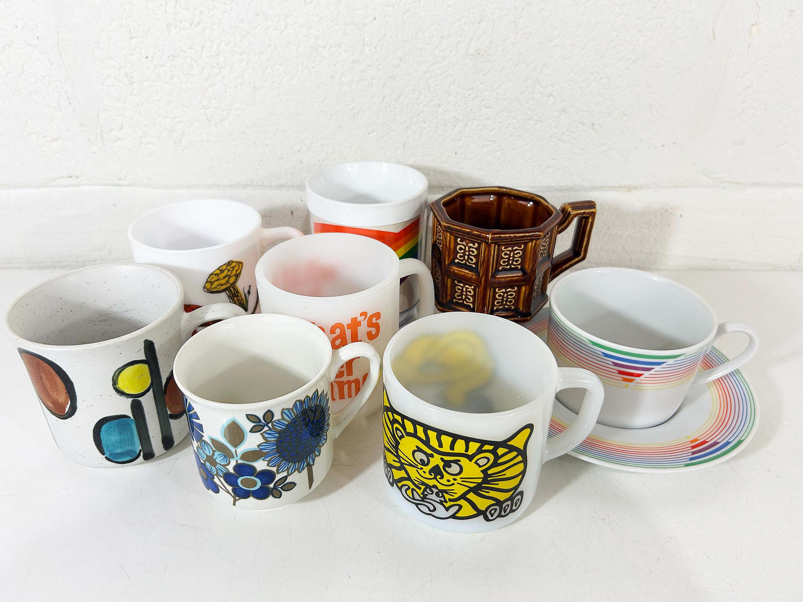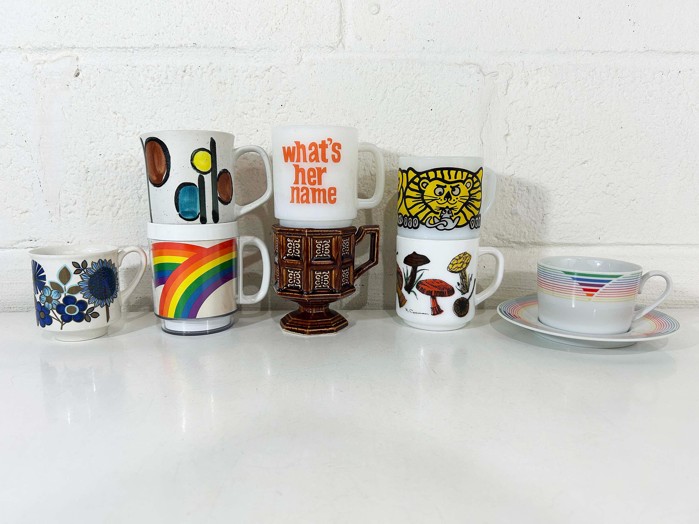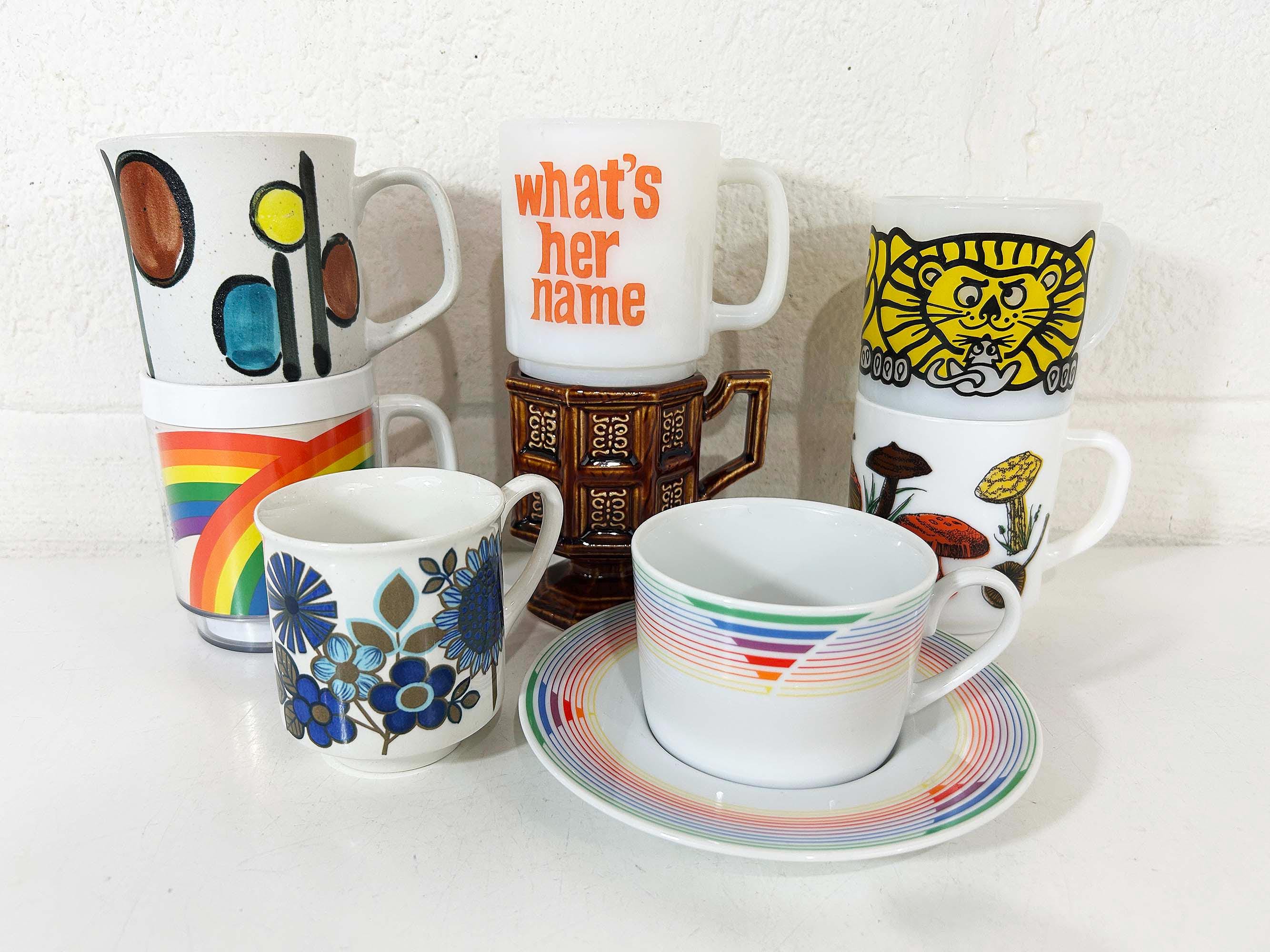 Super cute collection of vintage coffee mugs from the 60s and 70s! Each mug is sold separately - refer to the second photo where the mugs have numbers assigned and choose the one you'd like to purchase from the drop down menu. If you have any questions on a particular mug please feel free to message me. All mugs are in good, usable condition but show signs of wear and use. If the mug doesn't appear in the drop down menu it has sold.