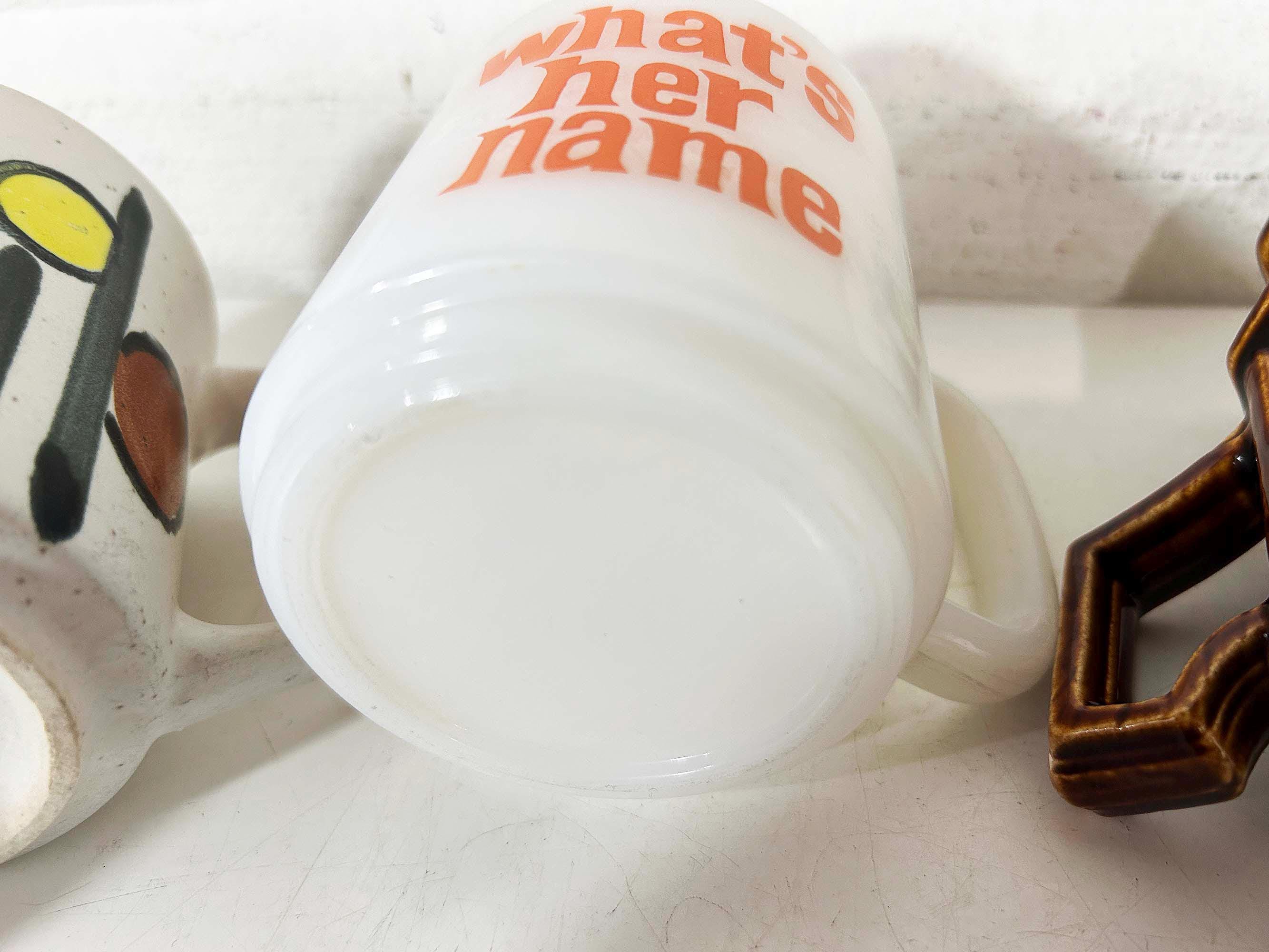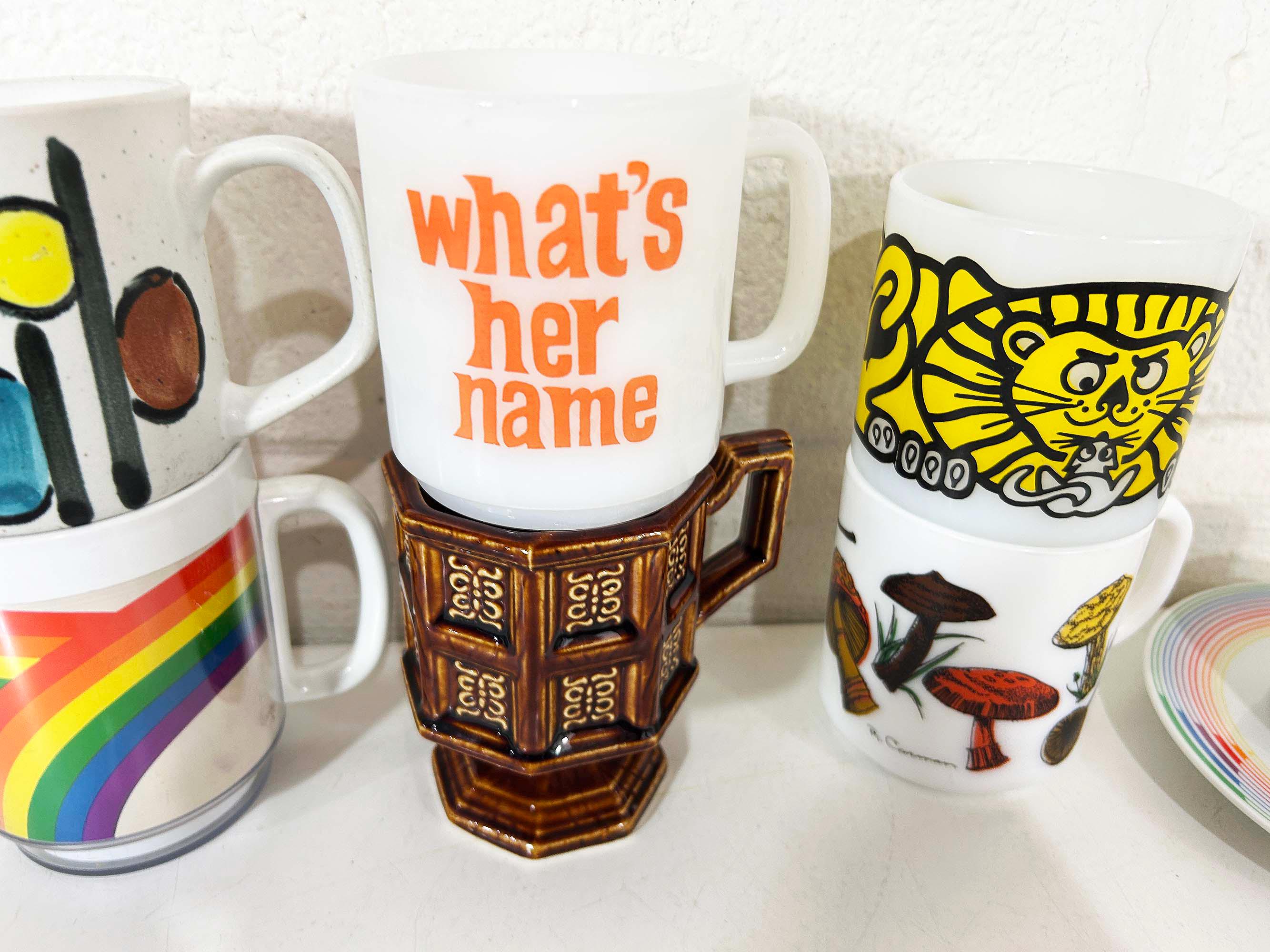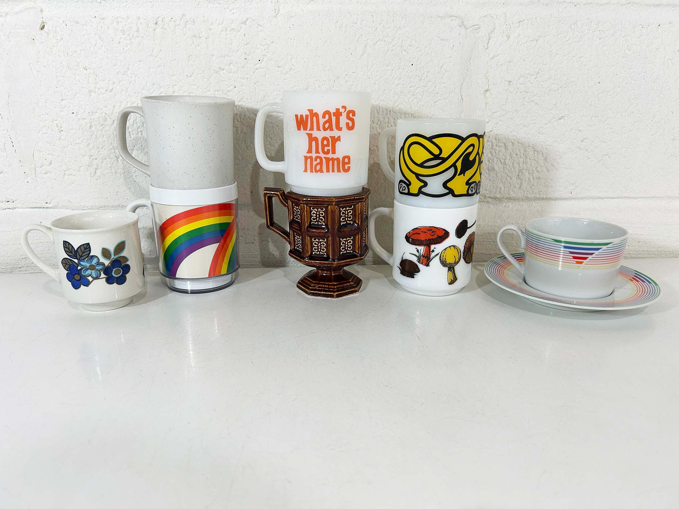 Super cute collection of vintage coffee mugs from the 60s and 70s! Each mug is sold separately - refer to the second photo where the mugs have numbers assigned and choose the one you'd like to purchase from the drop down menu. If you have any questions on a particular mug please feel free to message me. All mugs are in good, usable condition but show signs of wear and use. If the mug doesn't appear in the drop down menu it has sold.