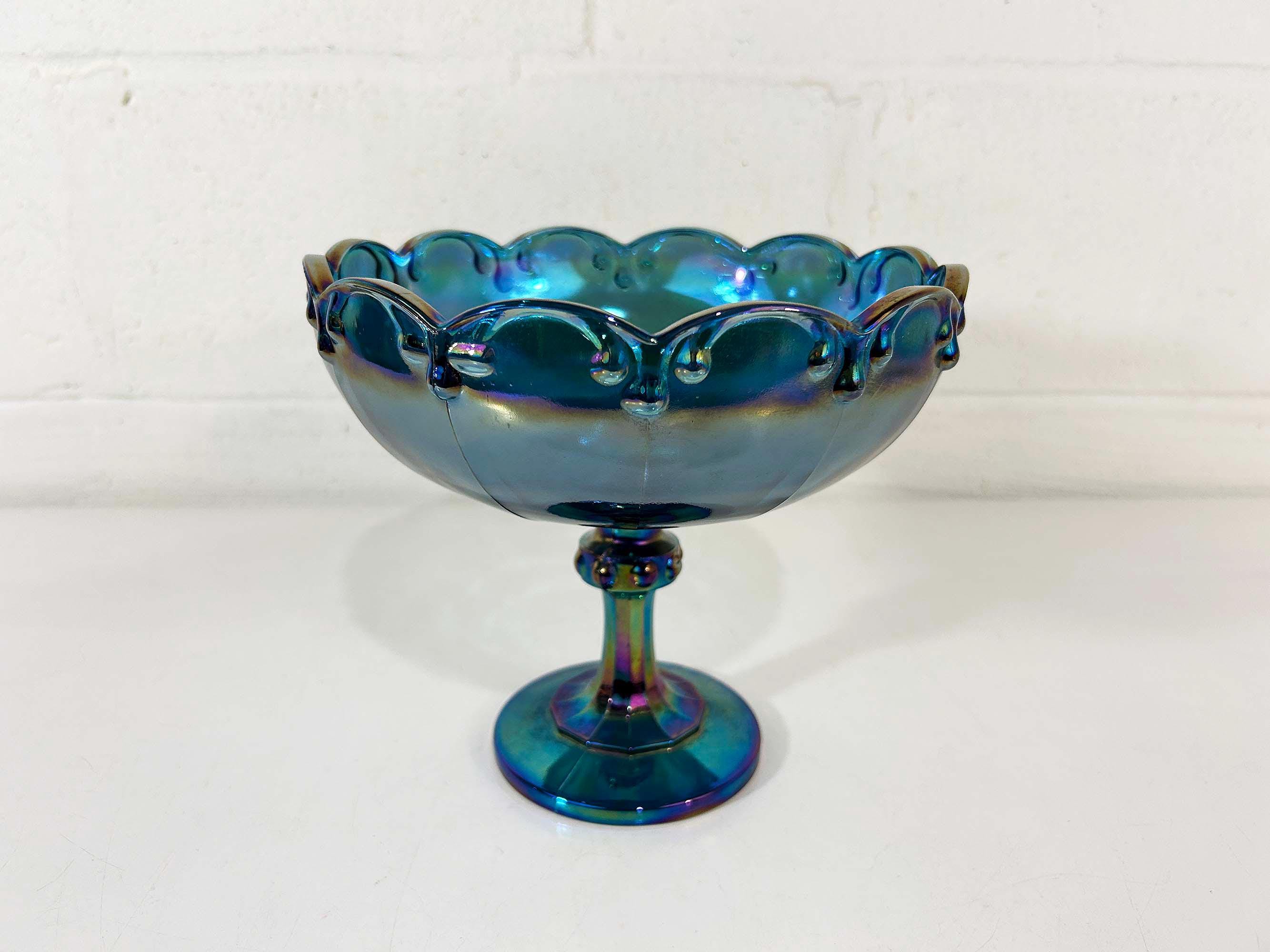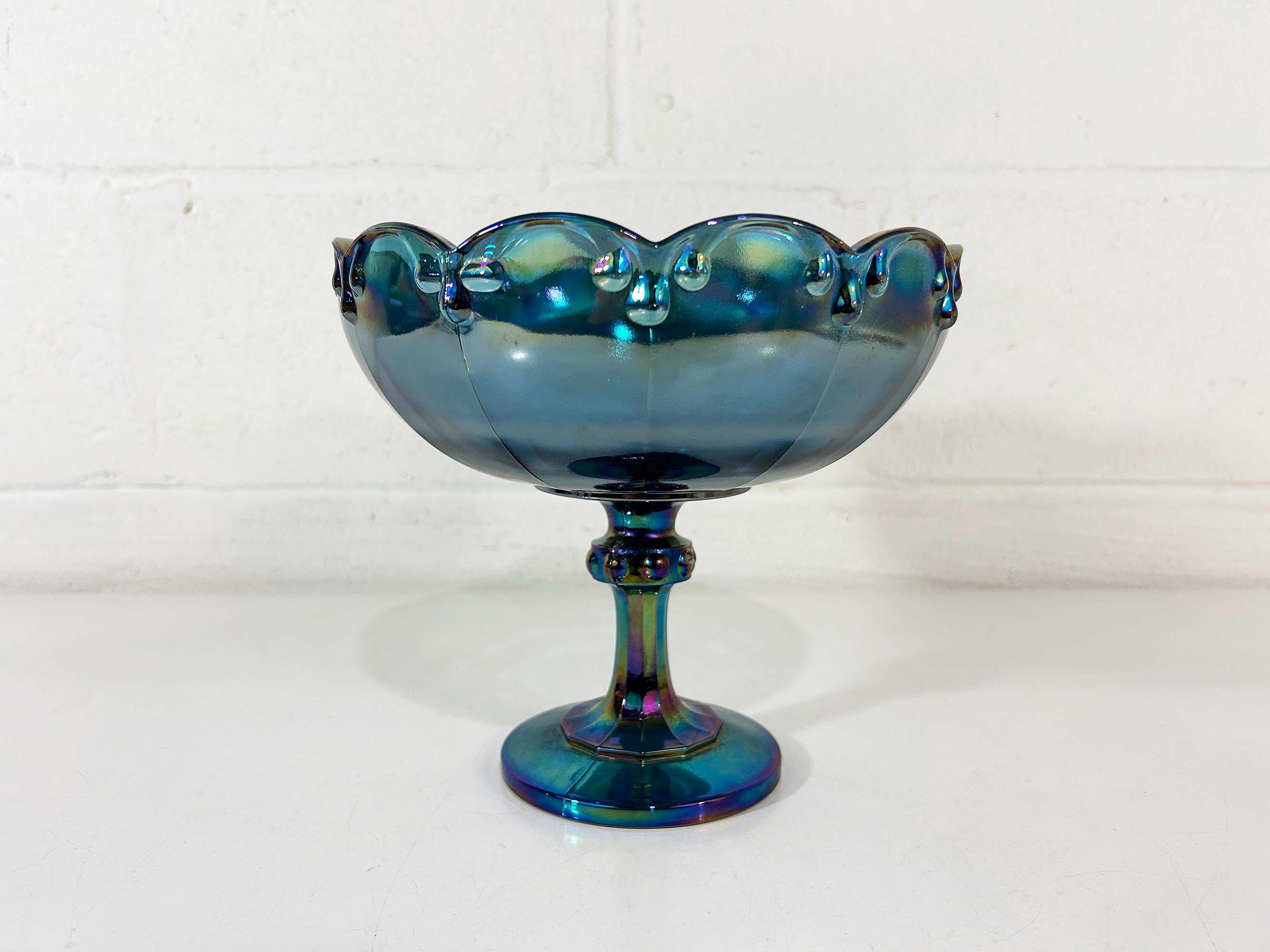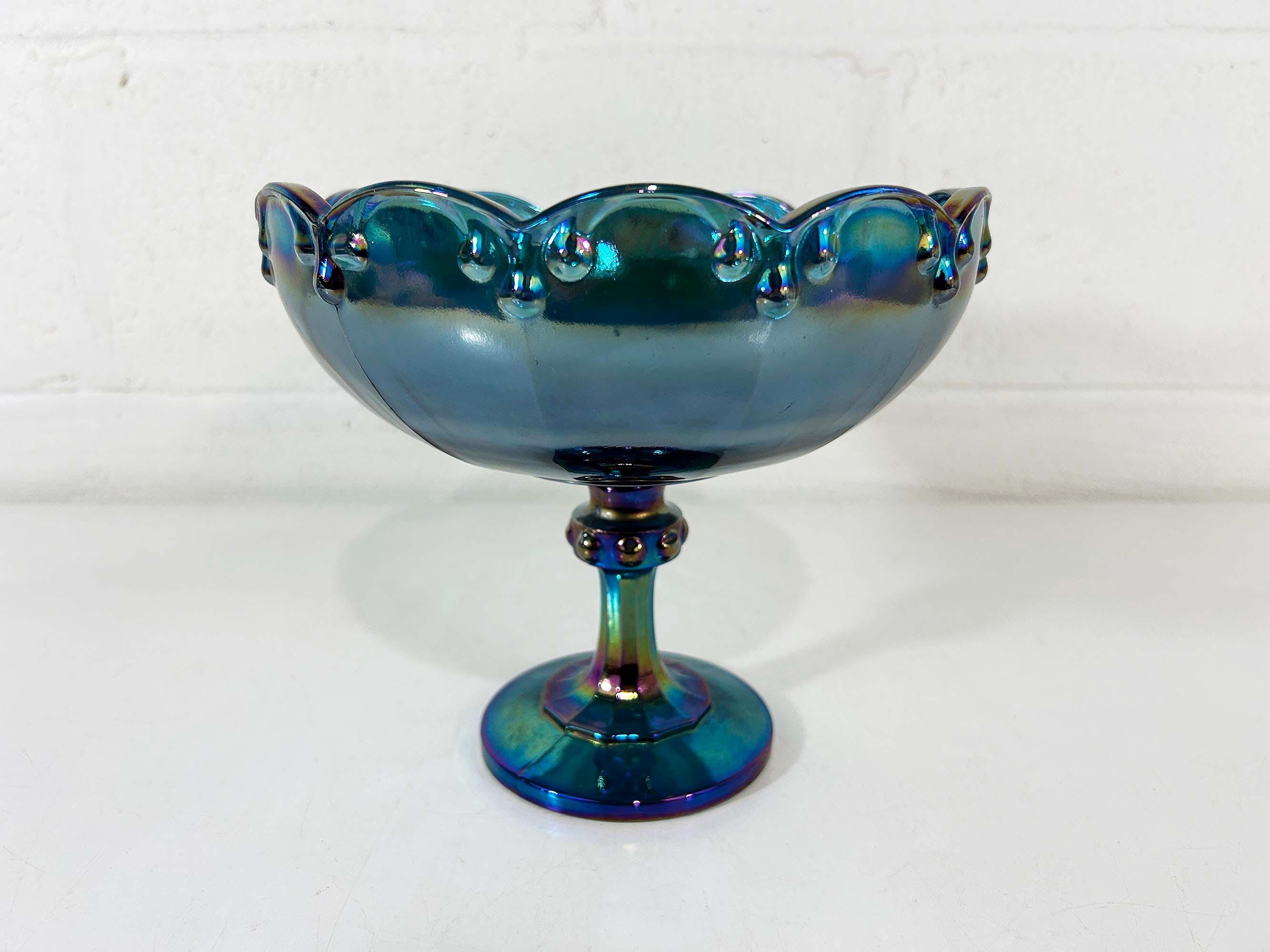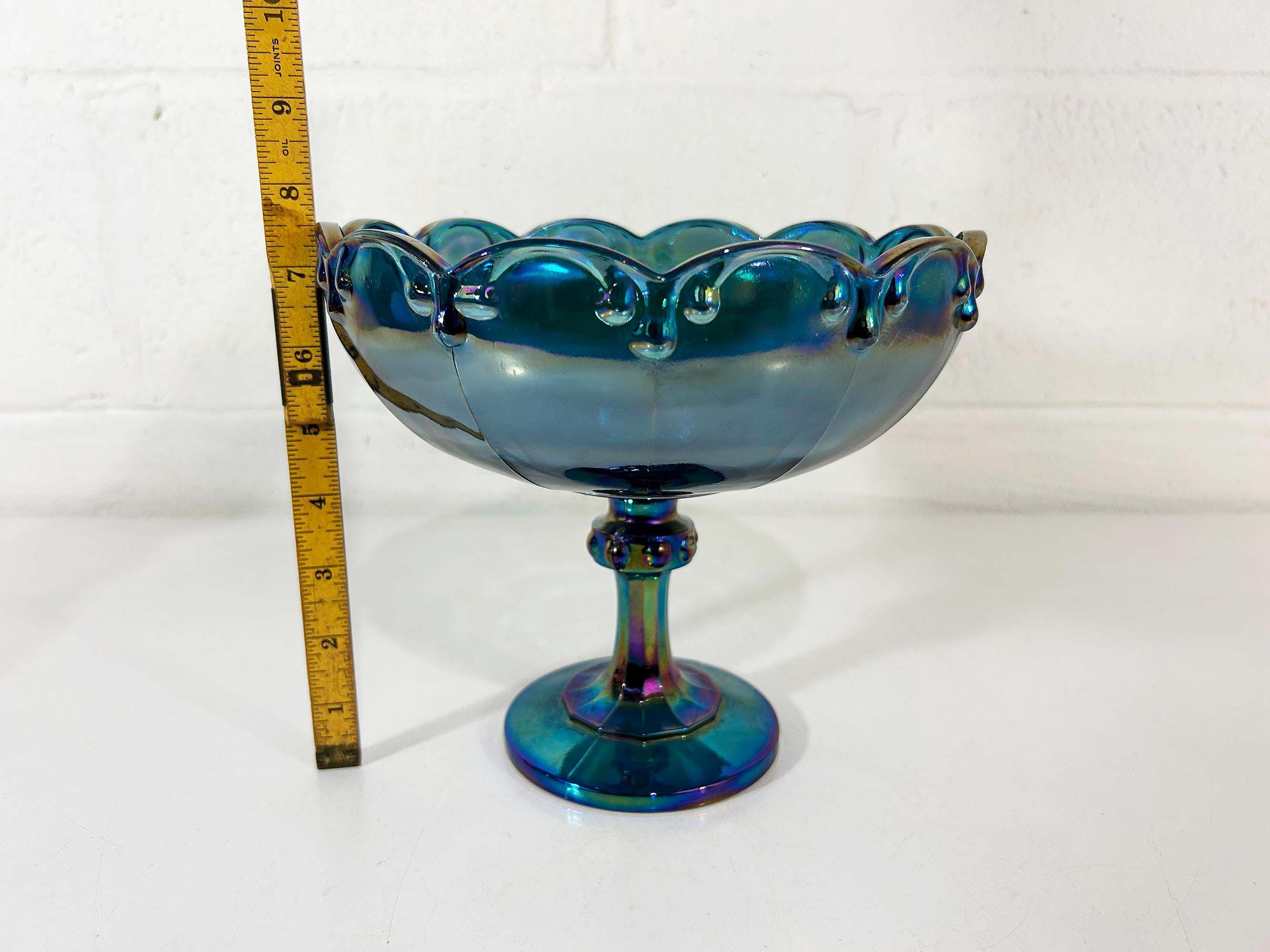 Lovely Indiana Glass carnival blue glass compote dish. It is heavy and sturdy, with no chips or cracks. The glass really catches the light and shows a rainbow of colors - so pretty! It is approximately 8 1/2 inches in diameter and 7 1/2 inches tall.