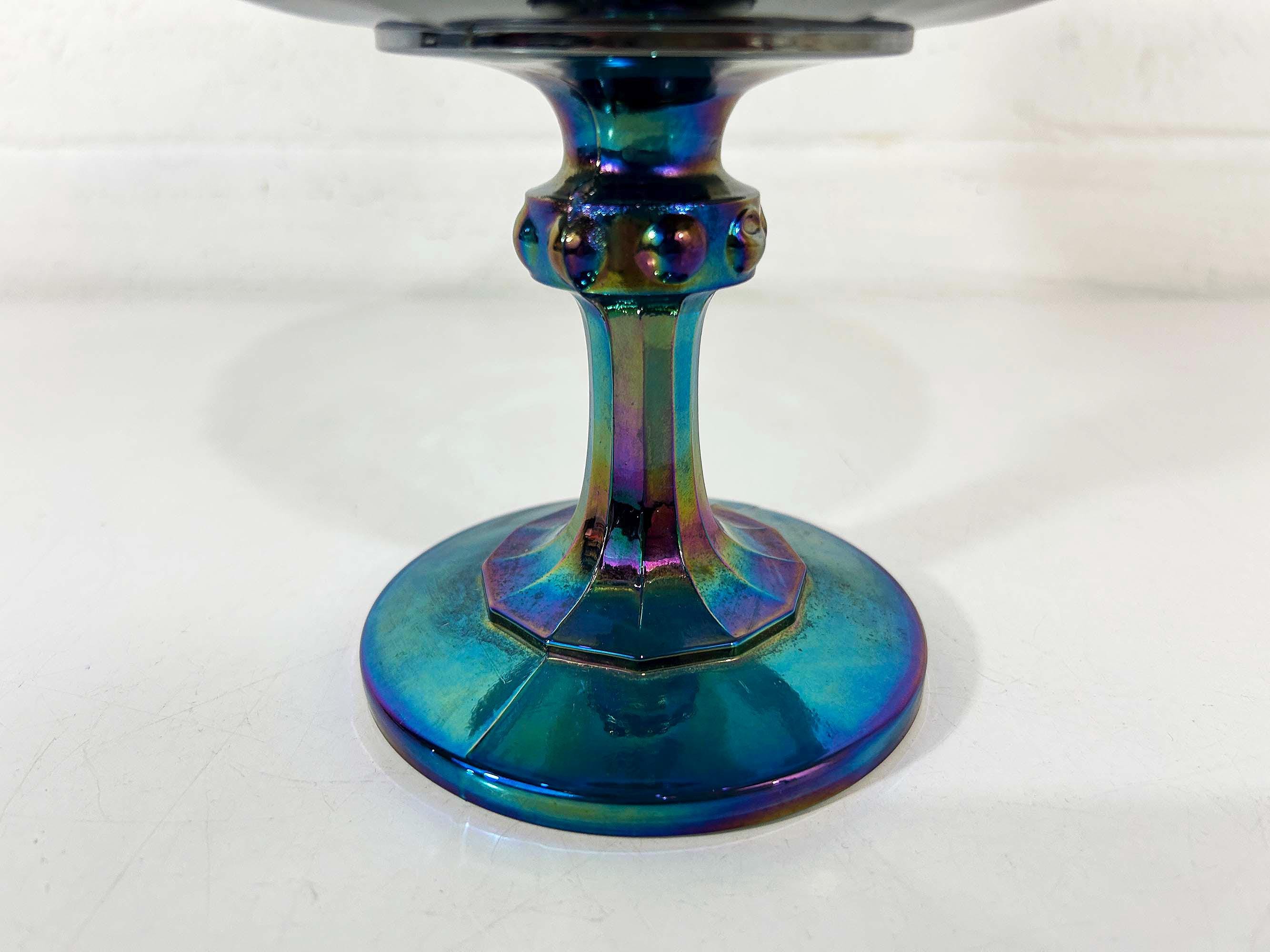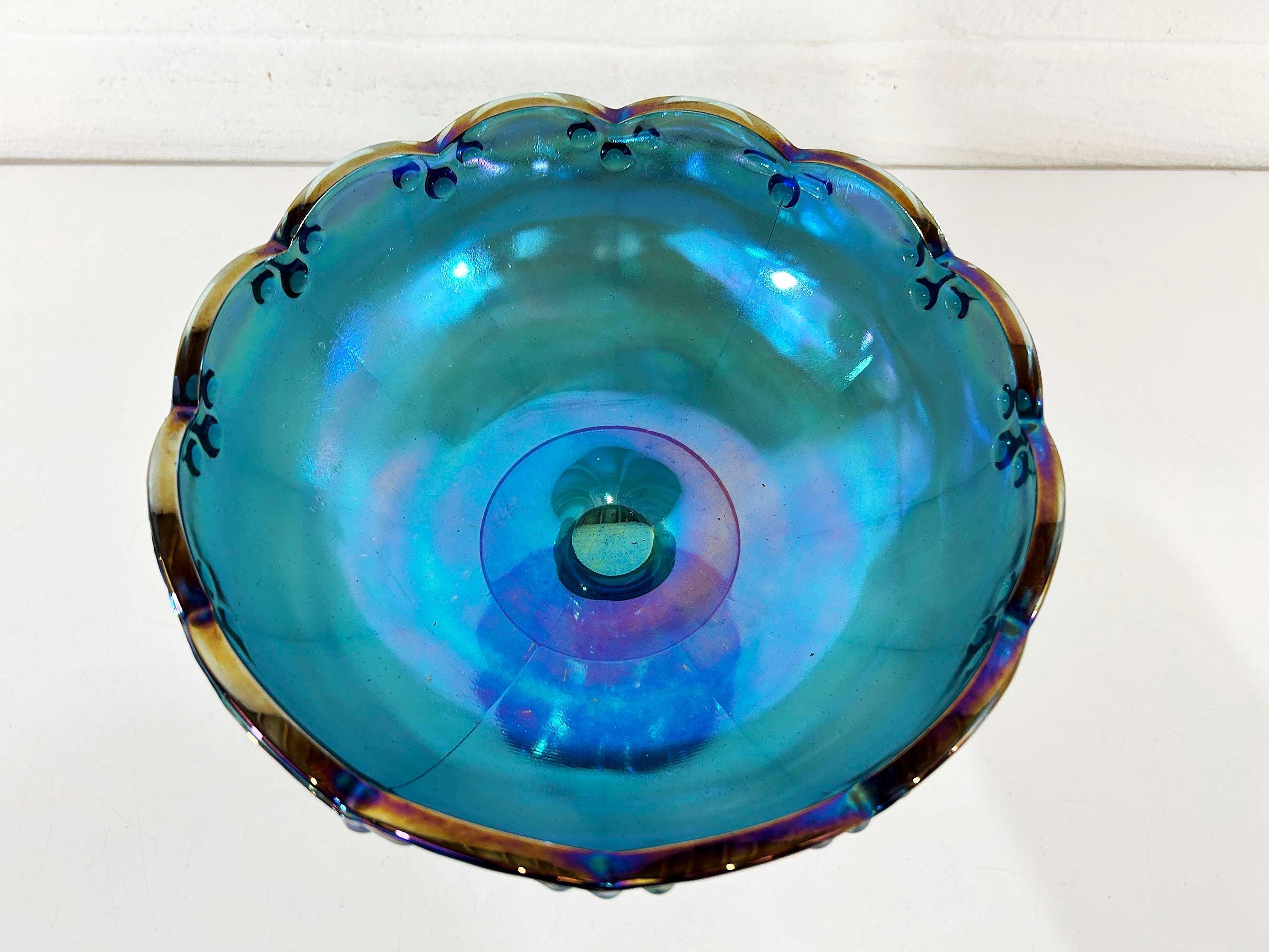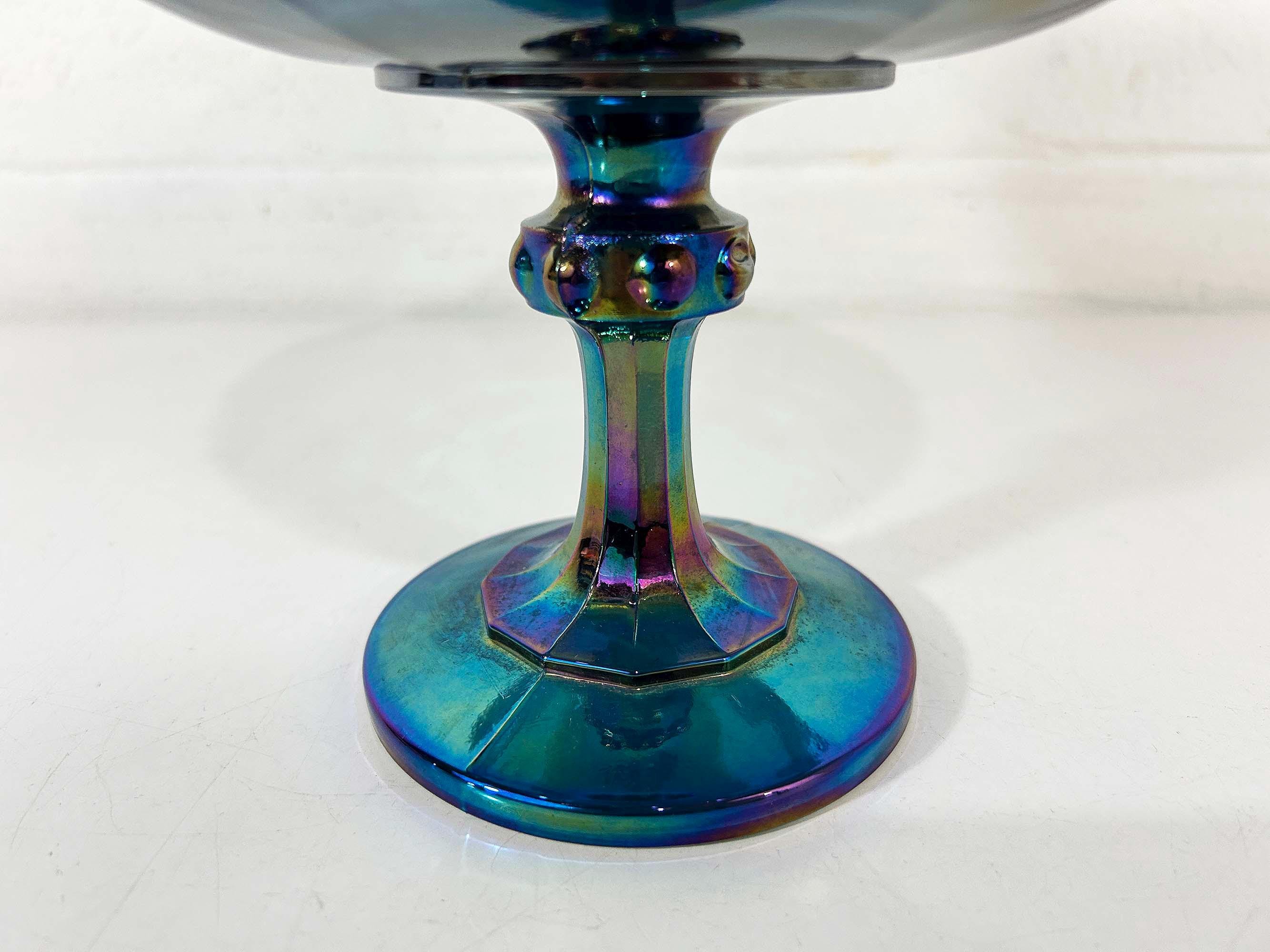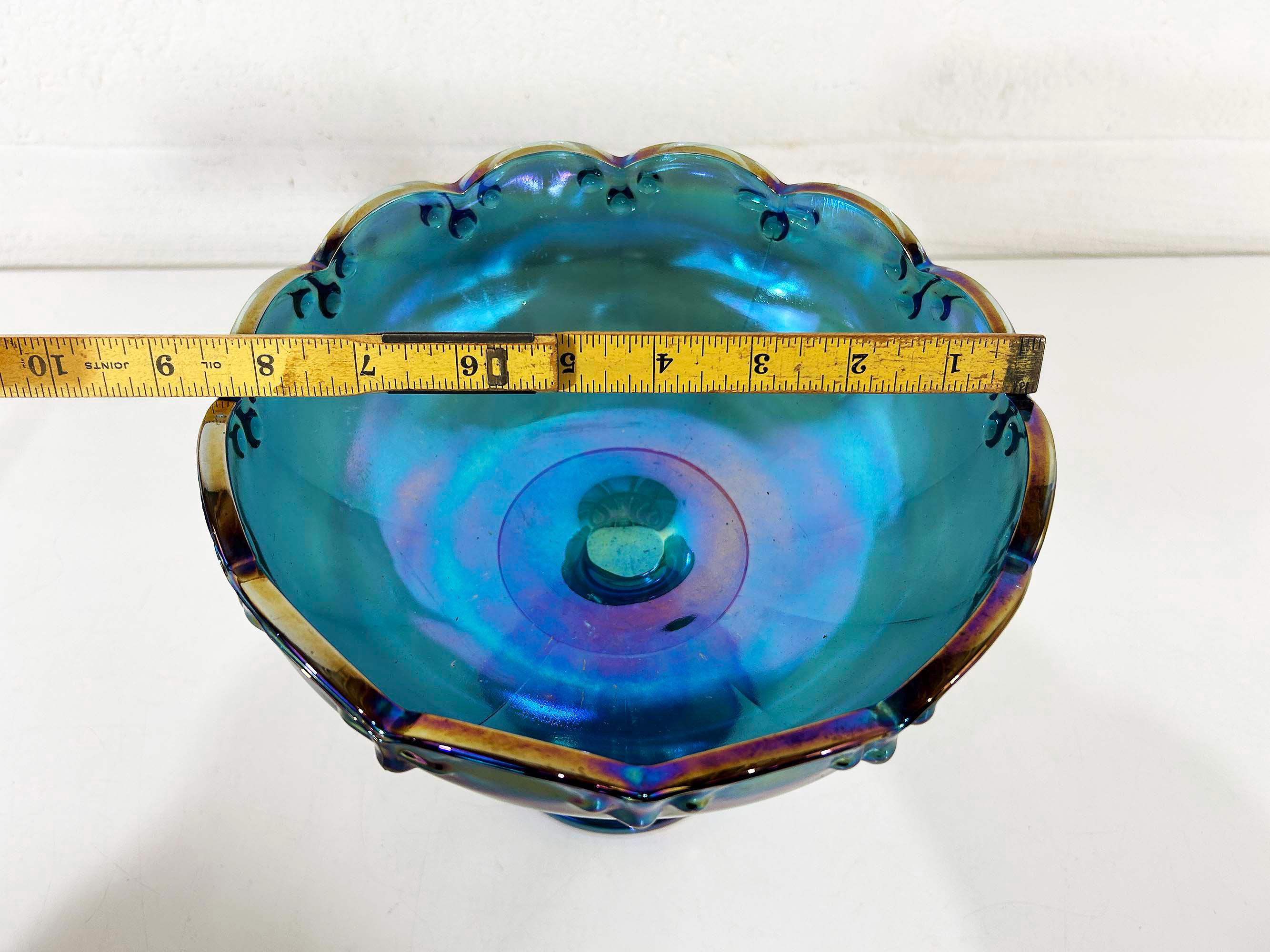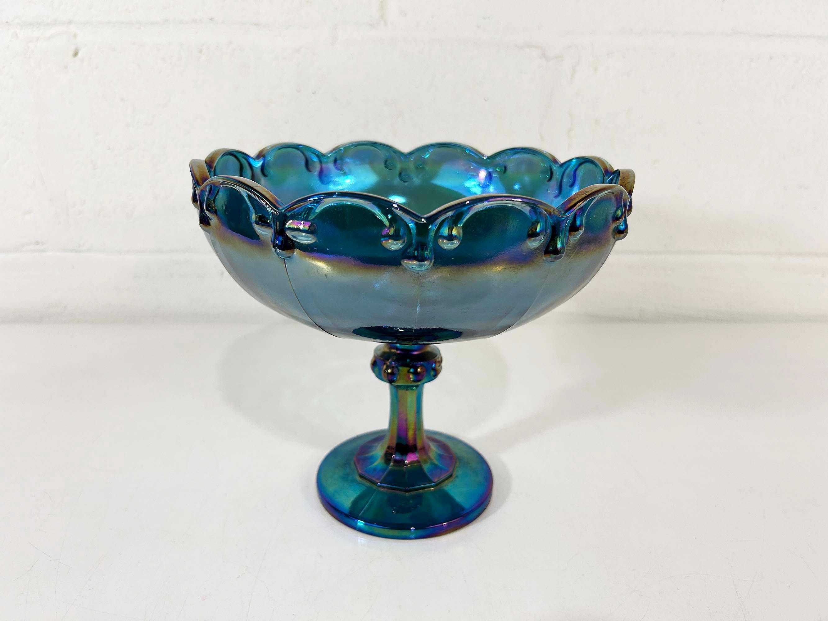 Lovely Indiana Glass carnival blue glass compote dish. It is heavy and sturdy, with no chips or cracks. The glass really catches the light and shows a rainbow of colors - so pretty! It is approximately 8 1/2 inches in diameter and 7 1/2 inches tall.