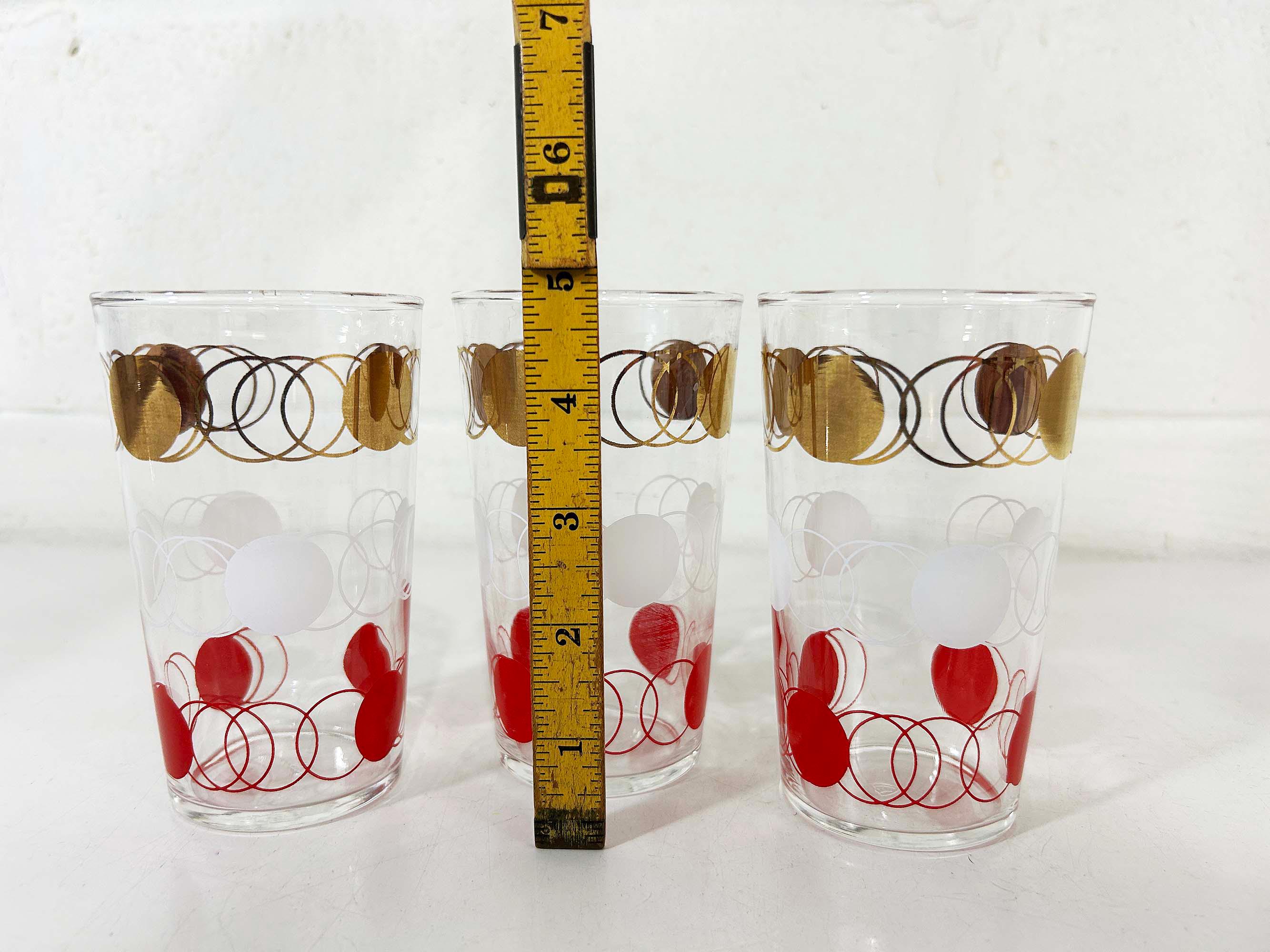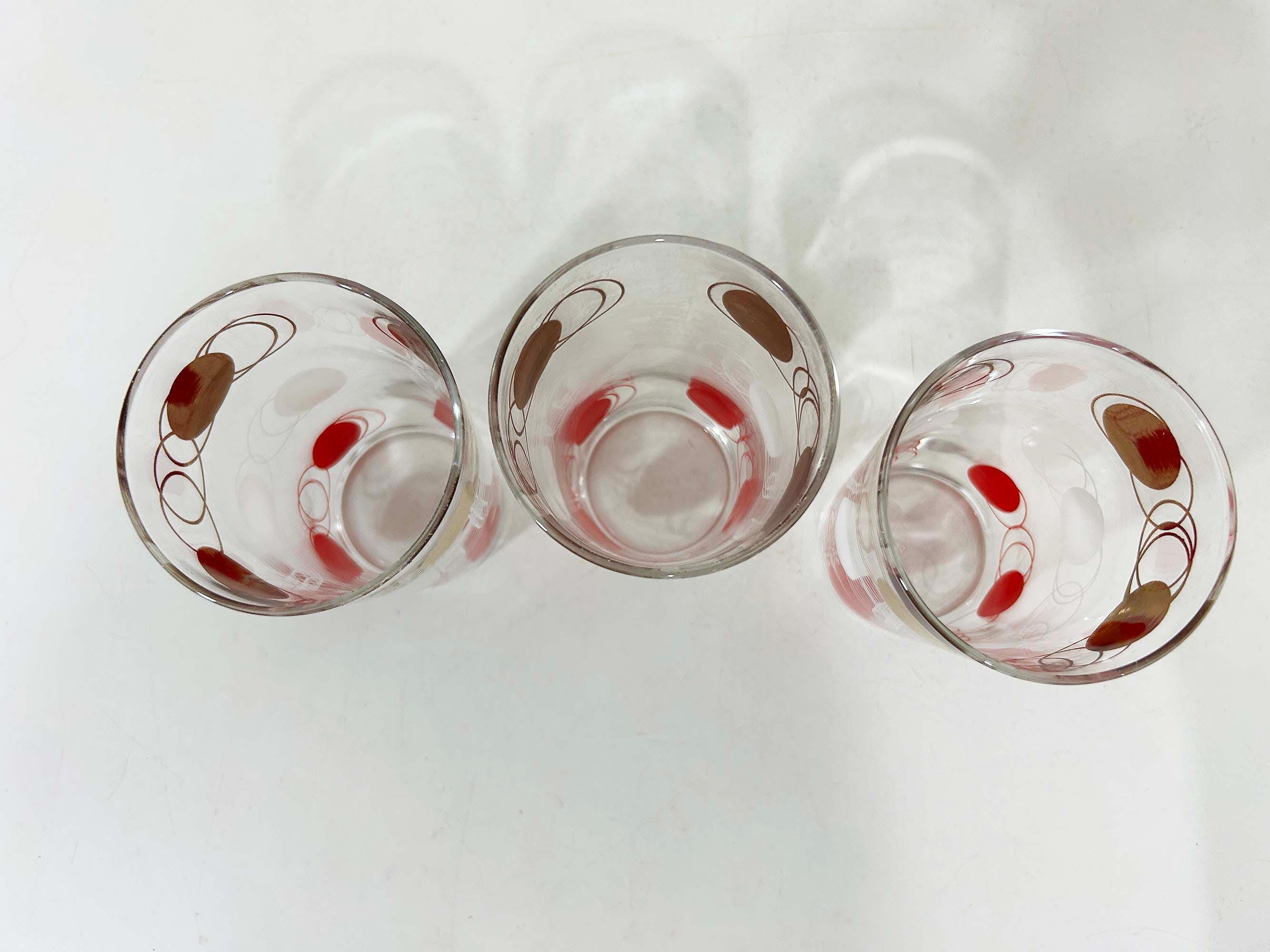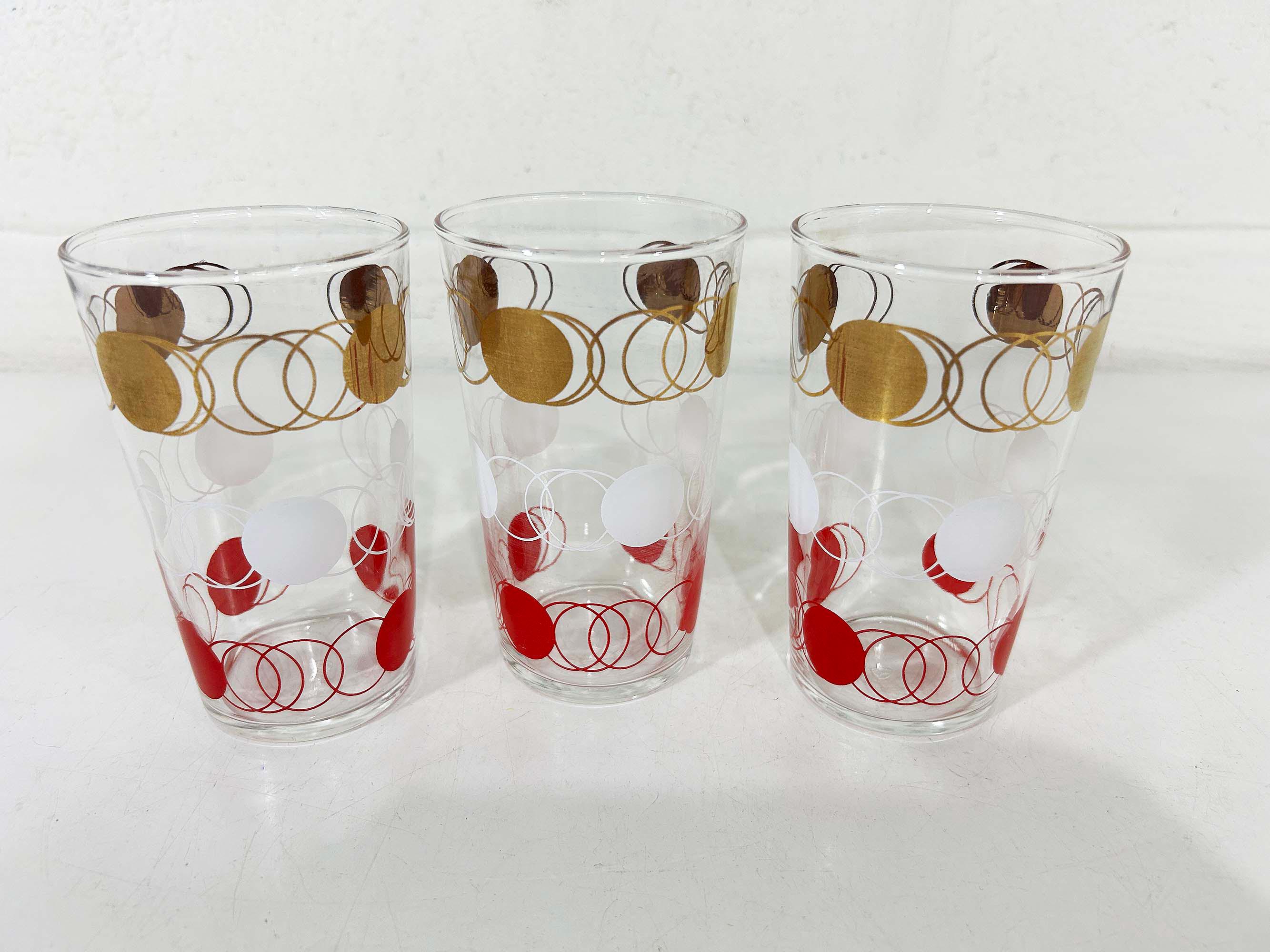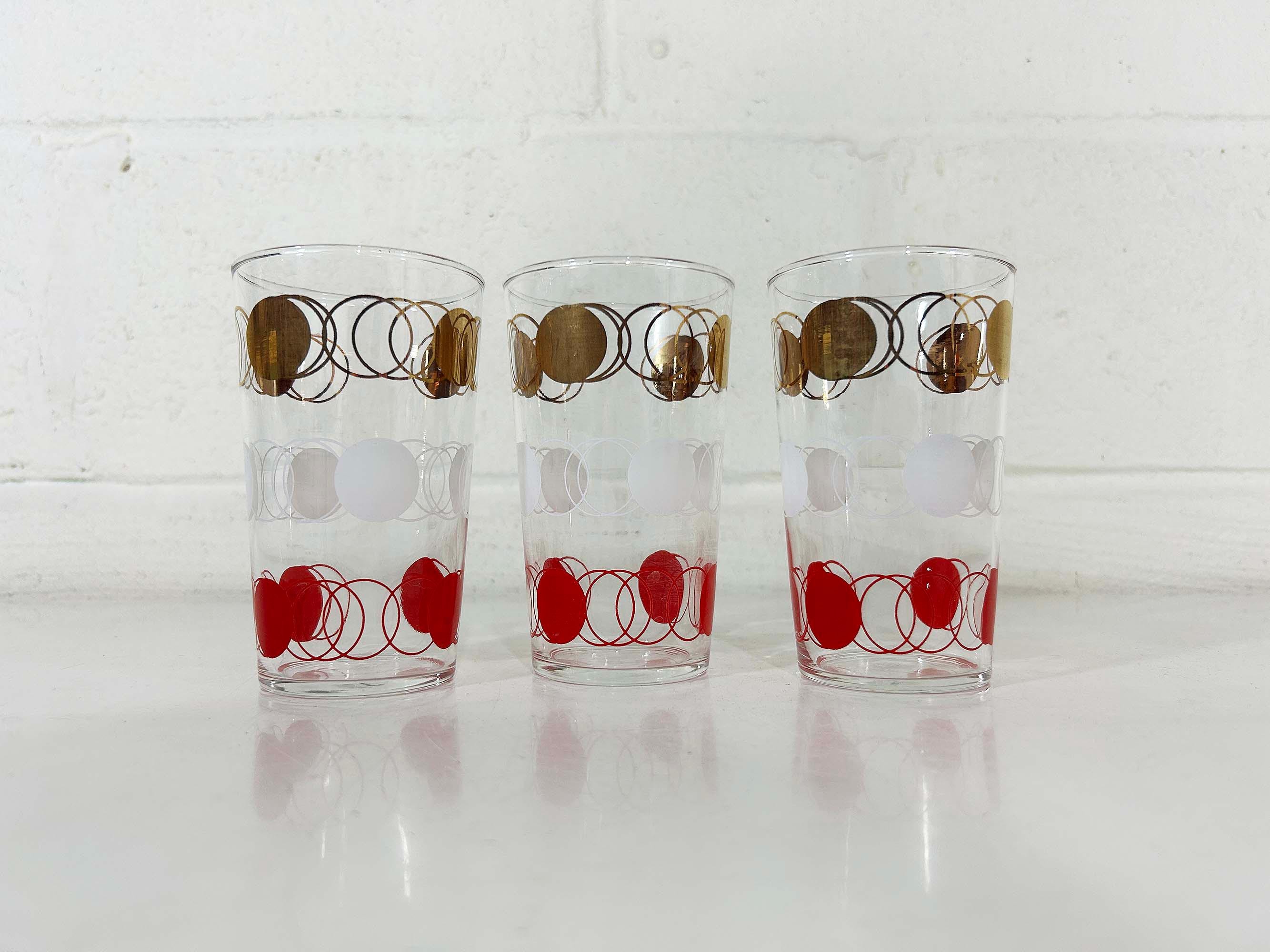 Vintage set of 3 small atomic glasses made by Federal Glass. A perfect addition to any bar or vintage kitchen! All are in good vintage condition with some paint loss and fogging from prior use - please see photos. Each glass is approximately 4 3/4 inches tall and 2 3/4 inches in diameter across the top. Each glass holds approximately 12 ounces of liquid when filled to the brim.
